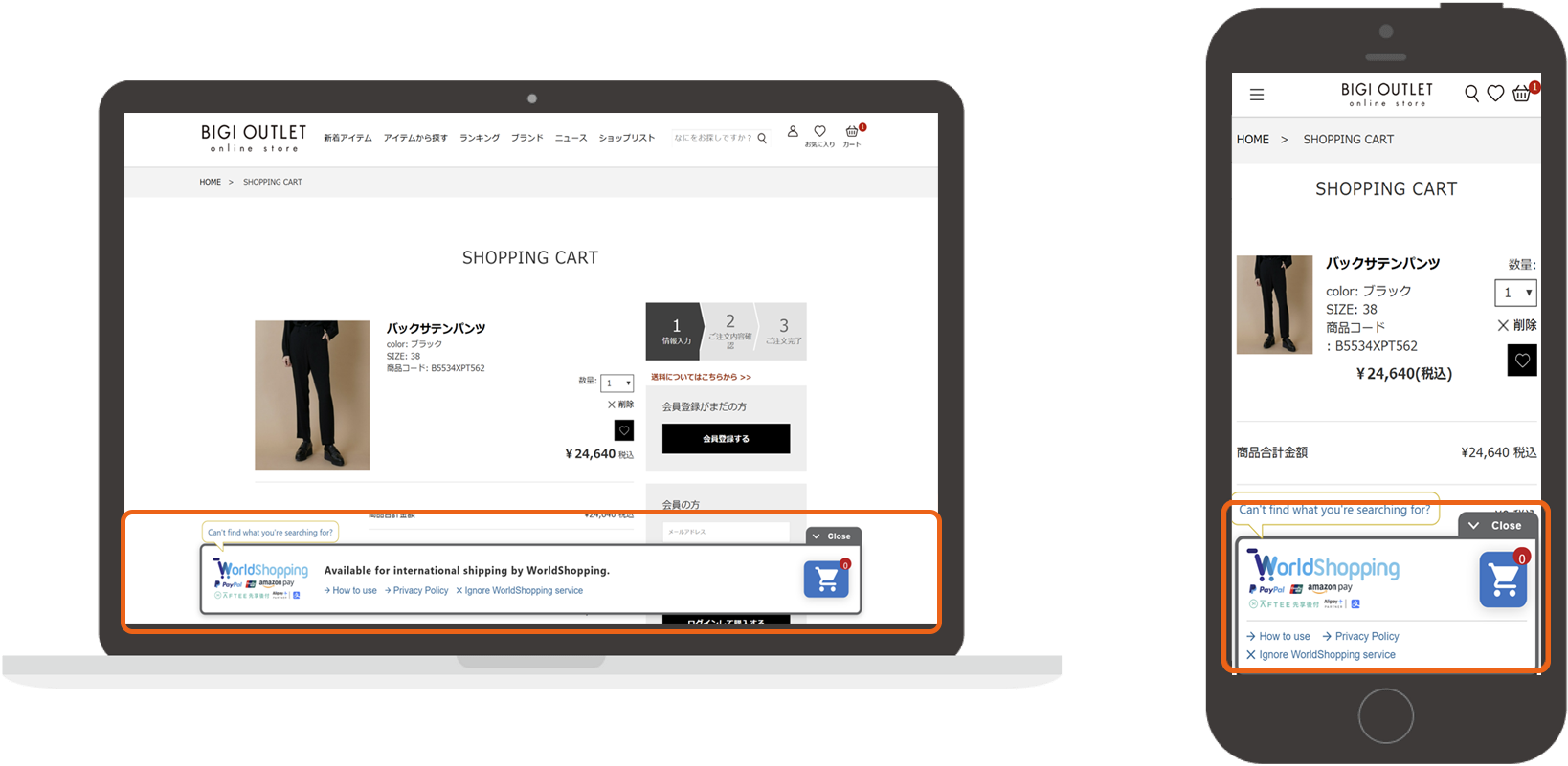 1. When you access the website from overseas, the “WorldShopping Cart” will be displayed automatically.