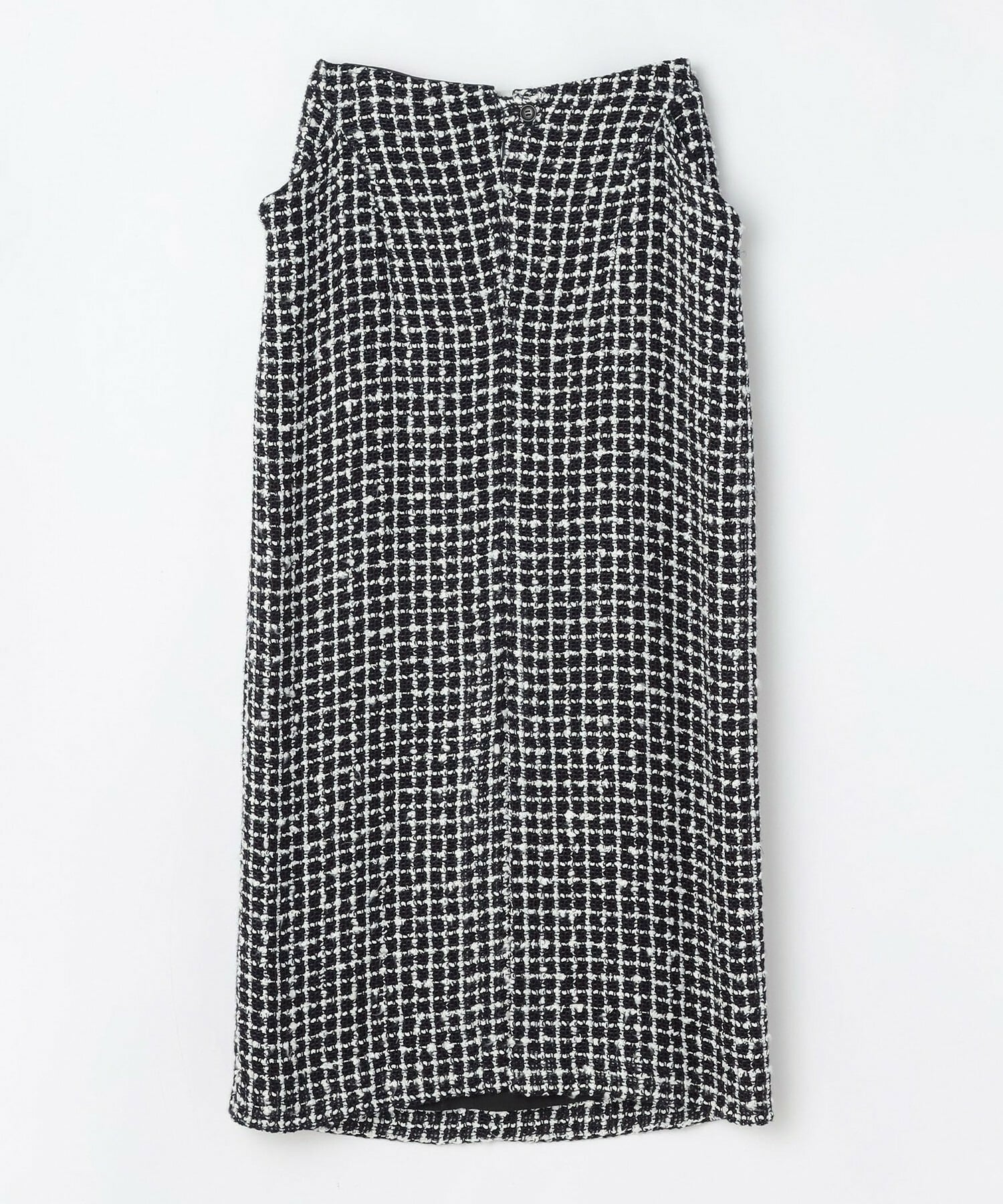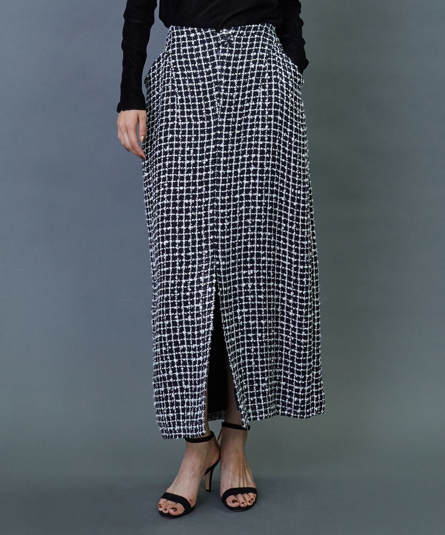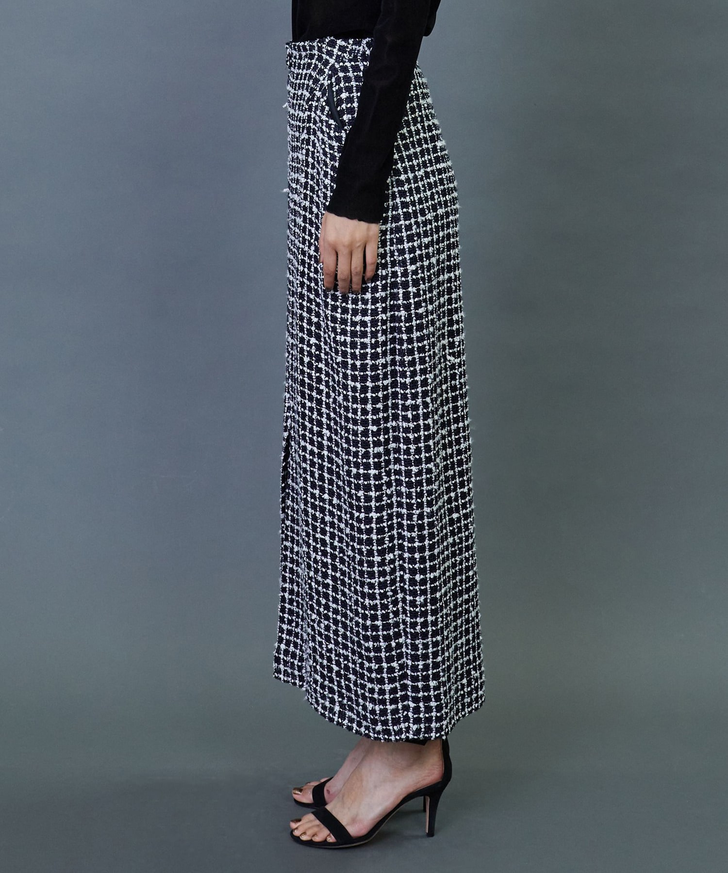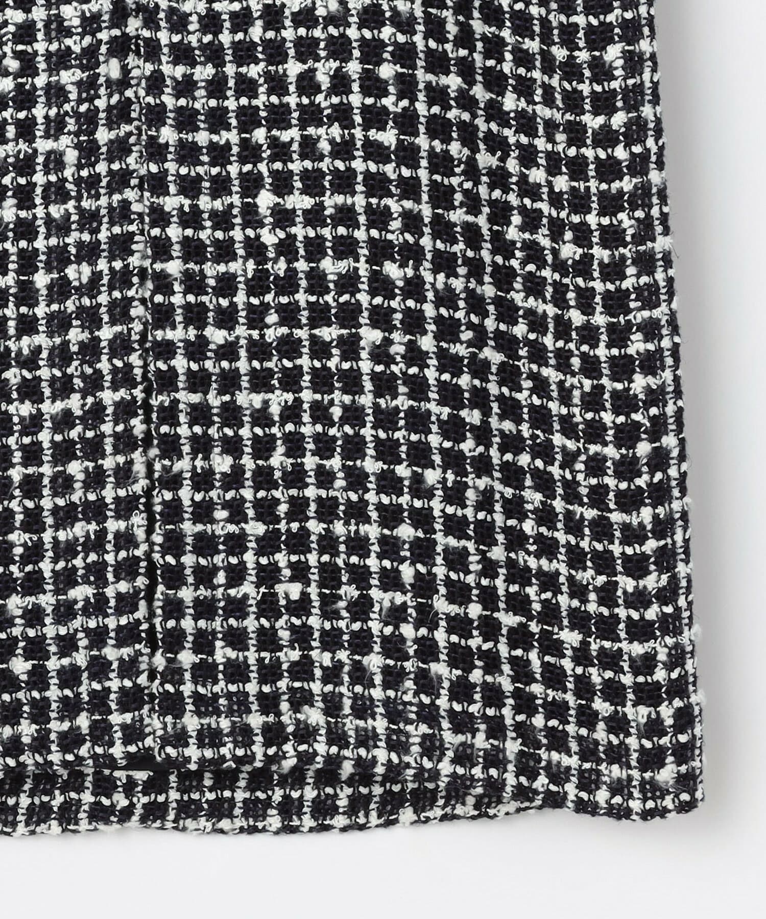 イタリア老舗メーカー「FALIERO SARTI」に別注で織り上げたこだわりのツイード素材を使用してます。柔らかなカーブを描いたロング丈のスカートです。ベルトレスのウエストとセンタースリットを入れることで軽やかな着用感を実現しました。同素材のジャケットとのセットアップの着こなしもおすすめです。
