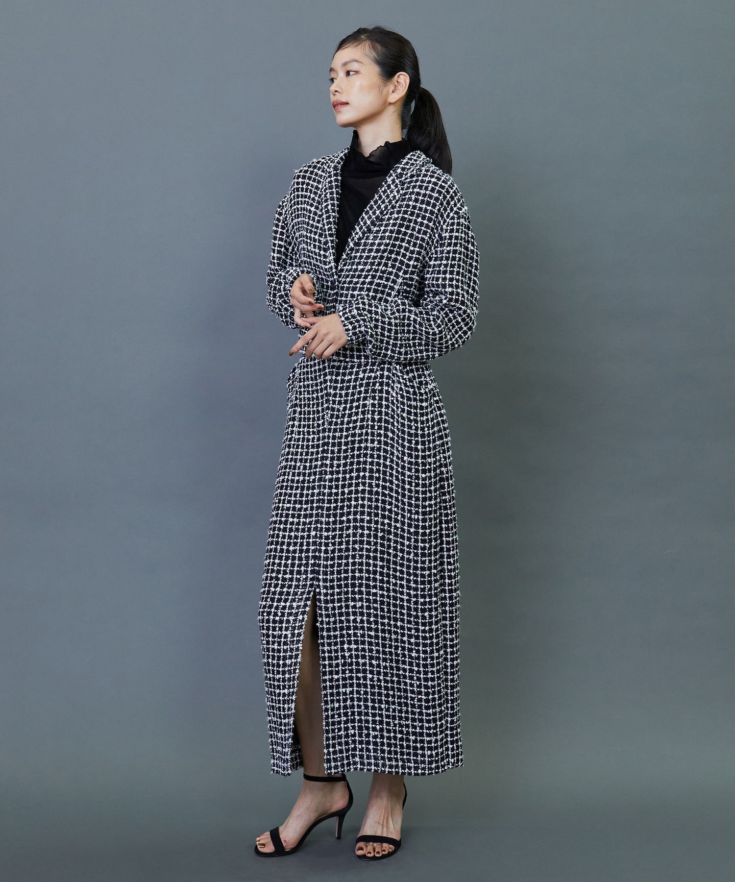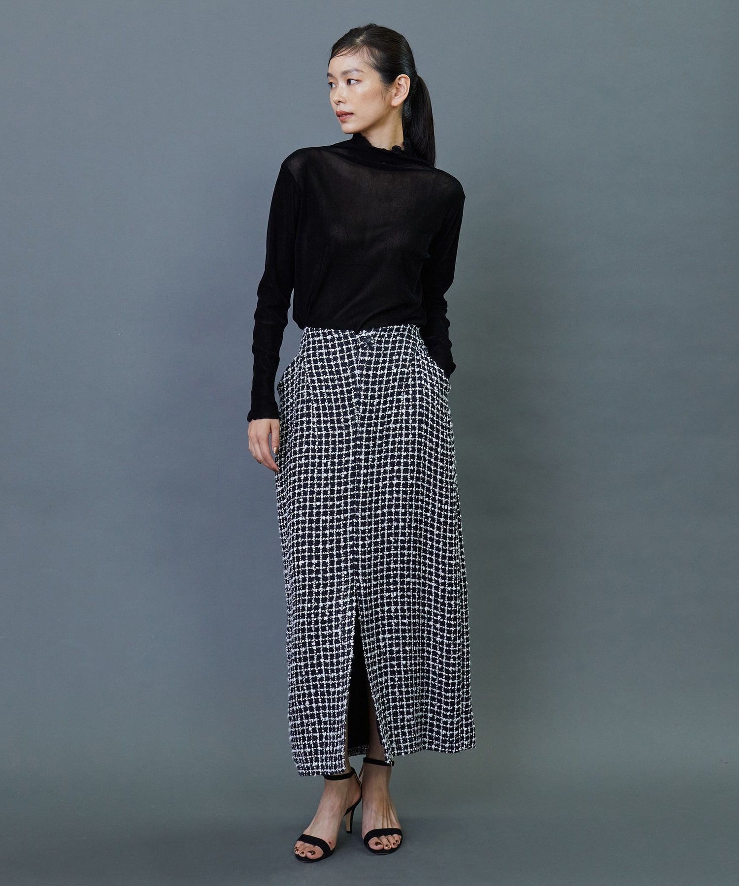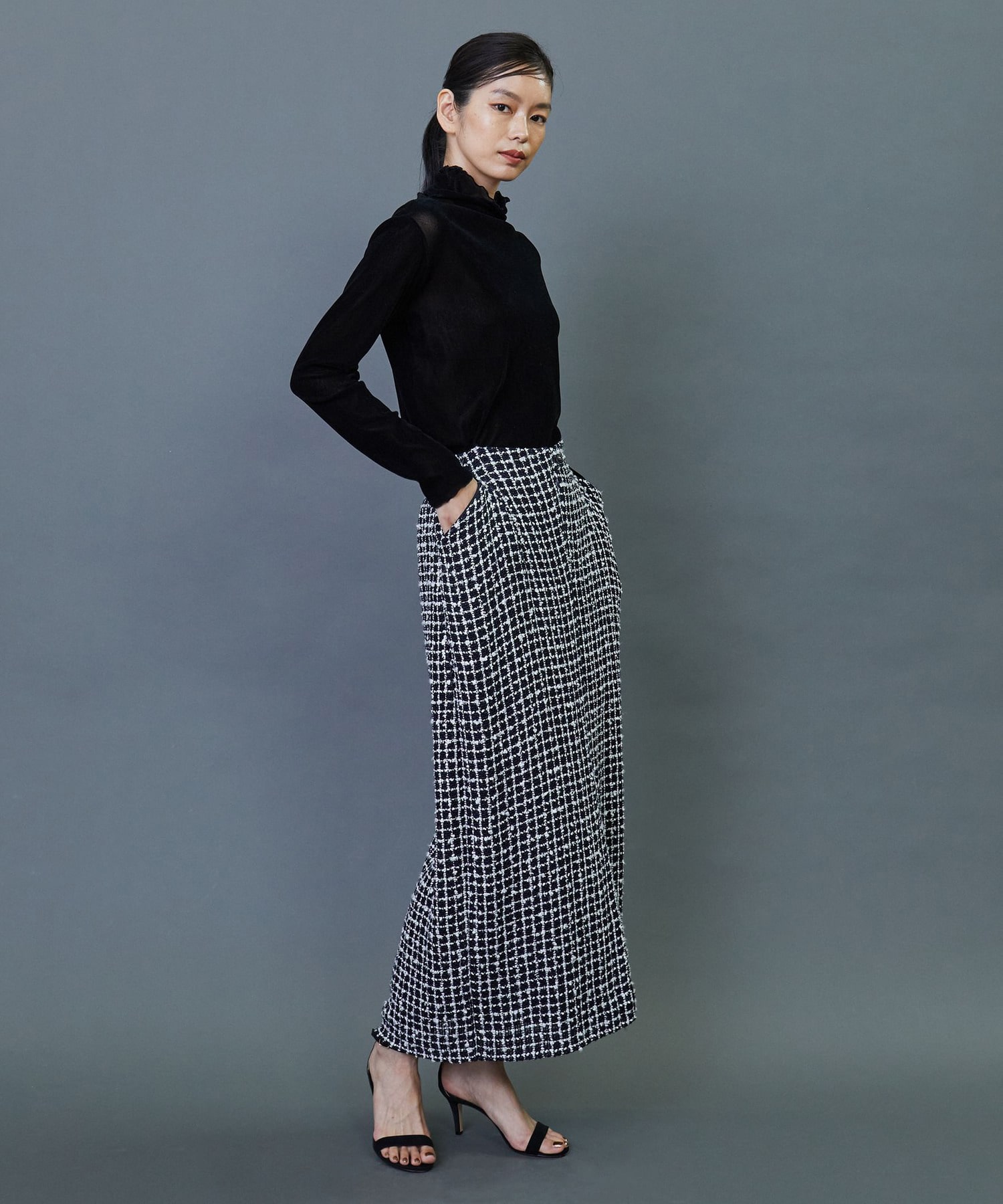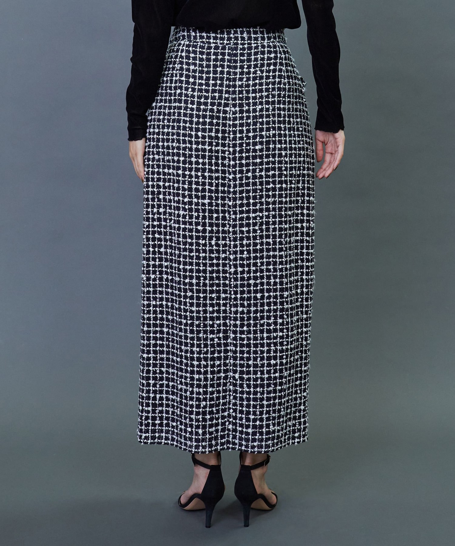 イタリア老舗メーカー「FALIERO SARTI」に別注で織り上げたこだわりのツイード素材を使用してます。柔らかなカーブを描いたロング丈のスカートです。ベルトレスのウエストとセンタースリットを入れることで軽やかな着用感を実現しました。同素材のジャケットとのセットアップの着こなしもおすすめです。