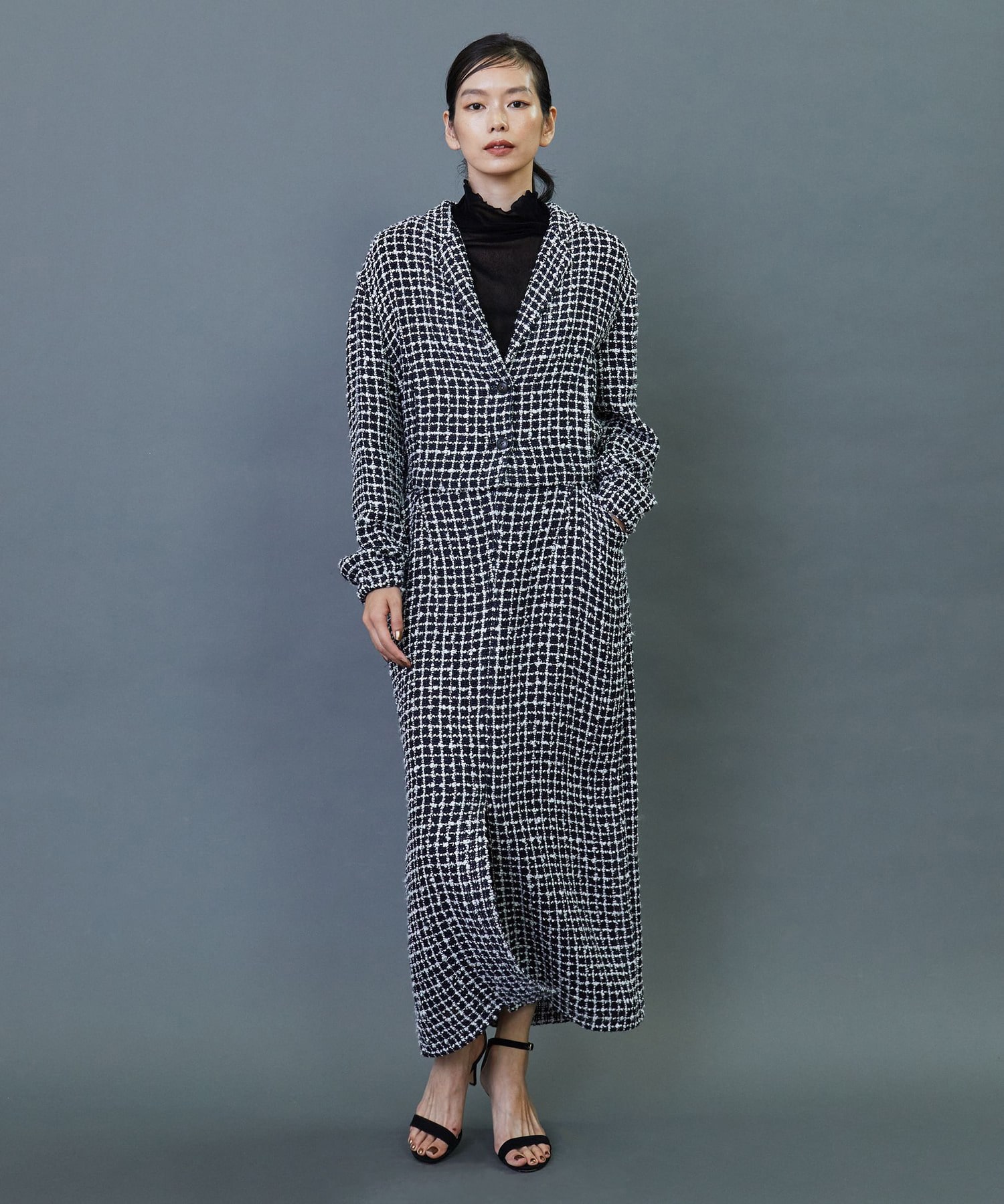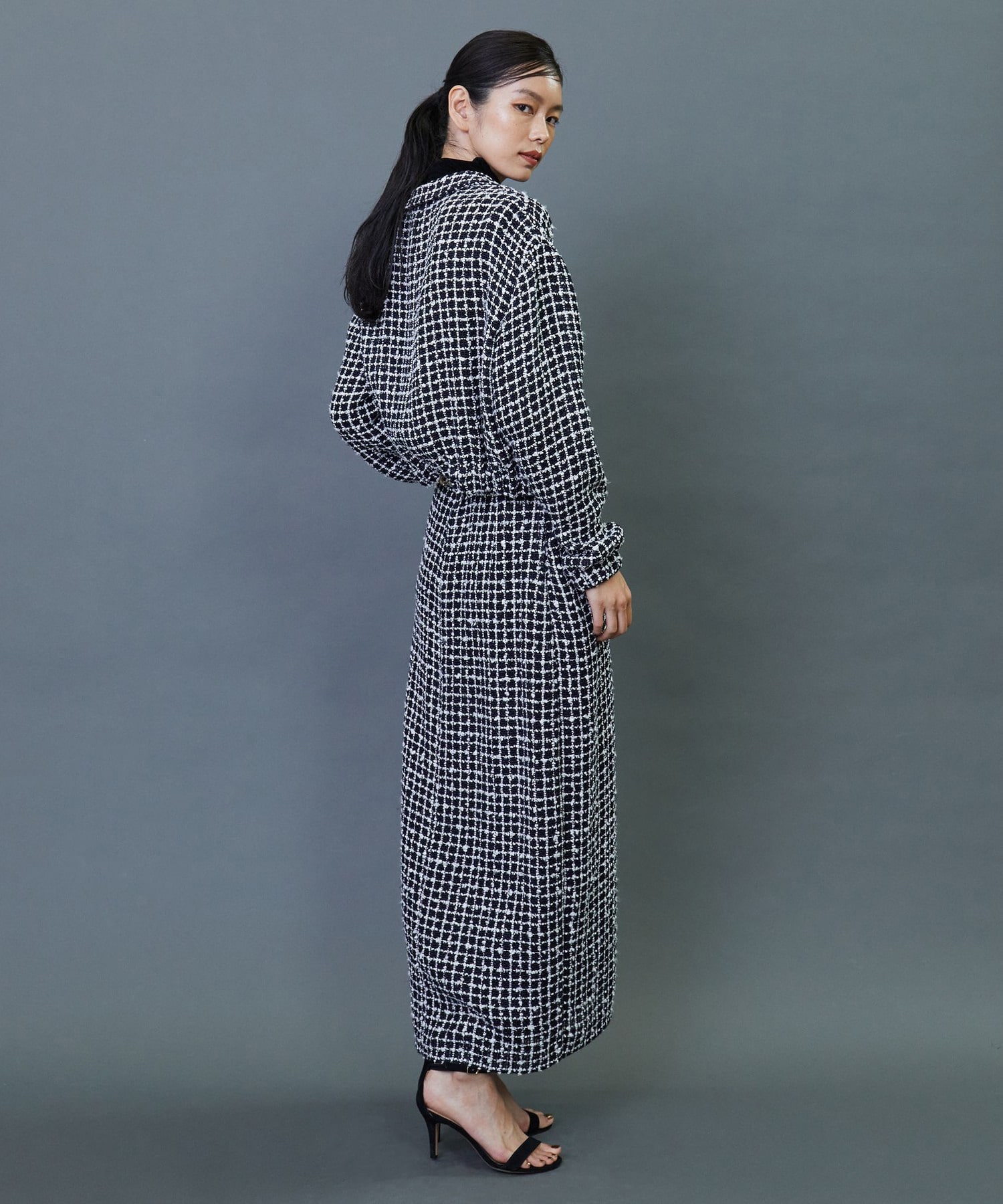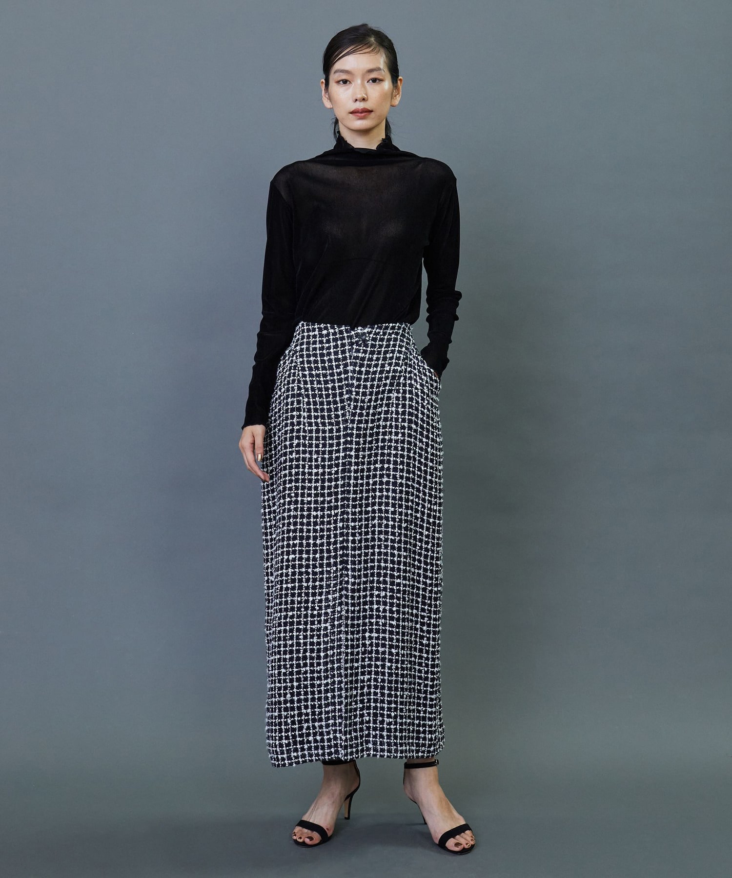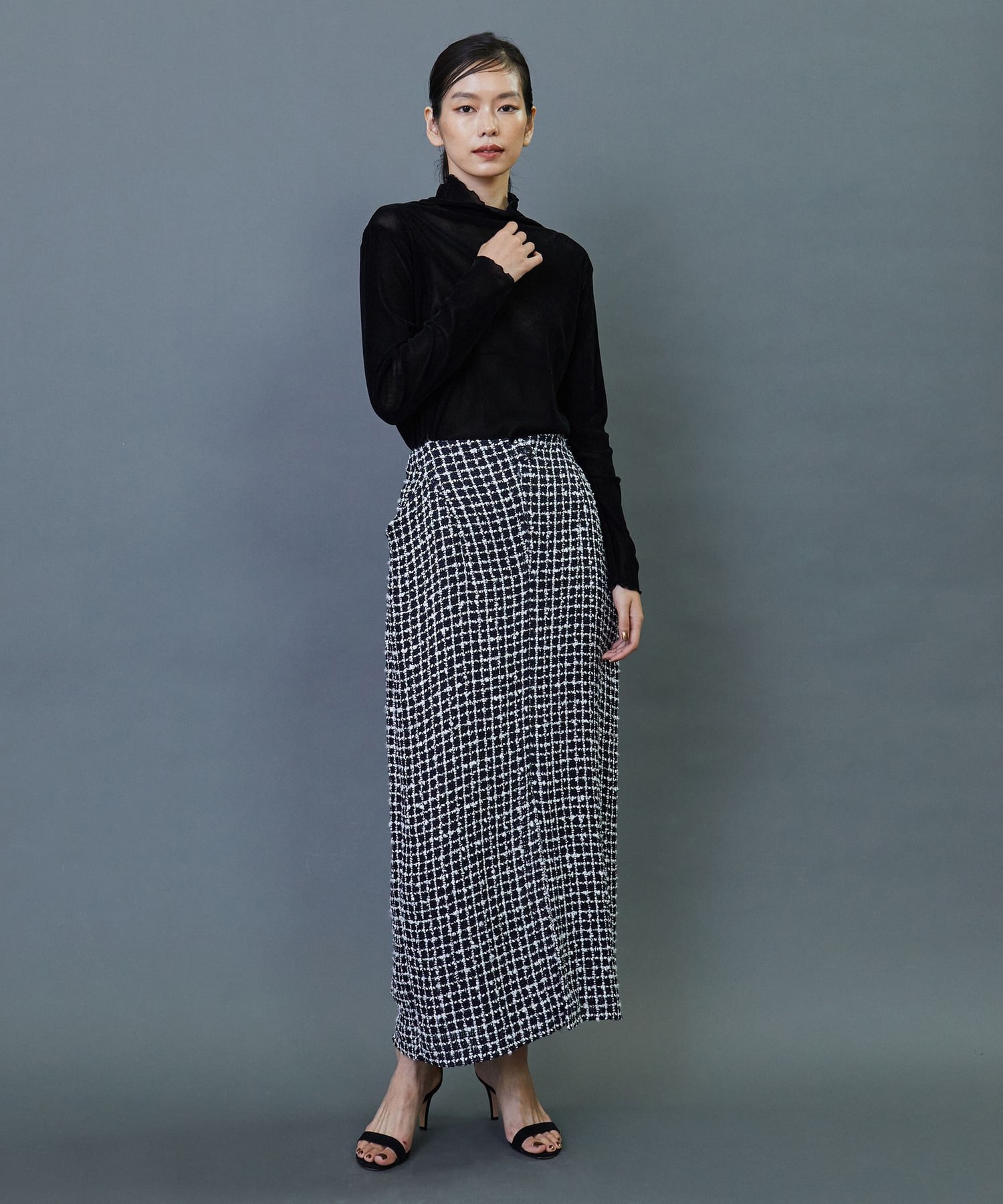 イタリア老舗メーカー「FALIERO SARTI」に別注で織り上げたこだわりのツイード素材を使用してます。柔らかなカーブを描いたロング丈のスカートです。ベルトレスのウエストとセンタースリットを入れることで軽やかな着用感を実現しました。同素材のジャケットとのセットアップの着こなしもおすすめです。