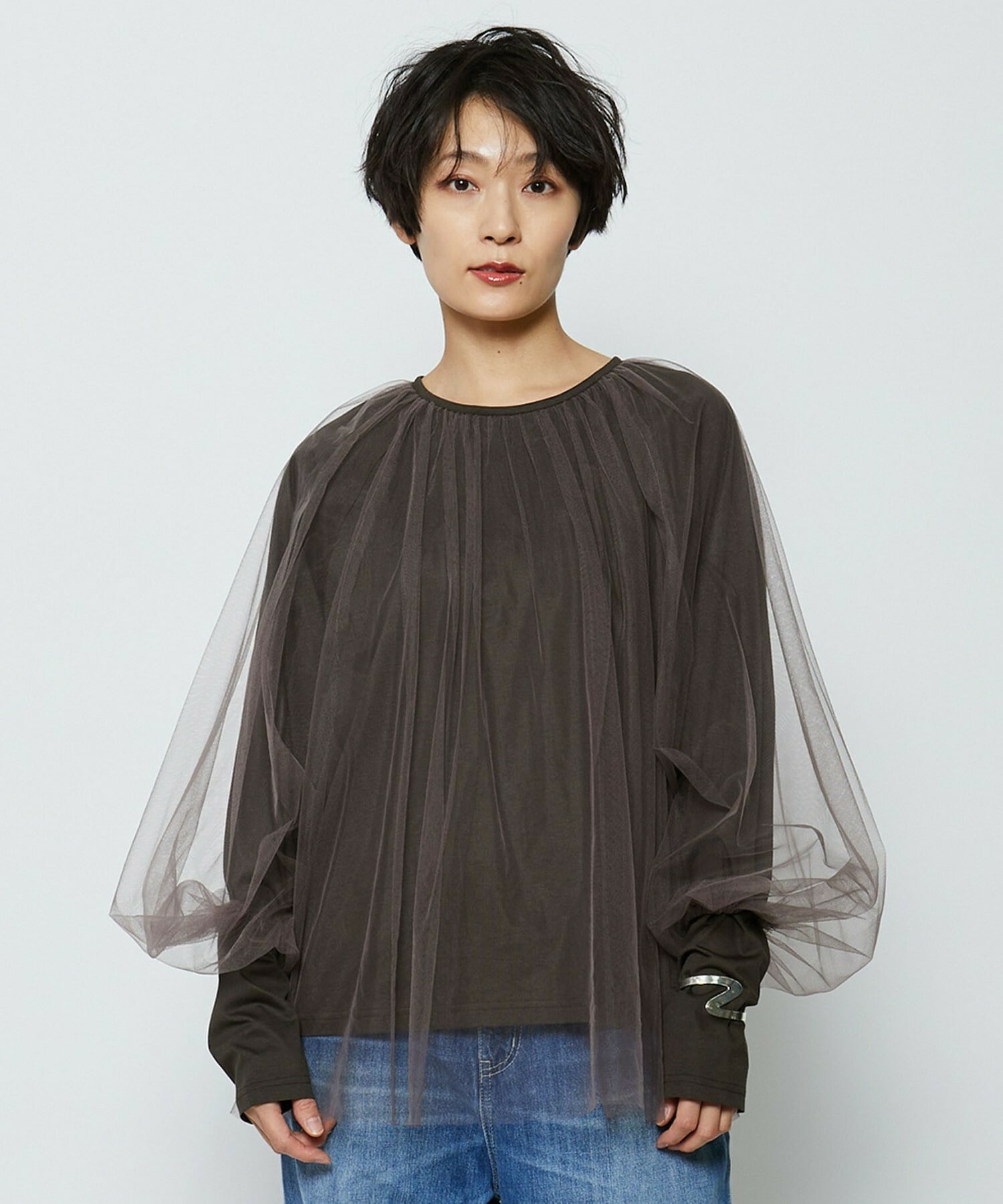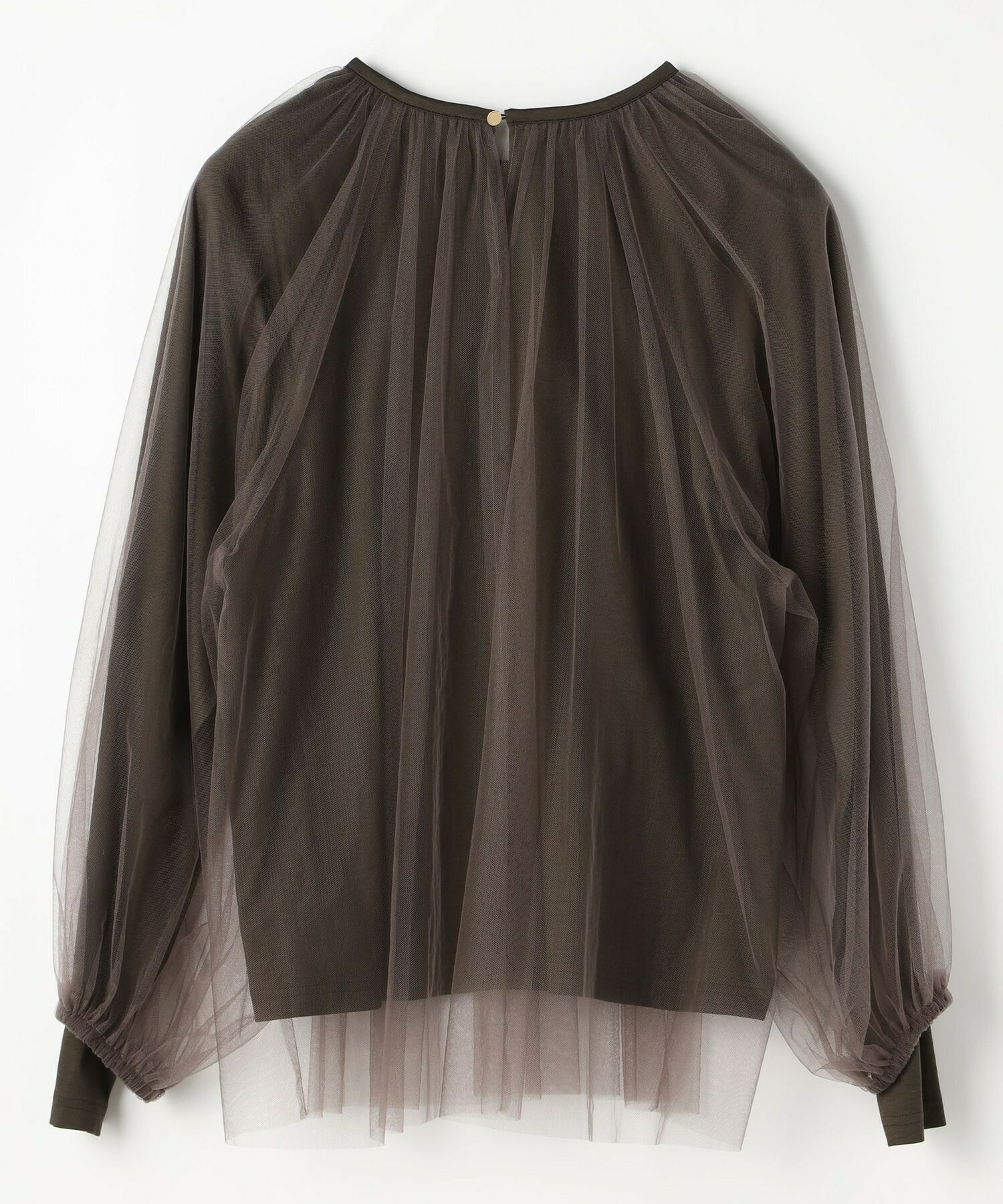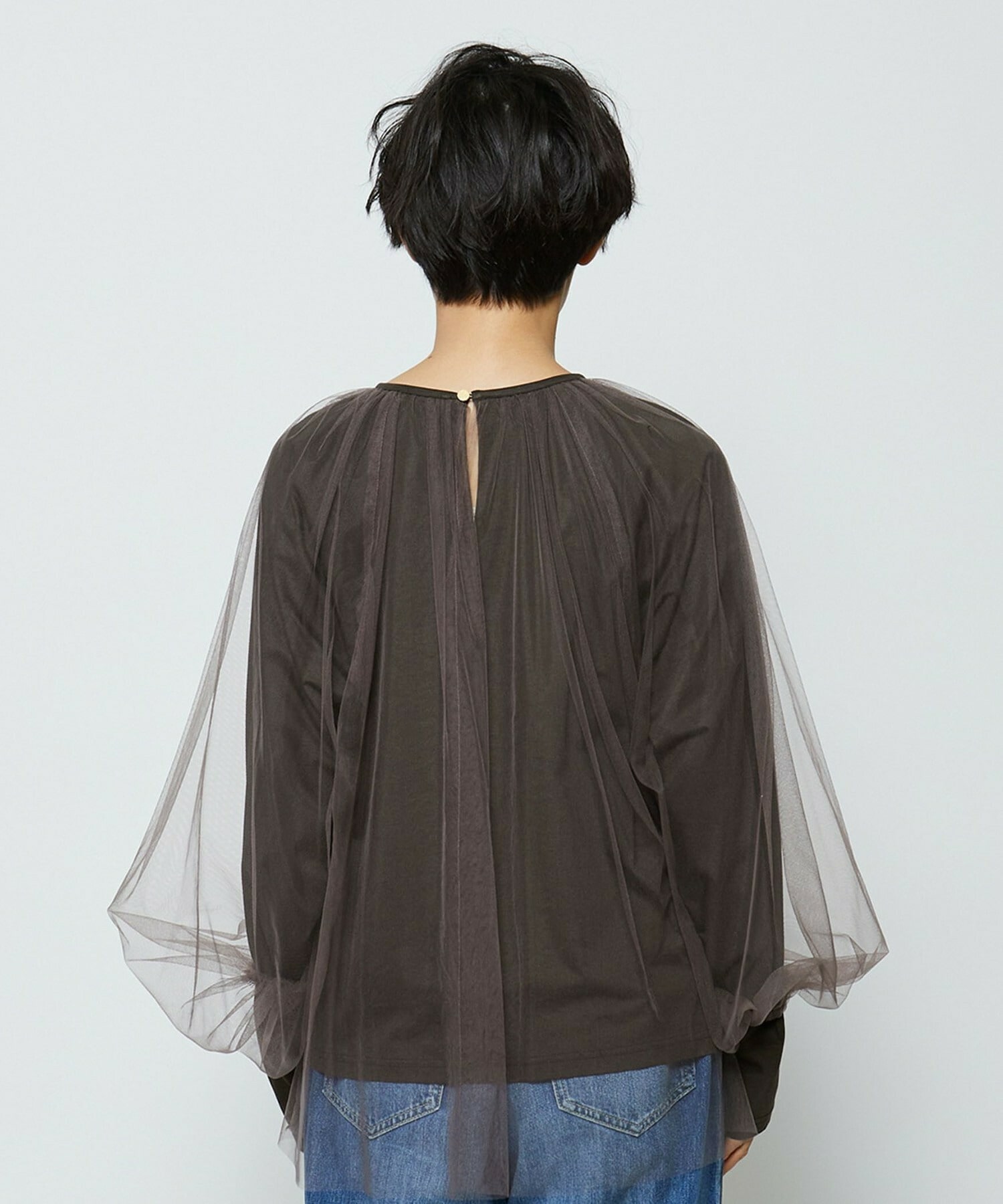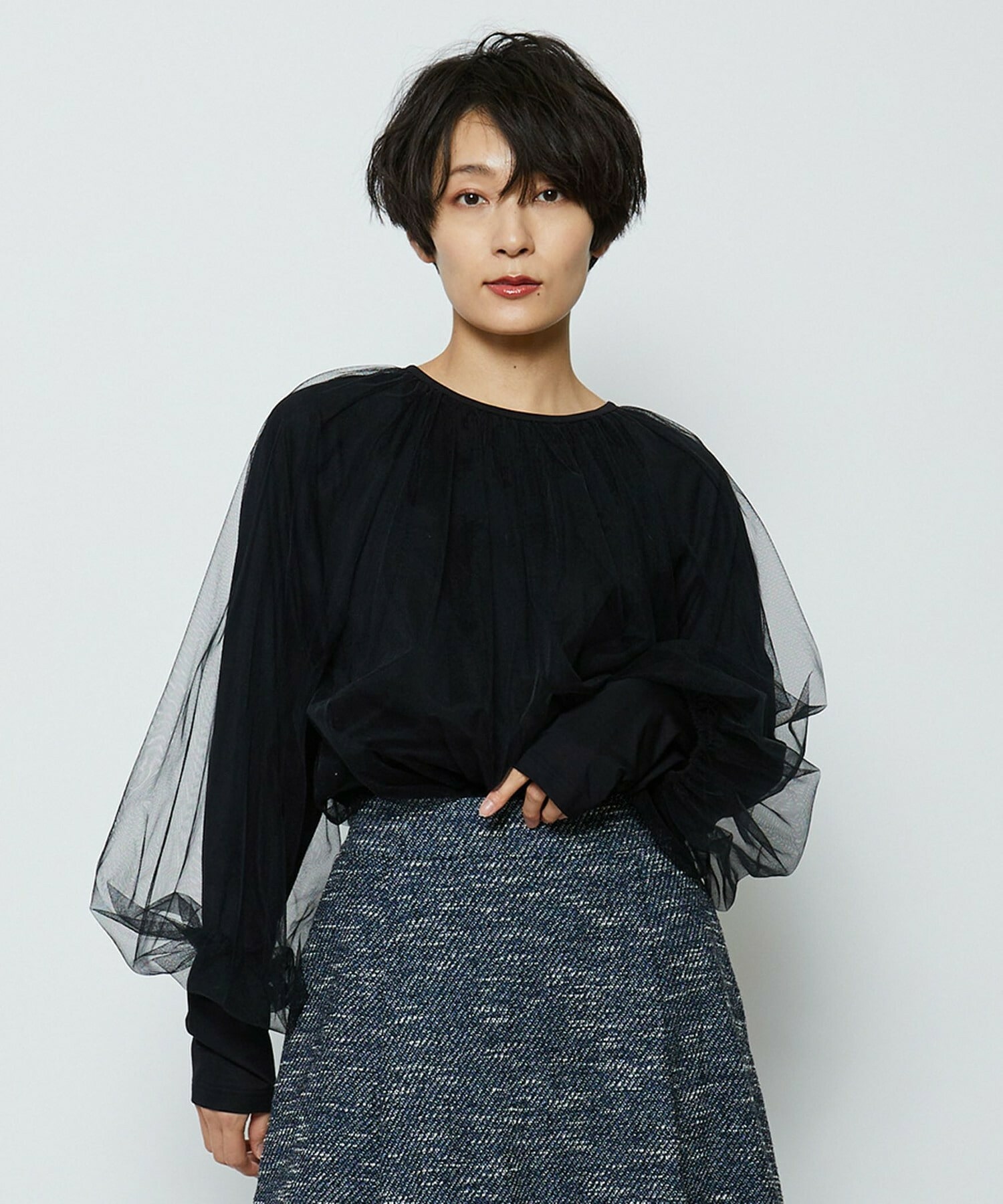 透け感のあるチュール素材をインナー付きで着やすく華やかなブラウスに仕上げました。チュール部分は贅沢にギャザーを入れボリュームを出したパフスリーブ。袖口がゴムになっているのでたくしあげて、ボリューミーなシルエットを出して着こなしてください。透け感チュールとインナーとのコントラストが楽しい一枚です。