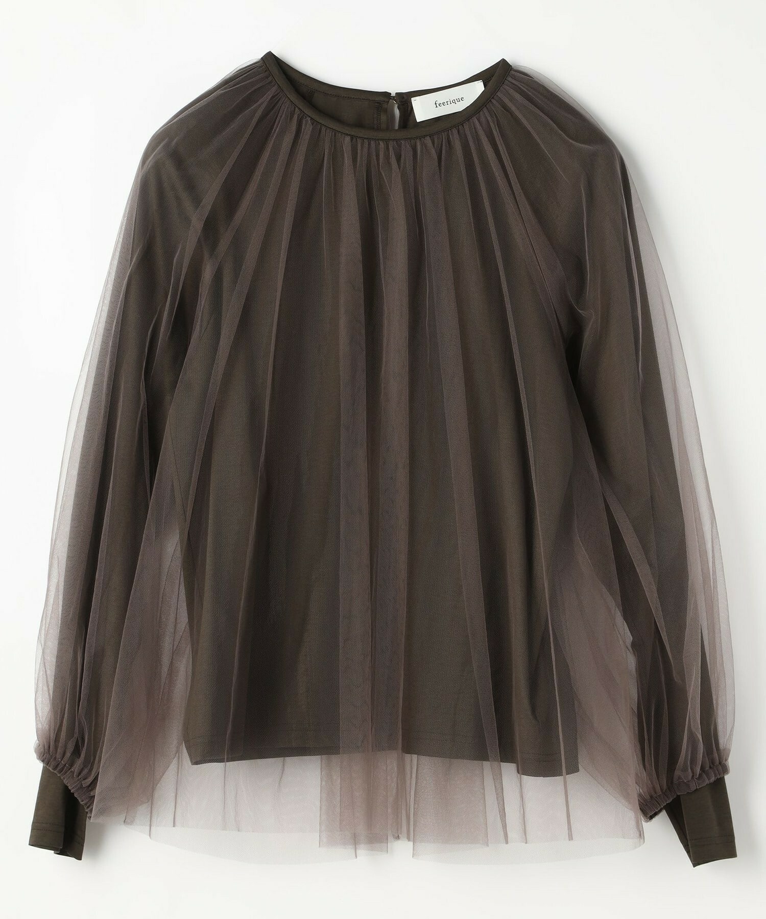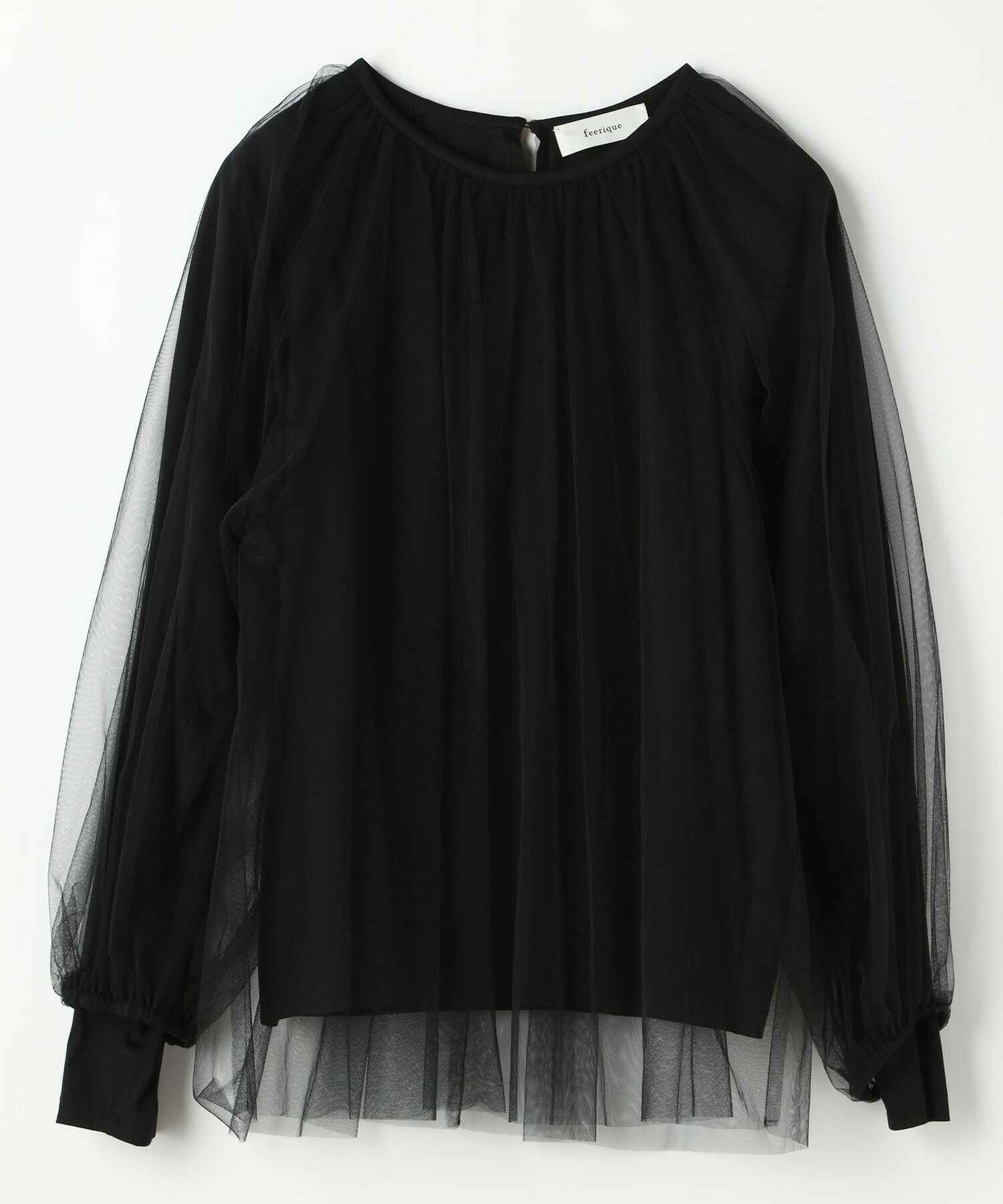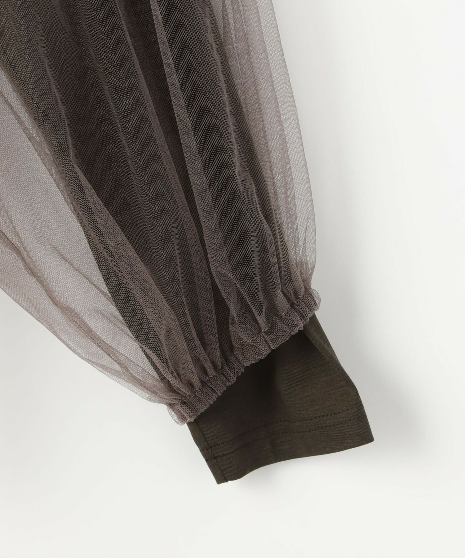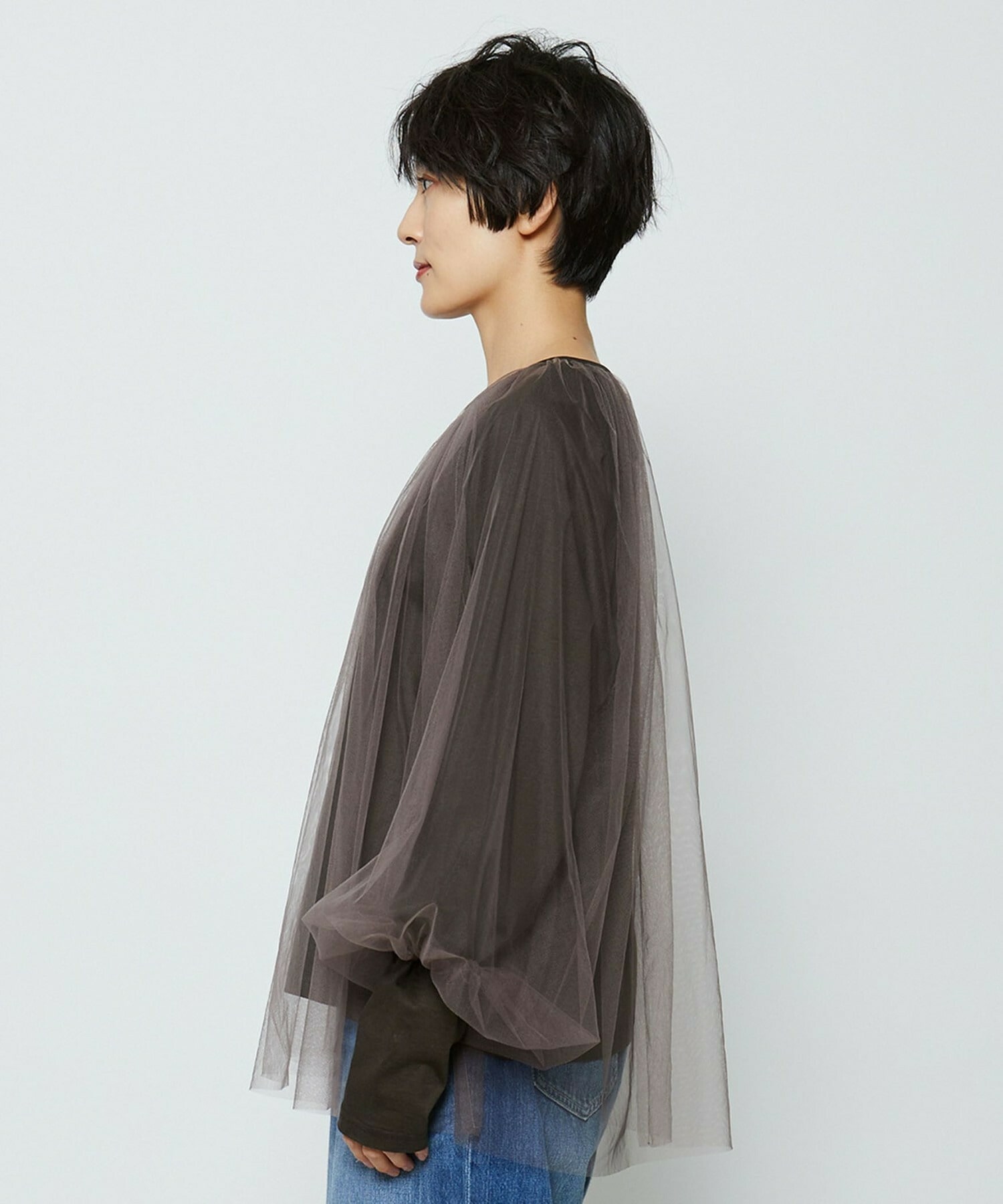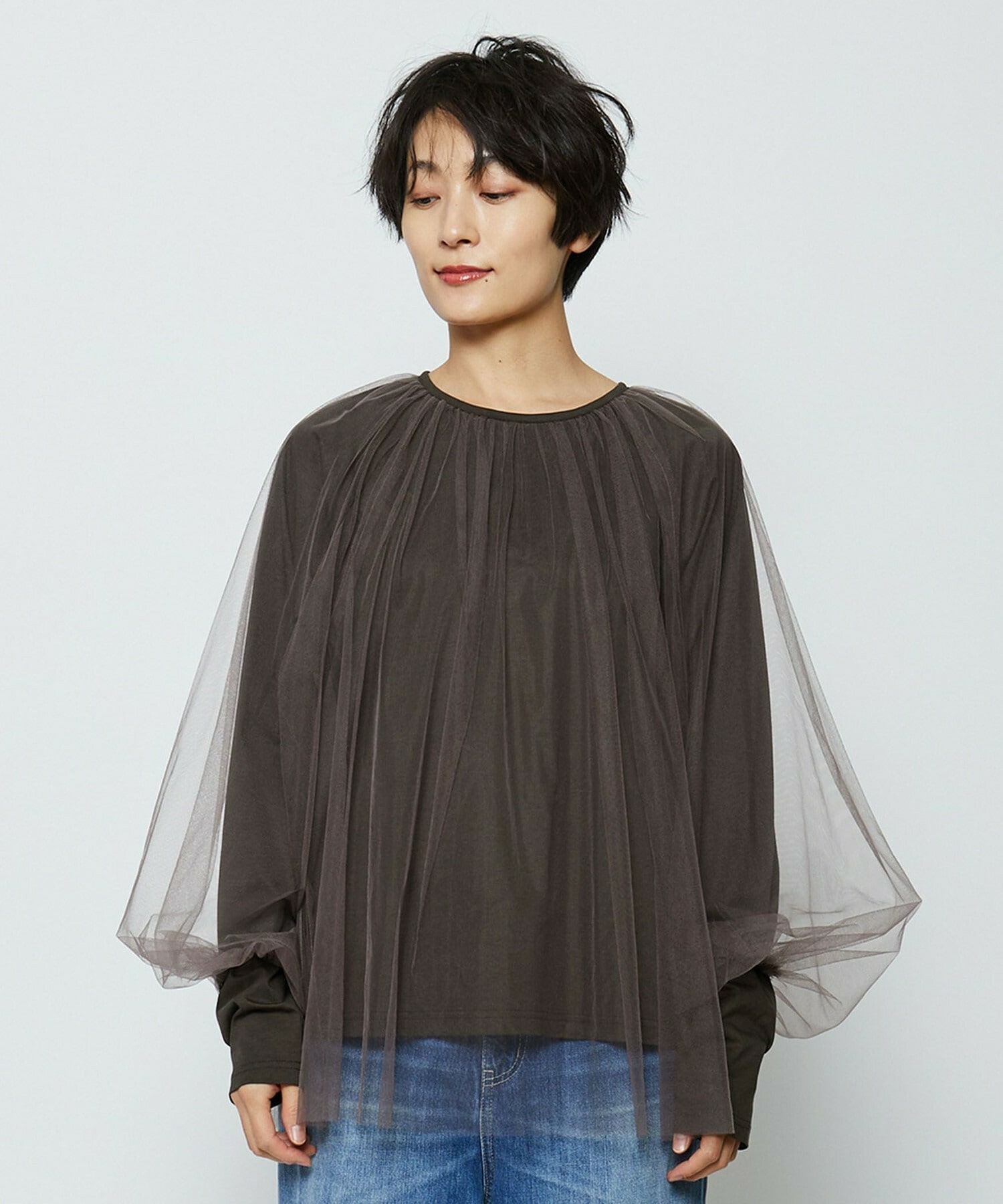 透け感のあるチュール素材をインナー付きで着やすく華やかなブラウスに仕上げました。チュール部分は贅沢にギャザーを入れボリュームを出したパフスリーブ。袖口がゴムになっているのでたくしあげて、ボリューミーなシルエットを出して着こなしてください。透け感チュールとインナーとのコントラストが楽しい一枚です。