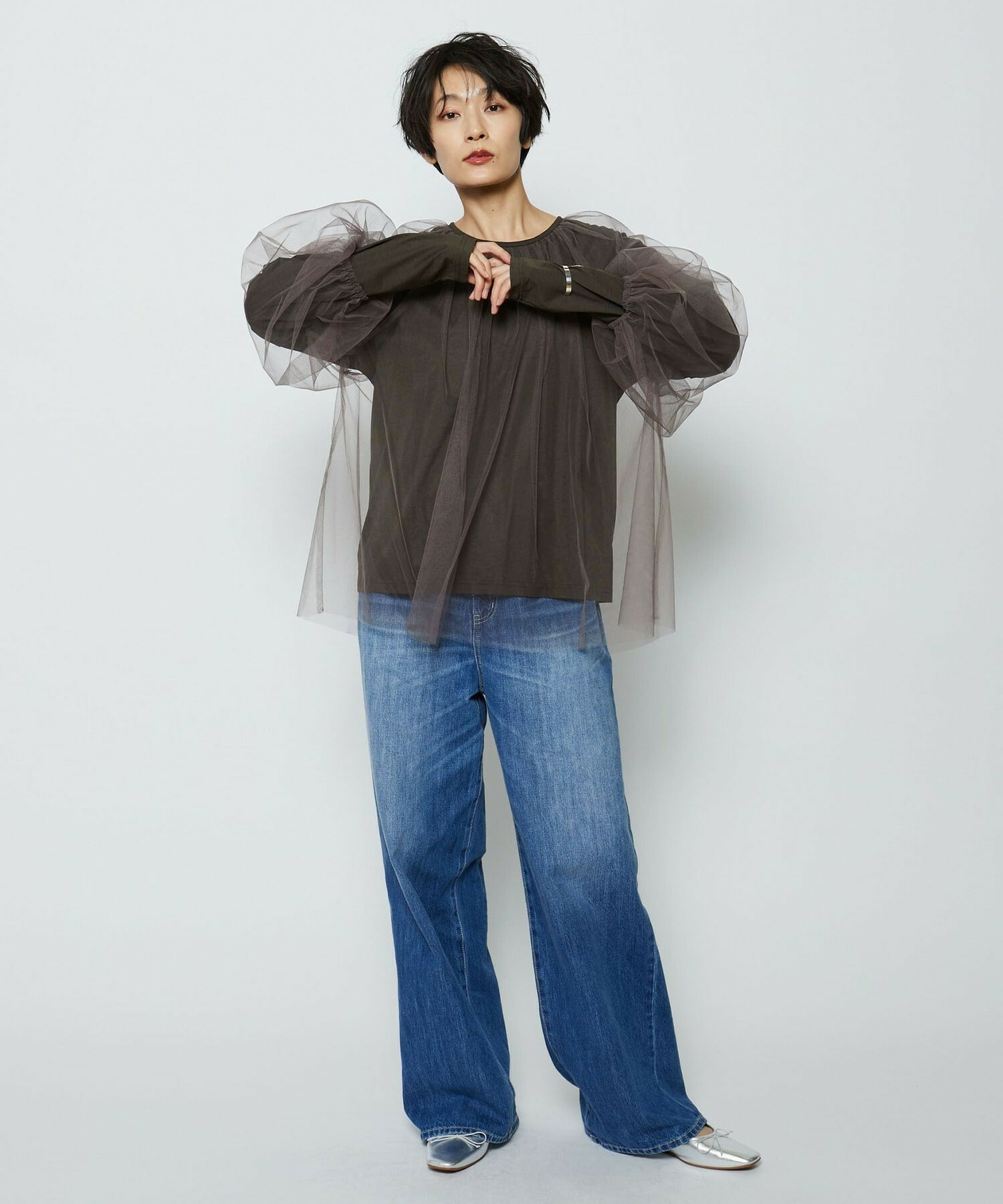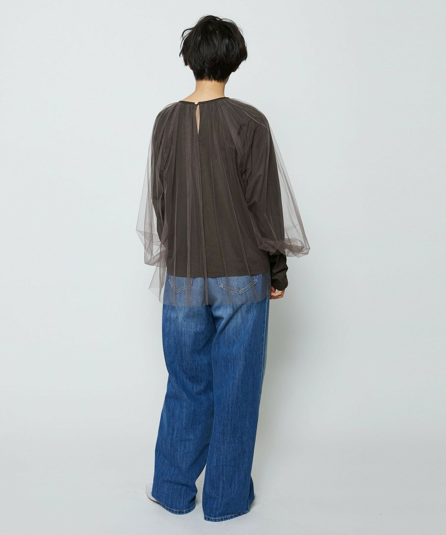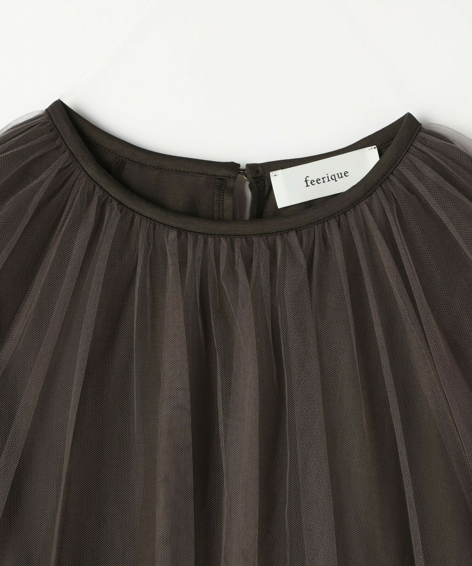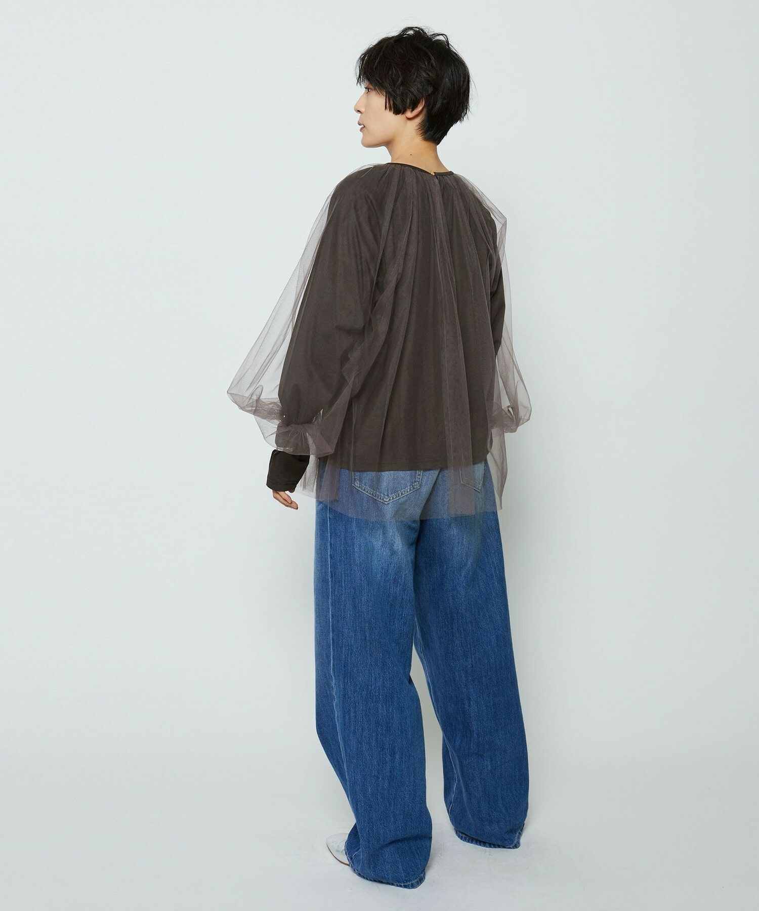 透け感のあるチュール素材をインナー付きで着やすく華やかなブラウスに仕上げました。チュール部分は贅沢にギャザーを入れボリュームを出したパフスリーブ。袖口がゴムになっているのでたくしあげて、ボリューミーなシルエットを出して着こなしてください。透け感チュールとインナーとのコントラストが楽しい一枚です。