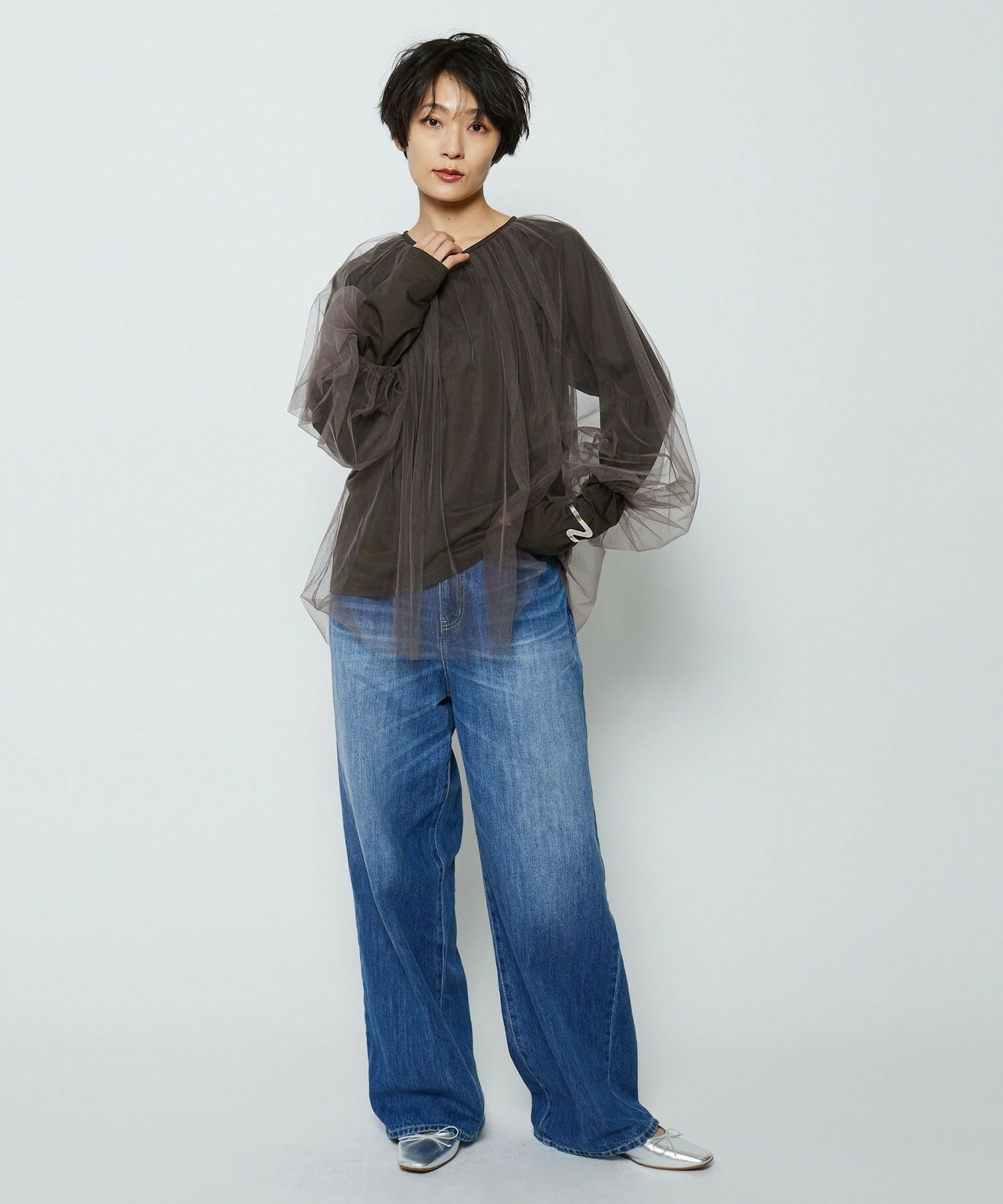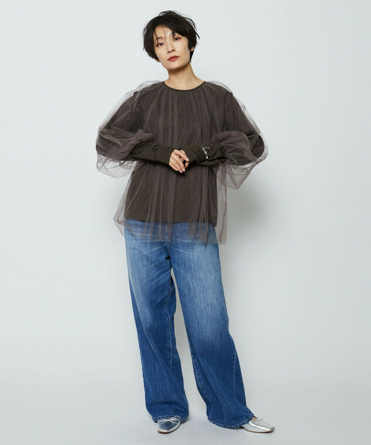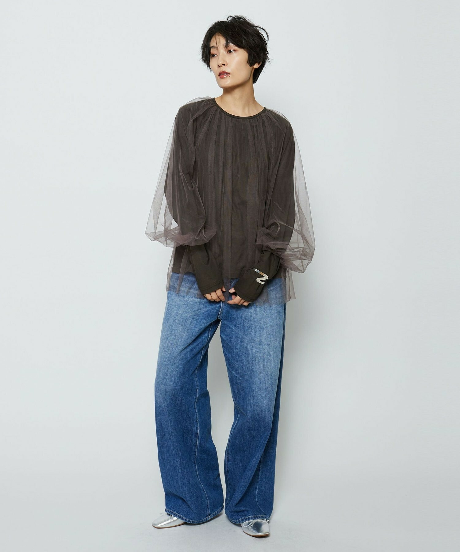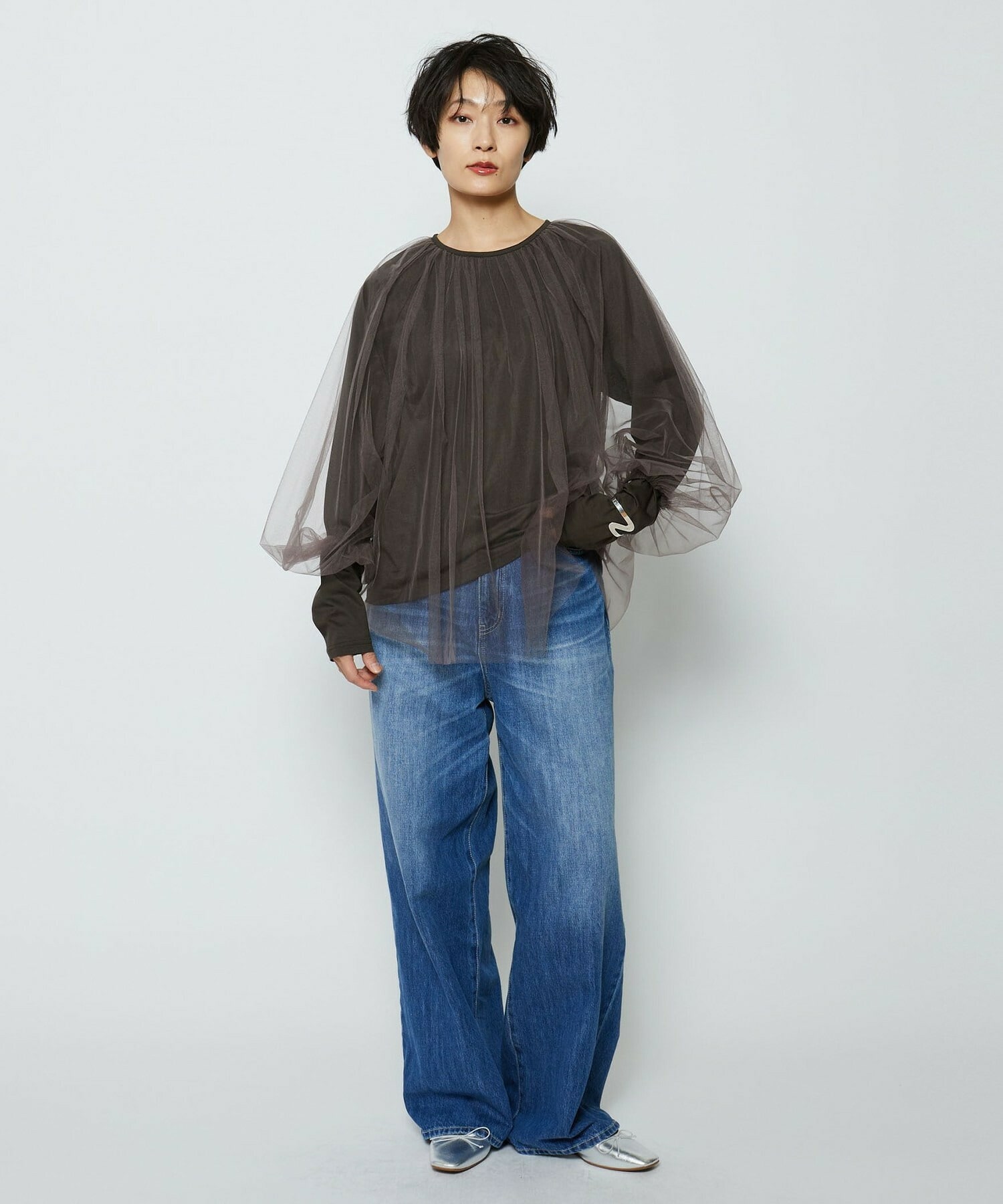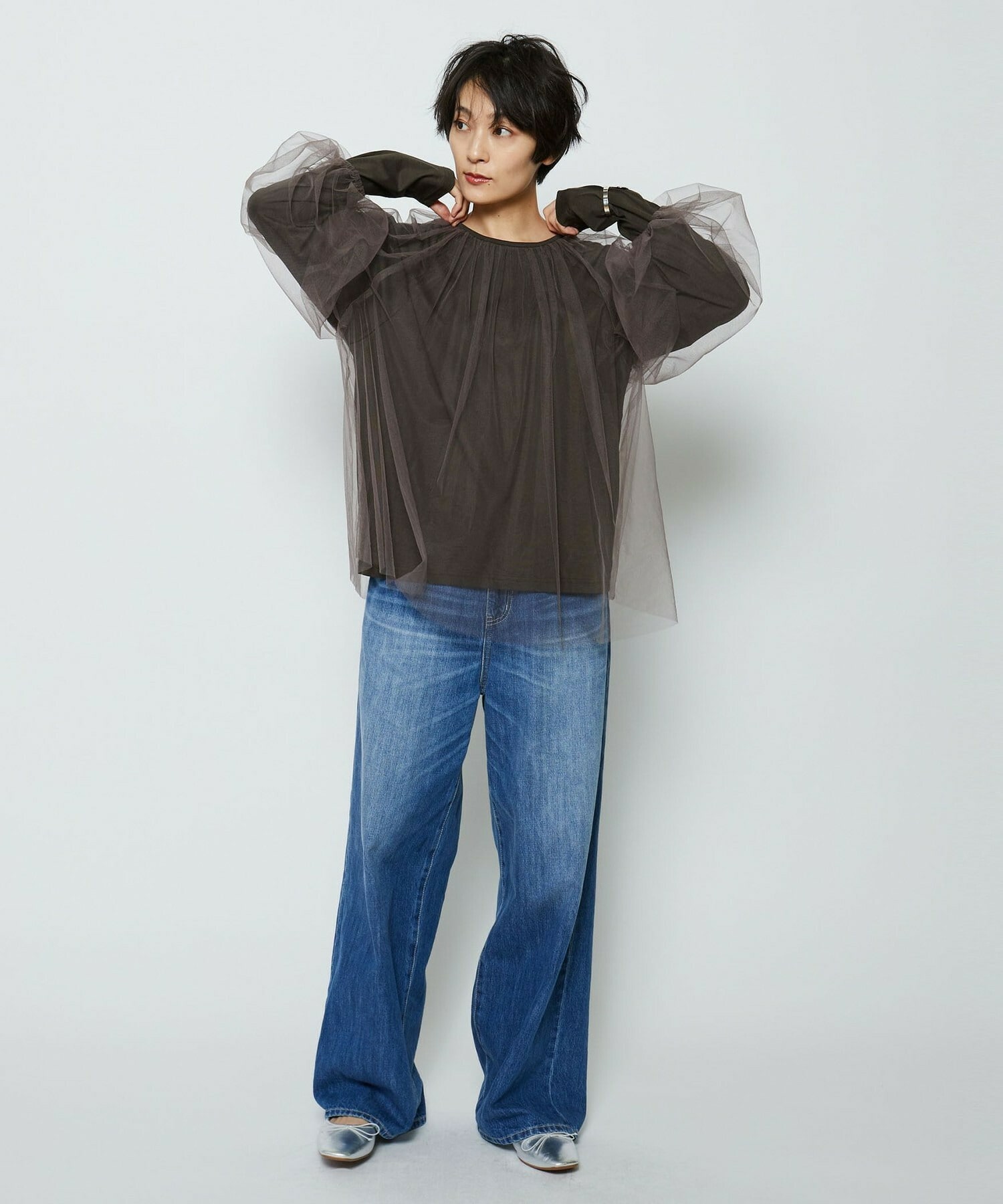 透け感のあるチュール素材をインナー付きで着やすく華やかなブラウスに仕上げました。チュール部分は贅沢にギャザーを入れボリュームを出したパフスリーブ。袖口がゴムになっているのでたくしあげて、ボリューミーなシルエットを出して着こなしてください。透け感チュールとインナーとのコントラストが楽しい一枚です。