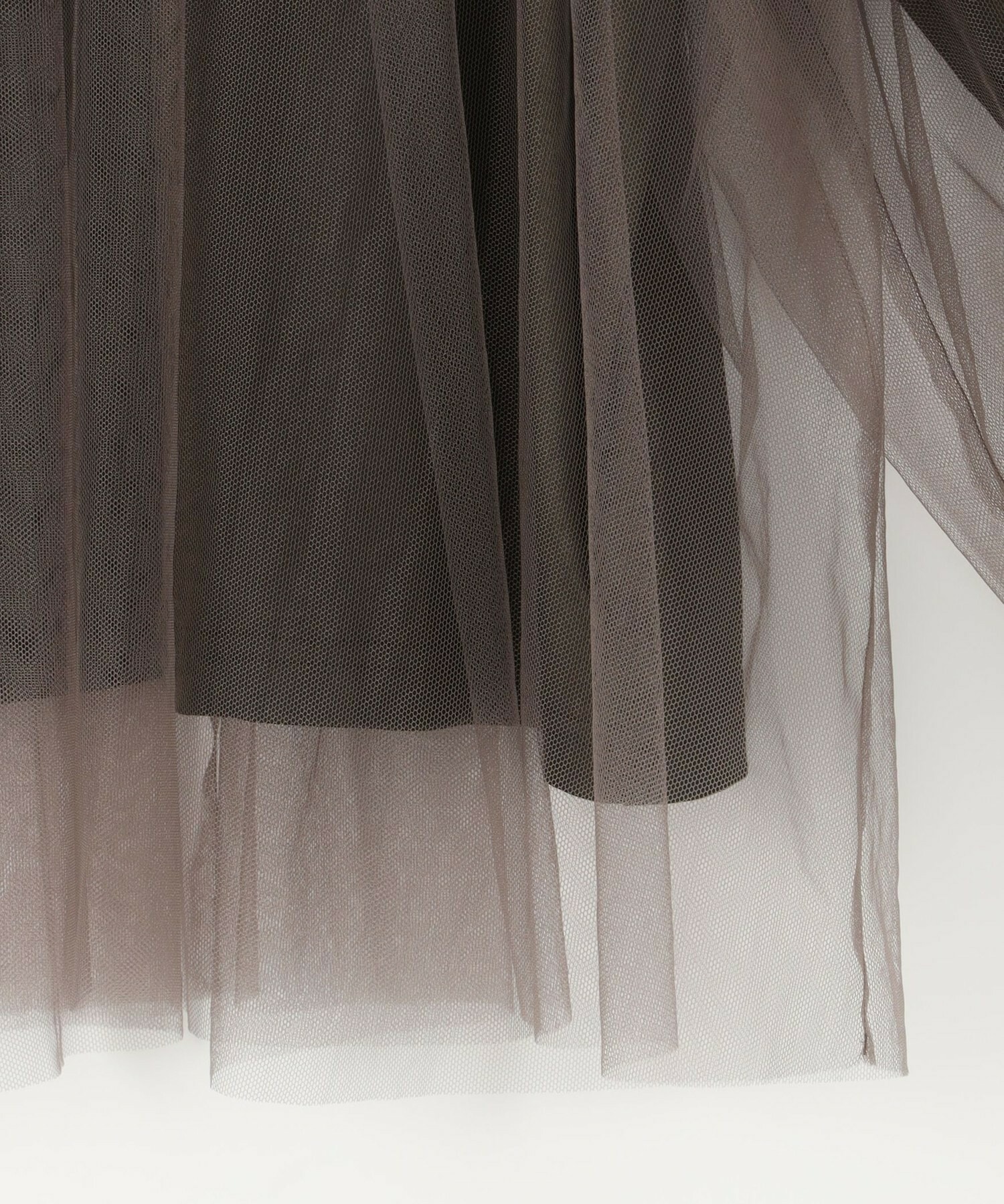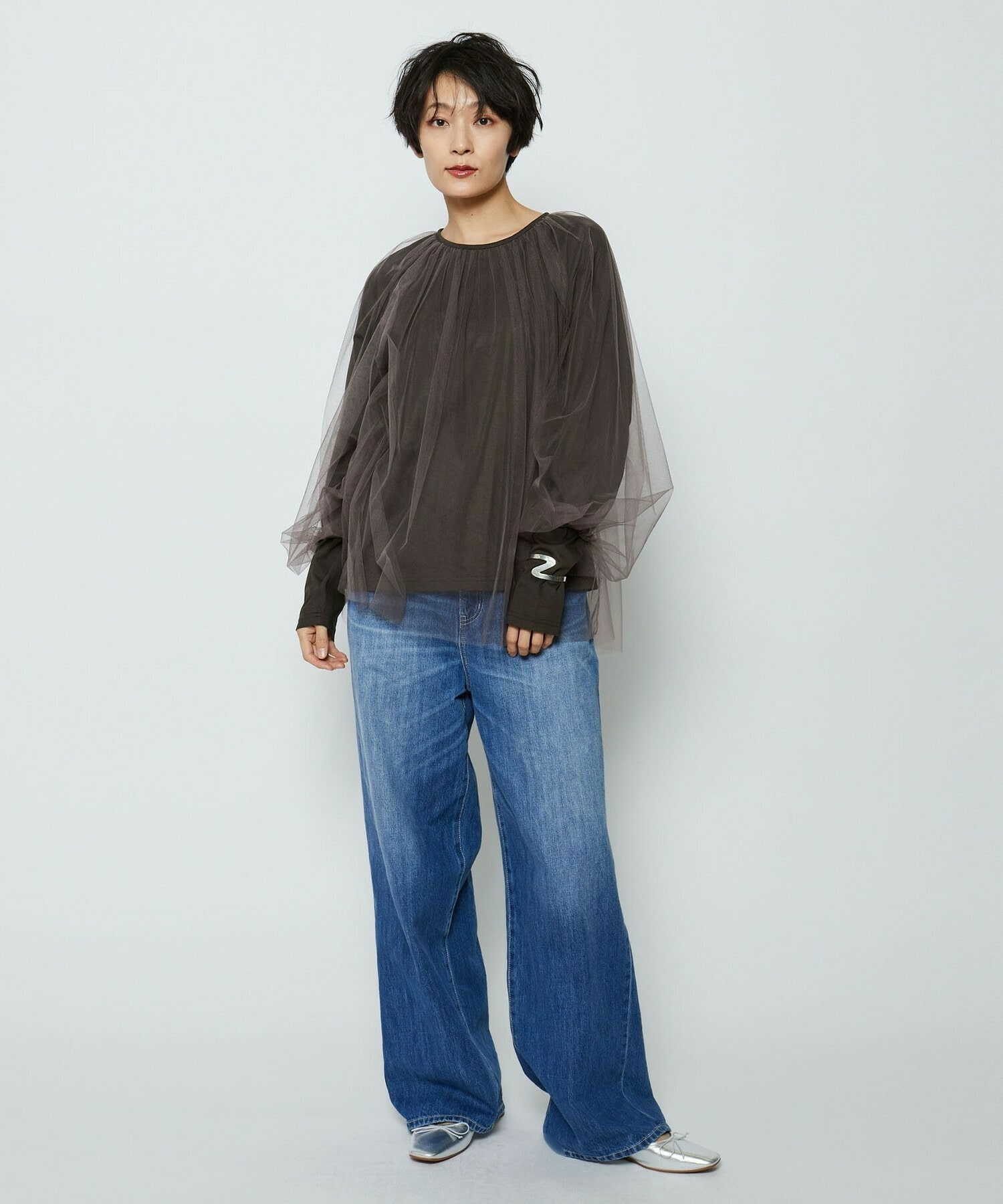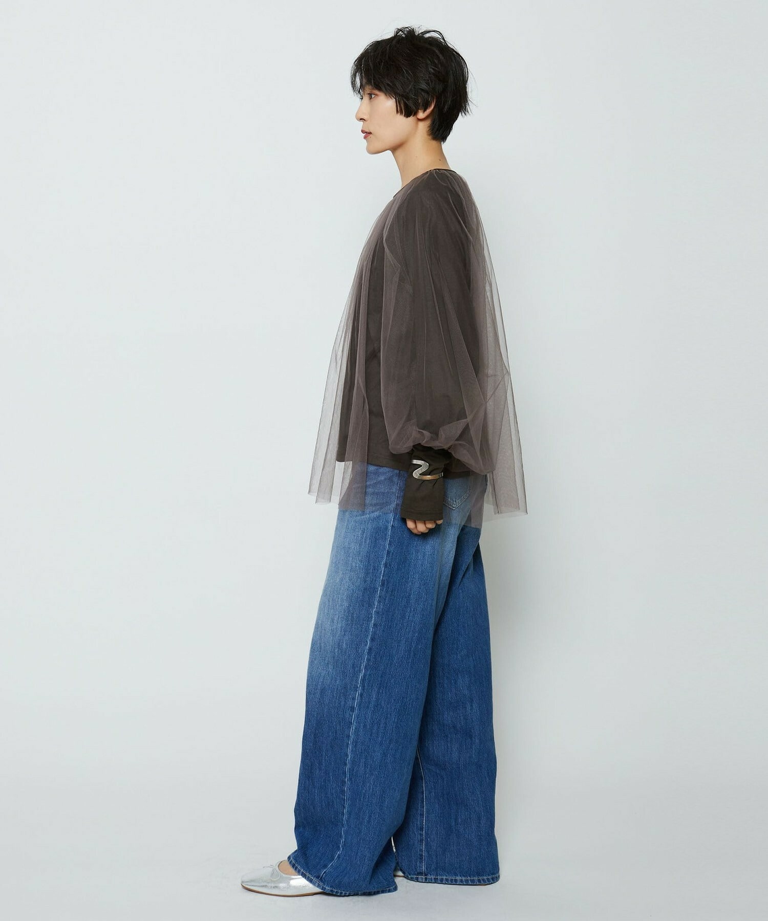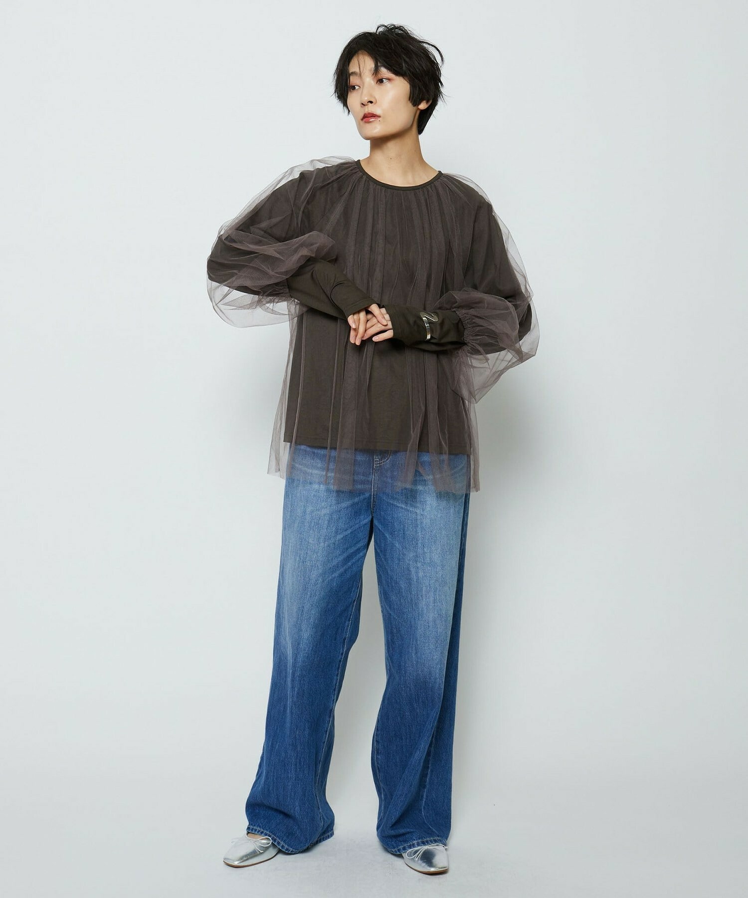 透け感のあるチュール素材をインナー付きで着やすく華やかなブラウスに仕上げました。チュール部分は贅沢にギャザーを入れボリュームを出したパフスリーブ。袖口がゴムになっているのでたくしあげて、ボリューミーなシルエットを出して着こなしてください。透け感チュールとインナーとのコントラストが楽しい一枚です。