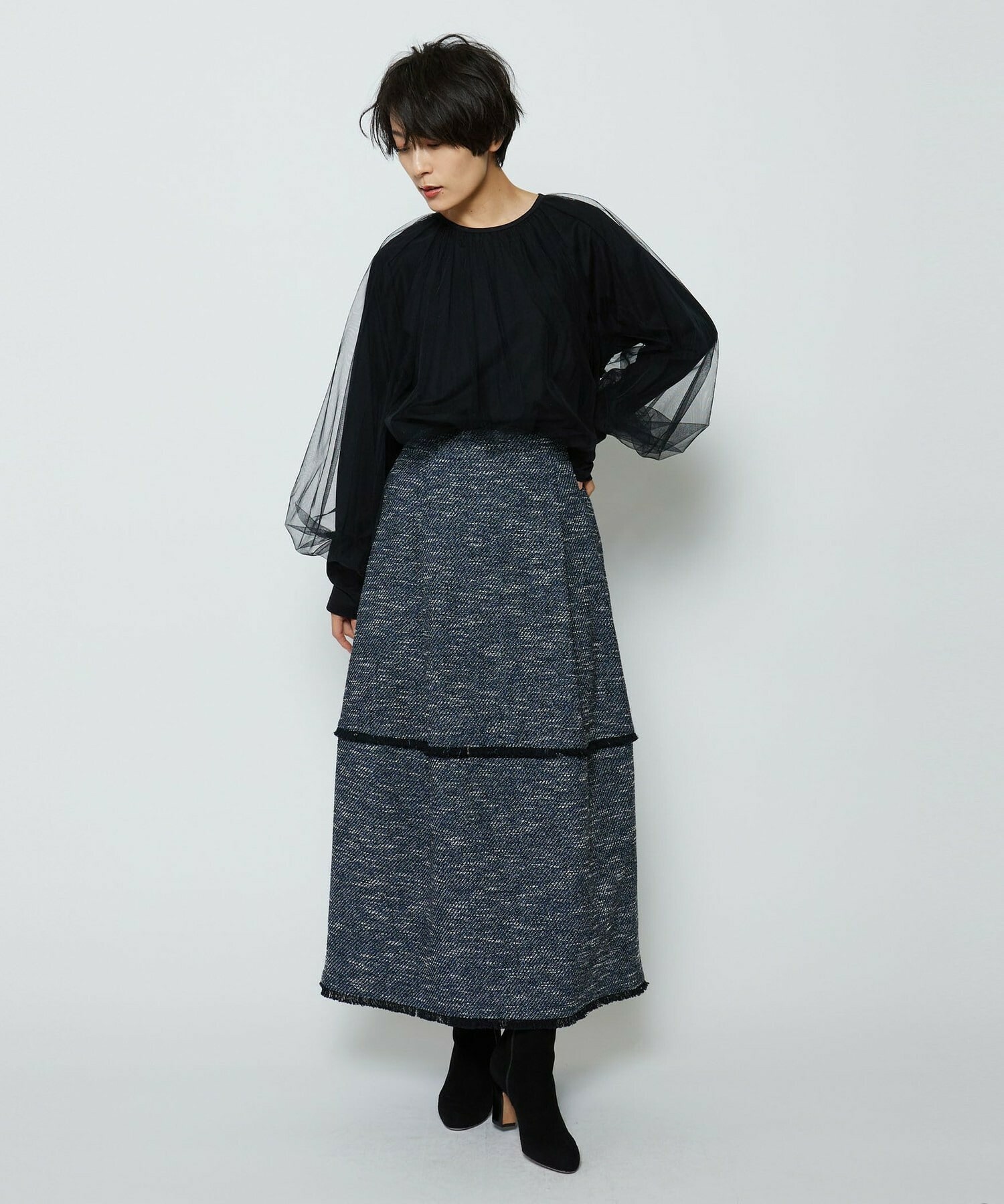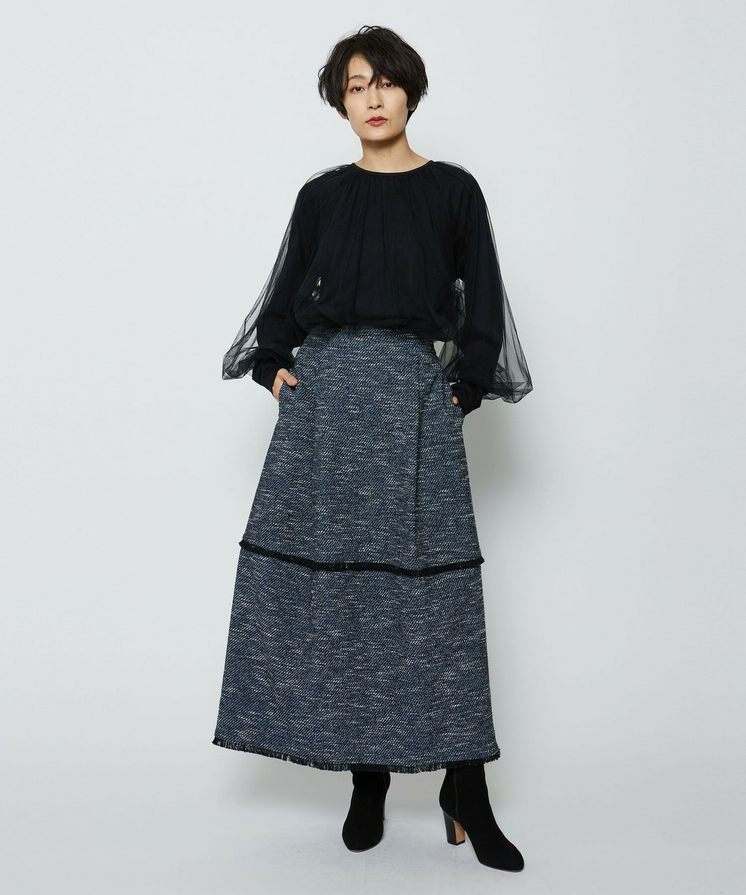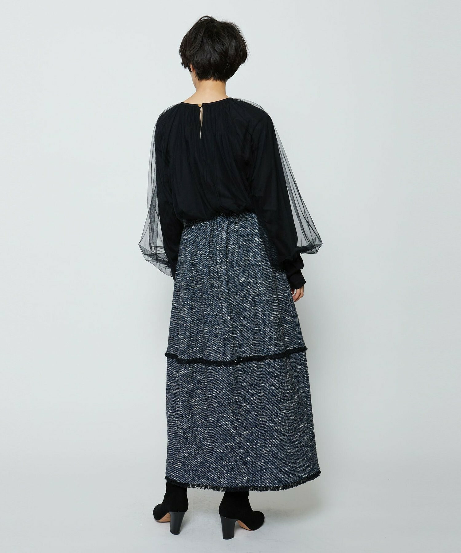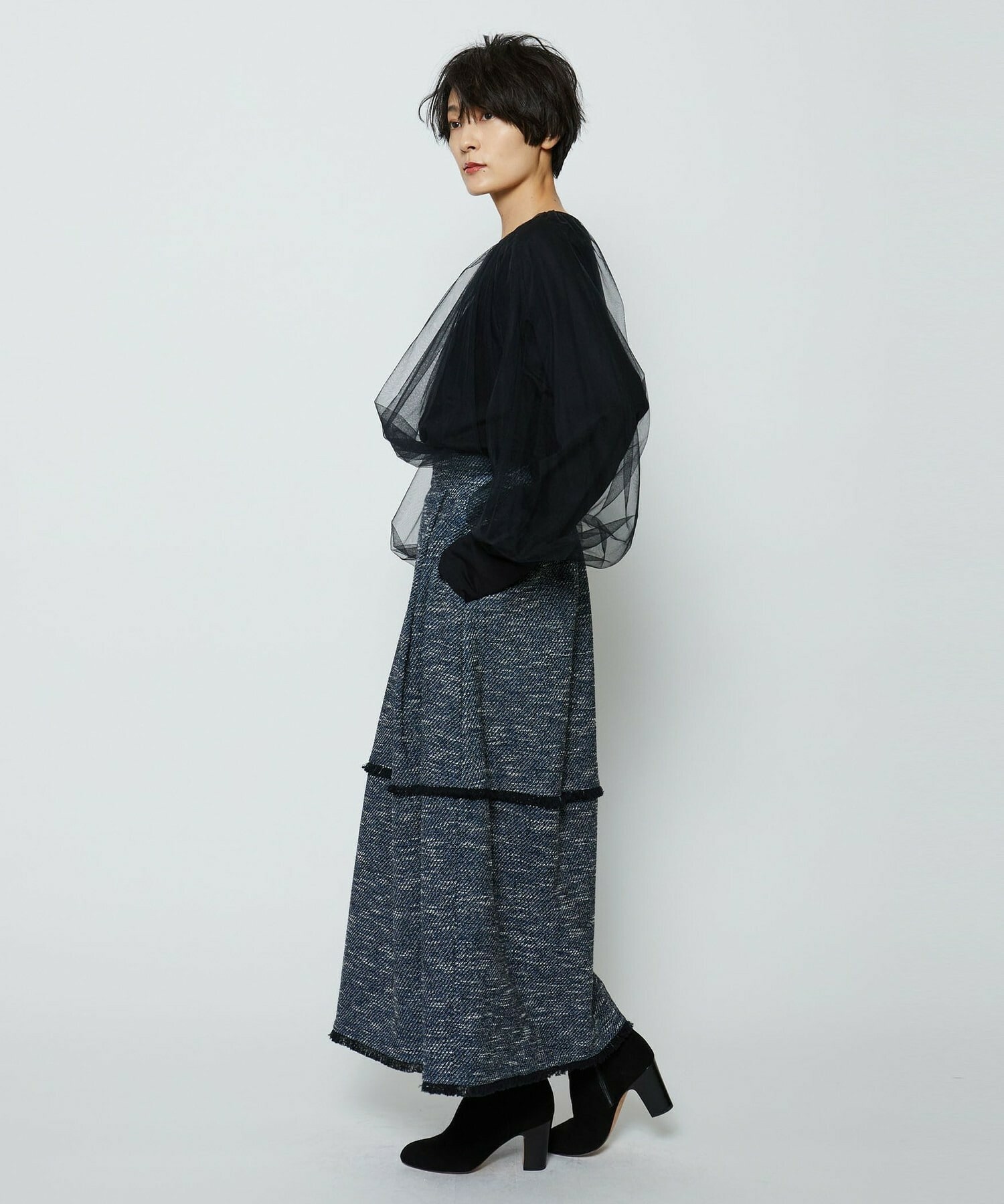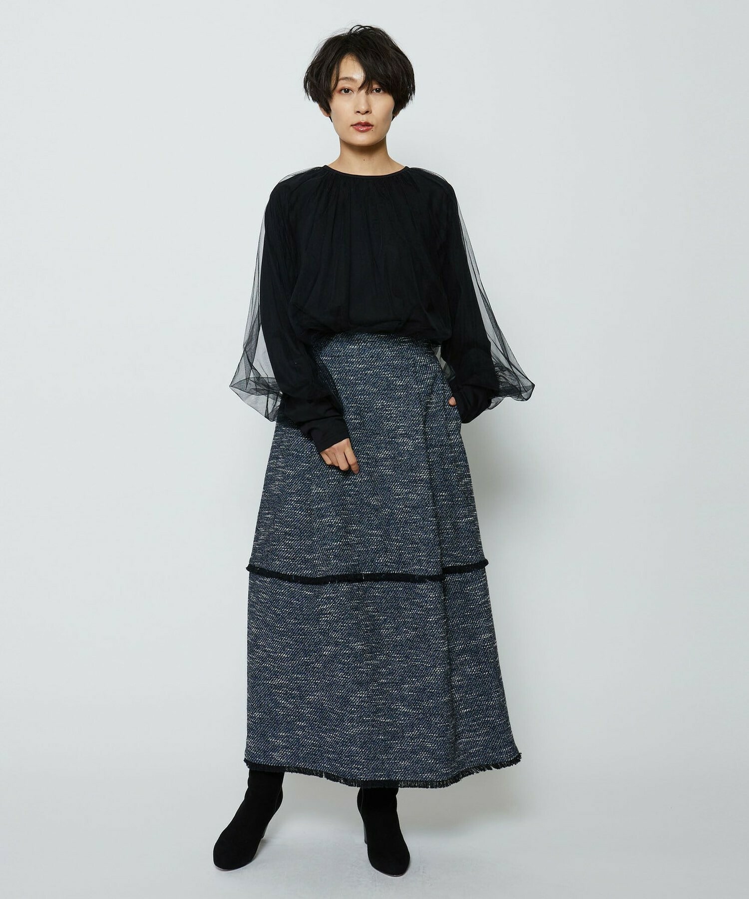 透け感のあるチュール素材をインナー付きで着やすく華やかなブラウスに仕上げました。チュール部分は贅沢にギャザーを入れボリュームを出したパフスリーブ。袖口がゴムになっているのでたくしあげて、ボリューミーなシルエットを出して着こなしてください。透け感チュールとインナーとのコントラストが楽しい一枚です。