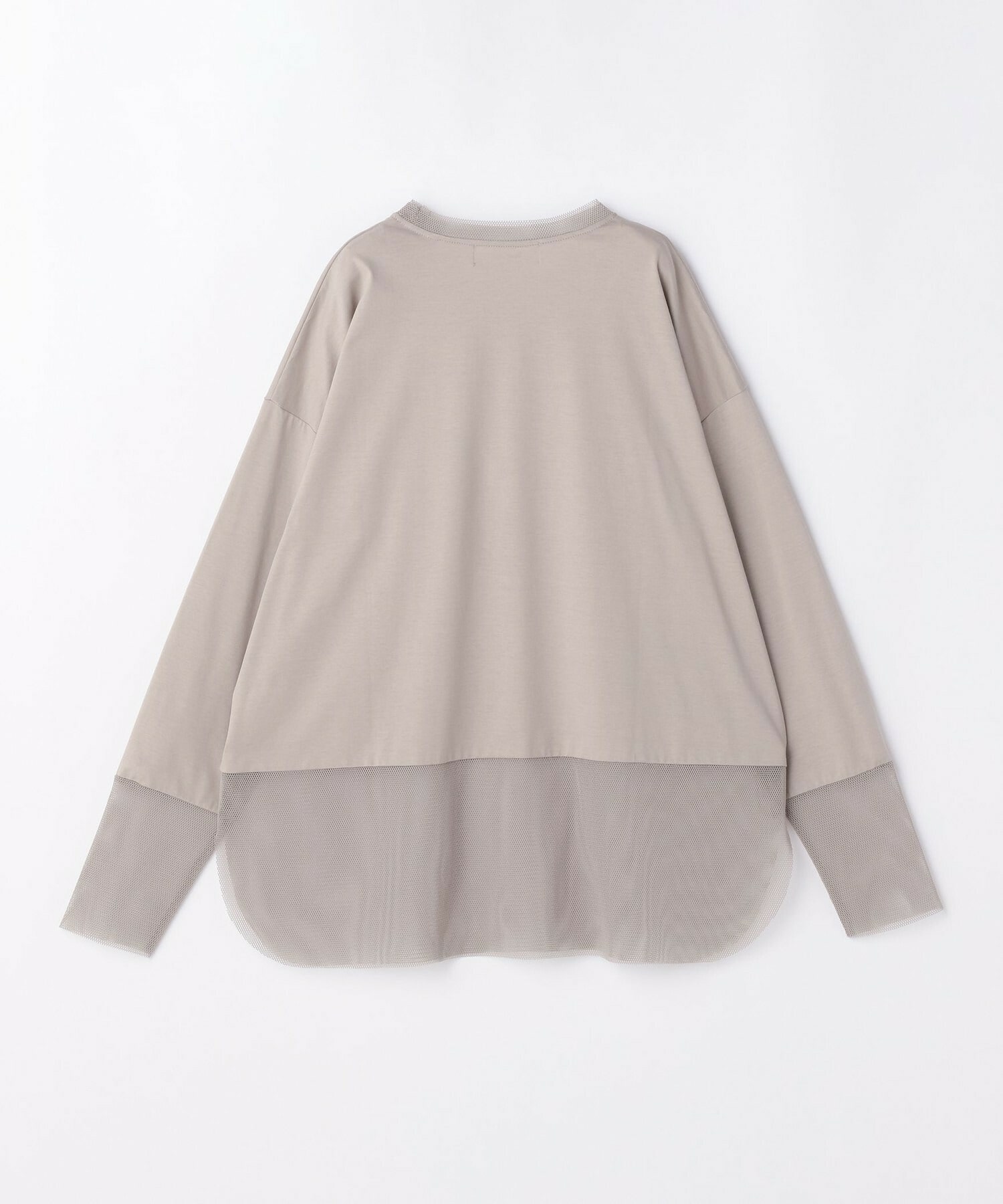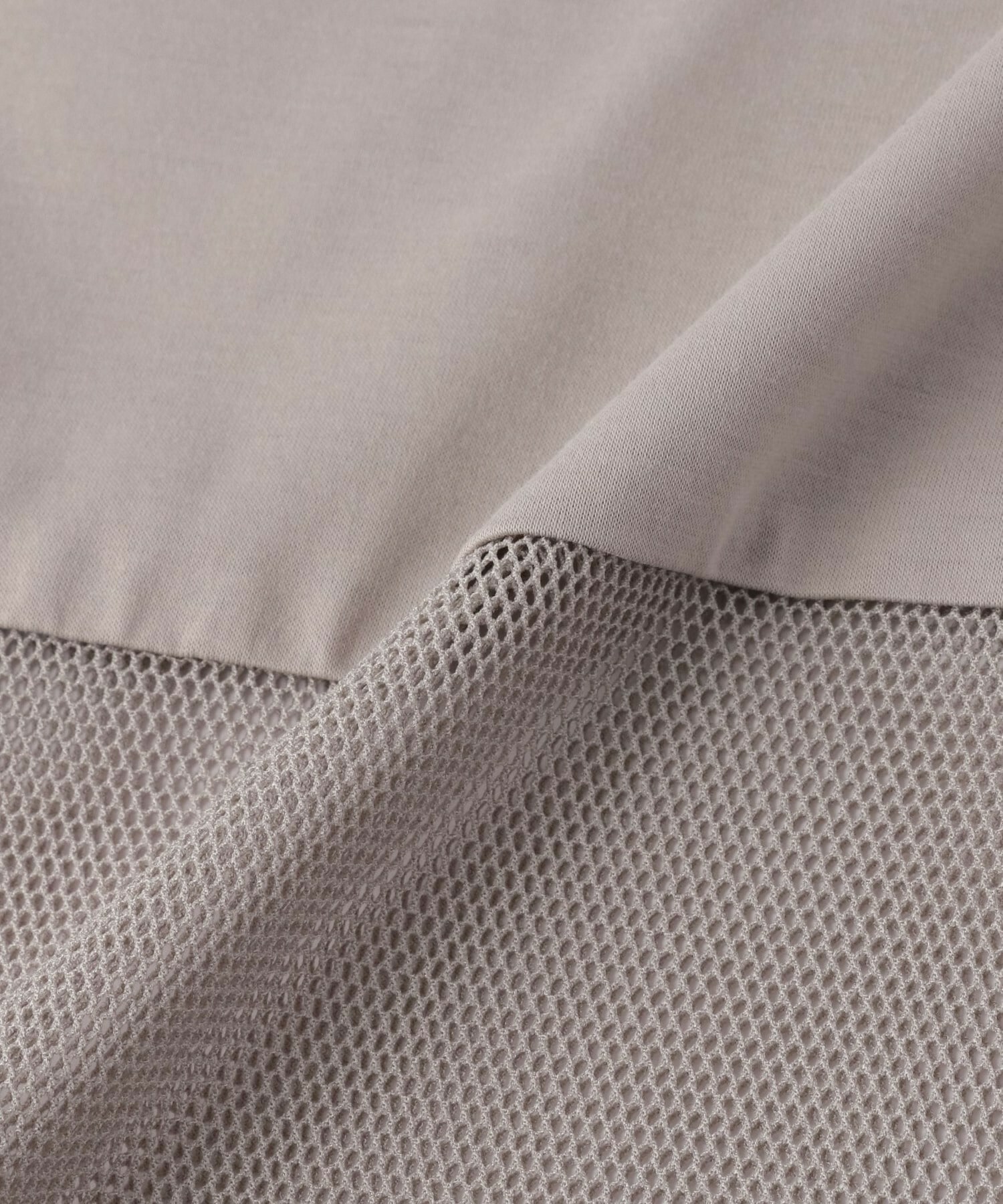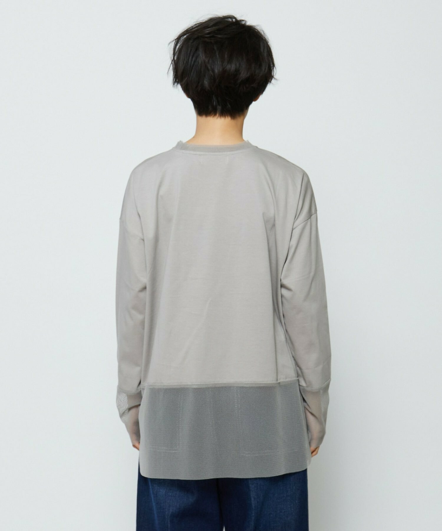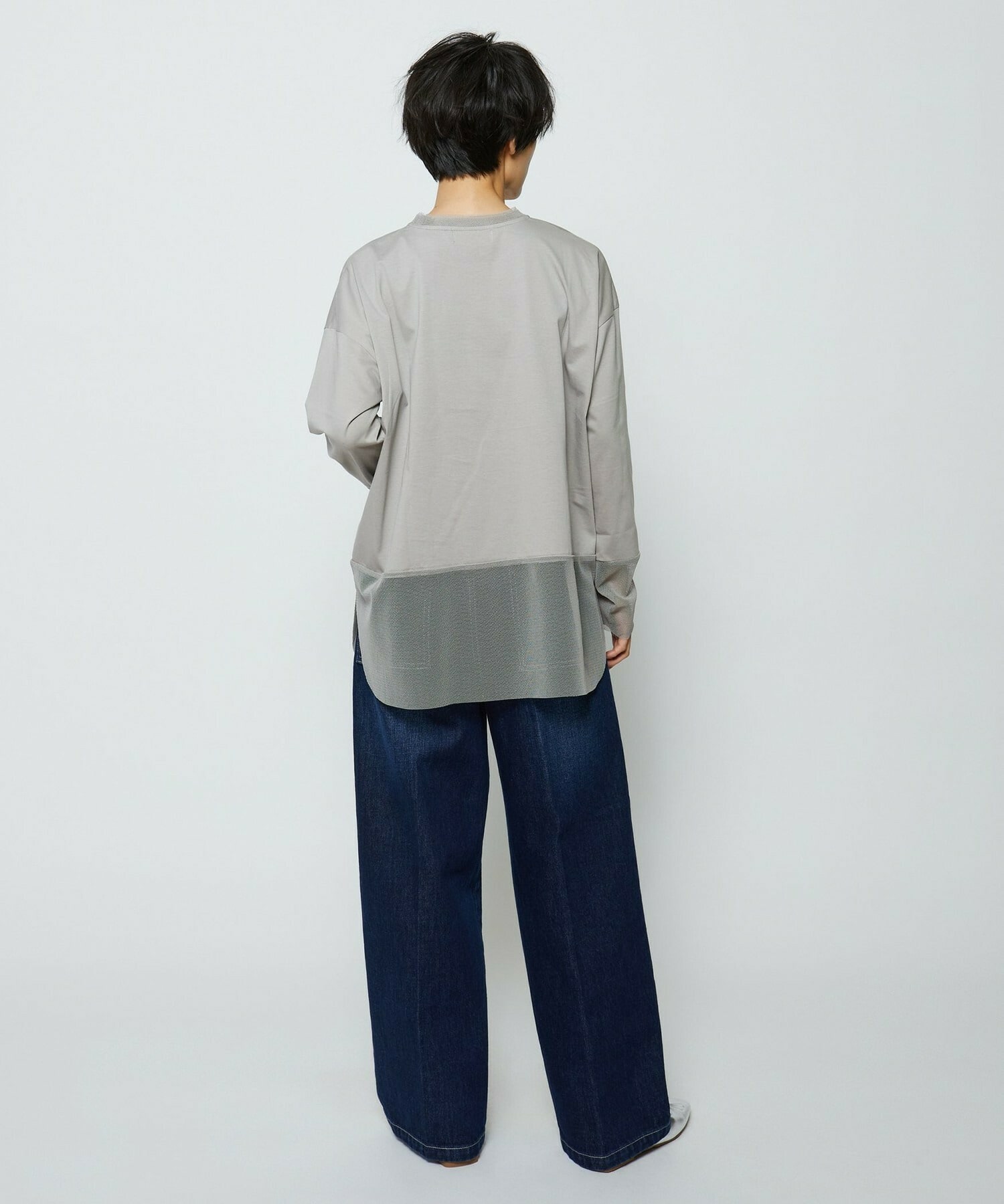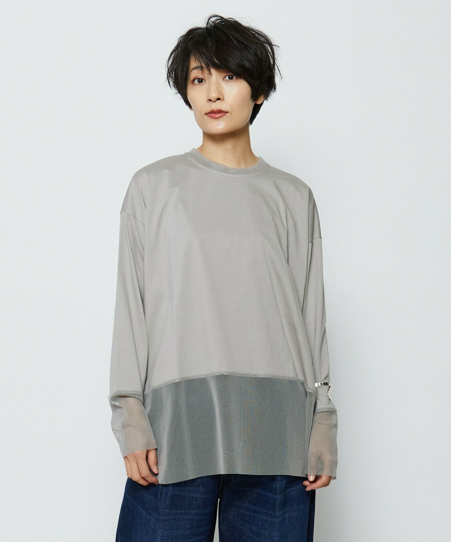 トレンド感のあるメッシュ素材と、天竺素材をドッキングしたプルオーバー。襟ぐりや袖、裾にはメッシュを配し、先々にニットなどと重ねた時に出してレイヤードを楽しめます。もちろん一枚着としても◎。