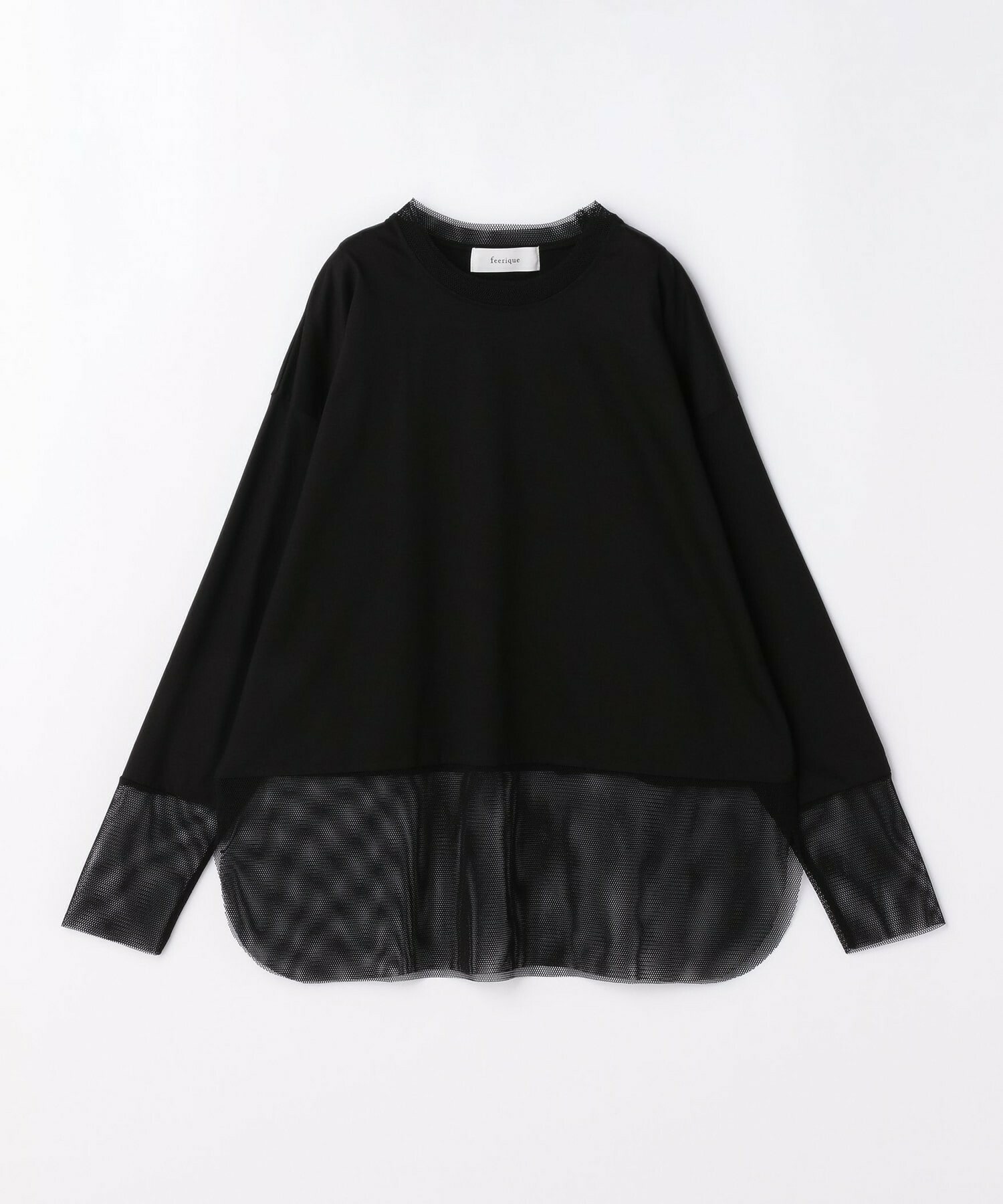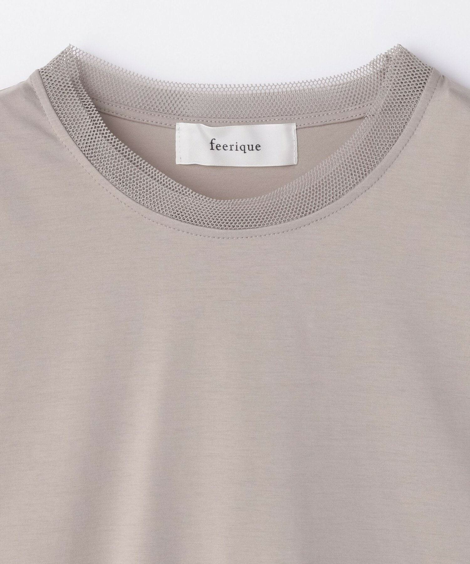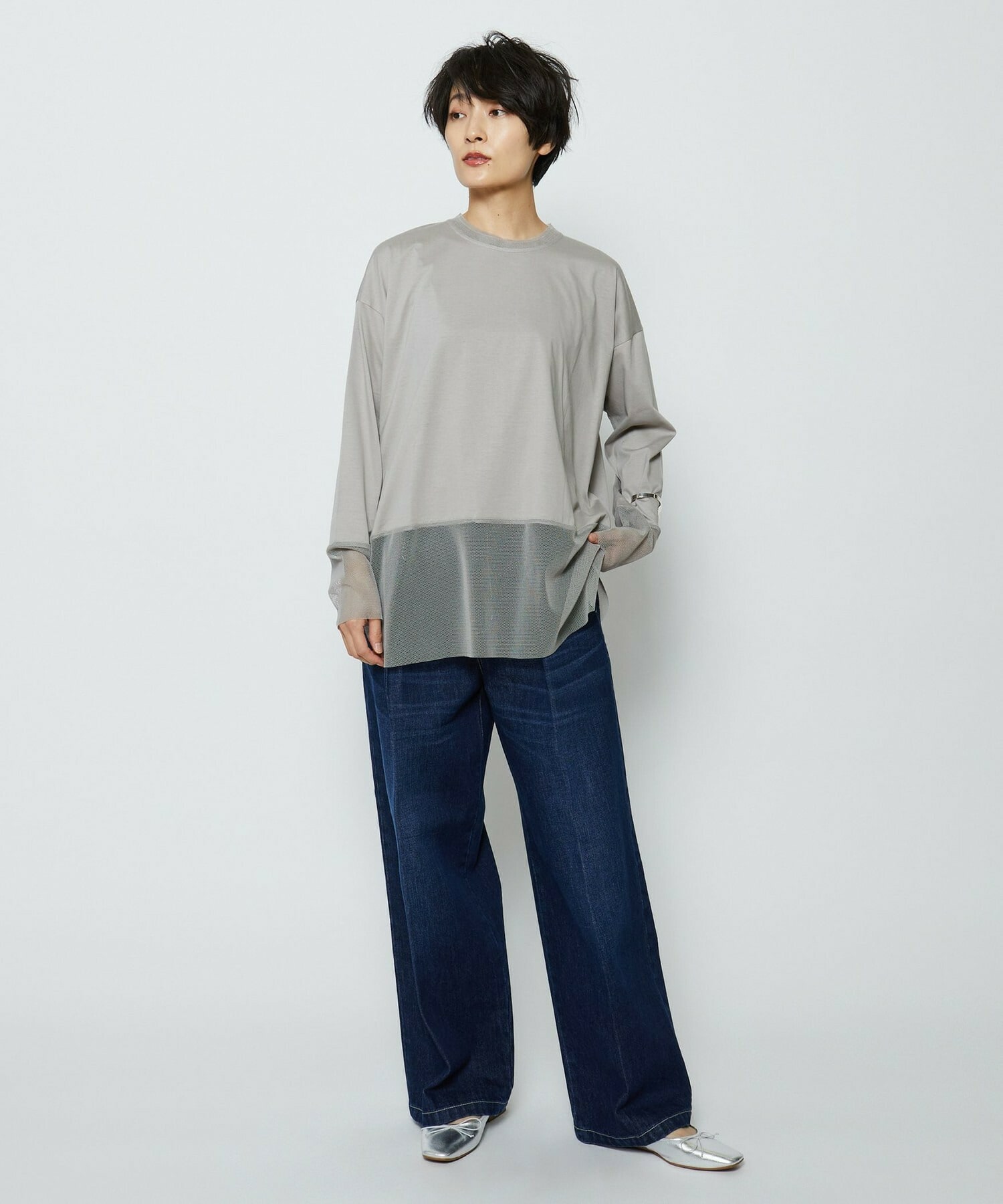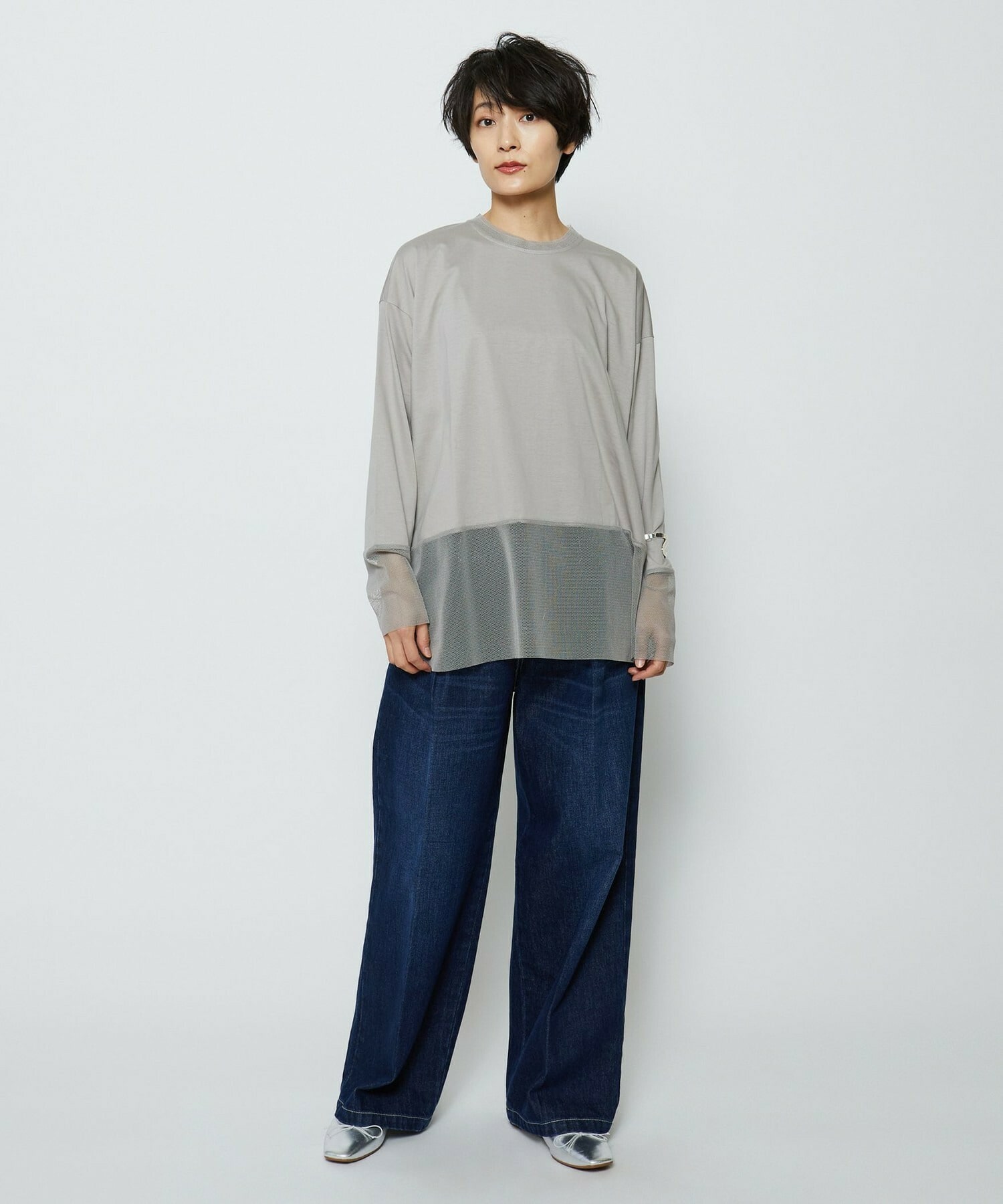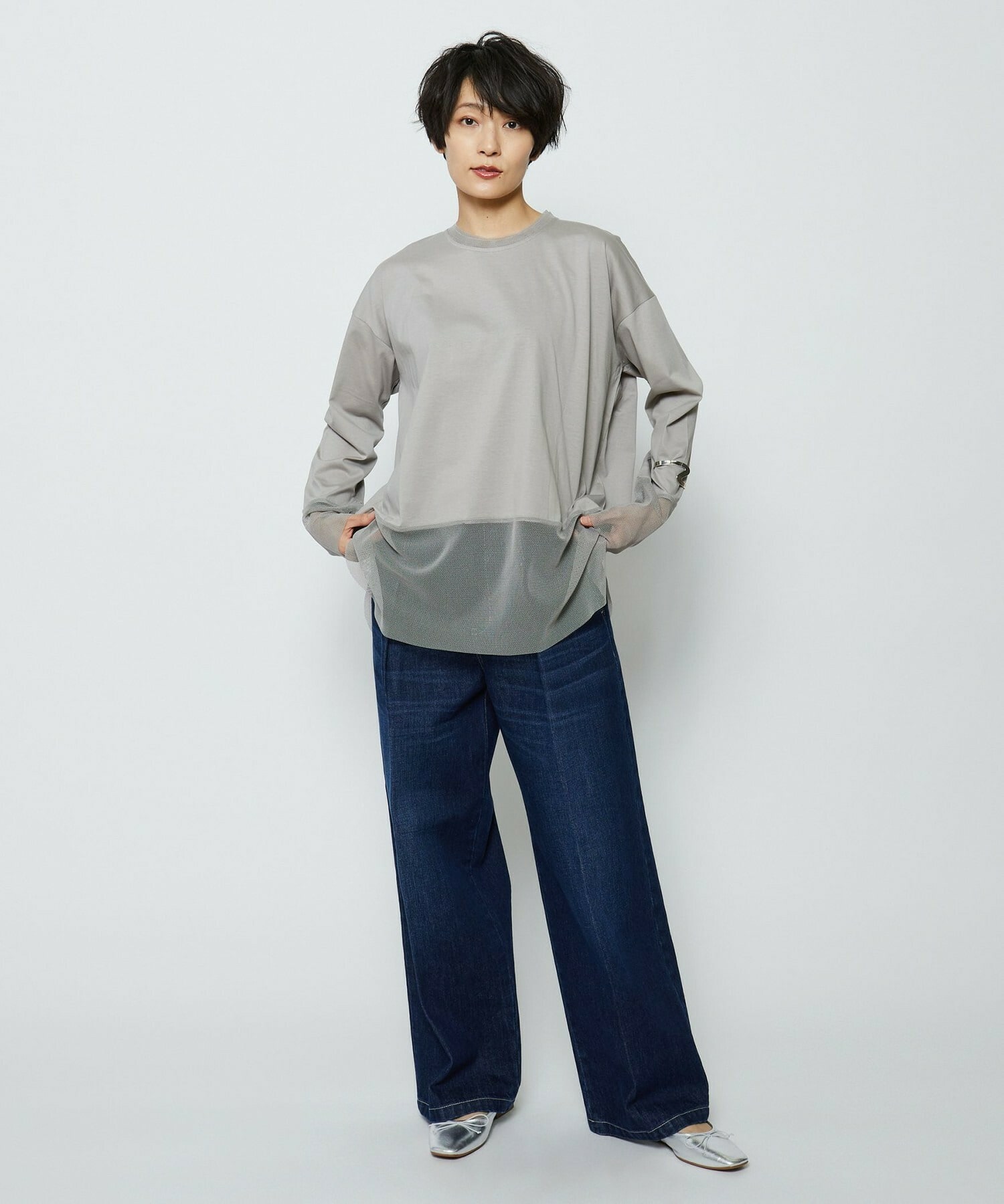 トレンド感のあるメッシュ素材と、天竺素材をドッキングしたプルオーバー。襟ぐりや袖、裾にはメッシュを配し、先々にニットなどと重ねた時に出してレイヤードを楽しめます。もちろん一枚着としても◎。