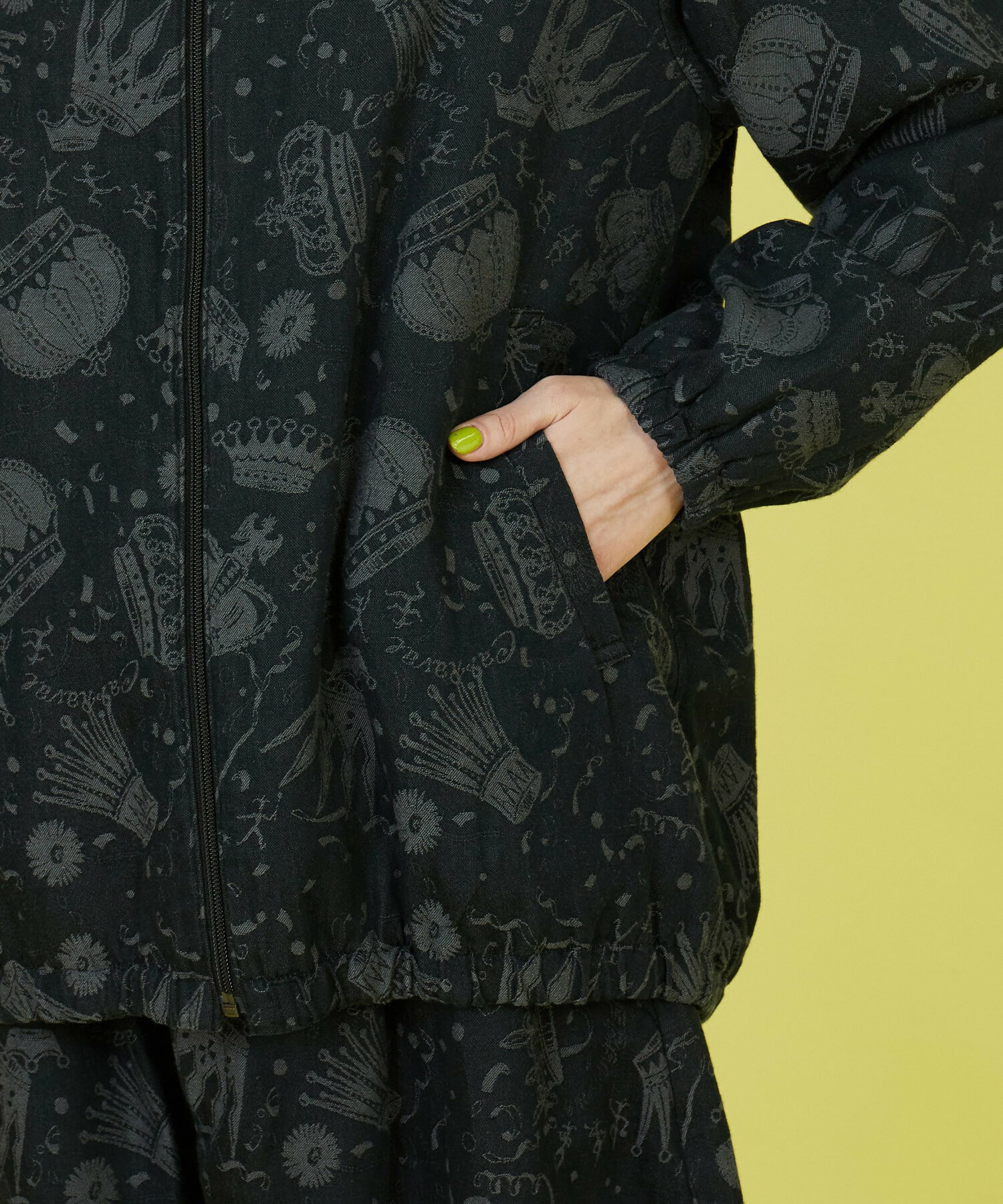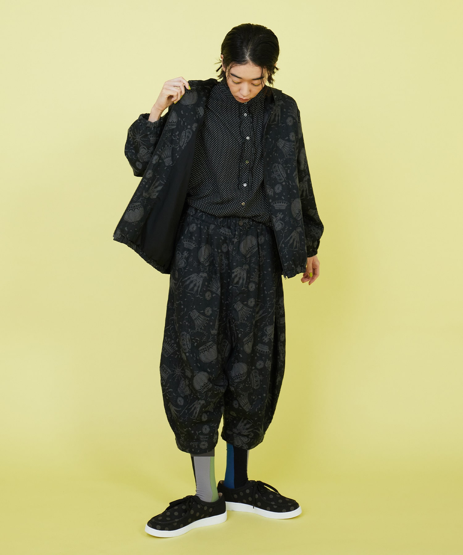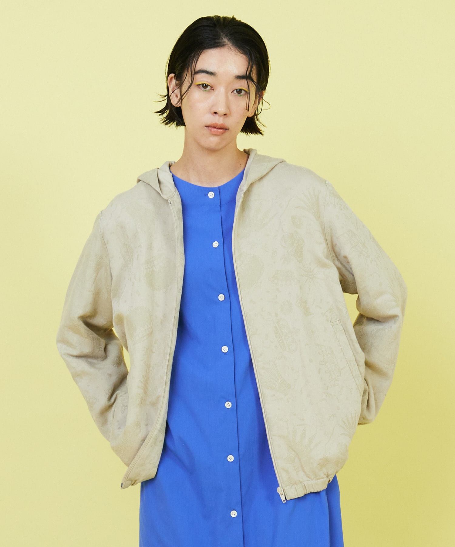 そこから着想したオリジナルのジャガード生地は綿/麻/レーヨンの糸を使い柔らかな光沢感と適度な膨らみにざっくりとした表情が特徴になっています。