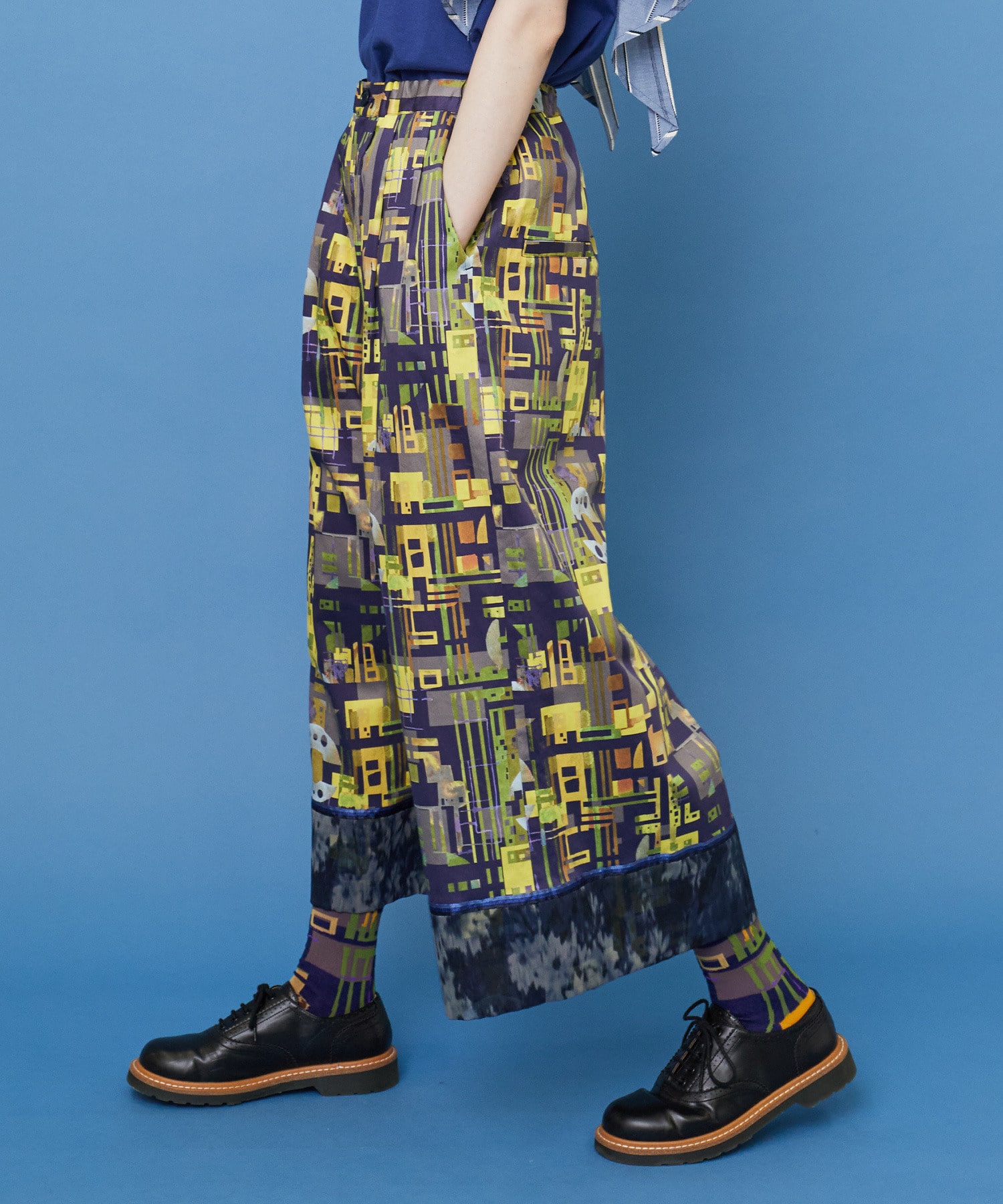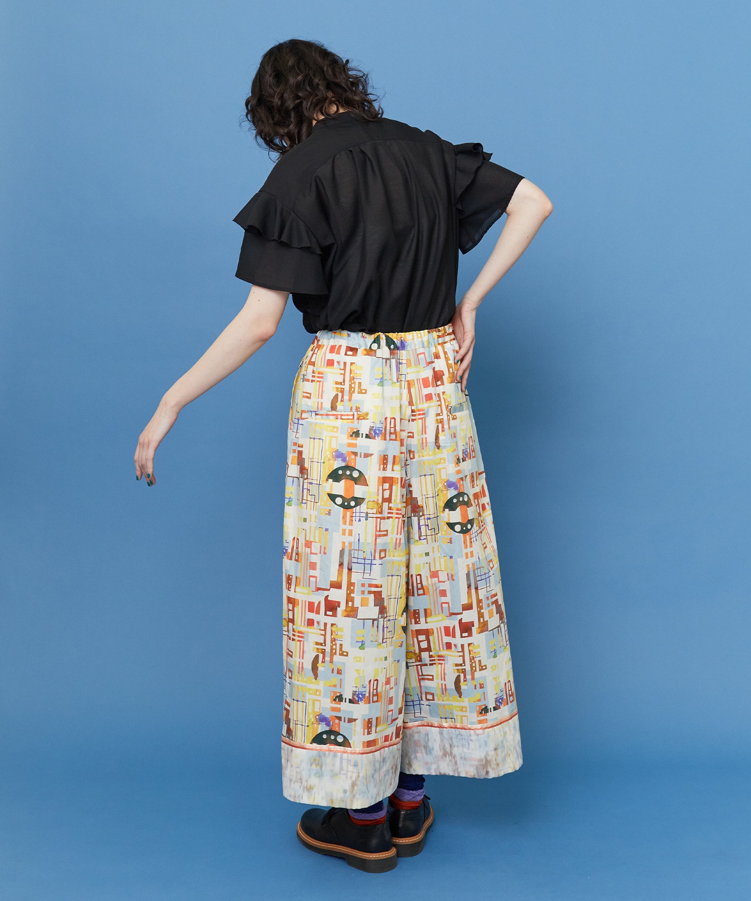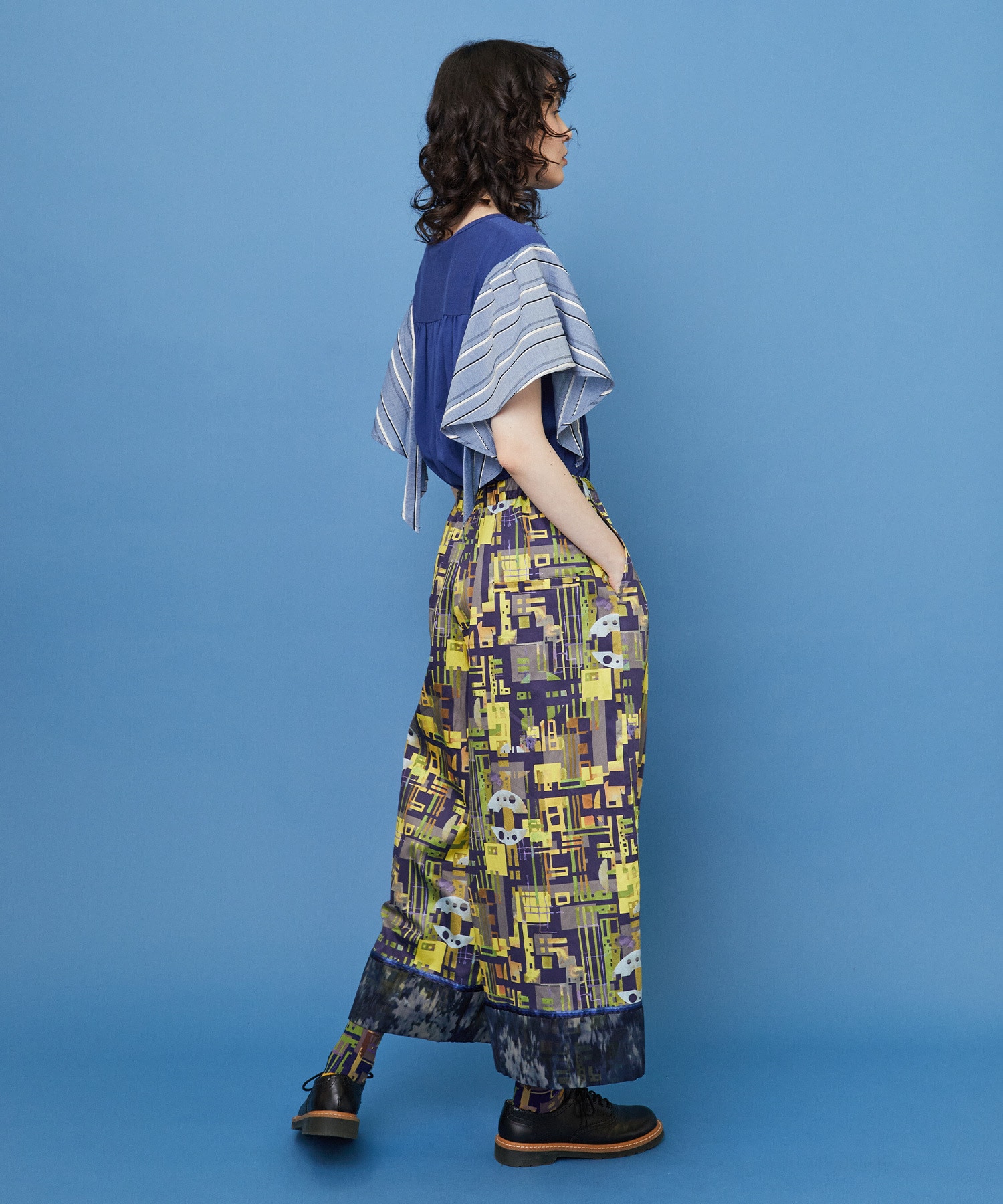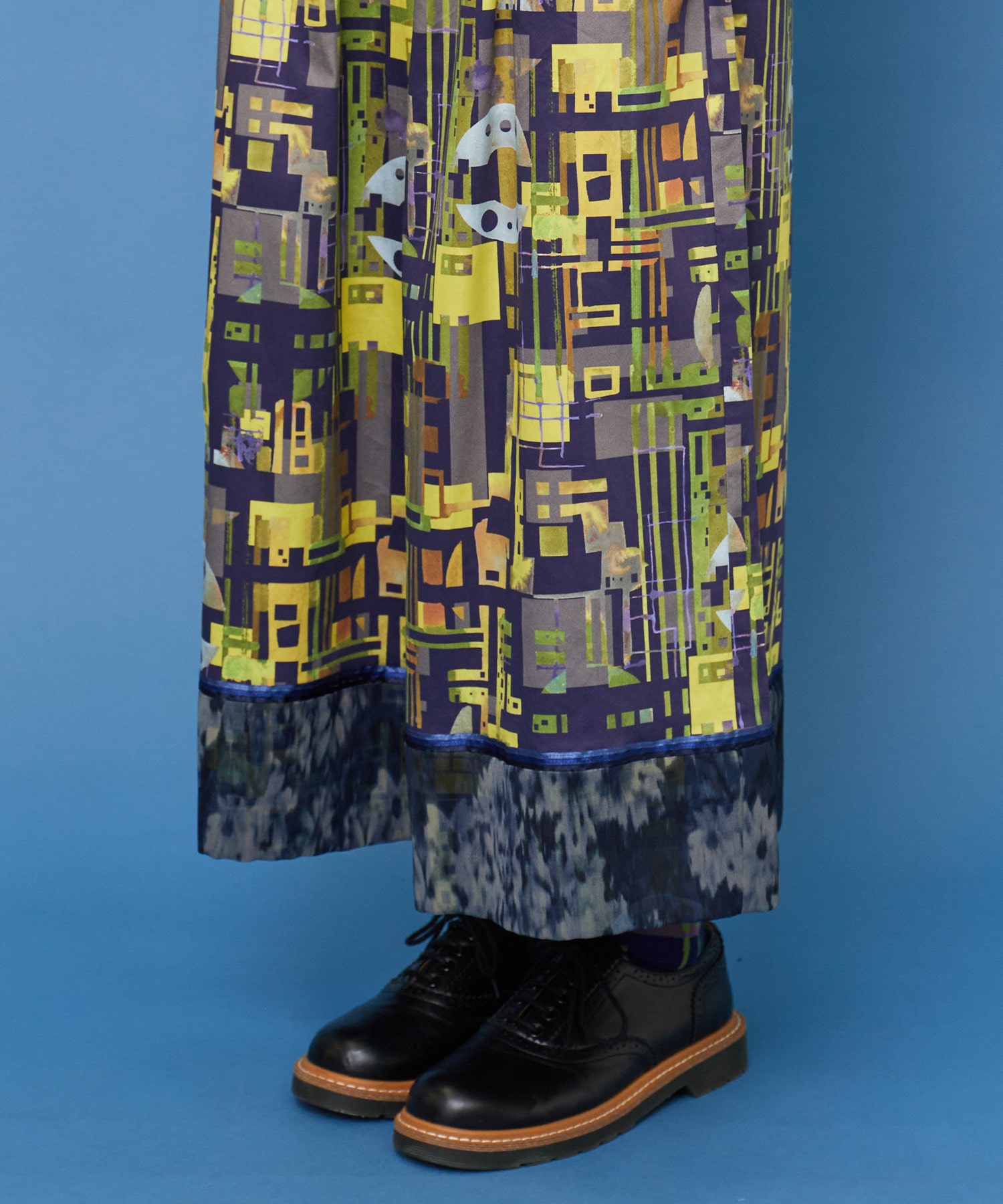 今シーズンのテーマ「マジック アワー」からのイメージで夕暮れのビル群の色の移り変わりを表現したプリント素材は綿の持つ肌触りの良さにサテン織りで織った生地特有のほのかな光沢感が上品で繊細にイメージを作っています。