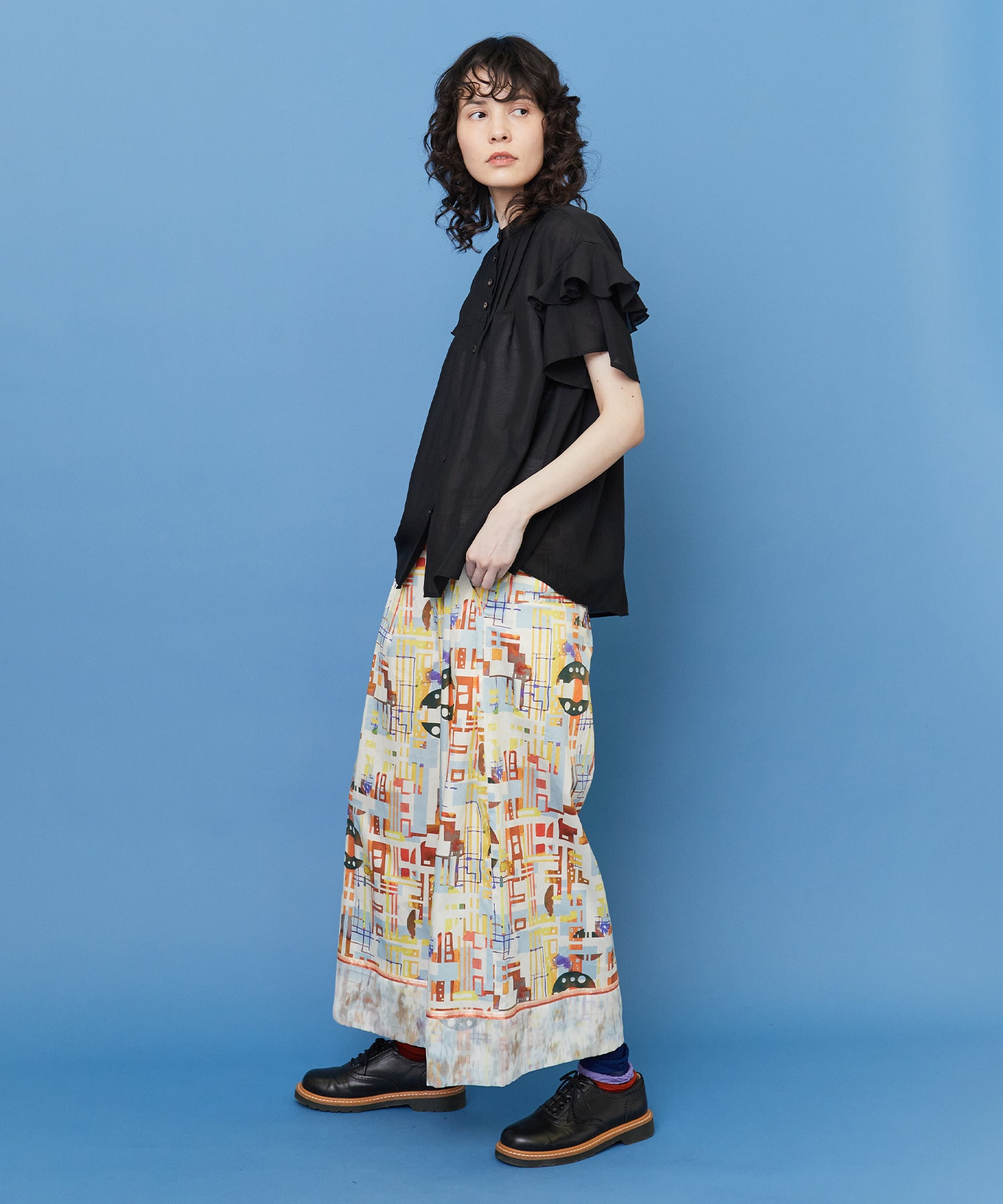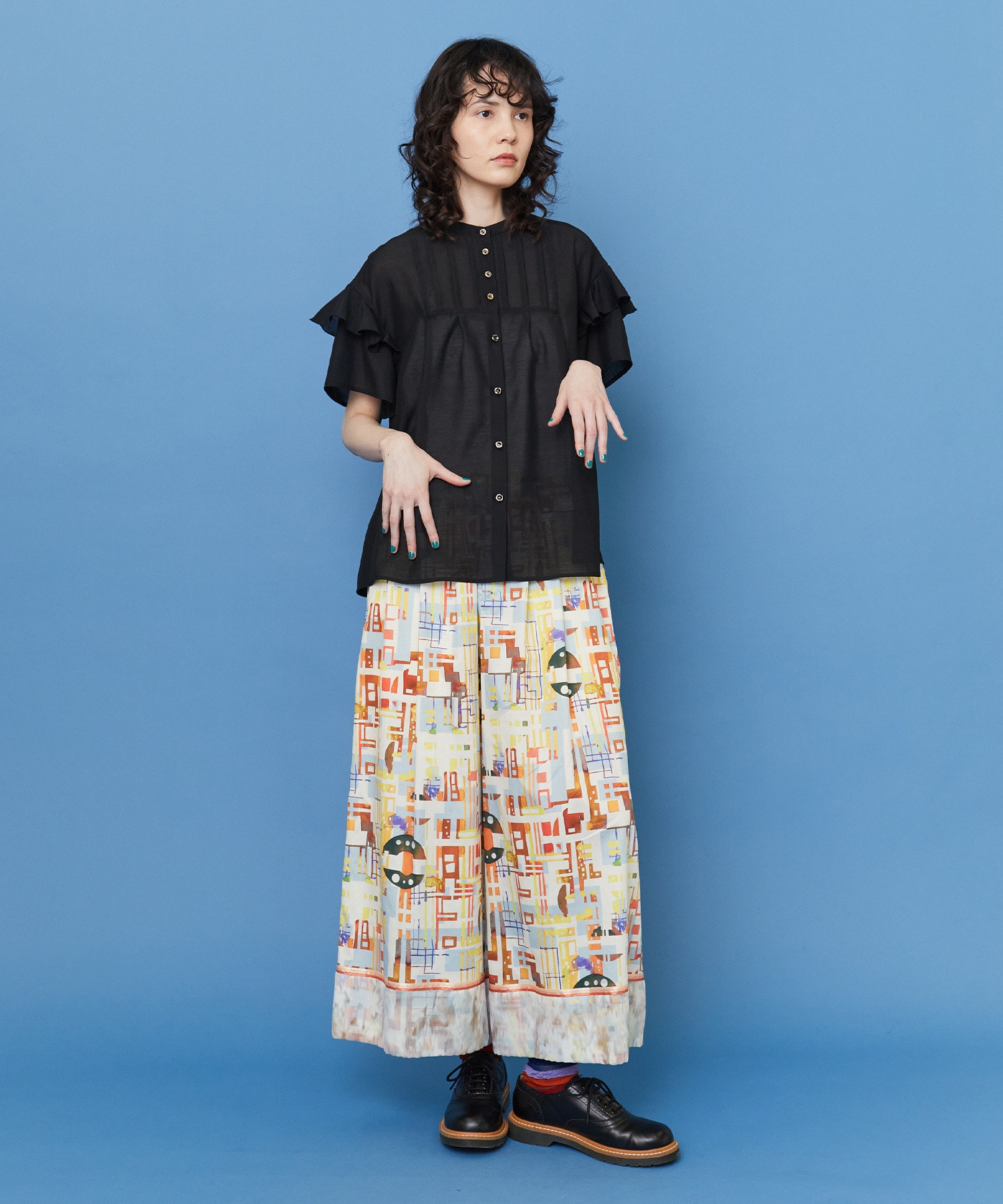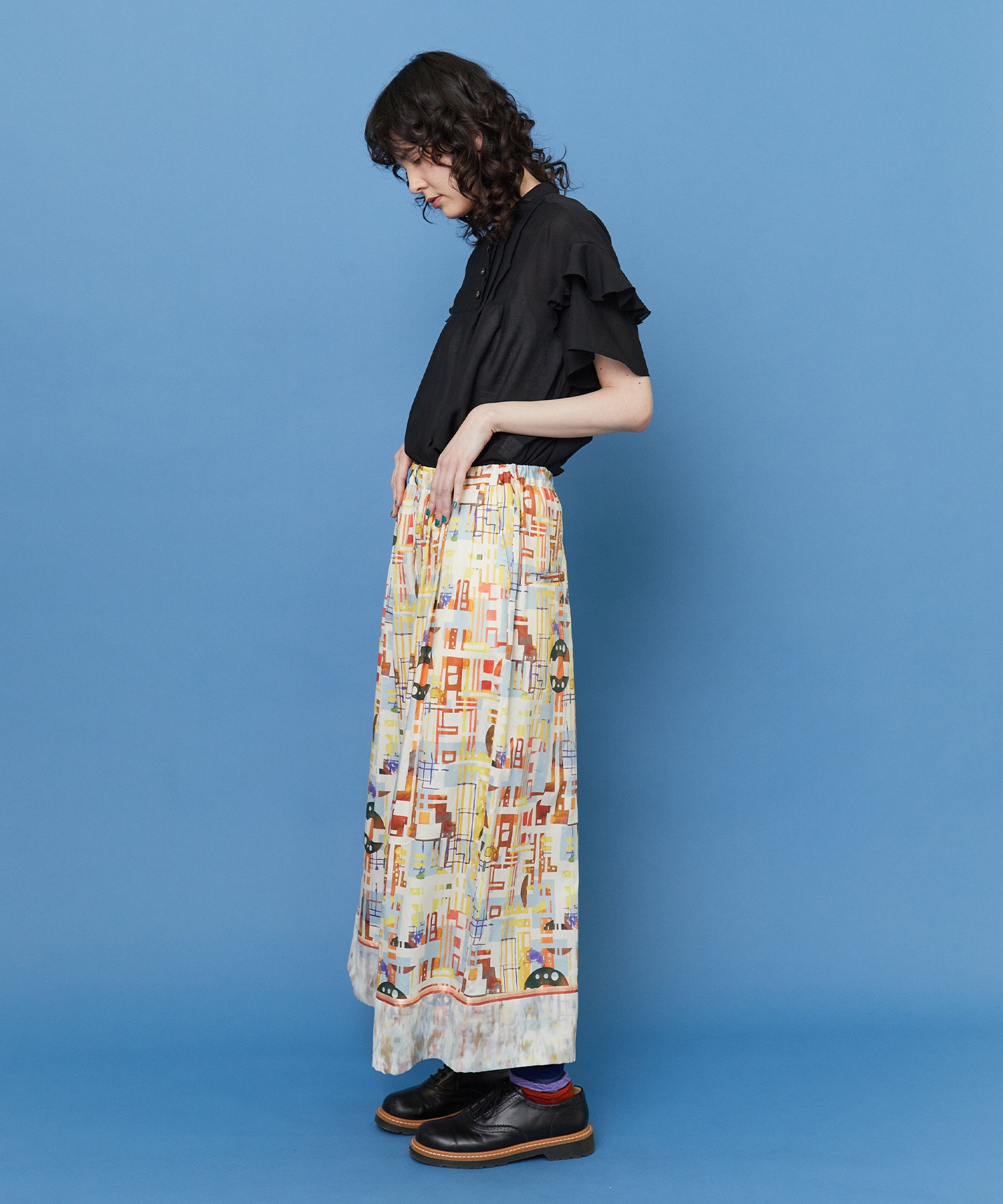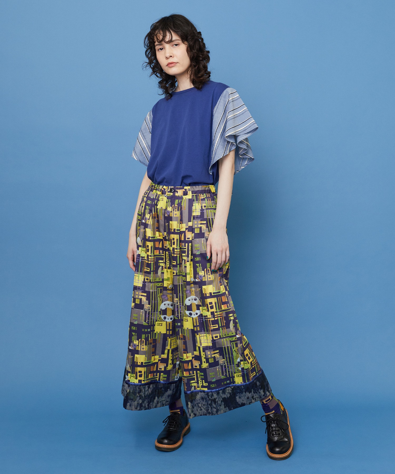 今シーズンのテーマ「マジック アワー」からのイメージで夕暮れのビル群の色の移り変わりを表現したプリント素材は綿の持つ肌触りの良さにサテン織りで織った生地特有のほのかな光沢感が上品で繊細にイメージを作っています。