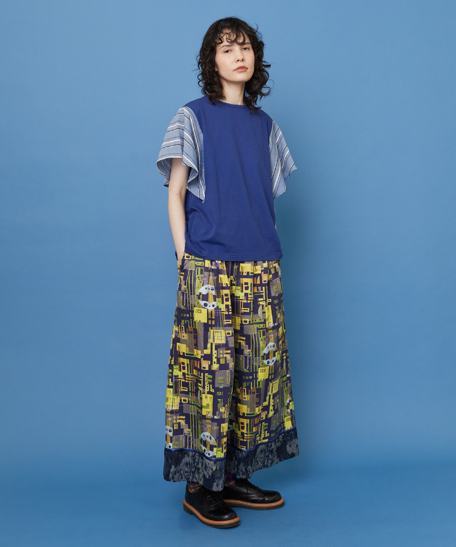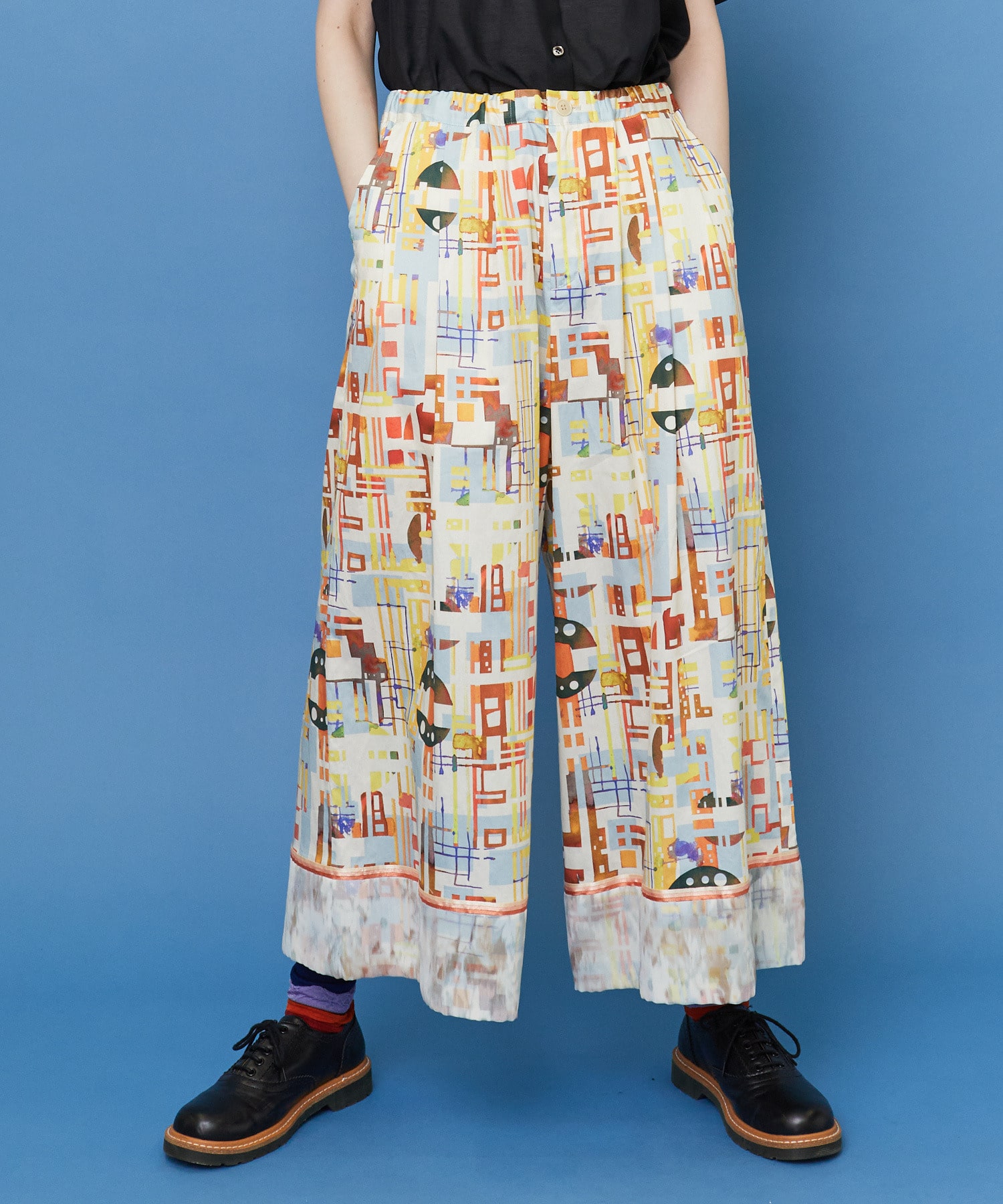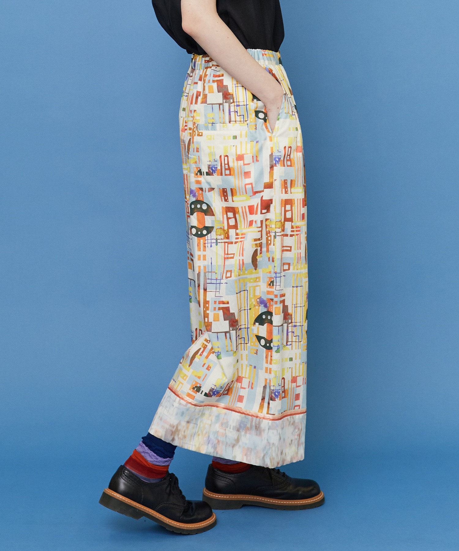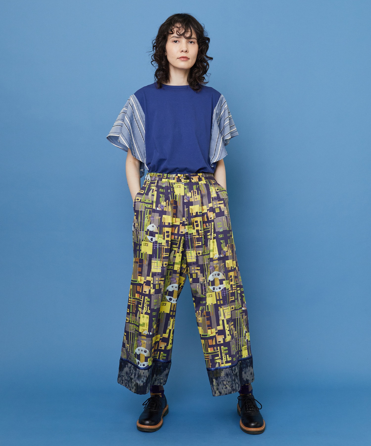 今シーズンのテーマ「マジック アワー」からのイメージで夕暮れのビル群の色の移り変わりを表現したプリント素材は綿の持つ肌触りの良さにサテン織りで織った生地特有のほのかな光沢感が上品で繊細にイメージを作っています。