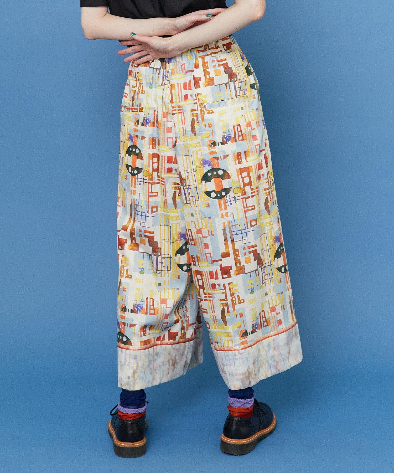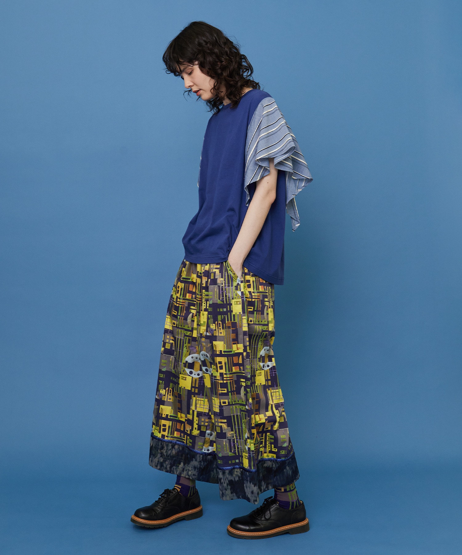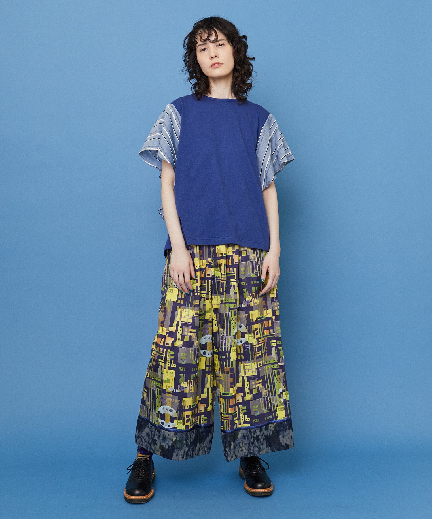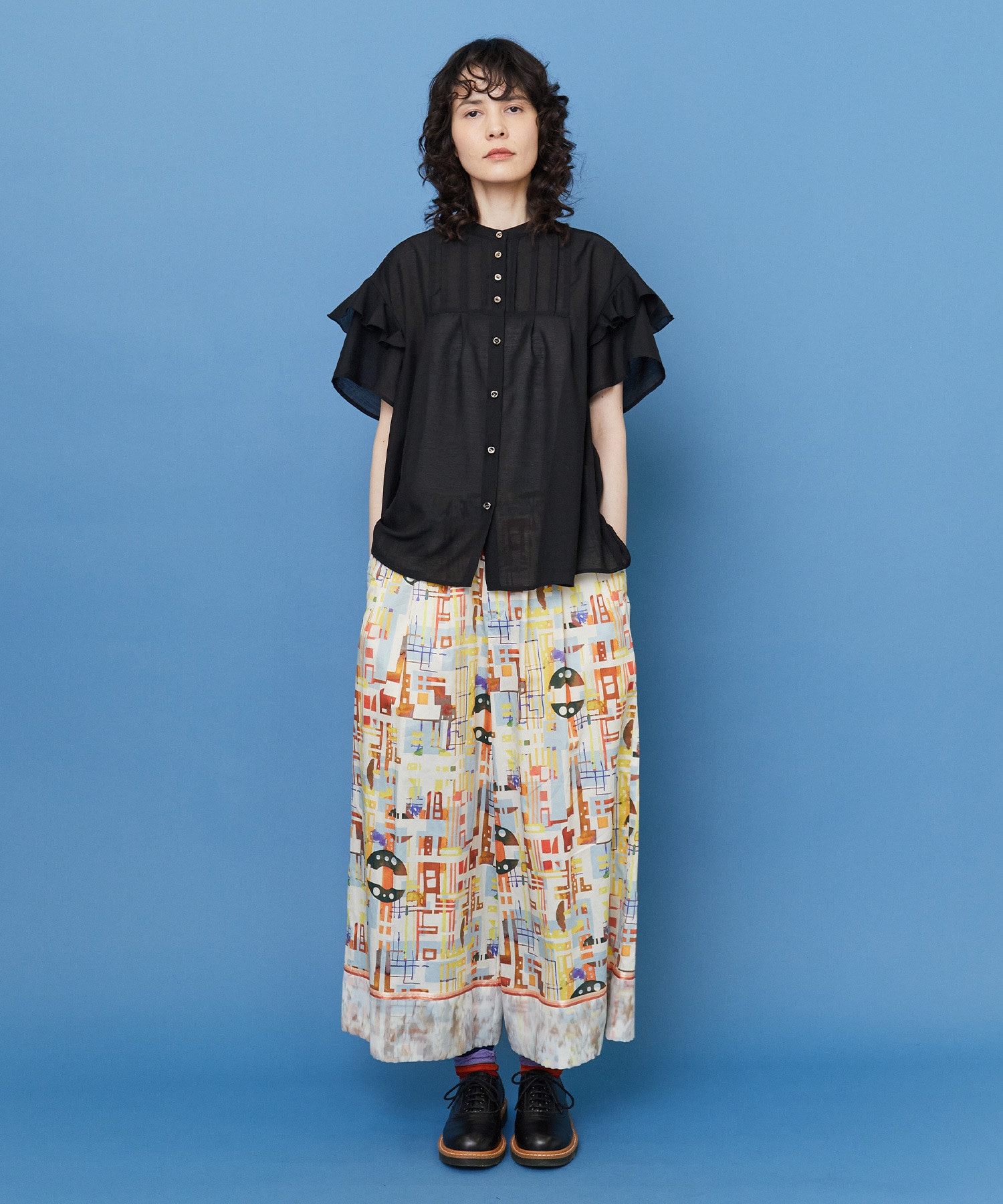 今シーズンのテーマ「マジック アワー」からのイメージで夕暮れのビル群の色の移り変わりを表現したプリント素材は綿の持つ肌触りの良さにサテン織りで織った生地特有のほのかな光沢感が上品で繊細にイメージを作っています。