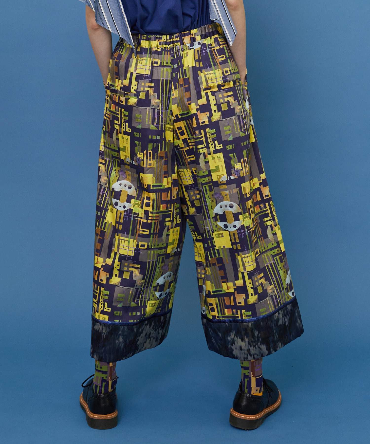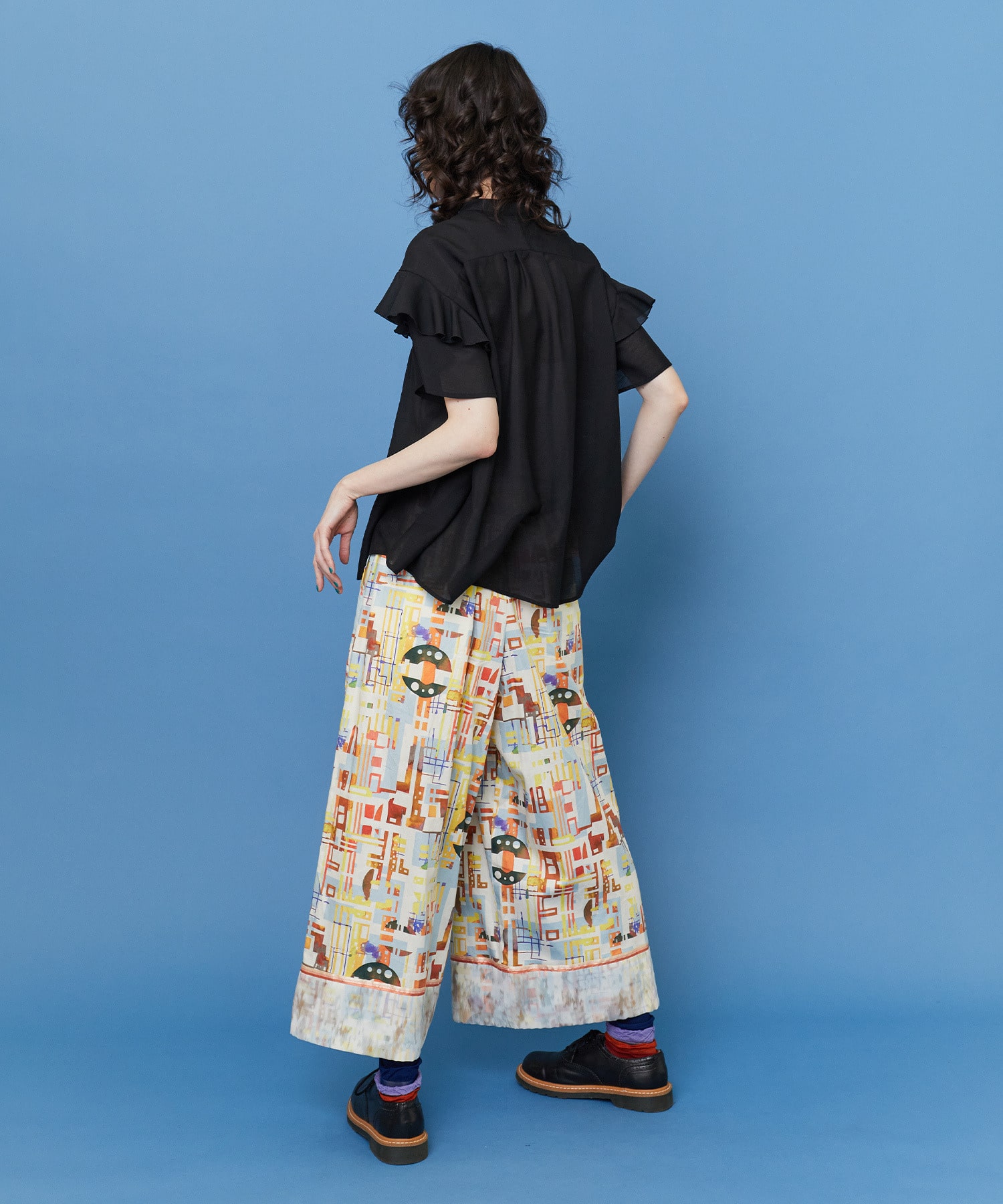 ヒップから太ももにかけて大きくゆとりを持たせたワイドシルエットのパンツの裾にシアーな透け感が特徴の素材を重ねて、そこにグラデーション状に重ねたテープを繊細に付けたデザイン。
