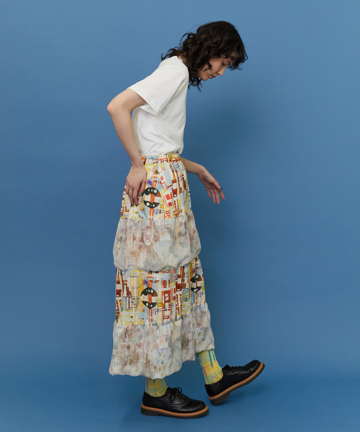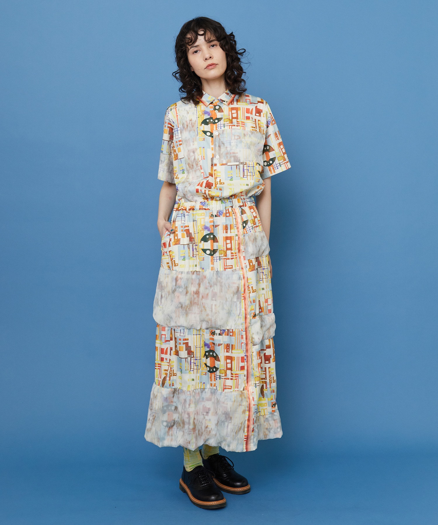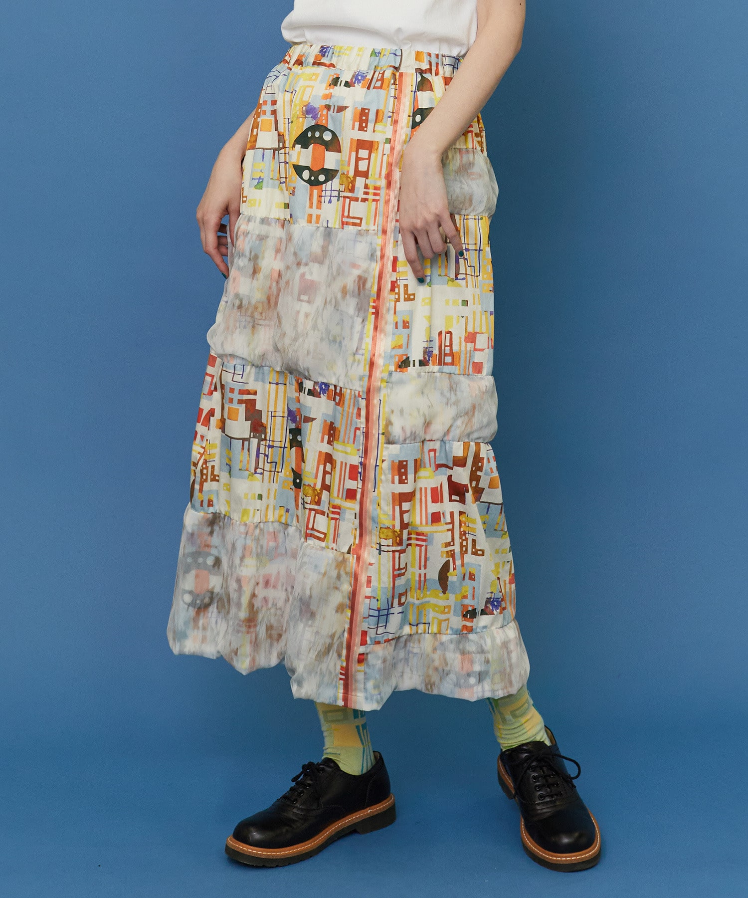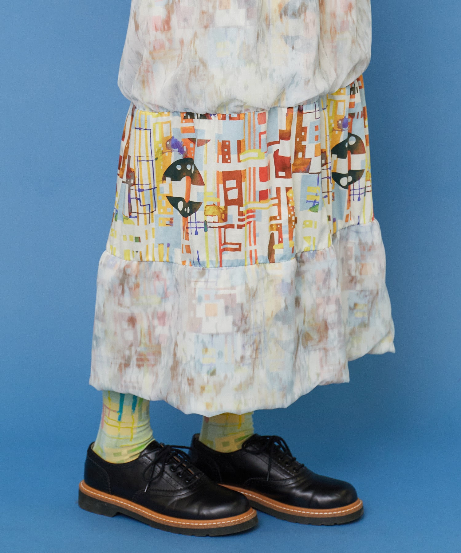 全体的に大胆に切り替えを入れたコクーンシルエットのスカートは部分的にシアーな素材を重ねて膨らみを出し、立体的でエアリーな表情を作り上げています。