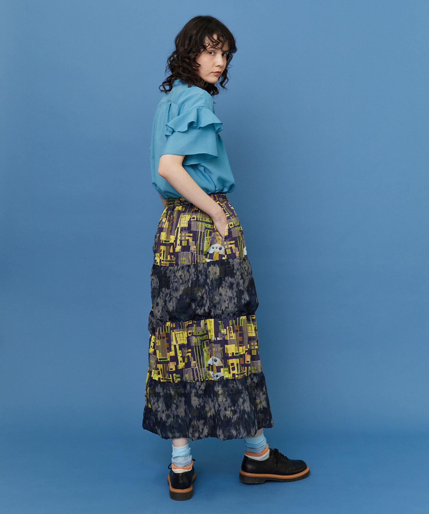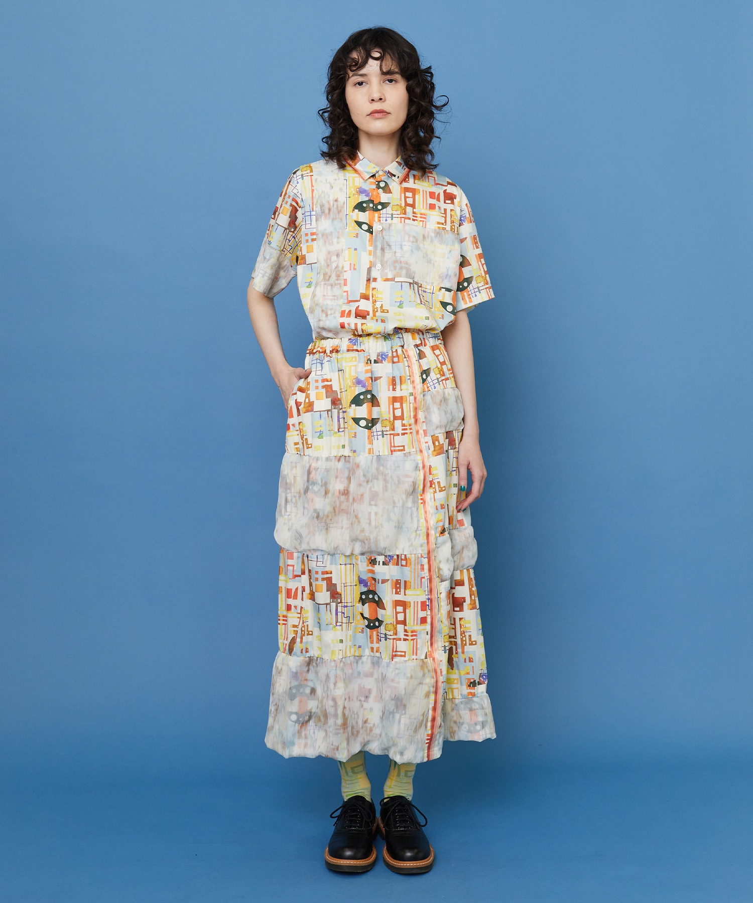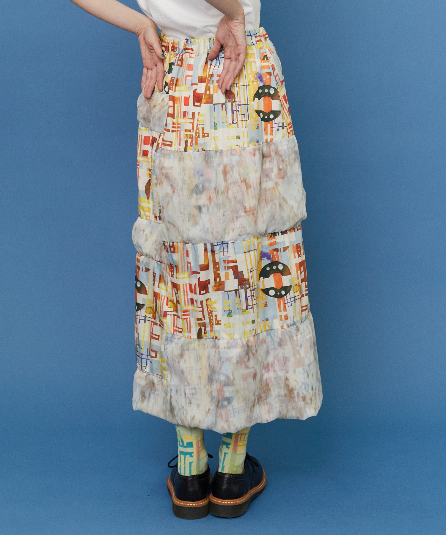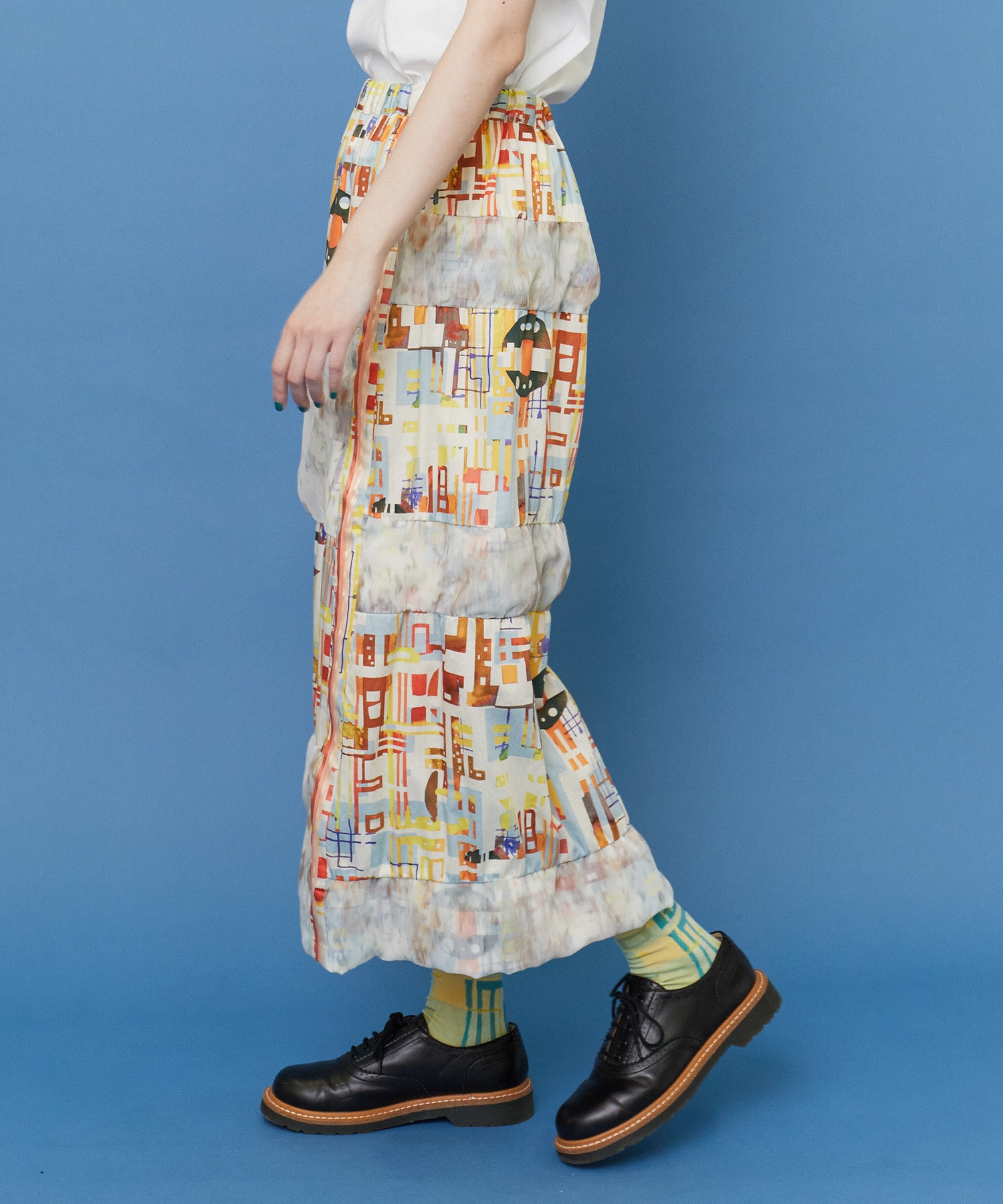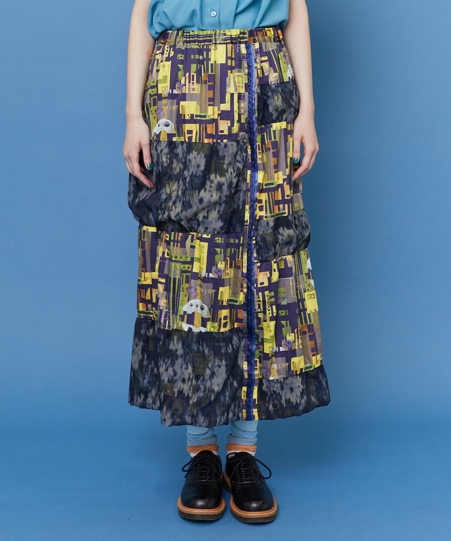 全体的に大胆に切り替えを入れたコクーンシルエットのスカートは部分的にシアーな素材を重ねて膨らみを出し、立体的でエアリーな表情を作り上げています。