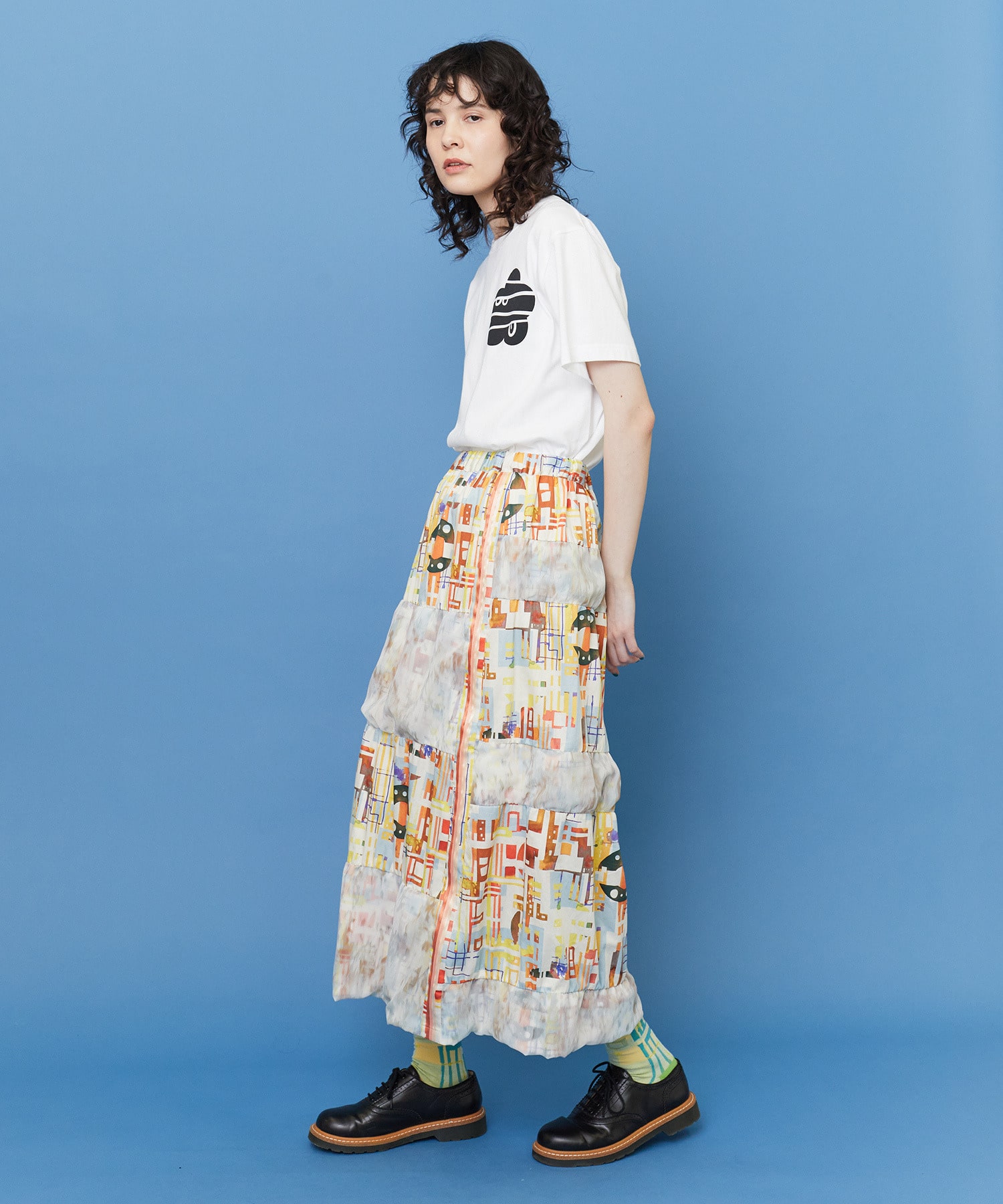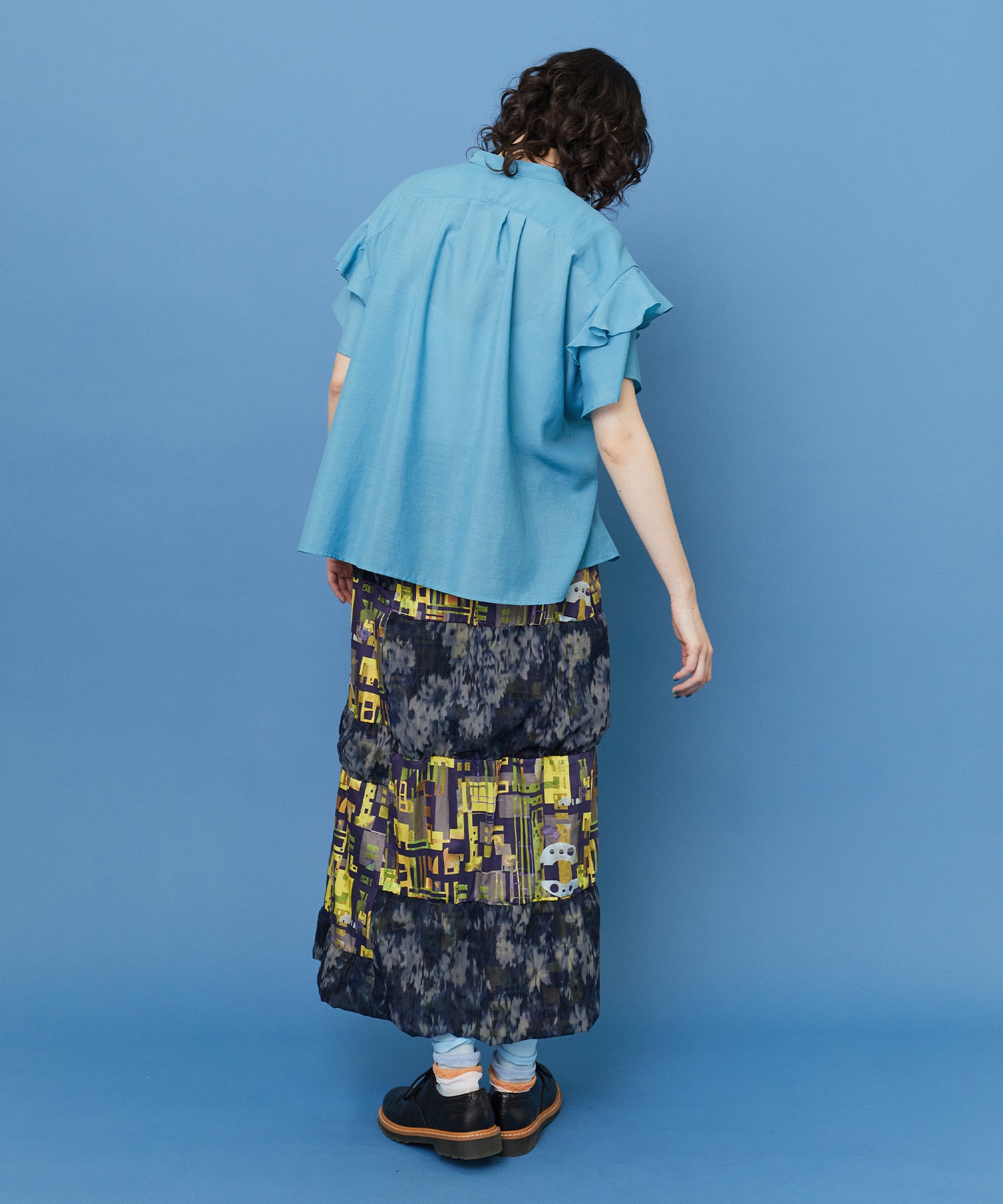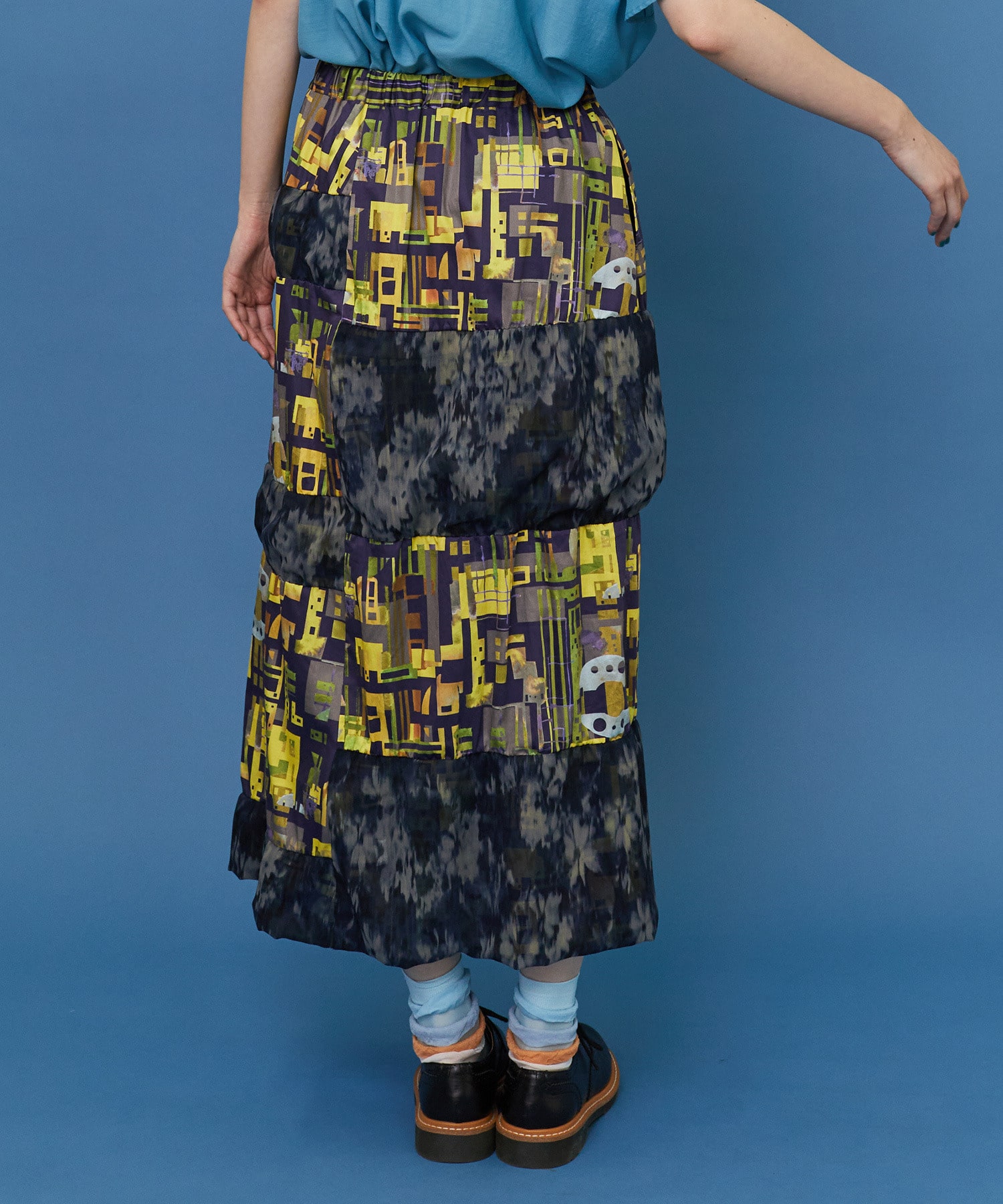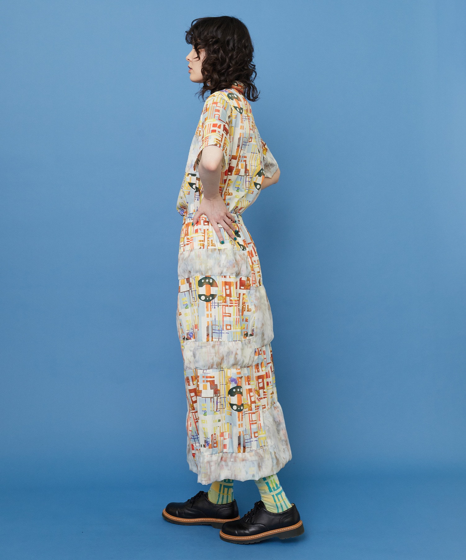 全体的に大胆に切り替えを入れたコクーンシルエットのスカートは部分的にシアーな素材を重ねて膨らみを出し、立体的でエアリーな表情を作り上げています。