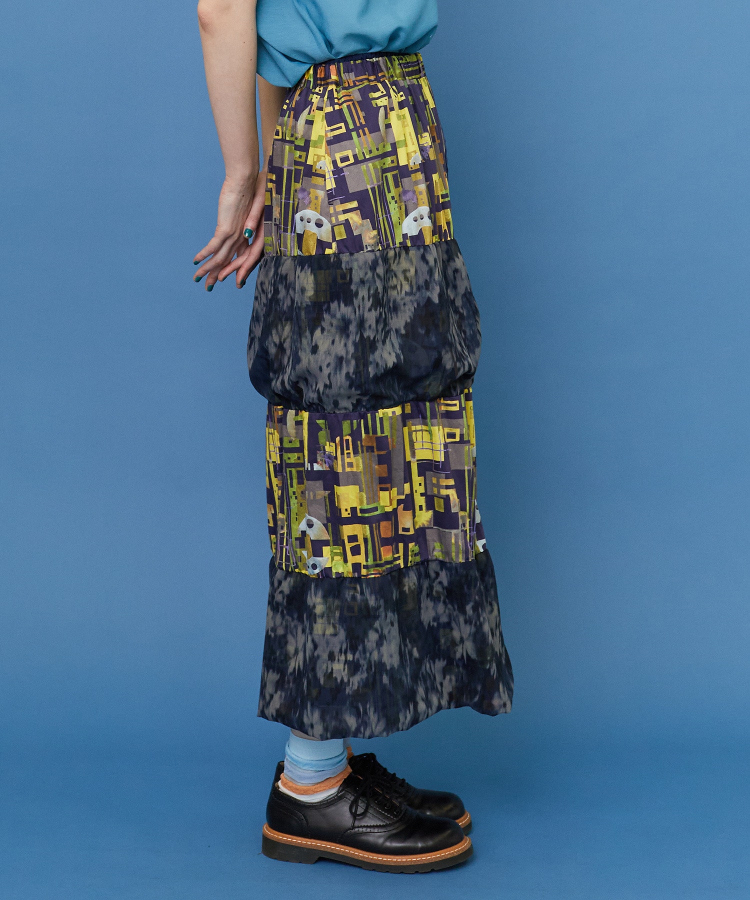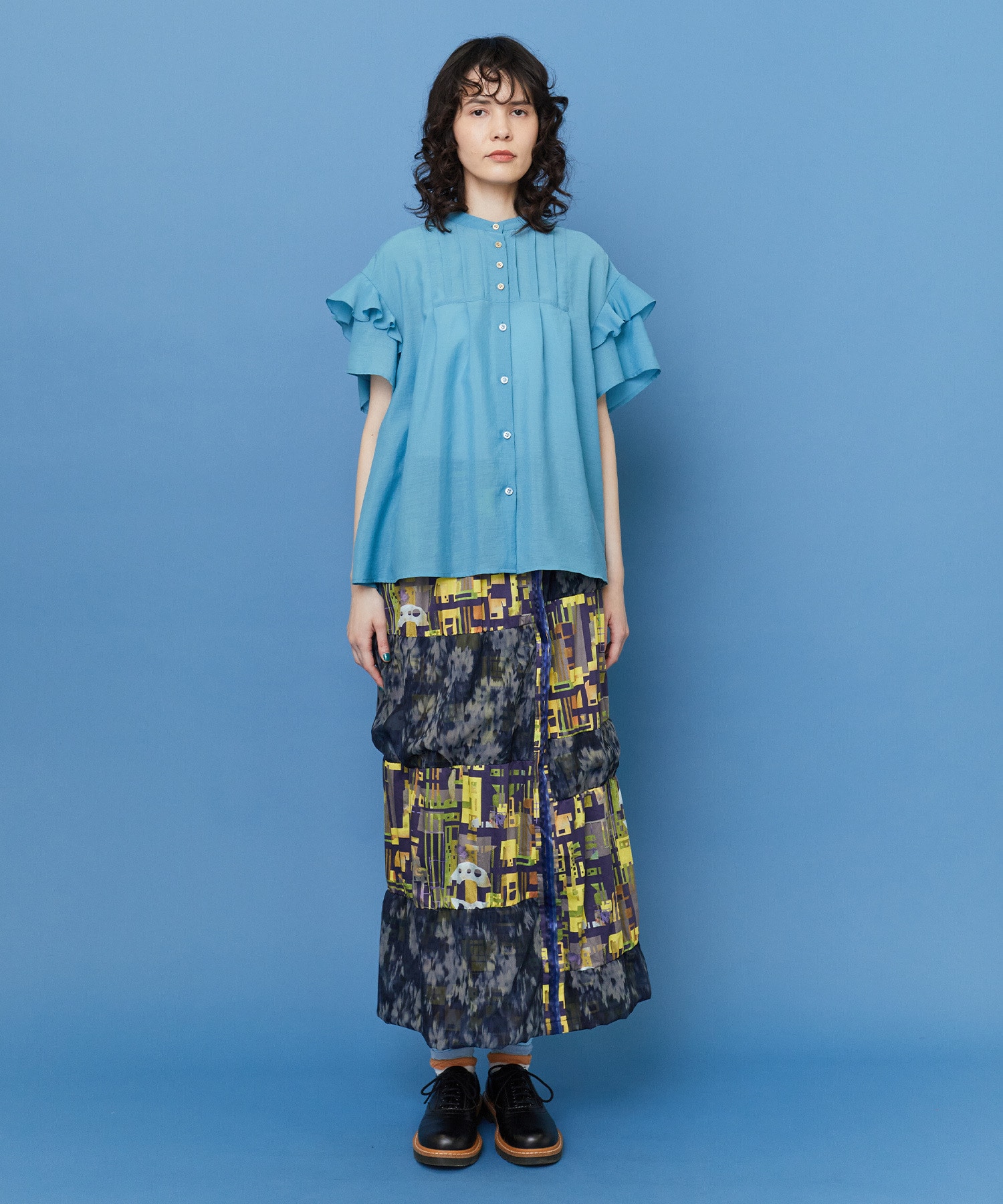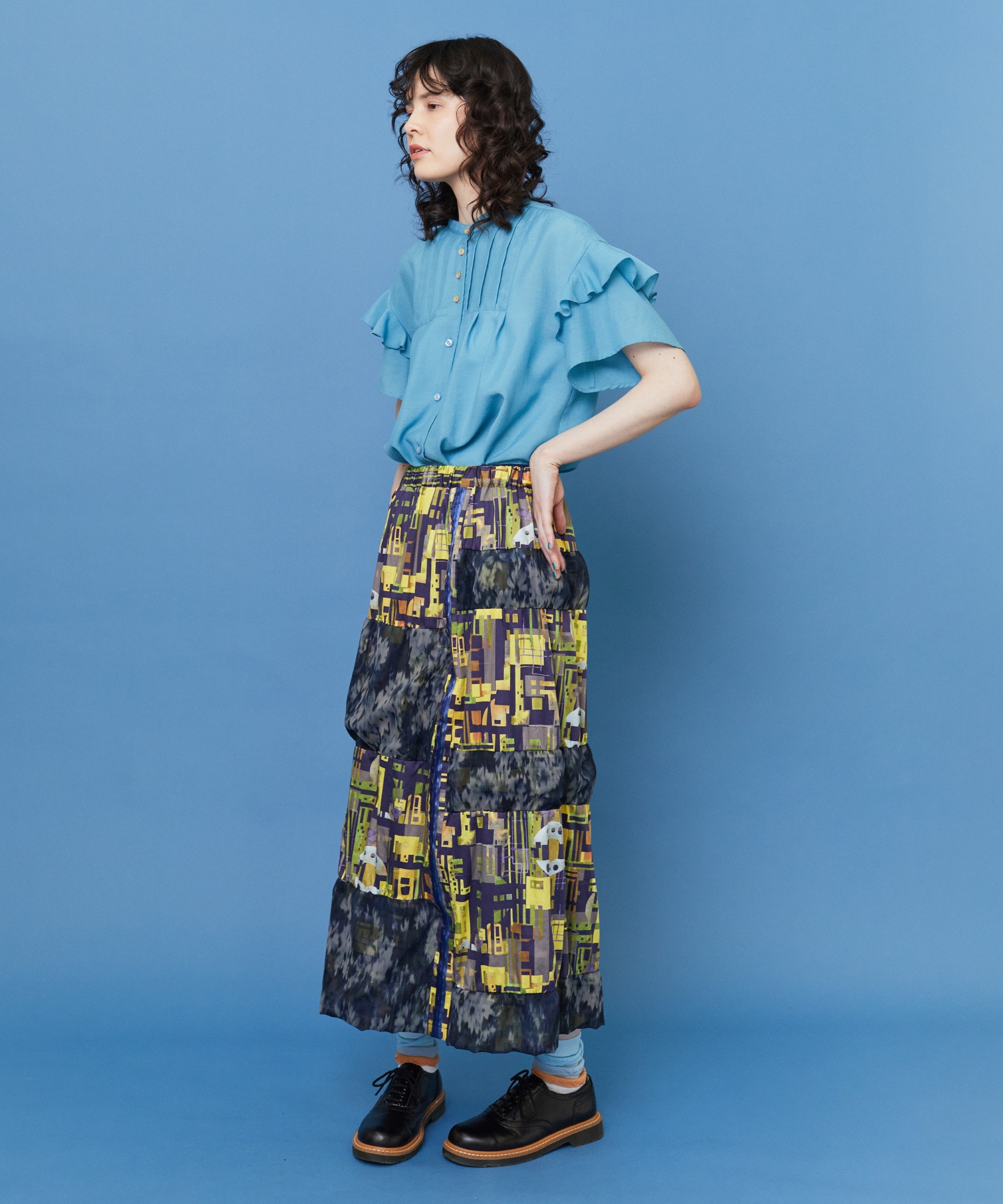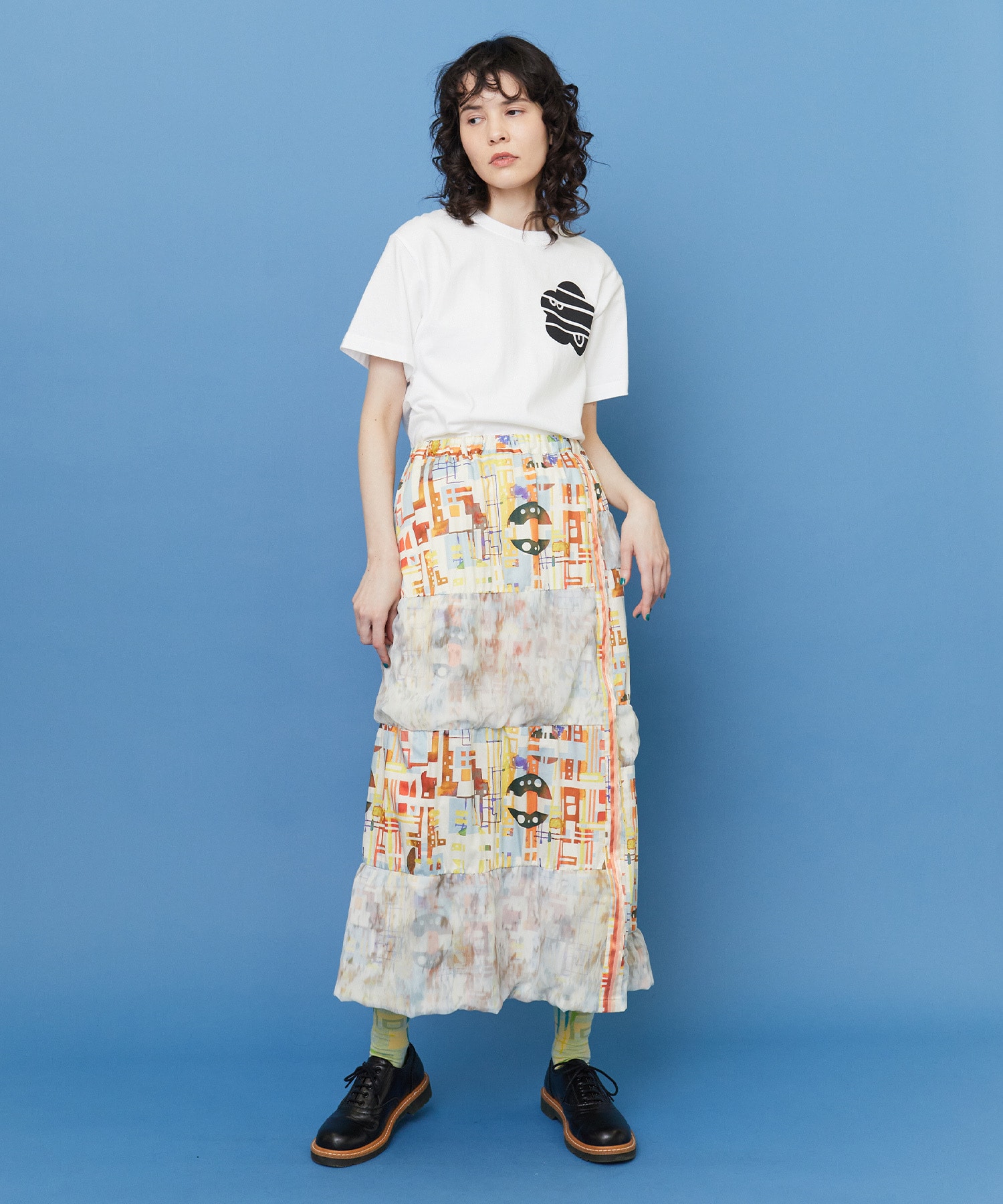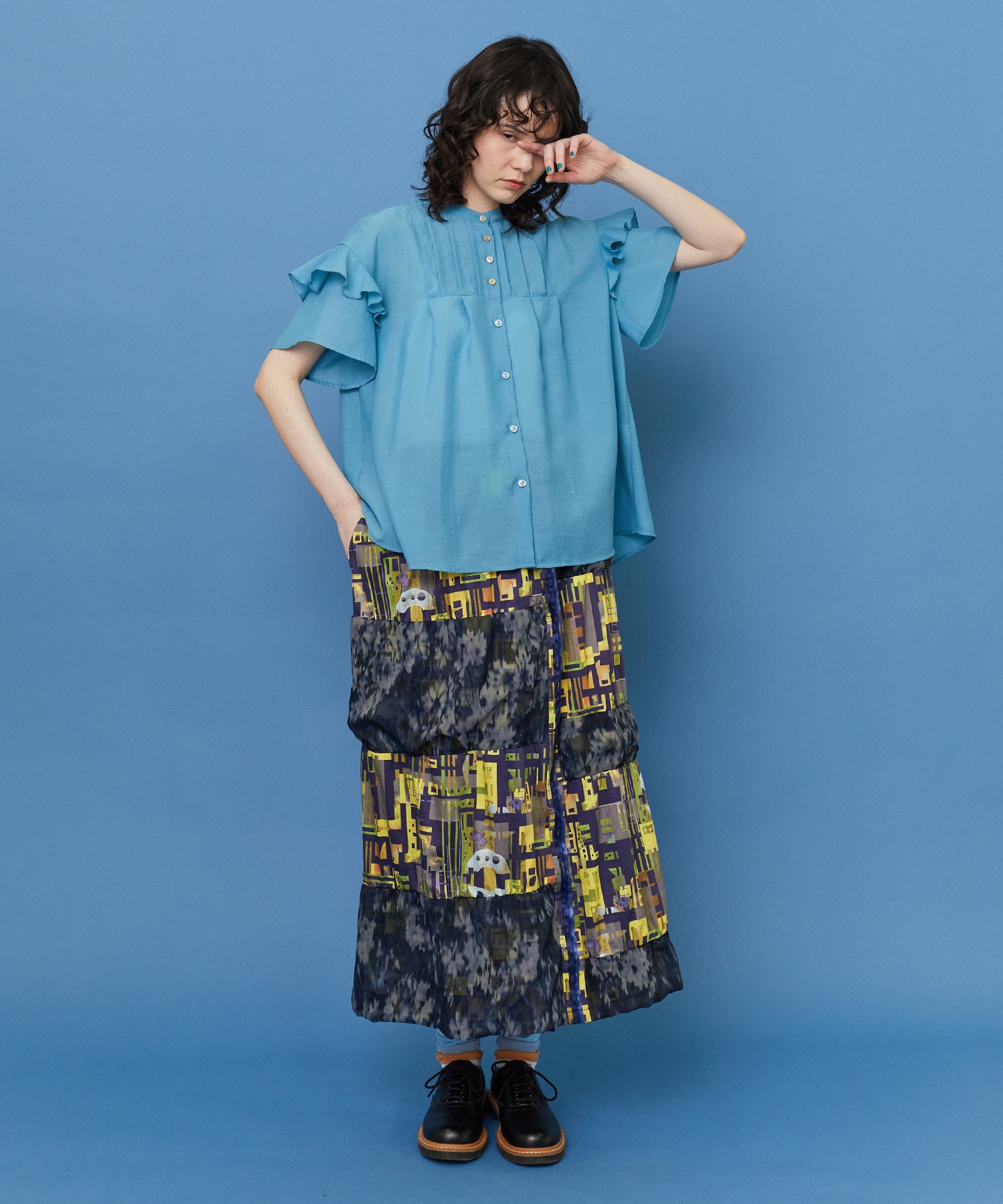 全体的に大胆に切り替えを入れたコクーンシルエットのスカートは部分的にシアーな素材を重ねて膨らみを出し、立体的でエアリーな表情を作り上げています。