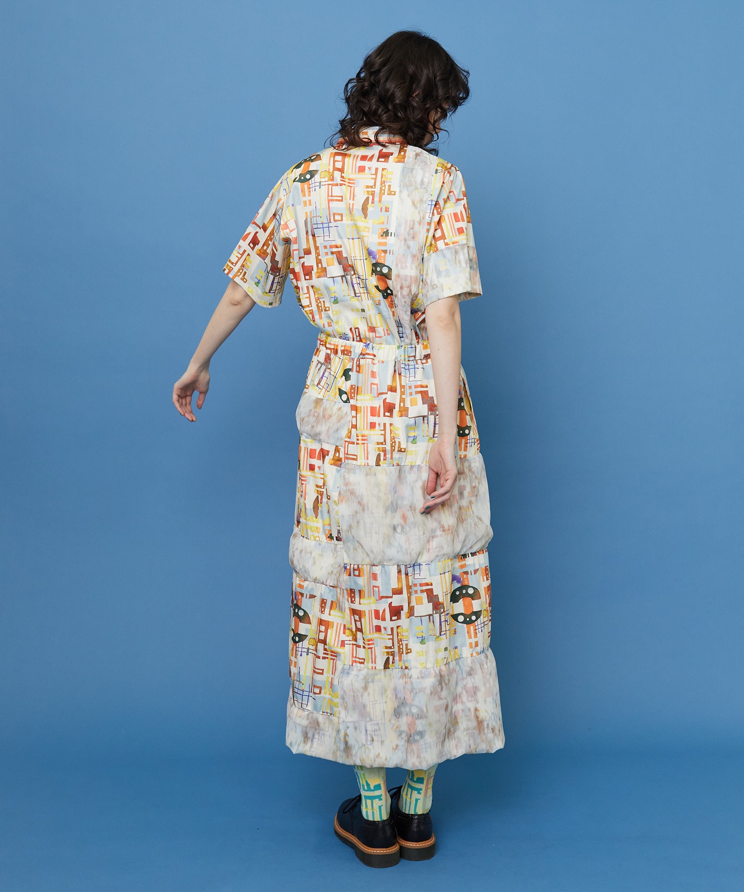 今シーズンのテーマ「マジック アワー」からのイメージで夕暮れのビル群の色の移り変わりを表現したプリント素材は綿の持つ肌触りの良さにサテン織りで織った生地特有のほのかな光沢感が上品で繊細にイメージを作っています。