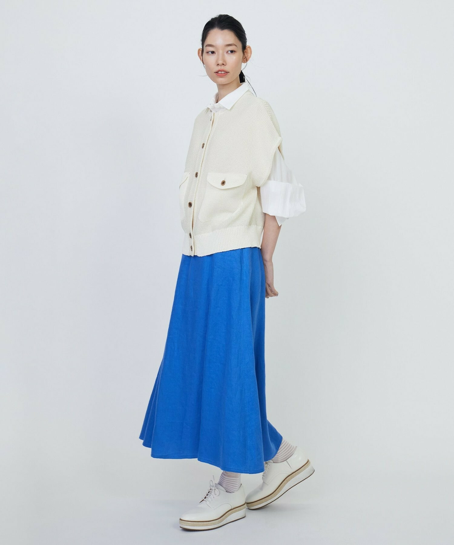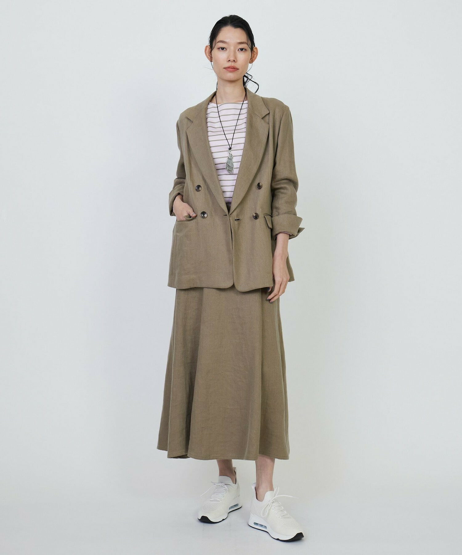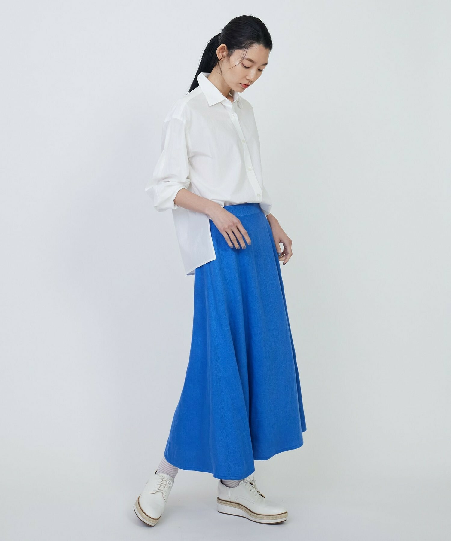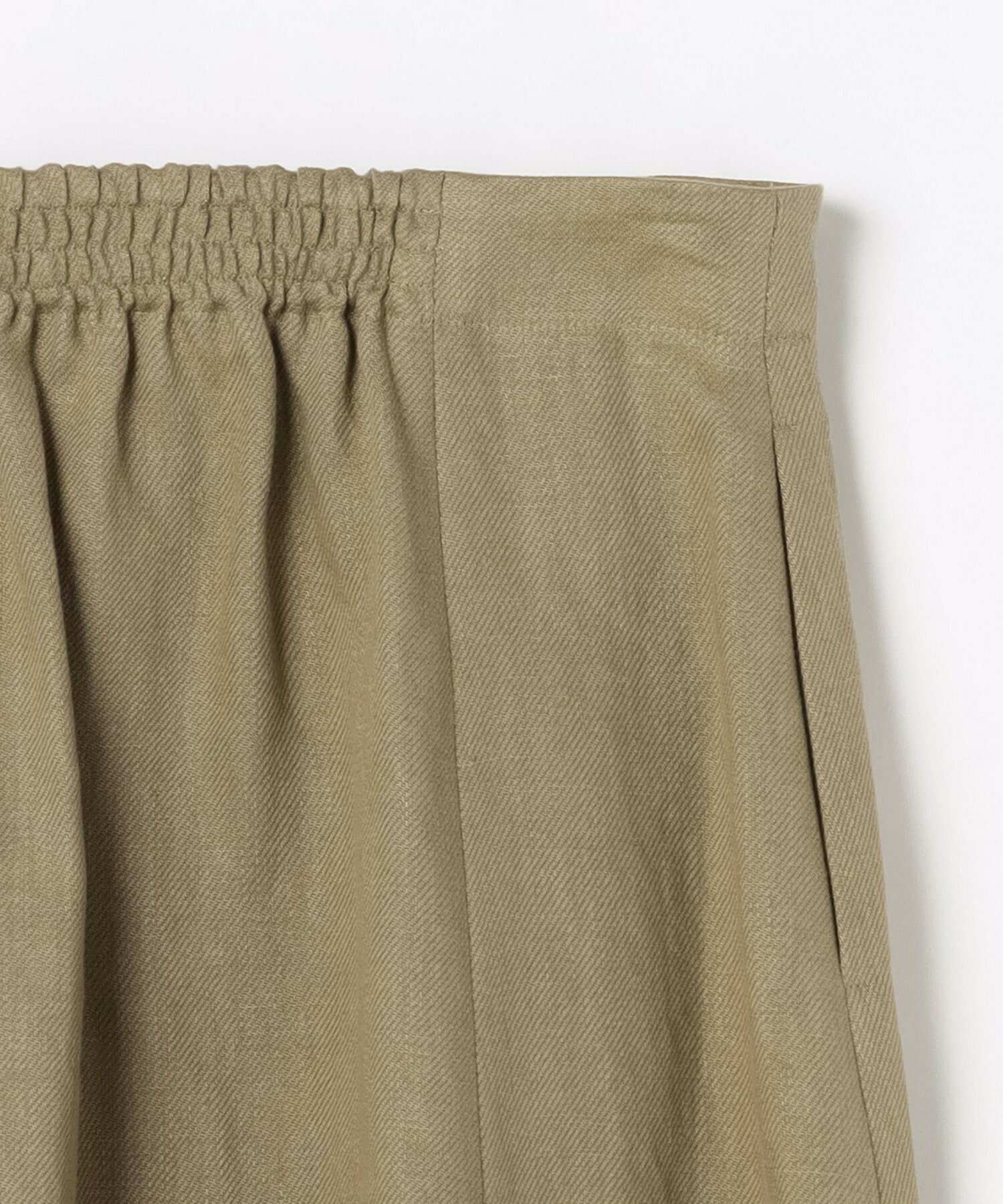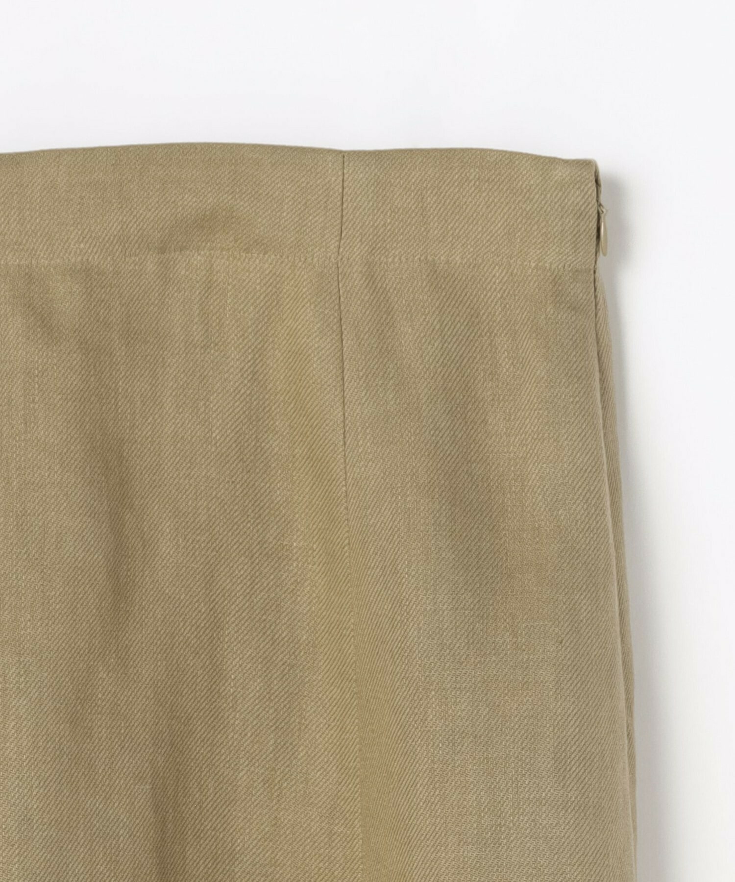 ウエスト周りはすっきりと裾に向けて広がるフレアシルエットがエレガントな一着です。長めの着丈ながらも、ナチュラルな素材感とカラーで軽やかな雰囲気で着用していただけます。同素材のジャケットとのセットアップの着こなしもおすすめです。