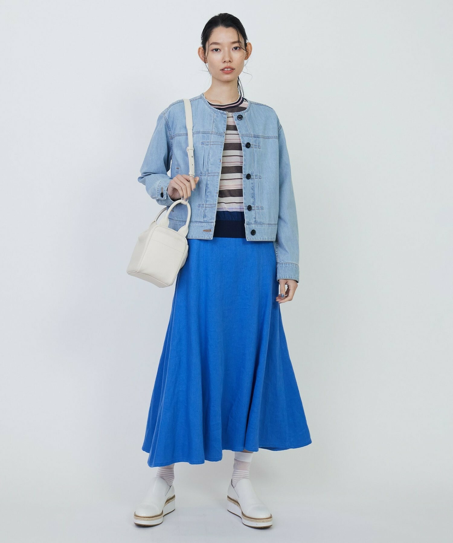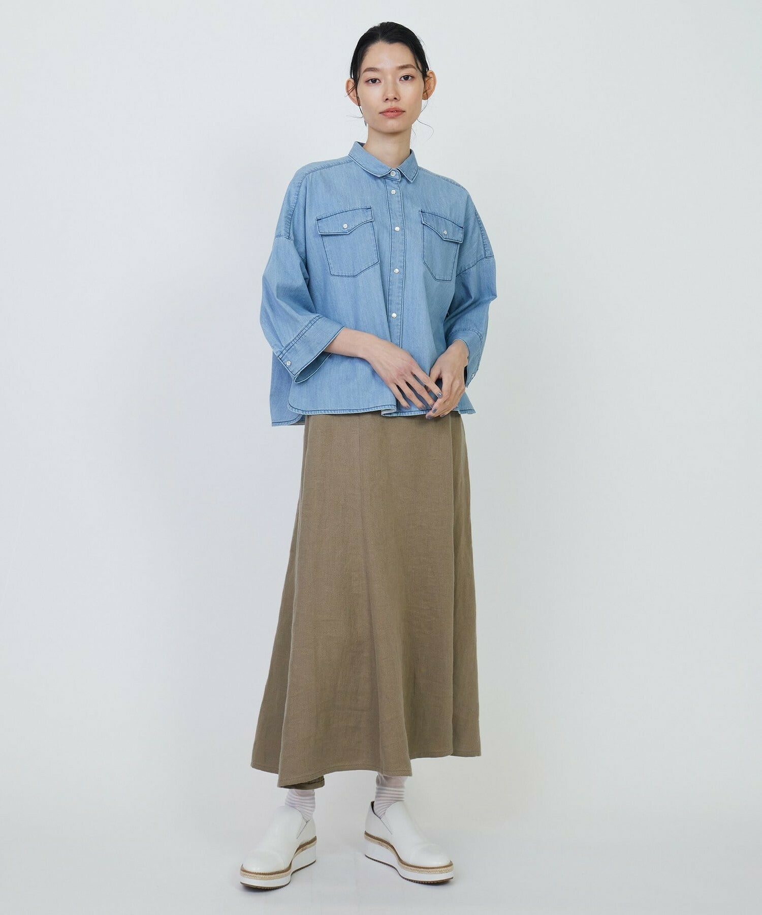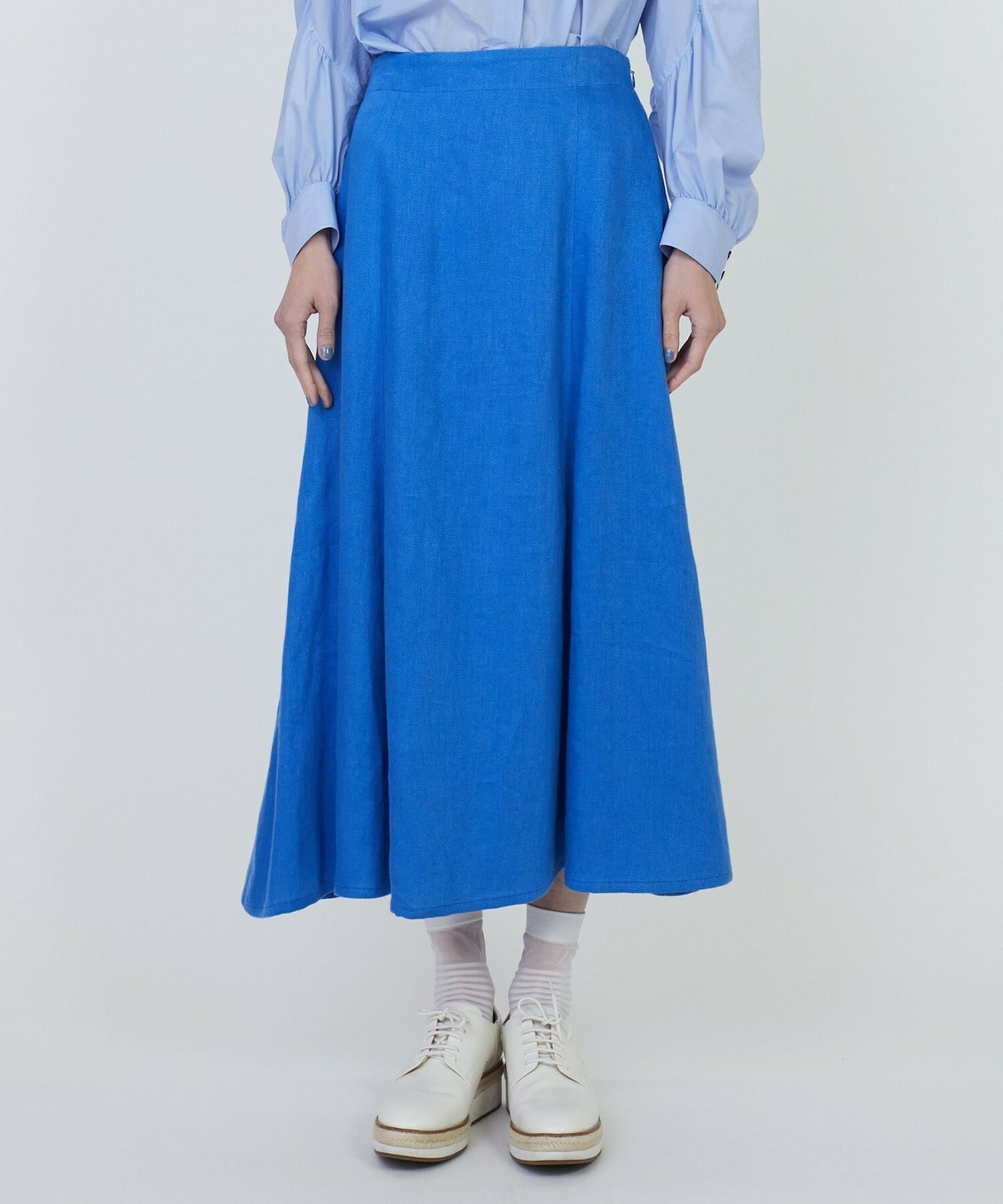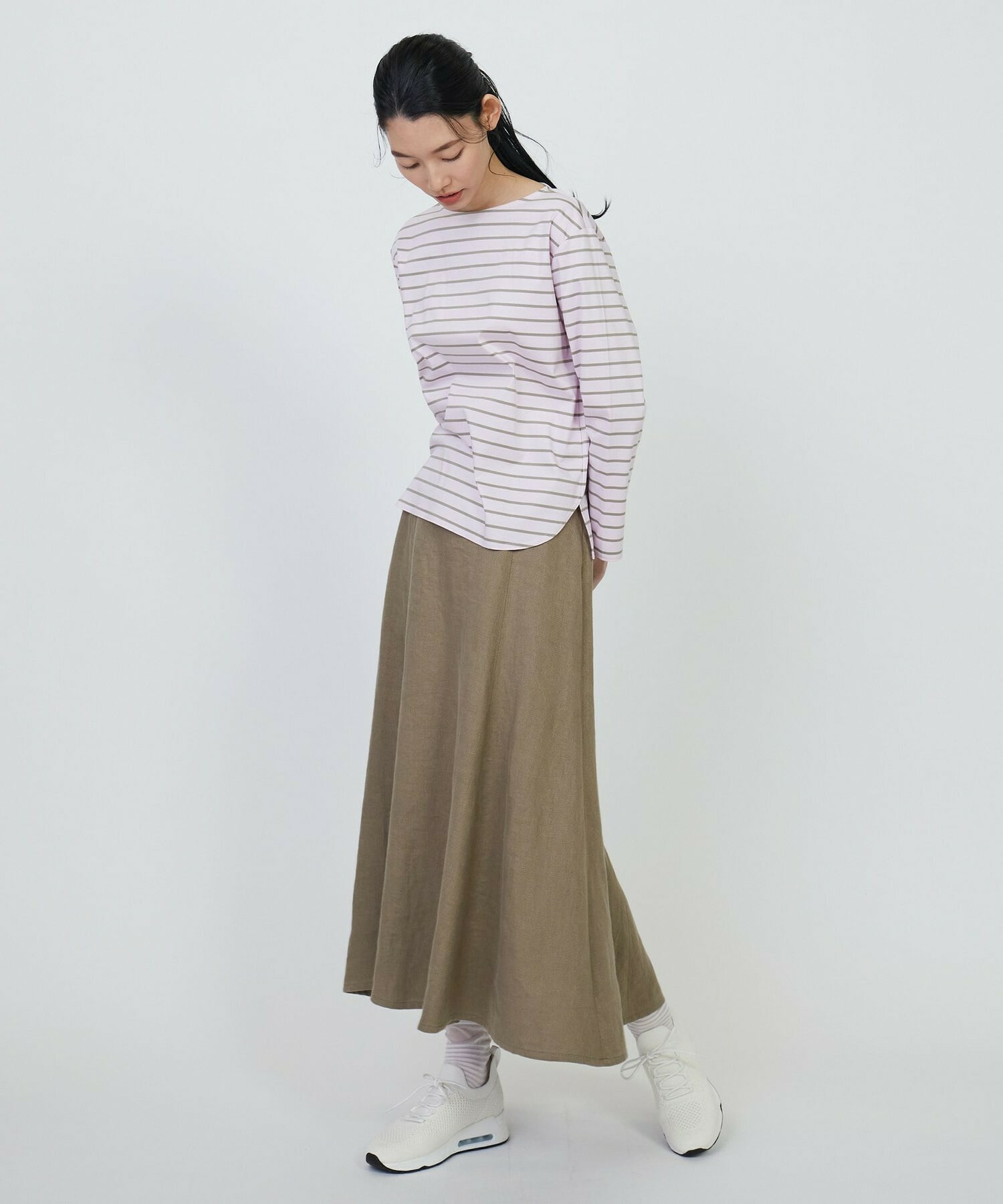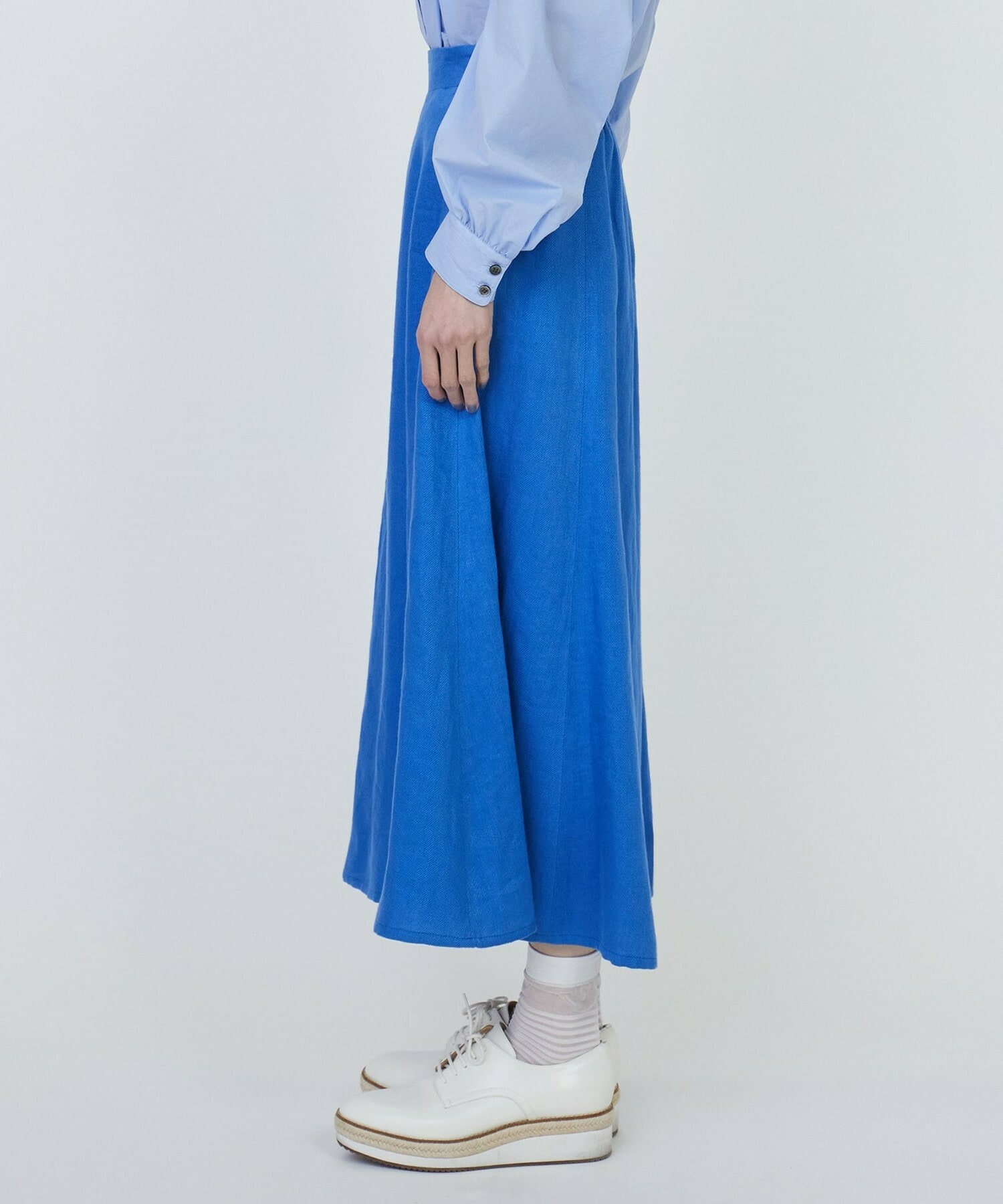 ウエスト周りはすっきりと裾に向けて広がるフレアシルエットがエレガントな一着です。長めの着丈ながらも、ナチュラルな素材感とカラーで軽やかな雰囲気で着用していただけます。同素材のジャケットとのセットアップの着こなしもおすすめです。