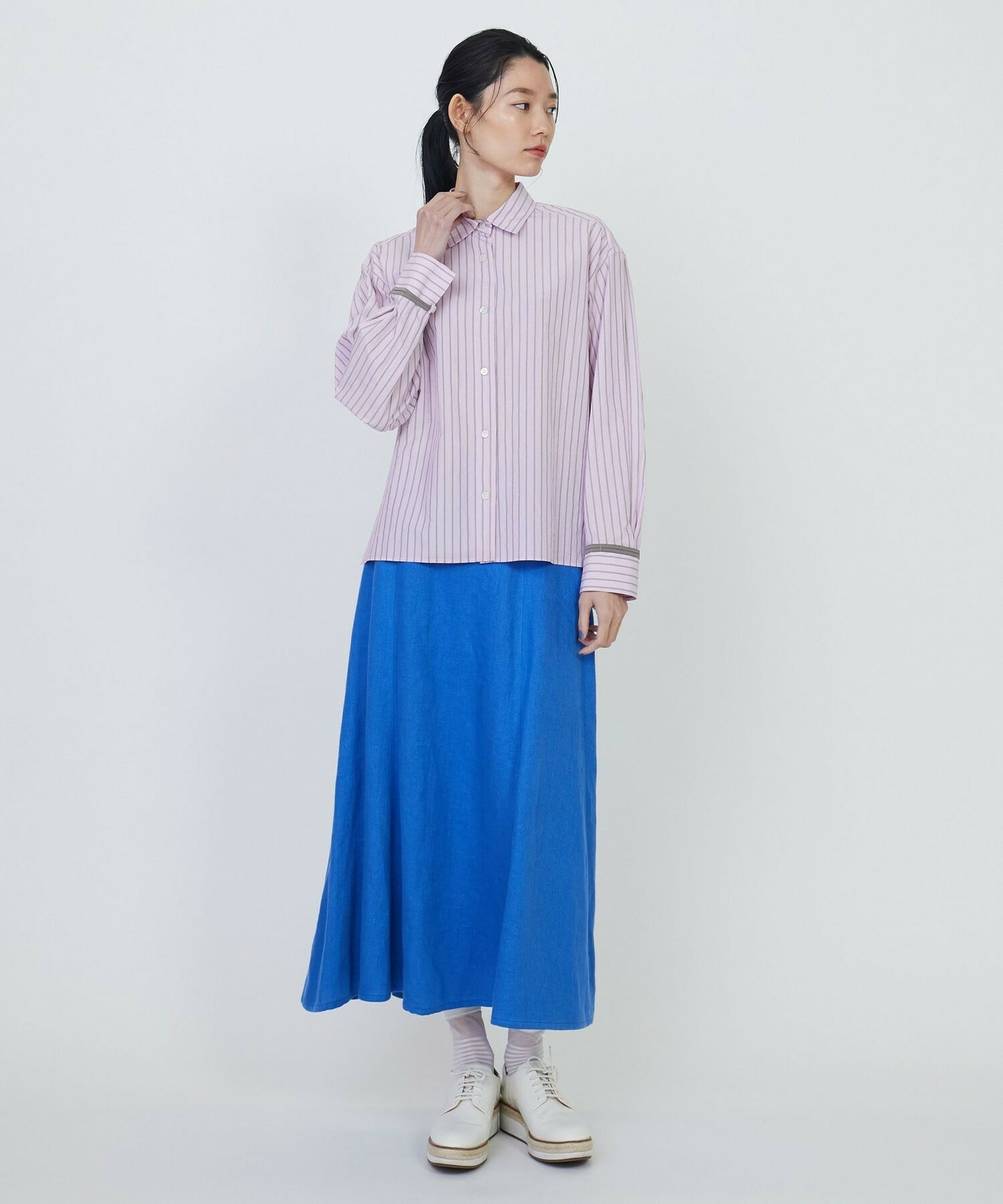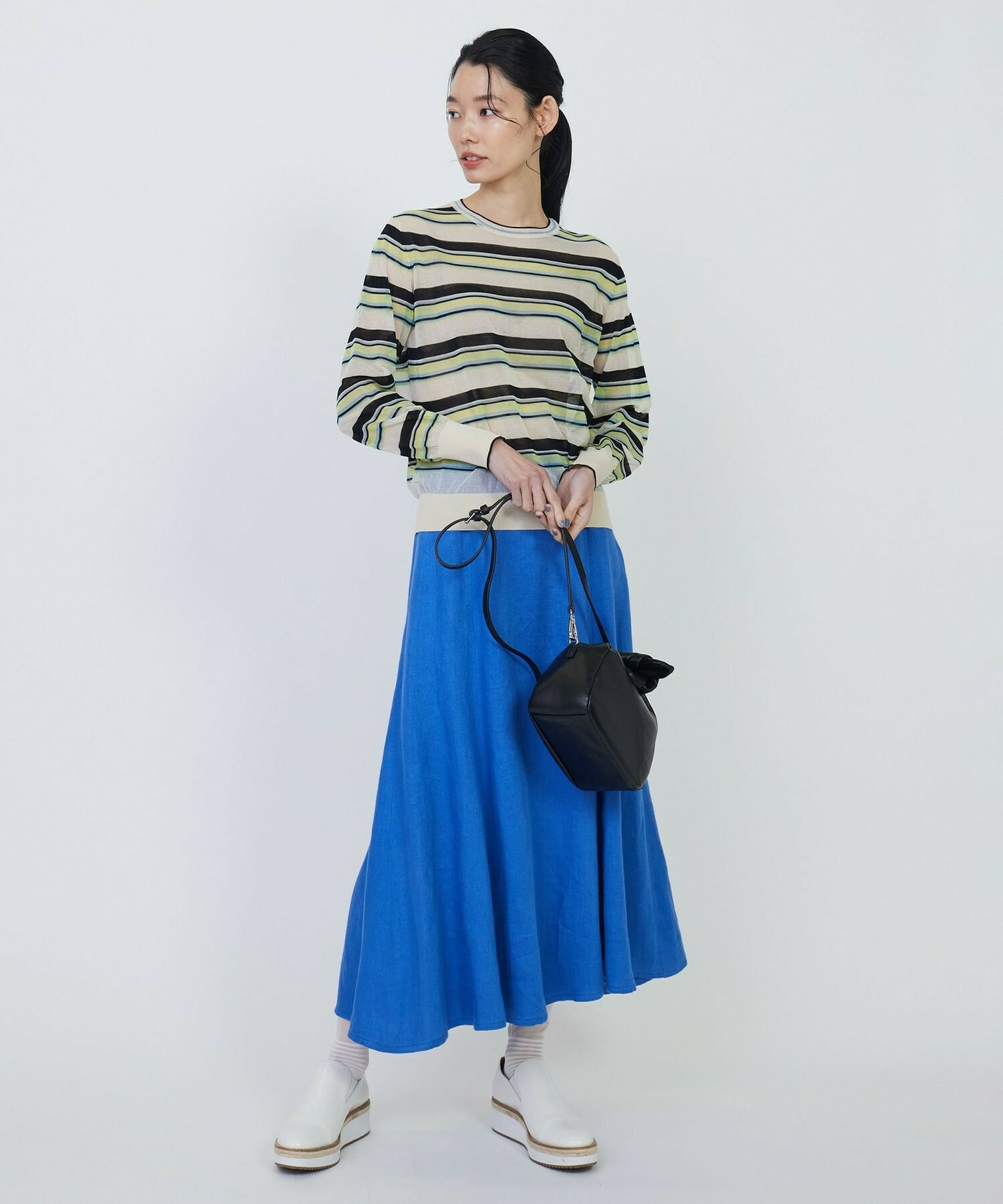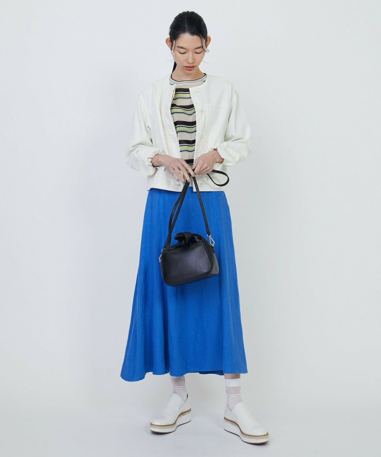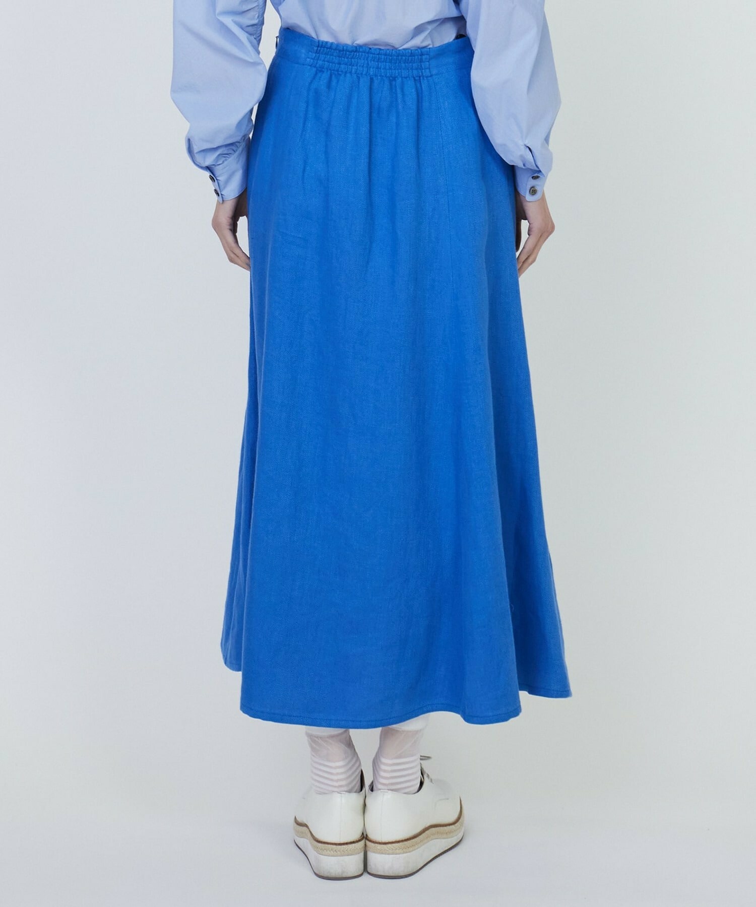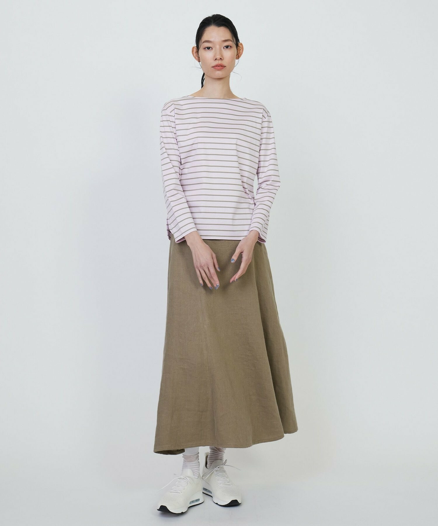 ウエスト周りはすっきりと裾に向けて広がるフレアシルエットがエレガントな一着です。長めの着丈ながらも、ナチュラルな素材感とカラーで軽やかな雰囲気で着用していただけます。同素材のジャケットとのセットアップの着こなしもおすすめです。