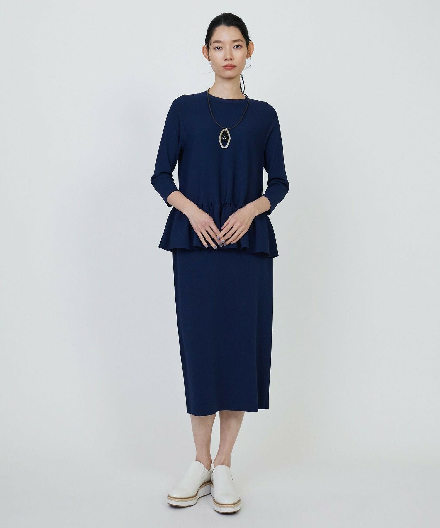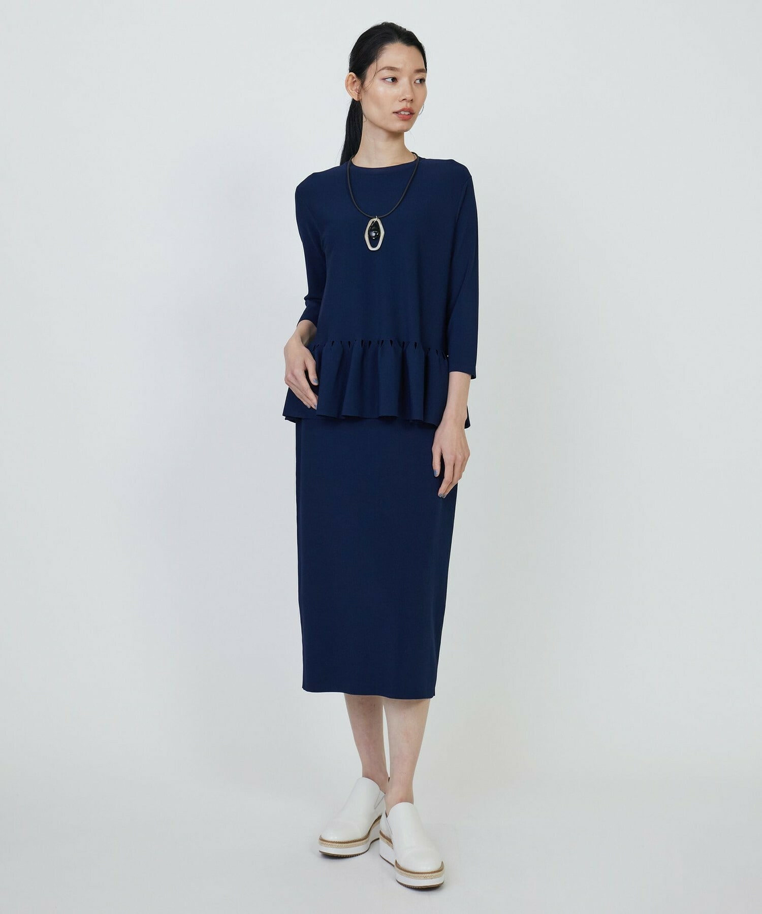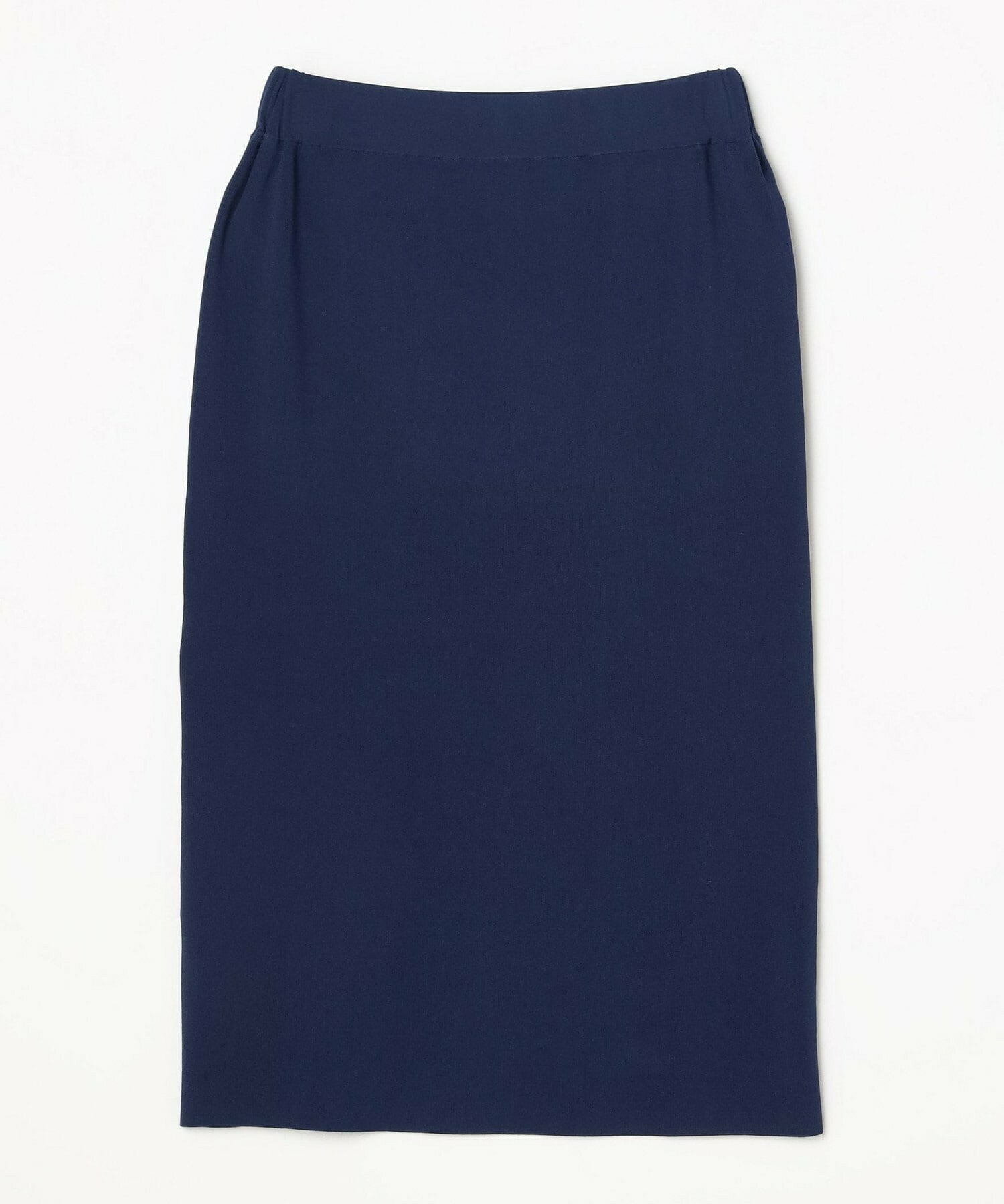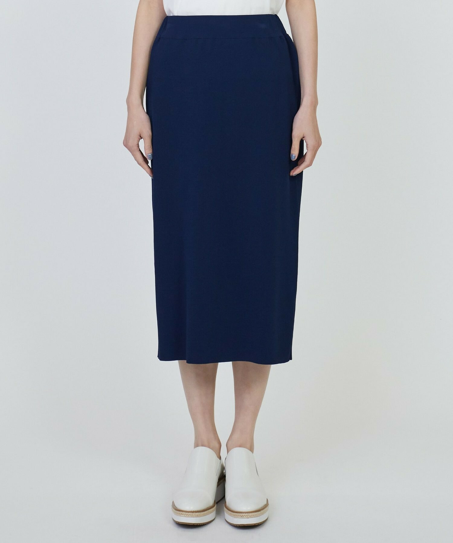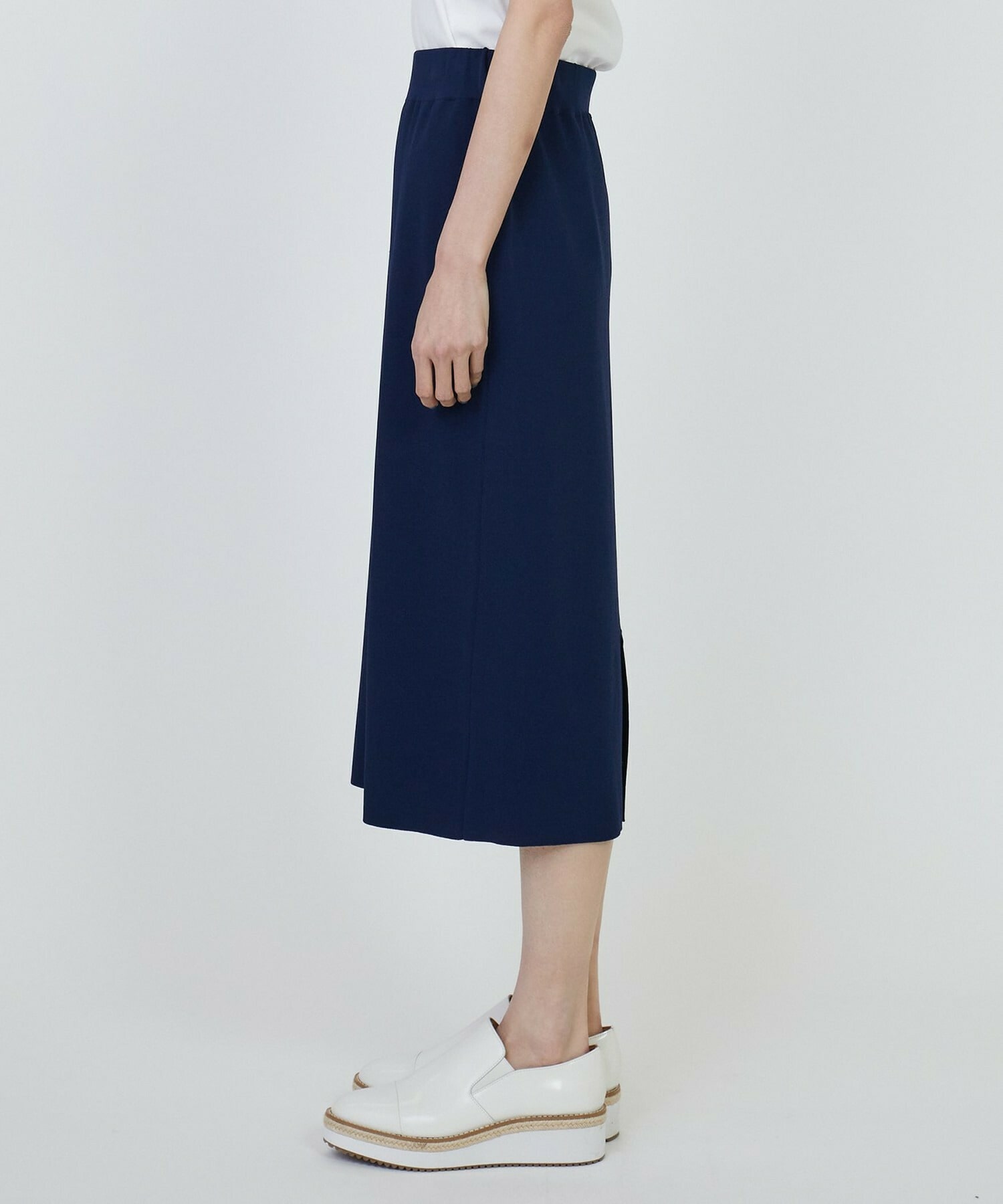 体のラインを拾いづらい、ボックス型のややロングタイトスカートです。ウエストがゴムで着脱や着用時のストレスがありません。また後ろ裾にはスリットが入っており、足捌きも良いです。程よいストレッチ性の有る素材で、肌触りはさらっとしています。様々なトップスに合うシンプルなデザインですが、同素材のトップスと合わせて、セットアップとしての着用もお勧めです。トップスに比べてスカートは若干厚みを増しています。
