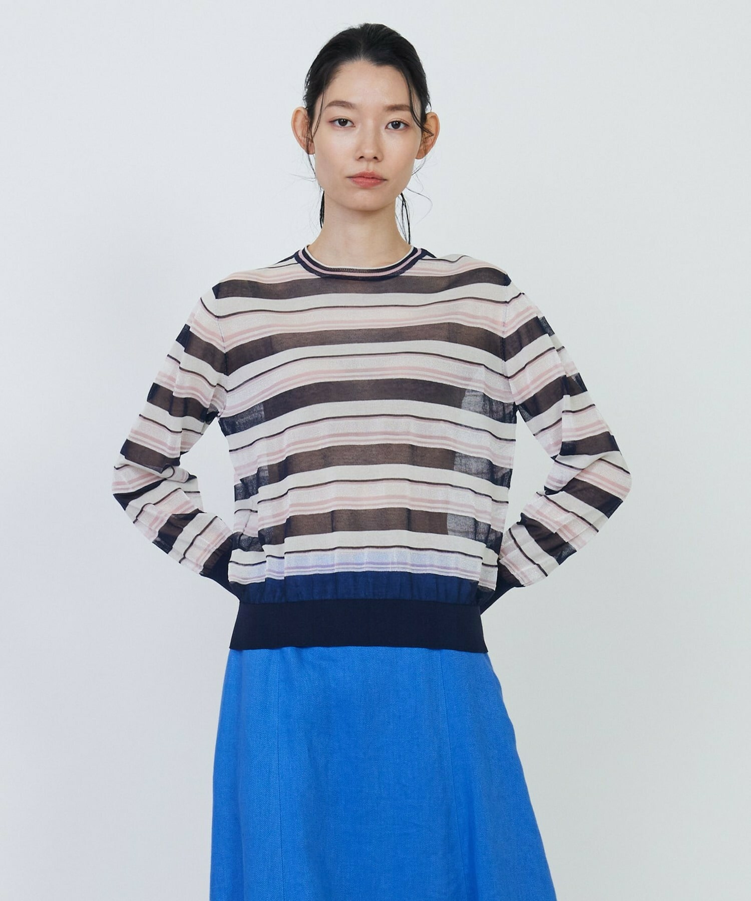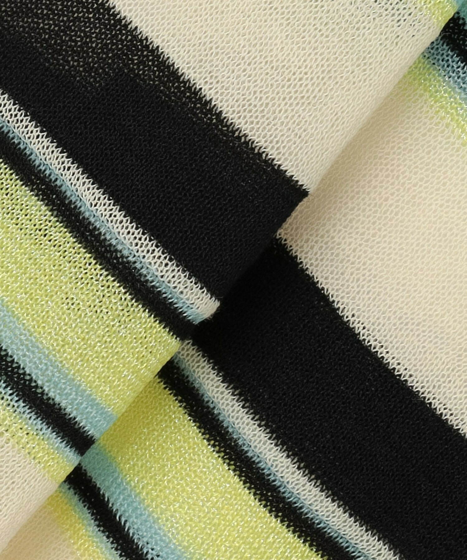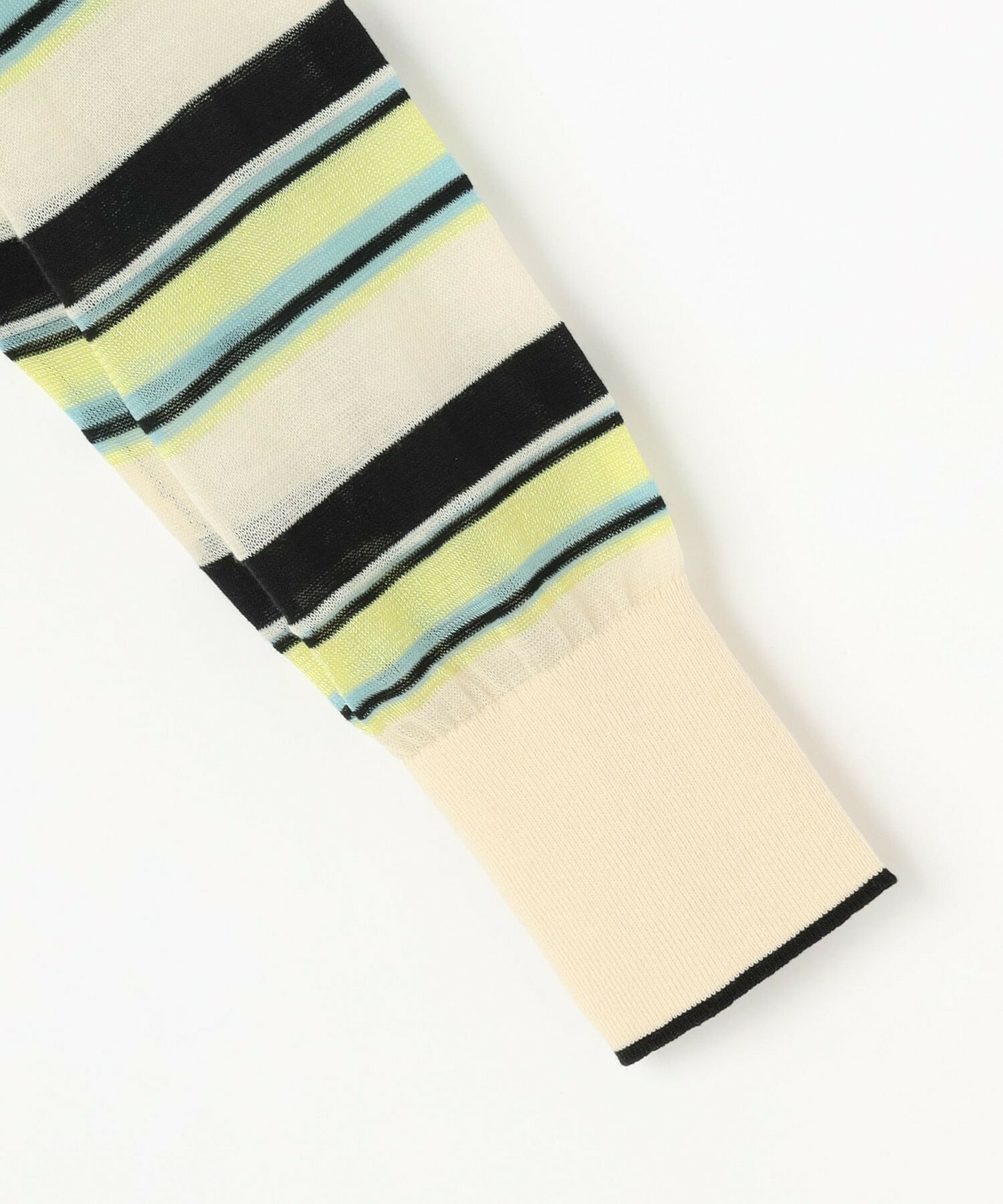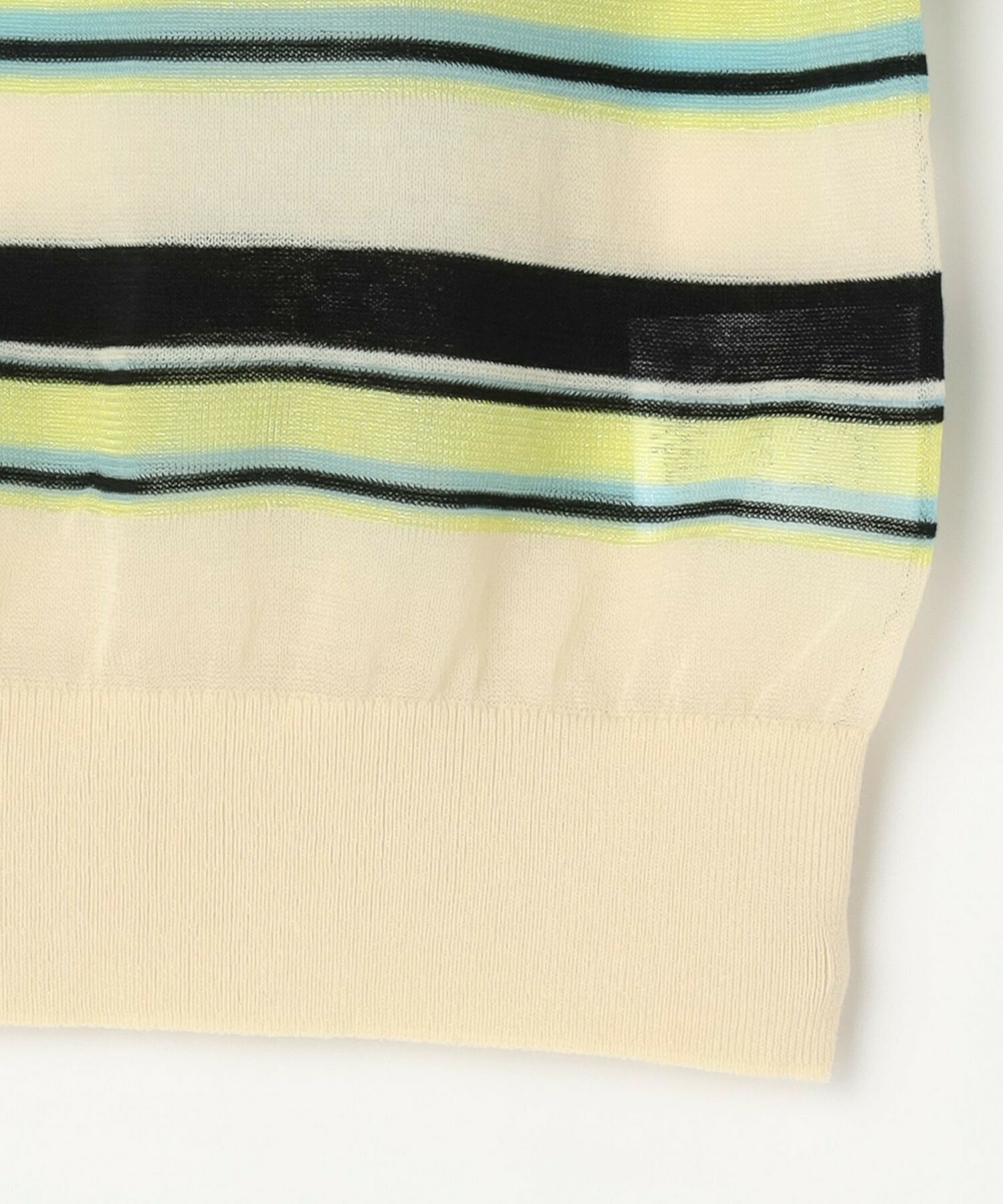 マルチボーダーを、人気のシアー素材で作りました。ベースにはコットンナイロンを使用し、部分的にやや光沢のあるポリエステルを使用しています。それによりドライで清涼感のある肌触りに加え、程よく張りが有り、大人の肌見せも楽しめるアイテムとなっています。