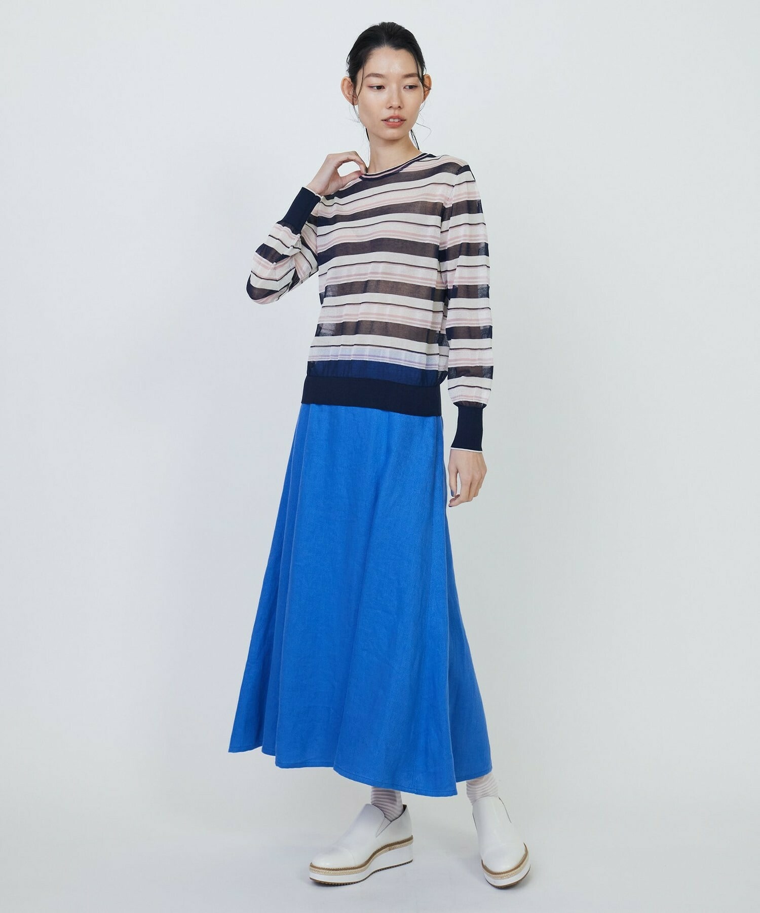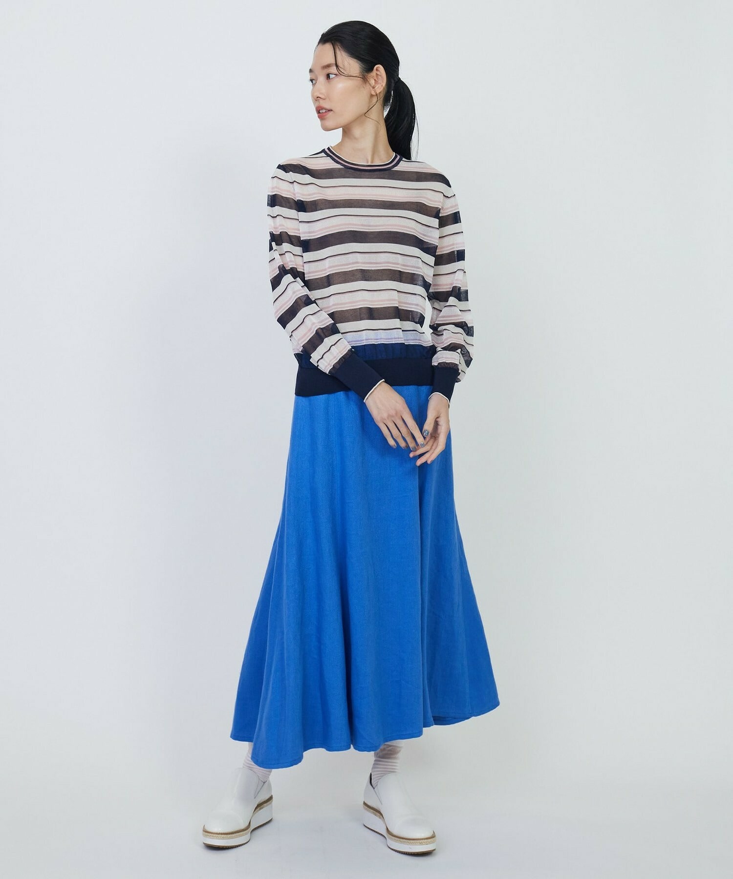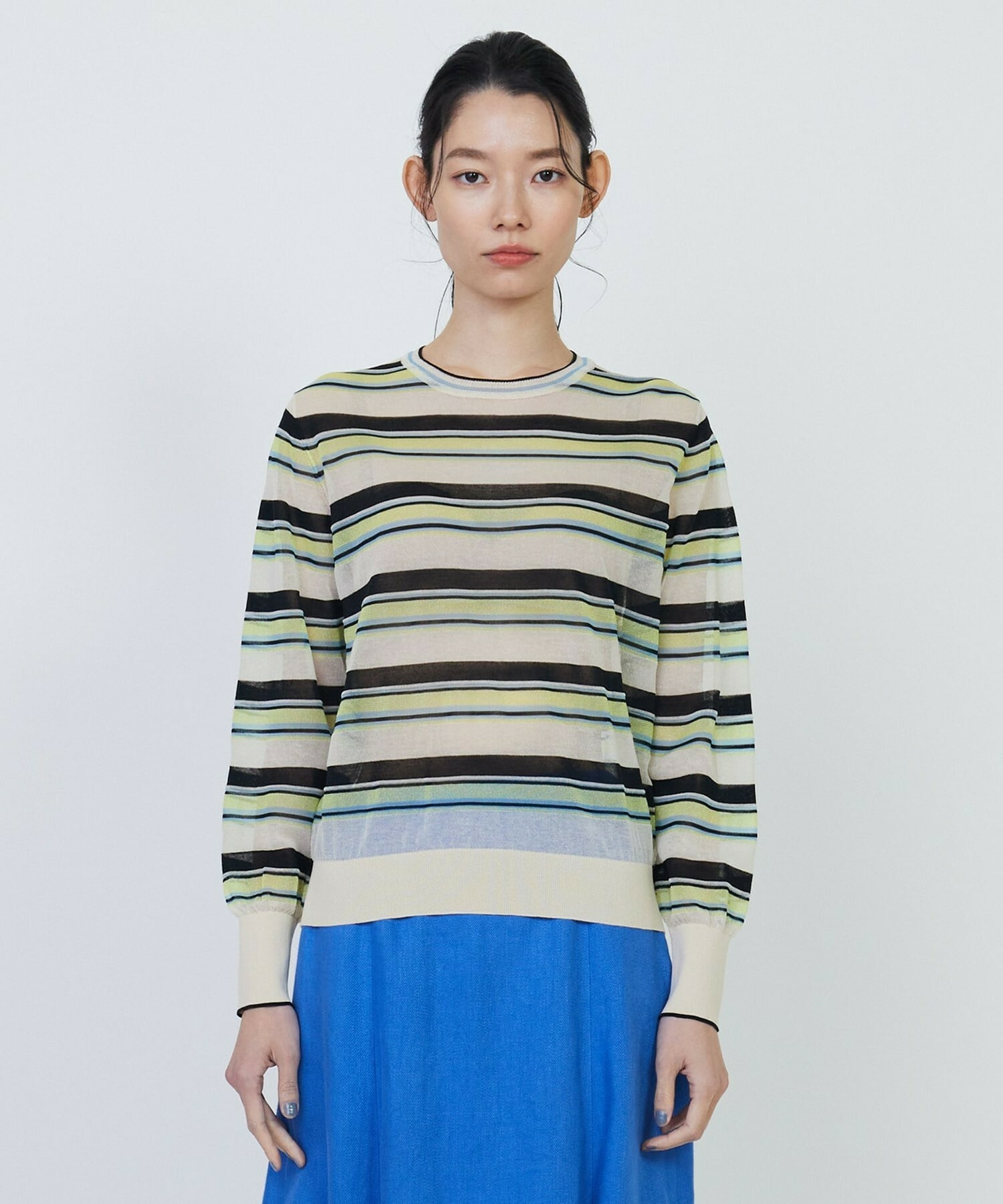 マルチボーダーを、人気のシアー素材で作りました。ベースにはコットンナイロンを使用し、部分的にやや光沢のあるポリエステルを使用しています。それによりドライで清涼感のある肌触りに加え、程よく張りが有り、大人の肌見せも楽しめるアイテムとなっています。