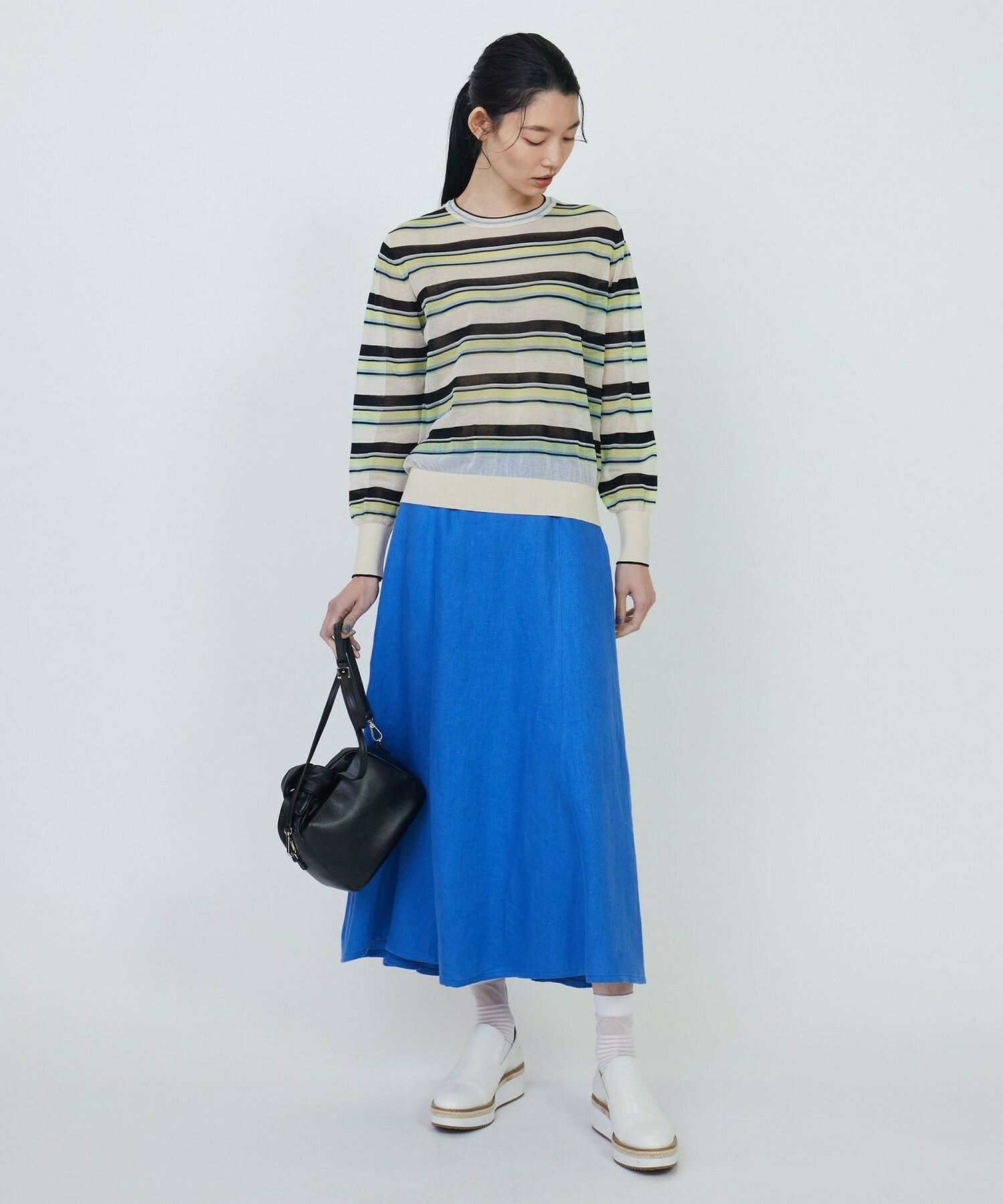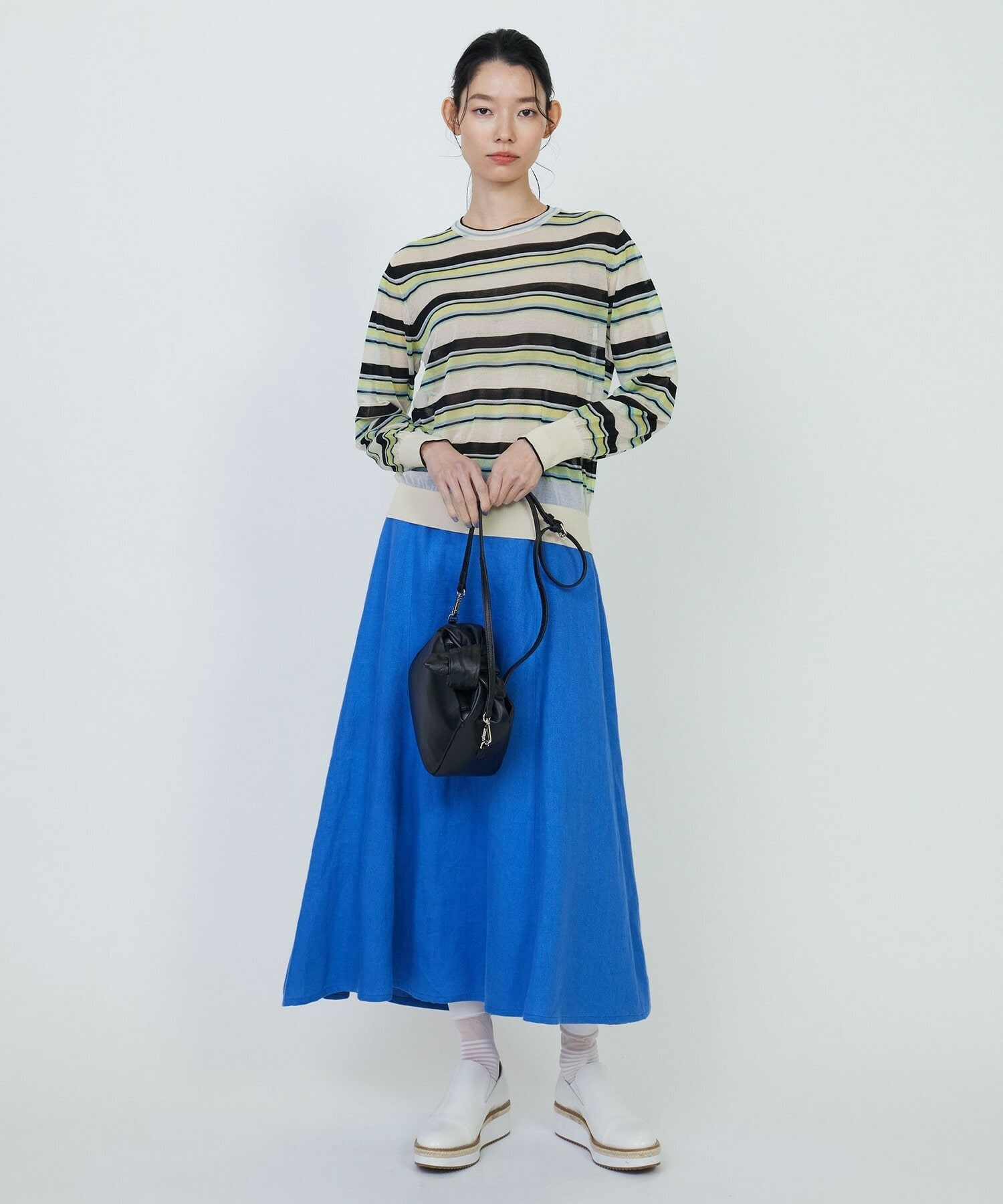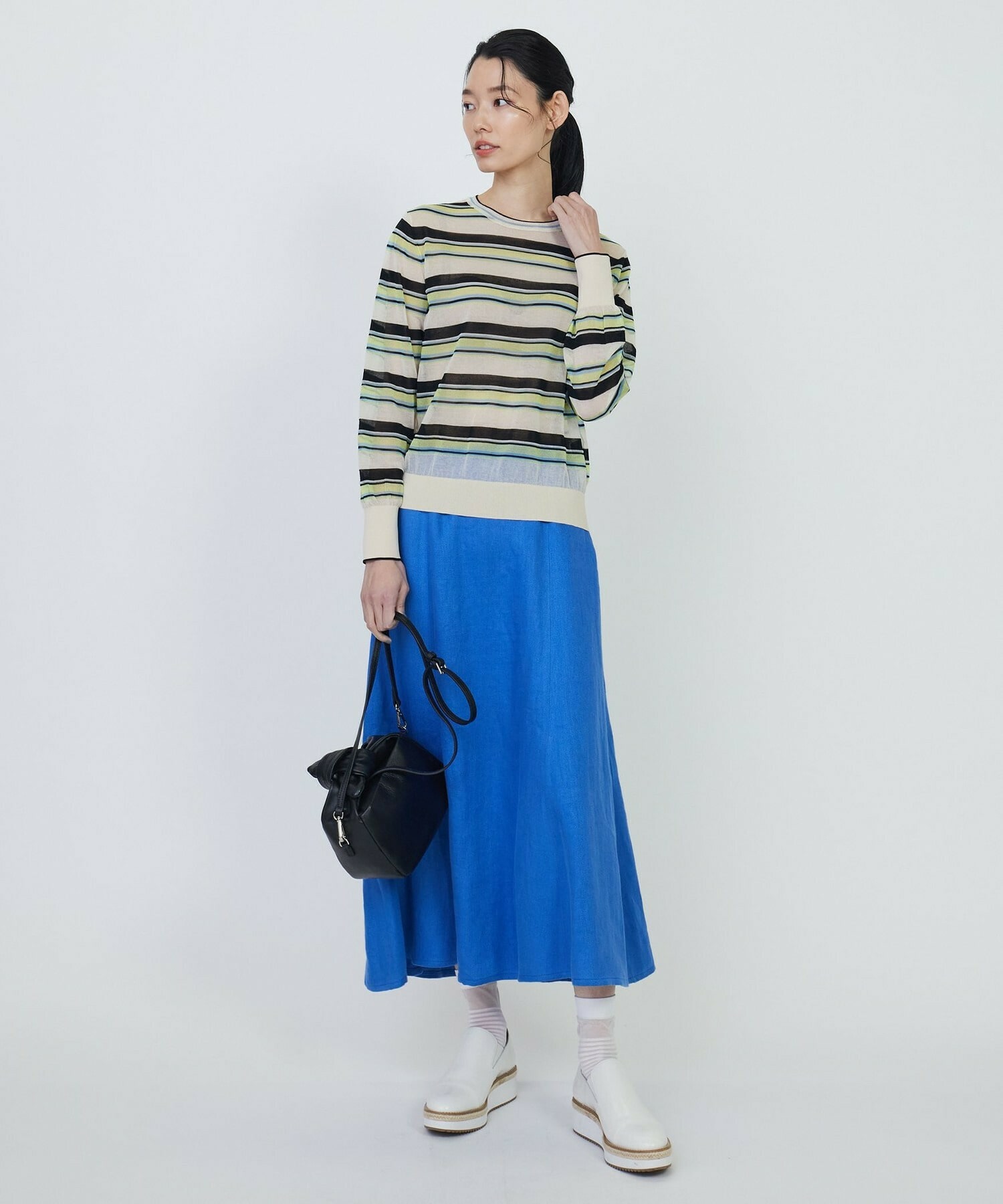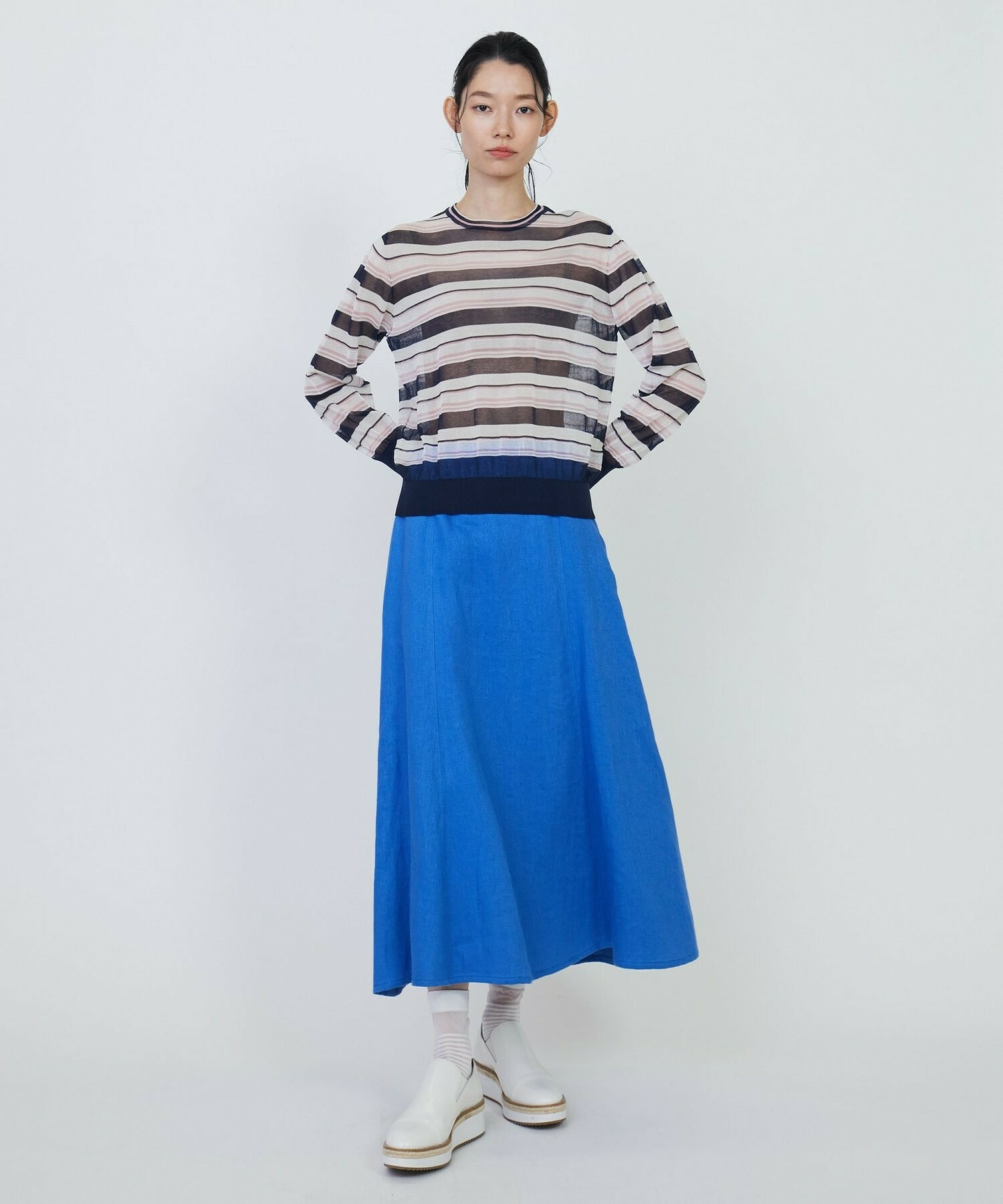 マルチボーダーを、人気のシアー素材で作りました。ベースにはコットンナイロンを使用し、部分的にやや光沢のあるポリエステルを使用しています。それによりドライで清涼感のある肌触りに加え、程よく張りが有り、大人の肌見せも楽しめるアイテムとなっています。