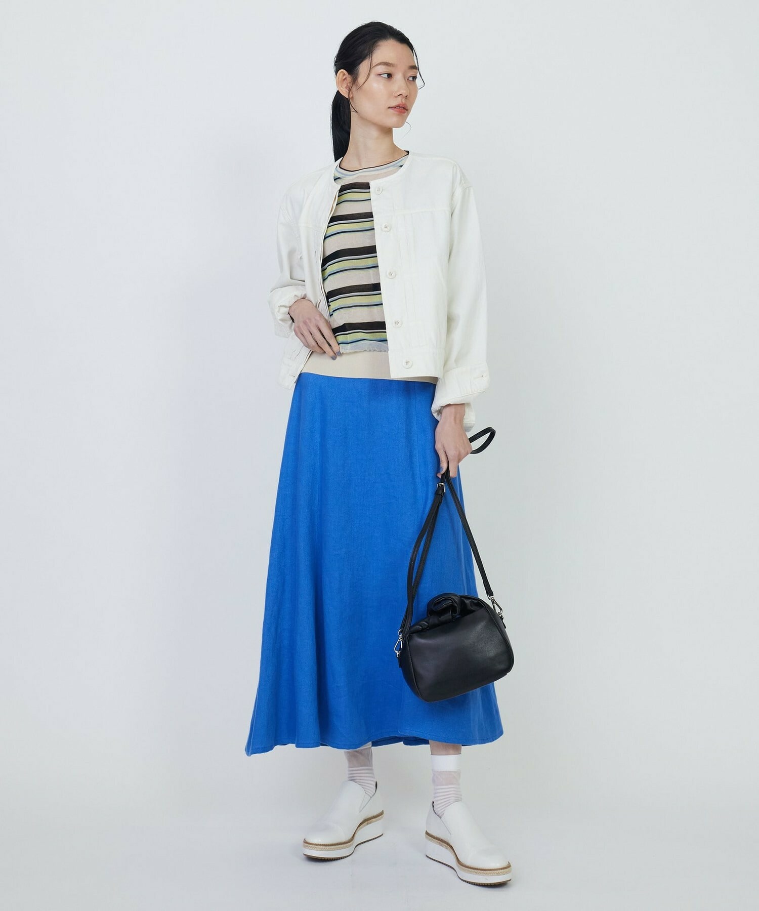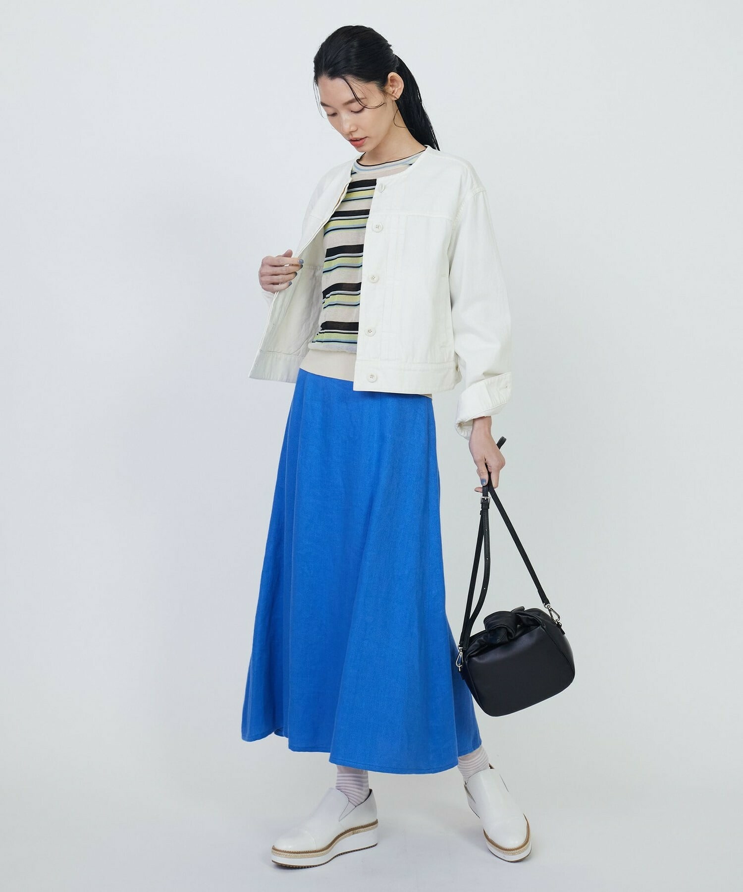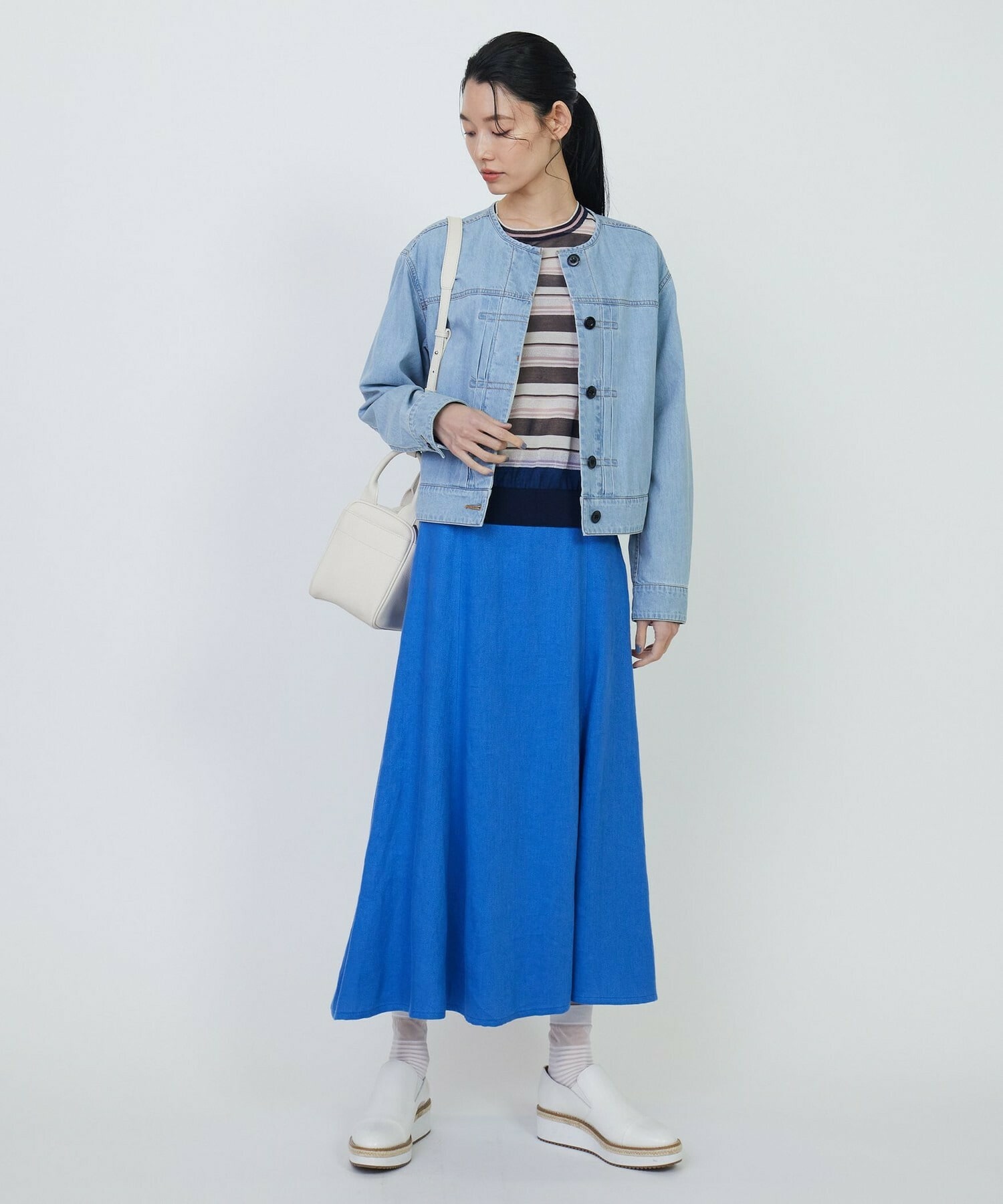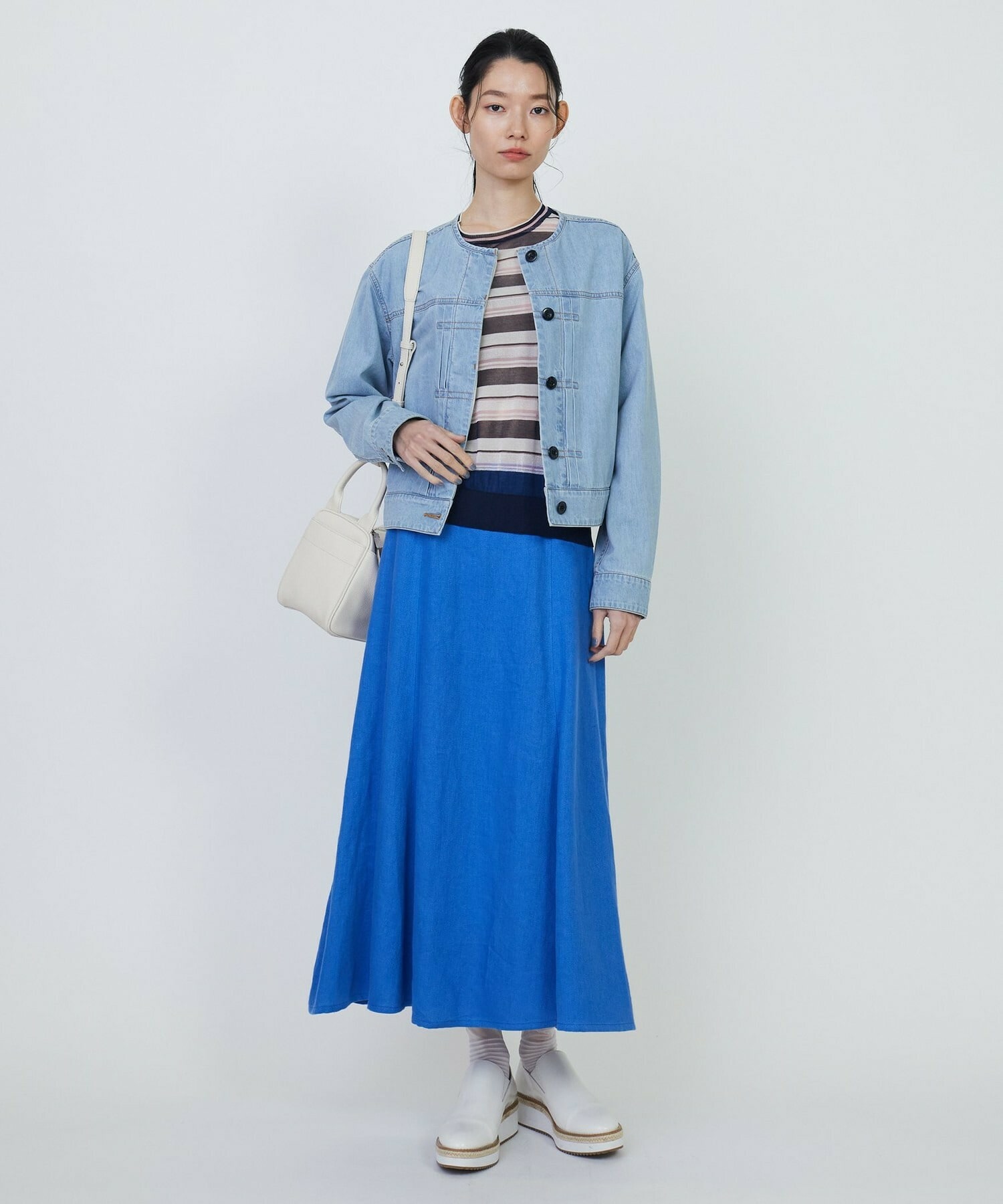 ネックラインはベーシックなクルーネックで、様々なボトムに合わせていただける着丈になっています。