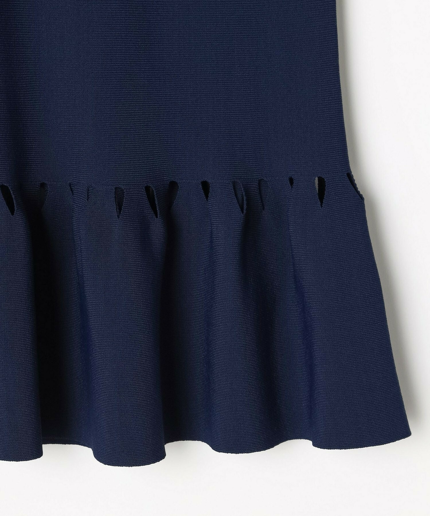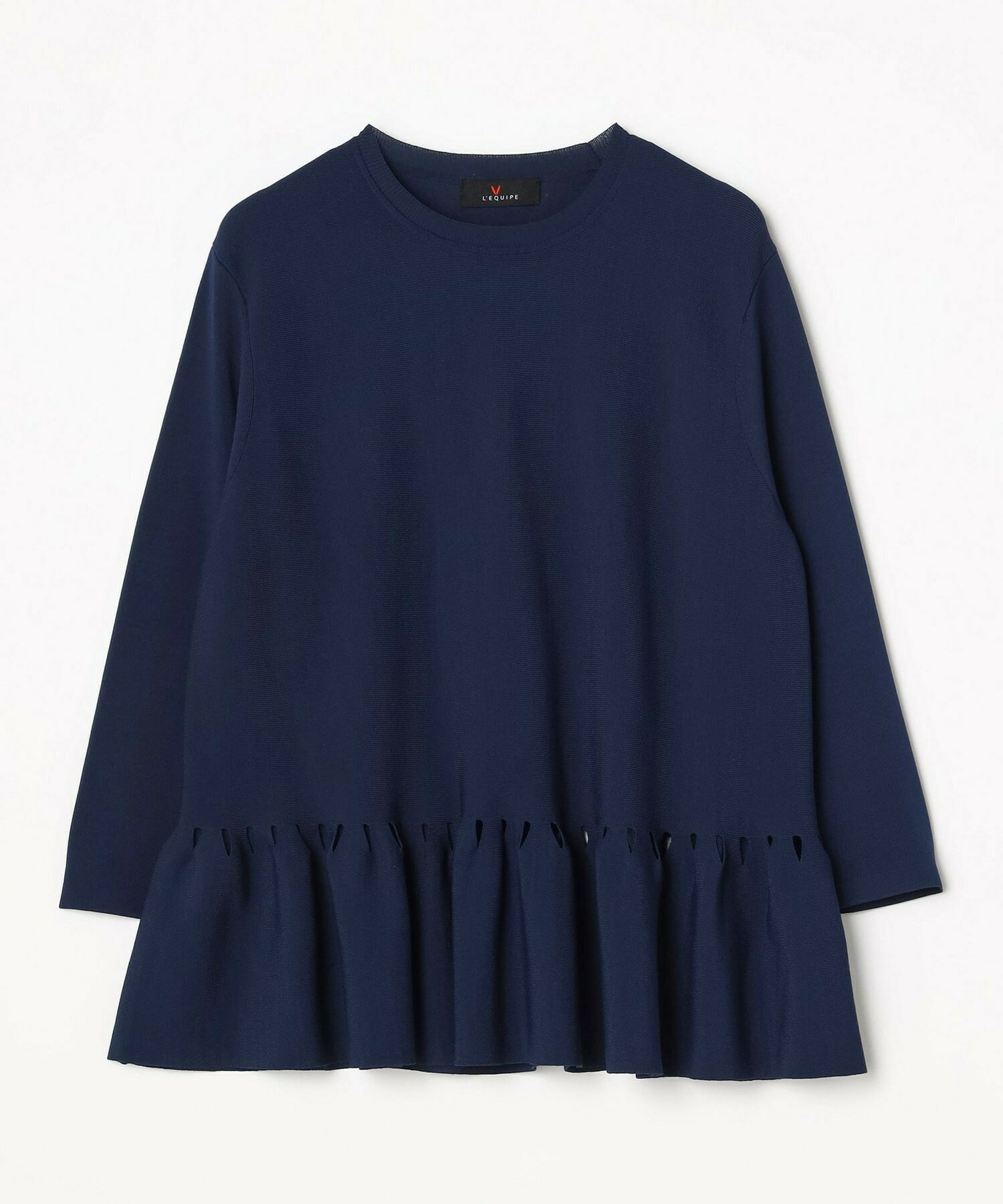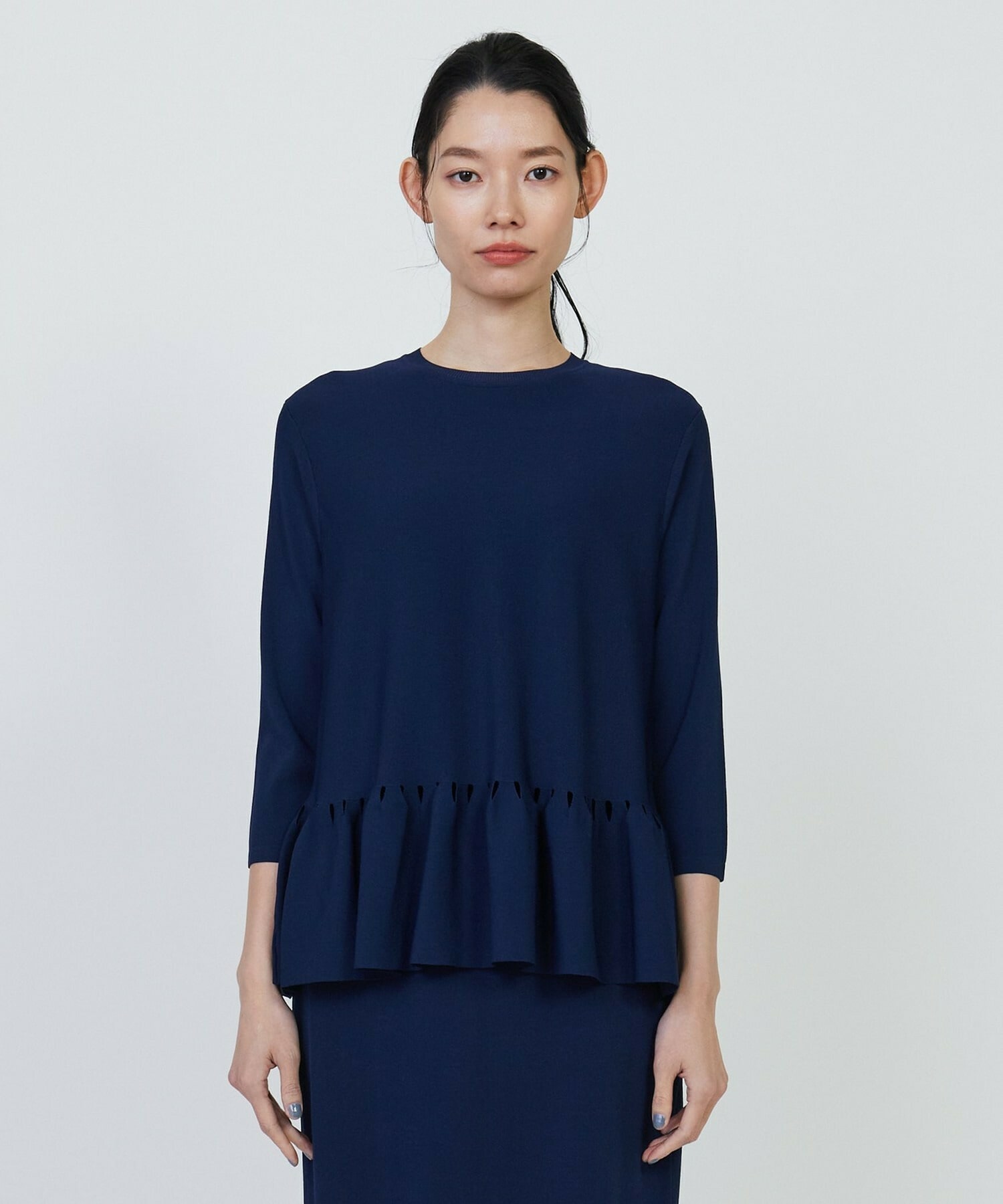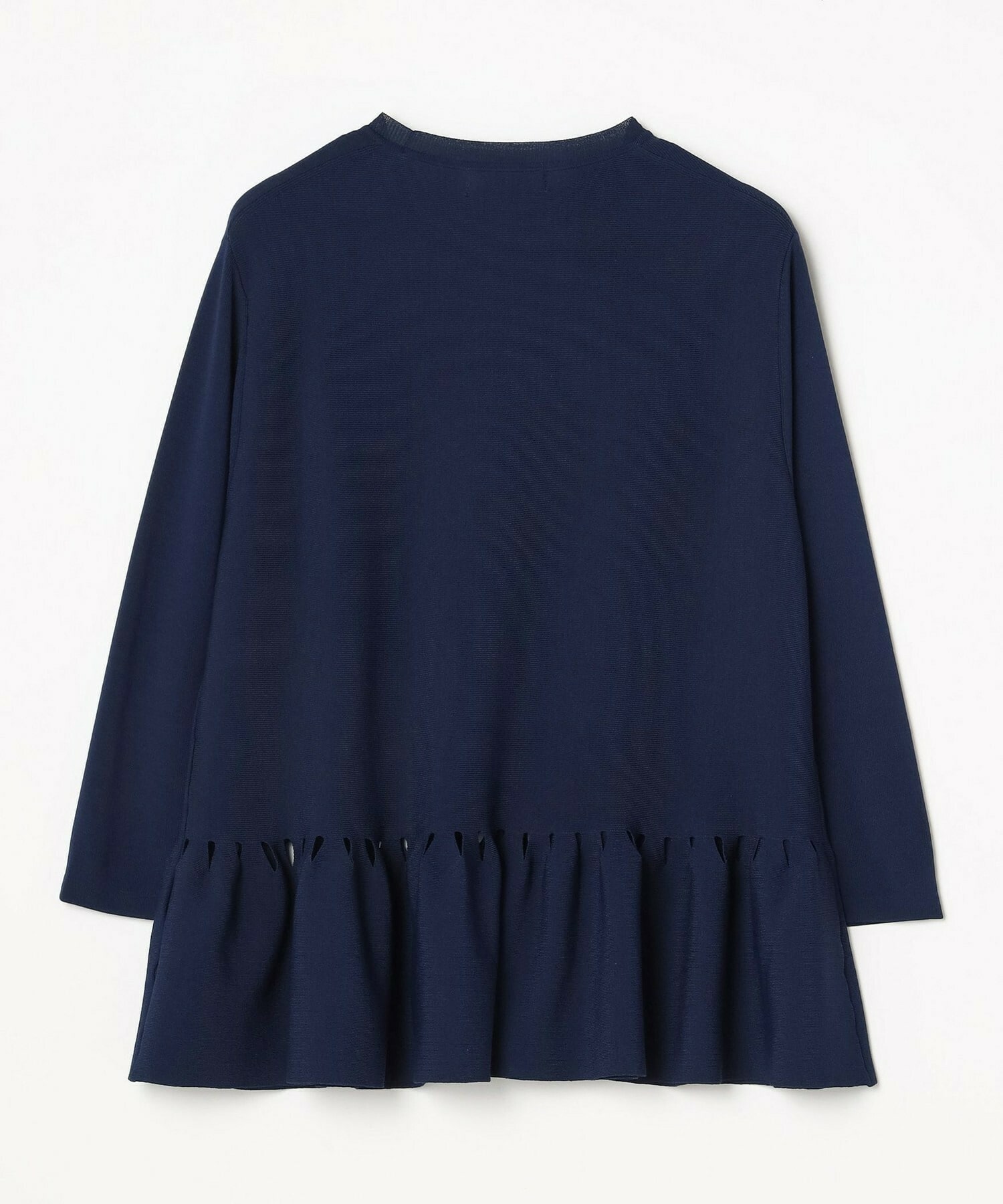 ややローウエストにフリルをあしらったニットです。フリルの付け根にはカットワークのような仕様が施してあり、シンプルな中にも女性らしい華やかさのあるデザインです。程よいストレッチ性の有る素材で、肌触りはさらっとしています。