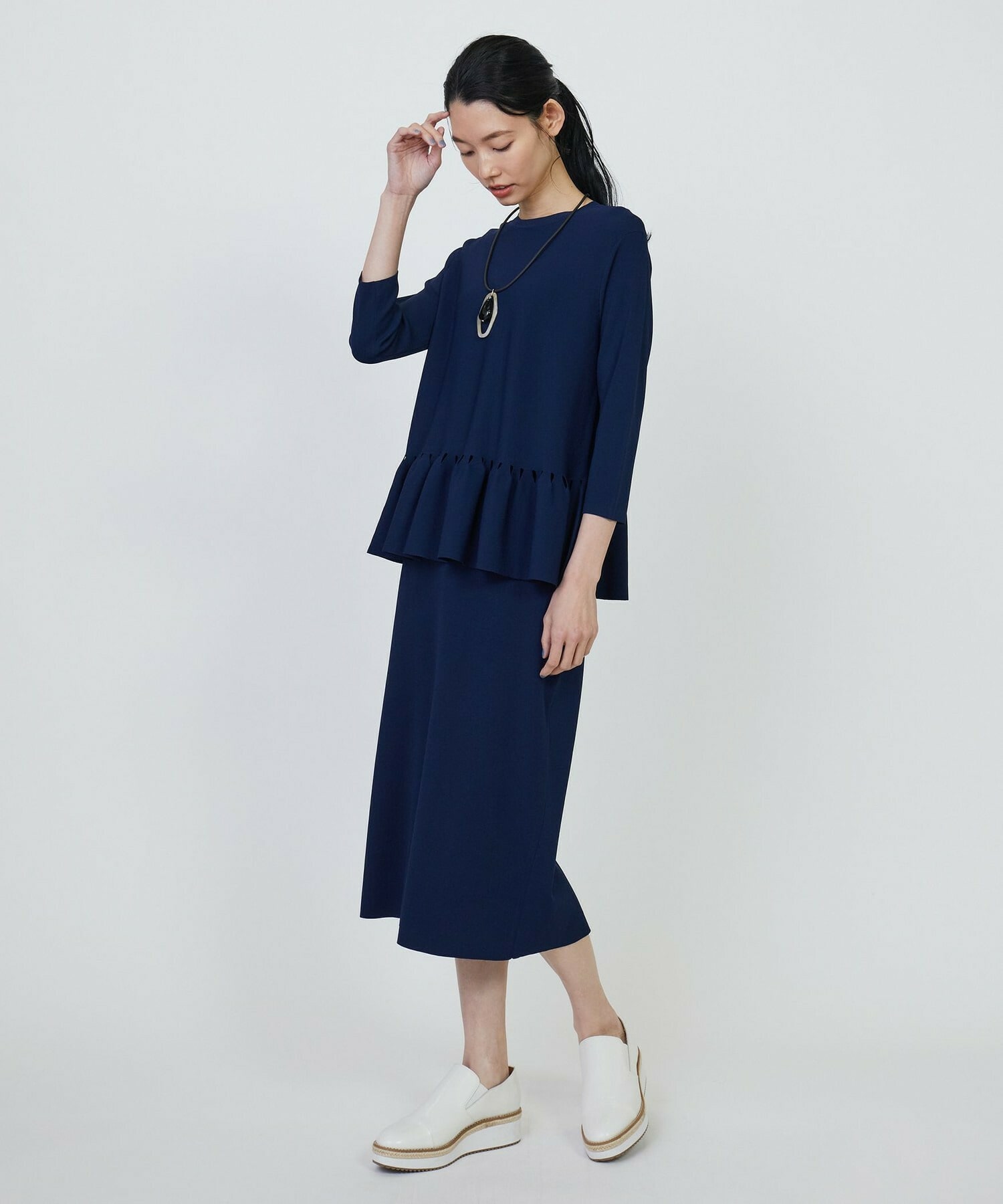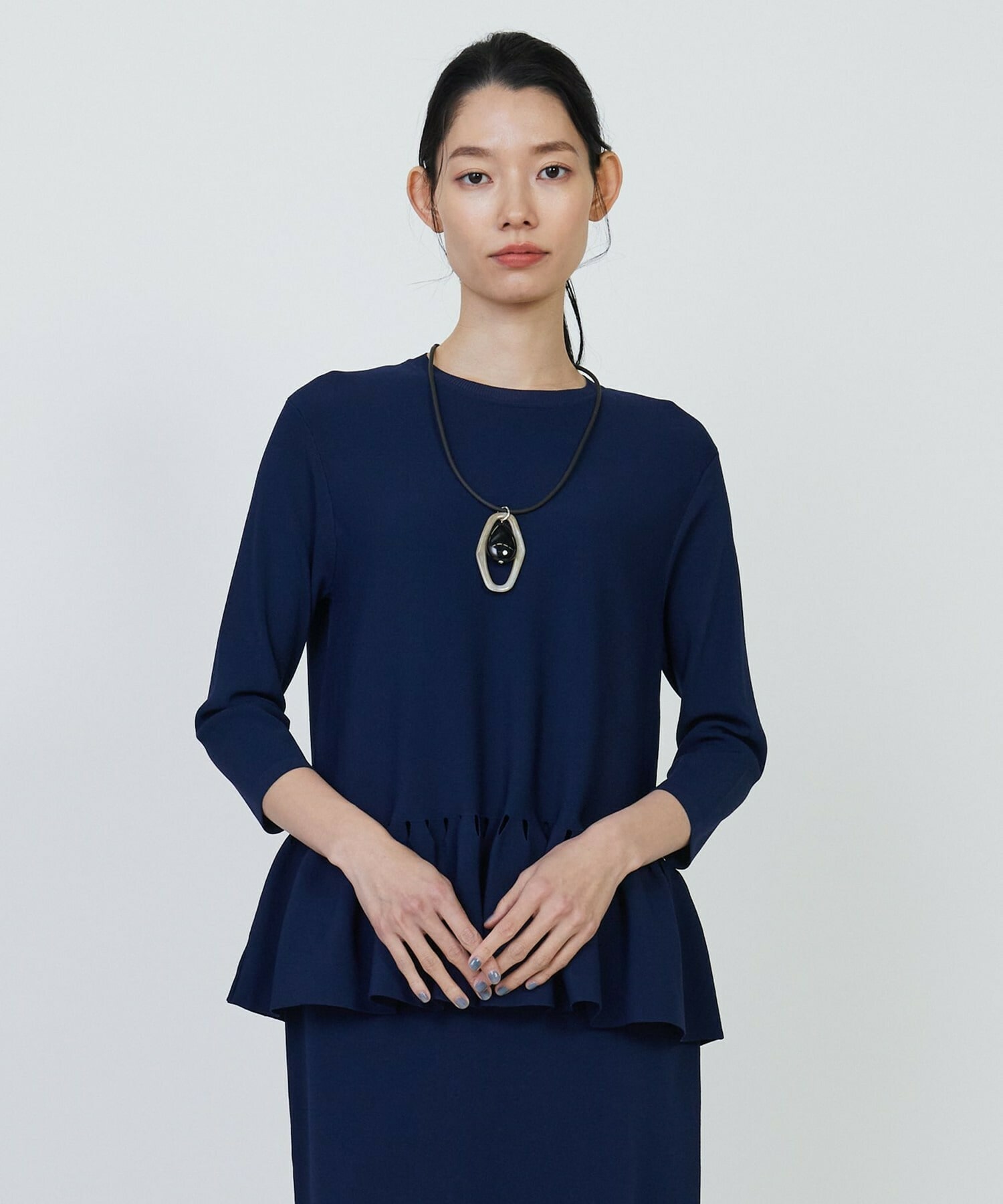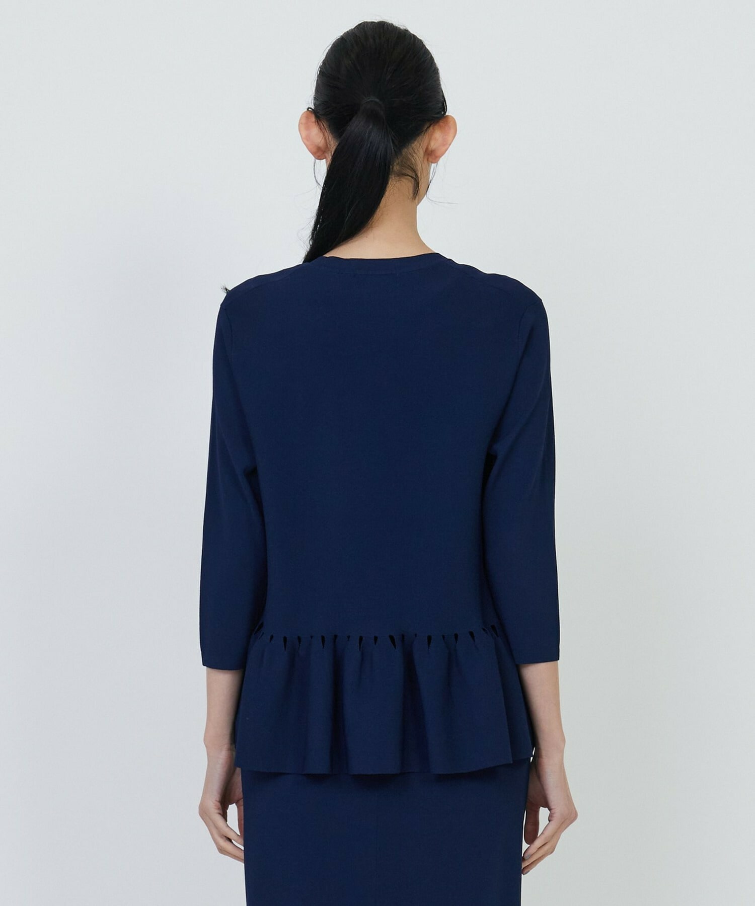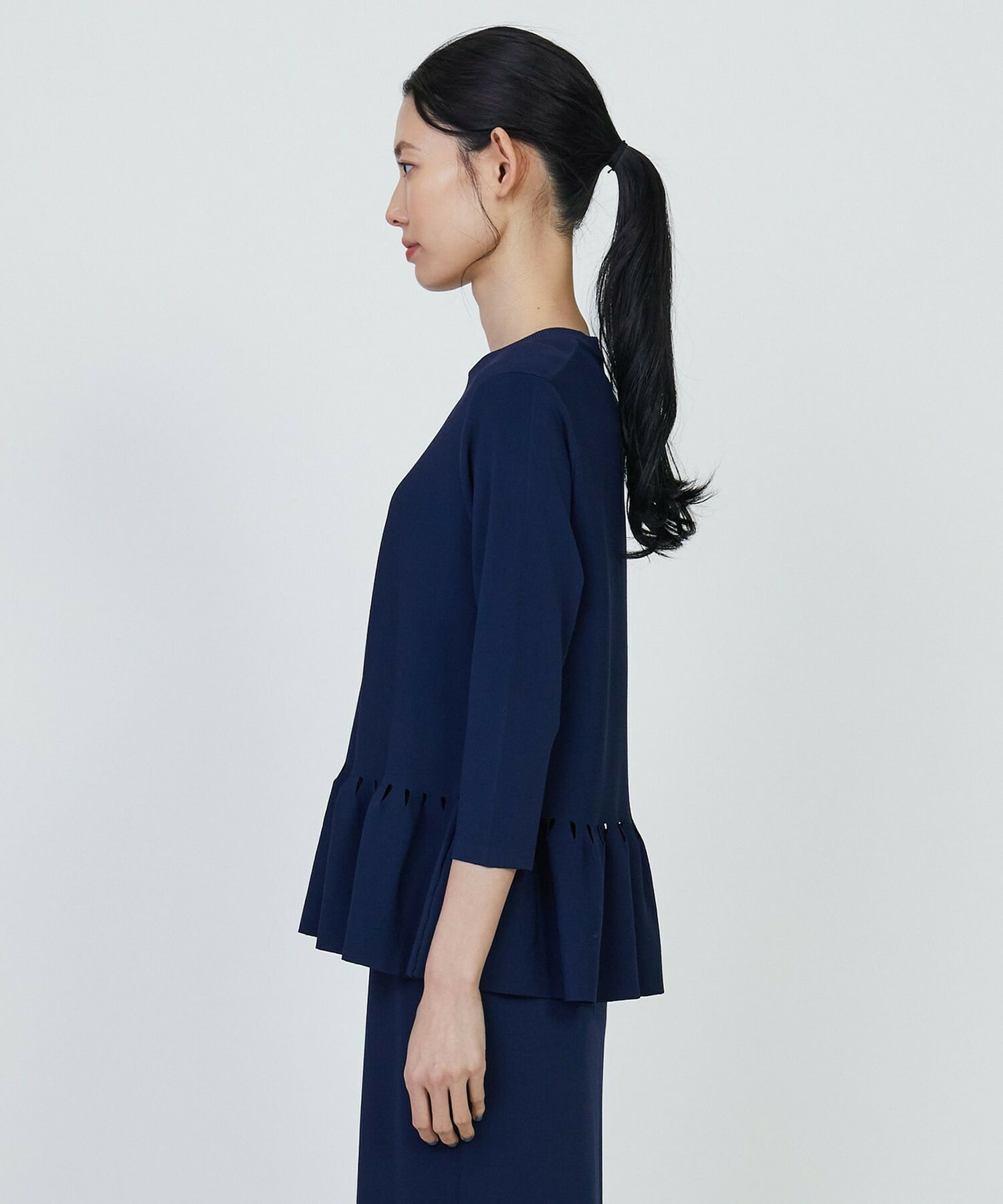 ジャケットなどのインナーにもしやすいよう、腕周りはすっきりとさせ、七分袖にしています。同素材のスカートと合わせたセットアップとしての着用がお勧めです。