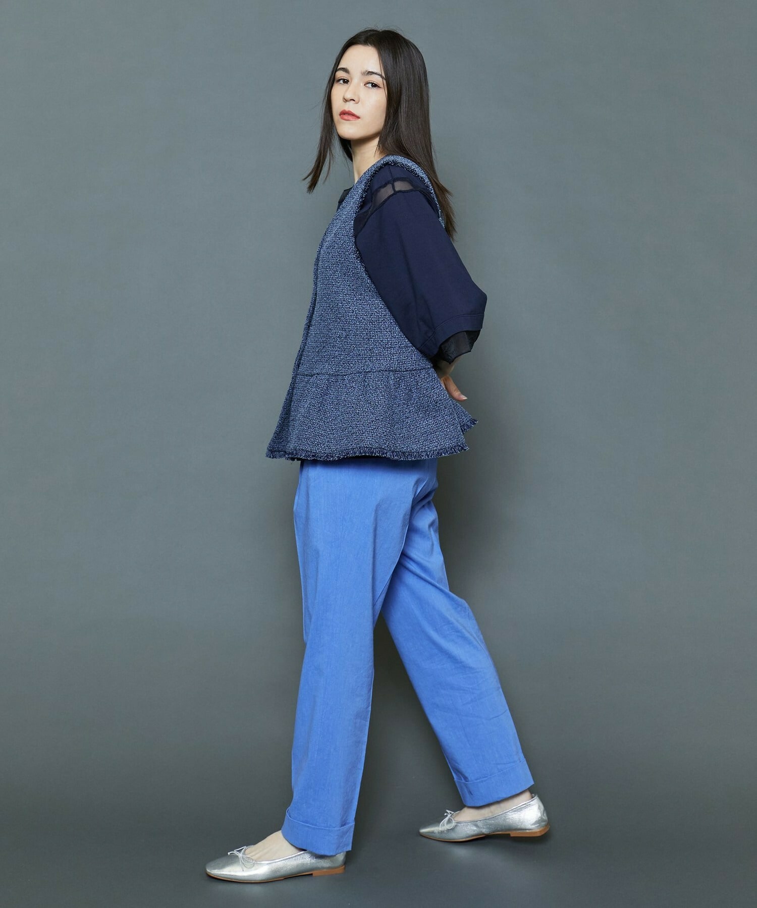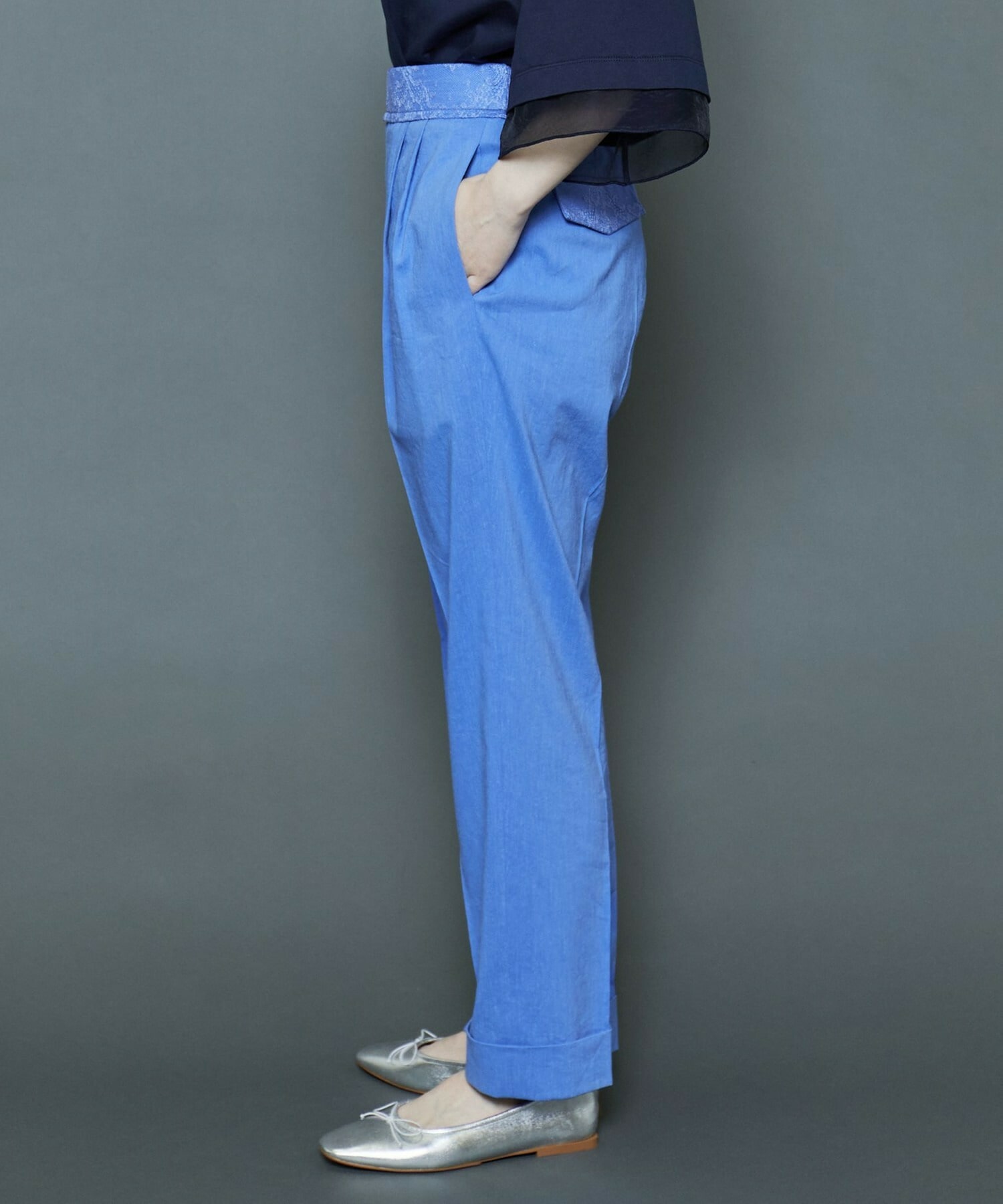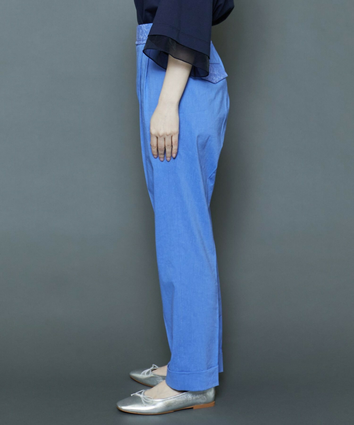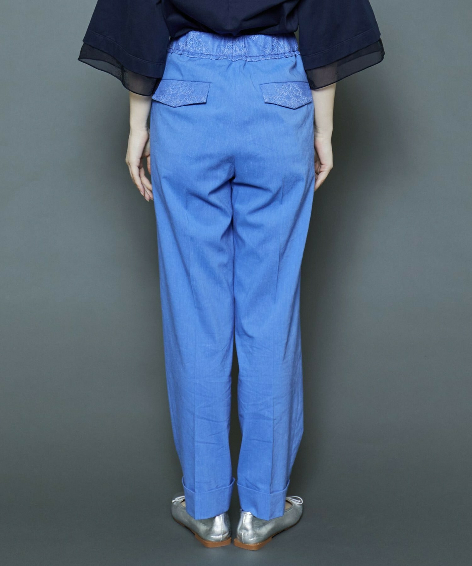 裾はW仕様でウエストの後ろにはゴムで伸縮性を持たせ、ストレスのない穿き心地がポイント。