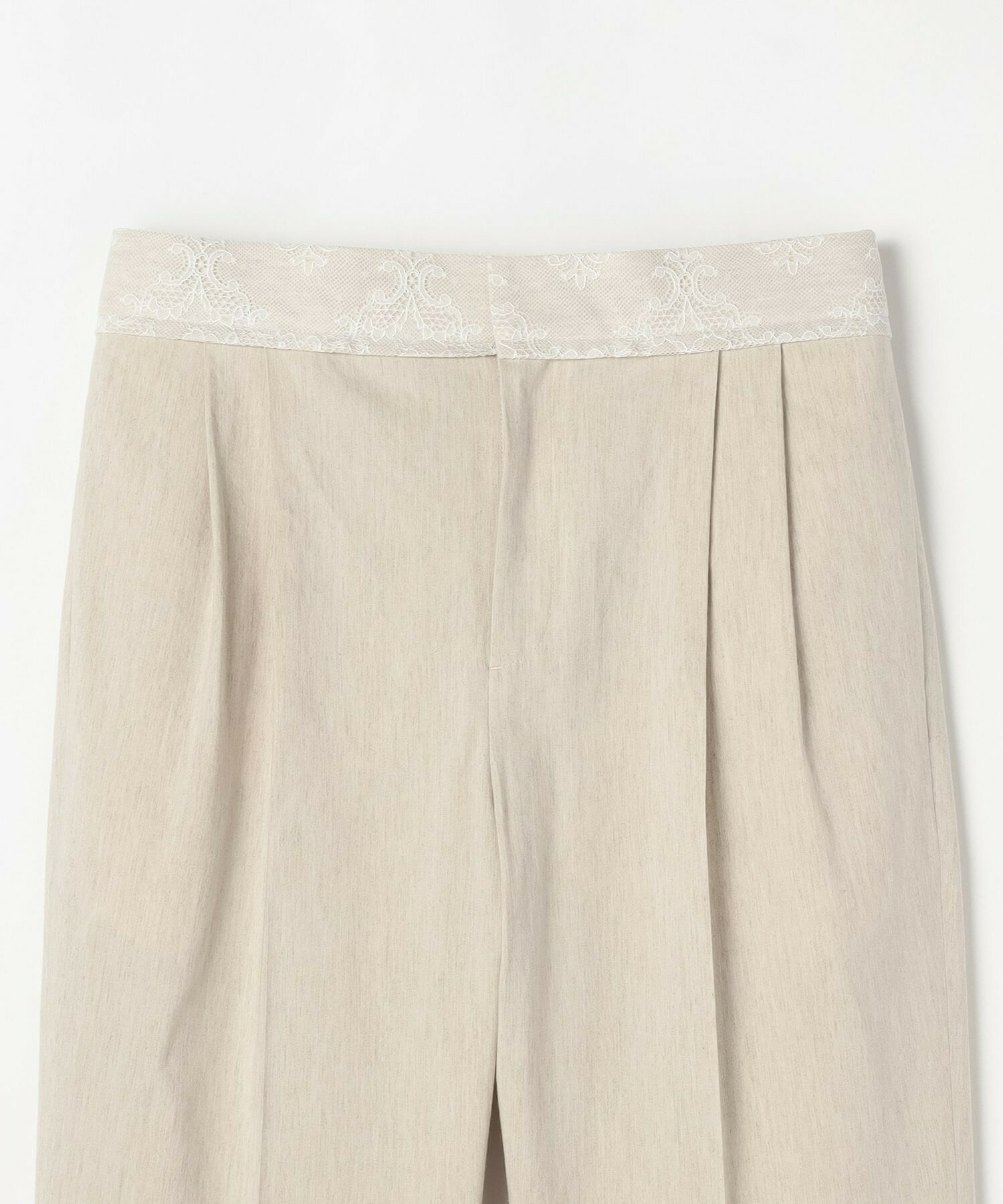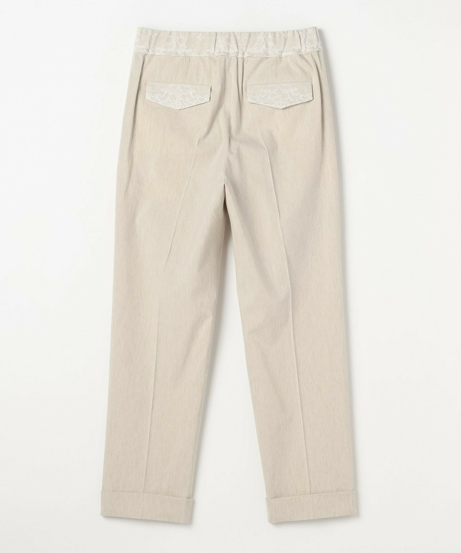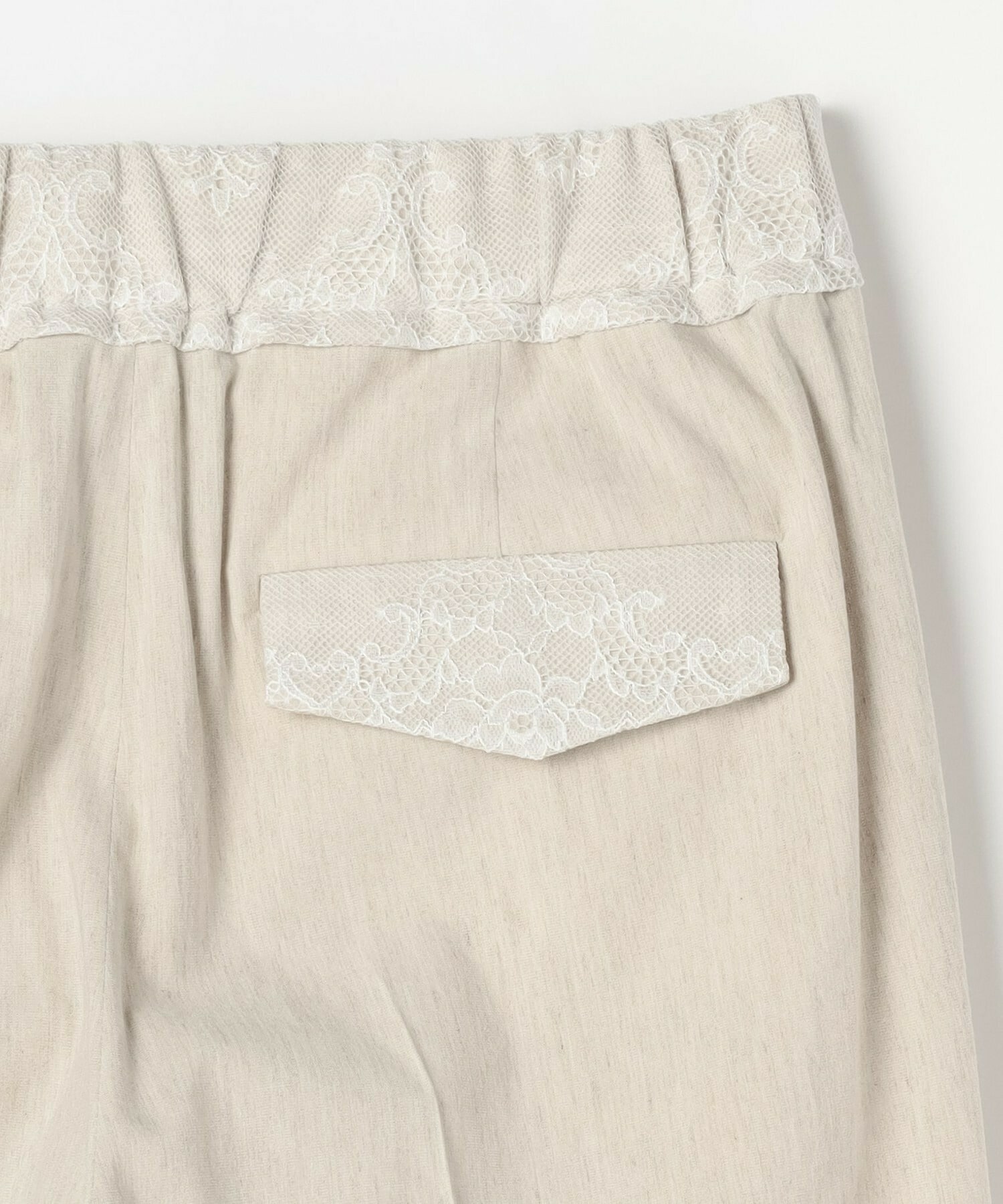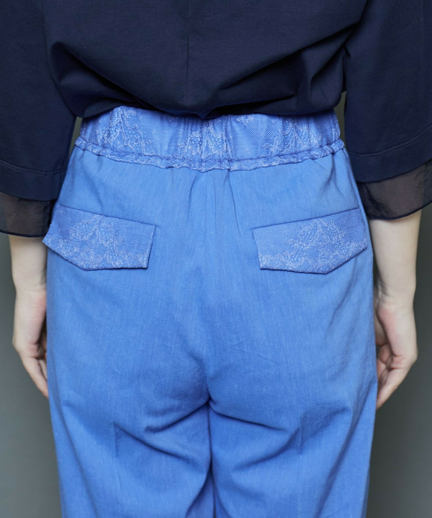 ウエストベルトと後ろのポケットにレースをくるんだデザインが特徴です。