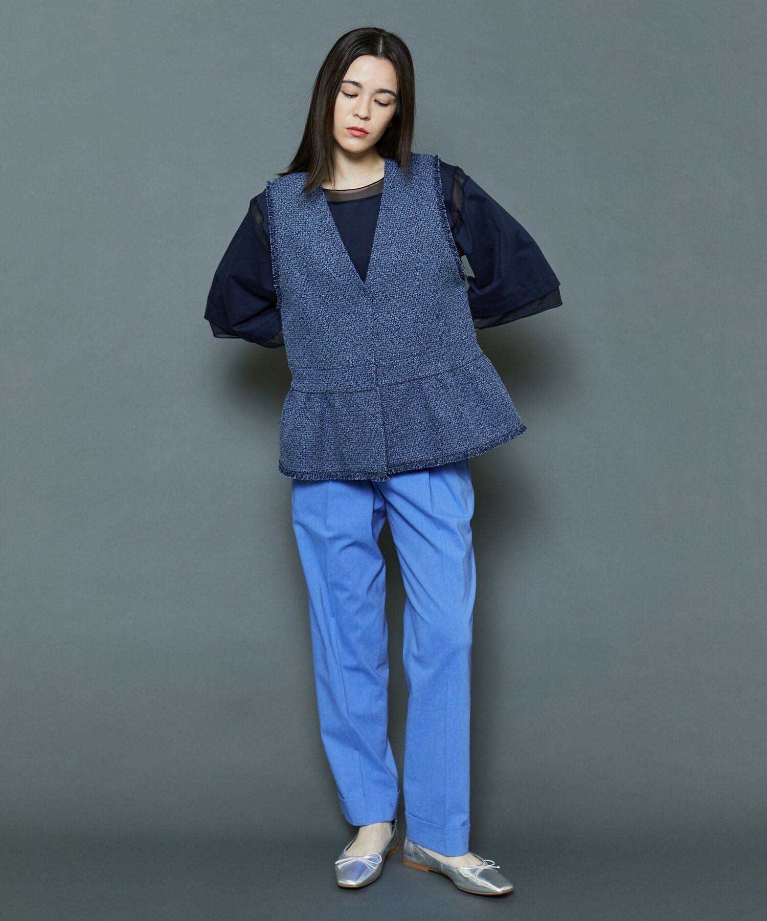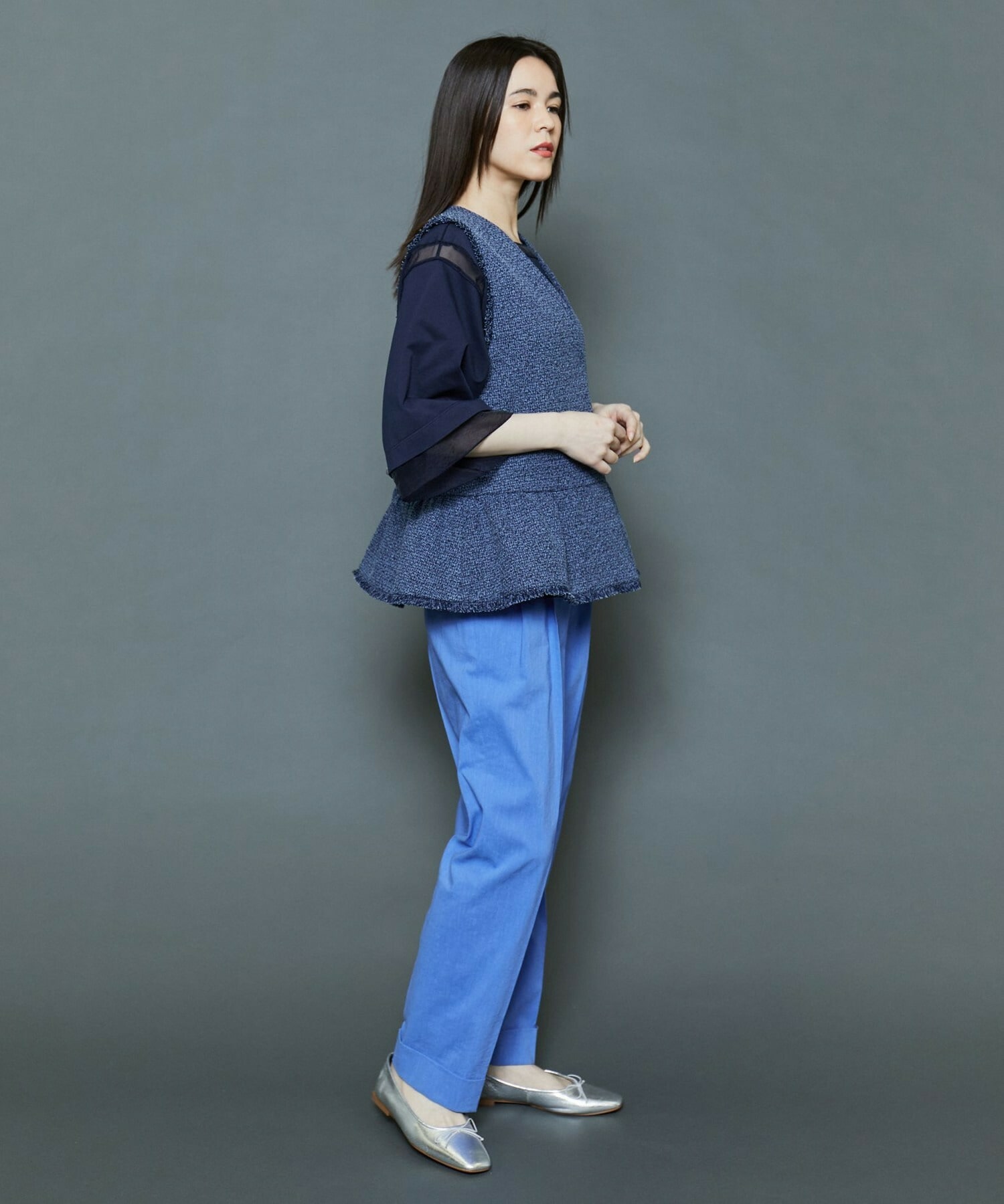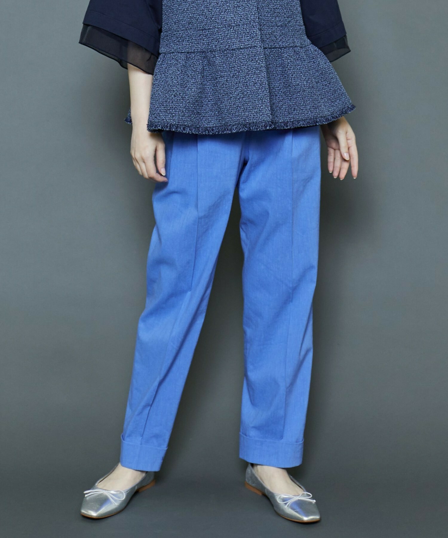 裾にかけて緩やかにすぼめたスッキリとしたシルエットでセンタープレスの入った綺麗めなパンツ。