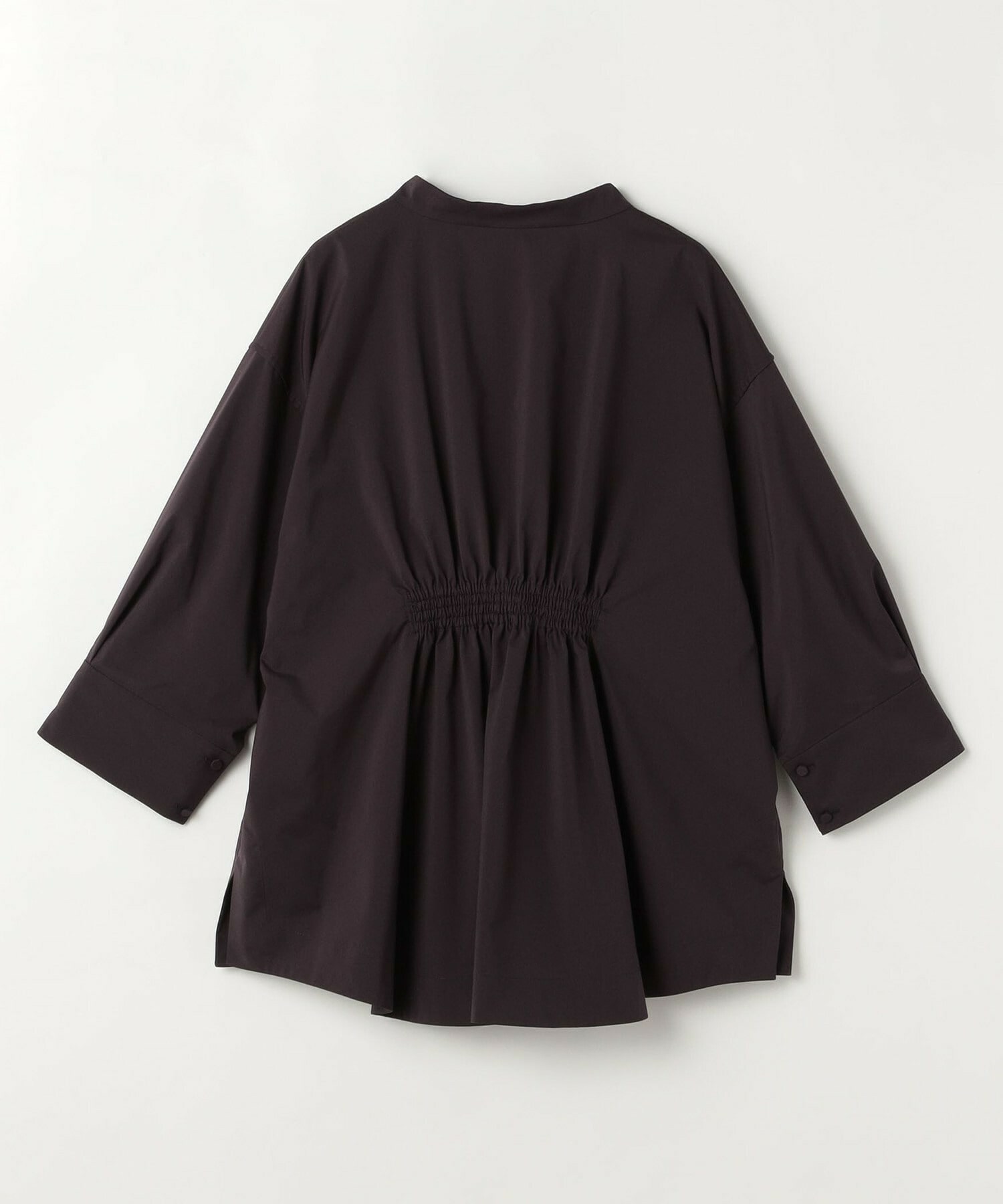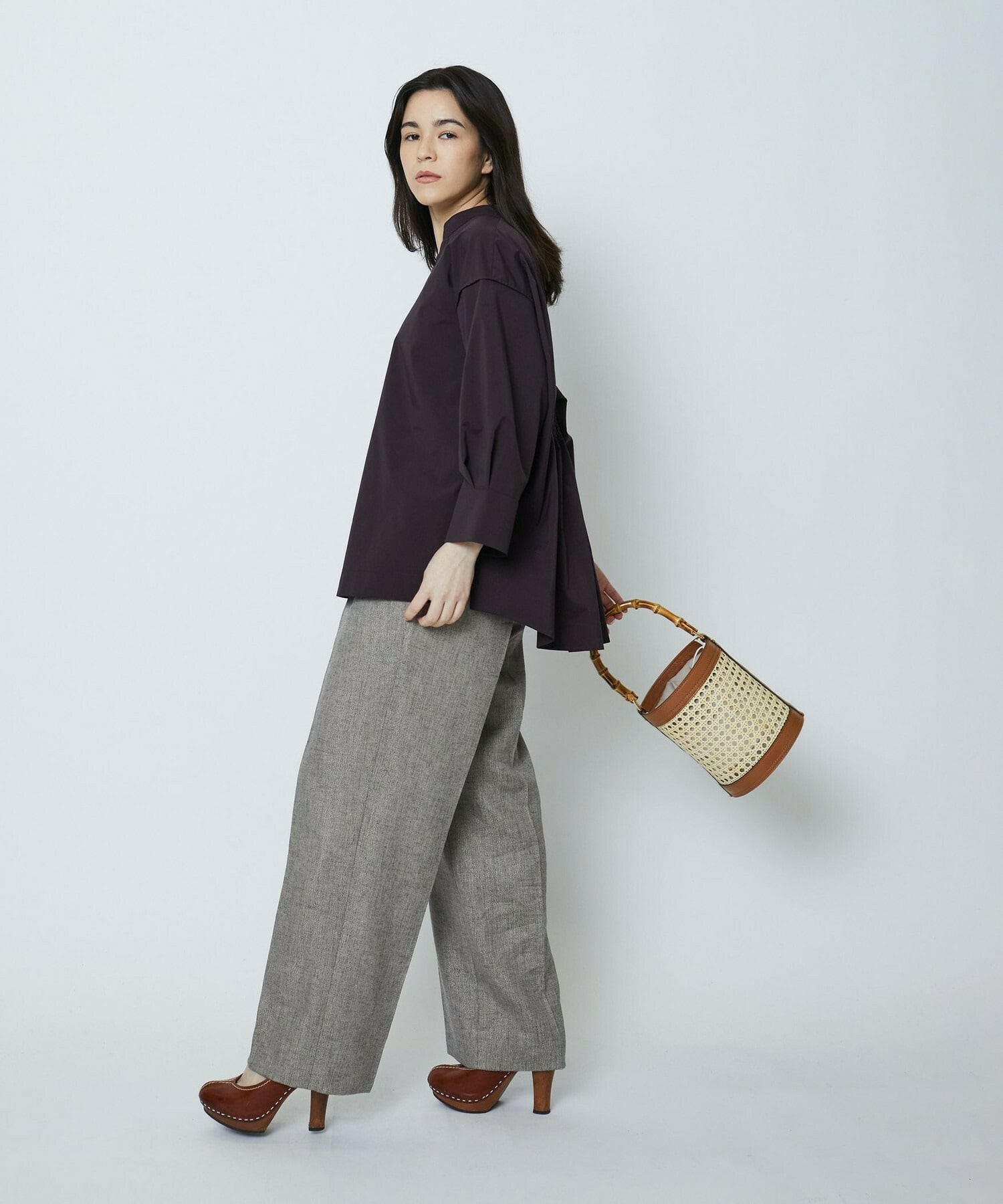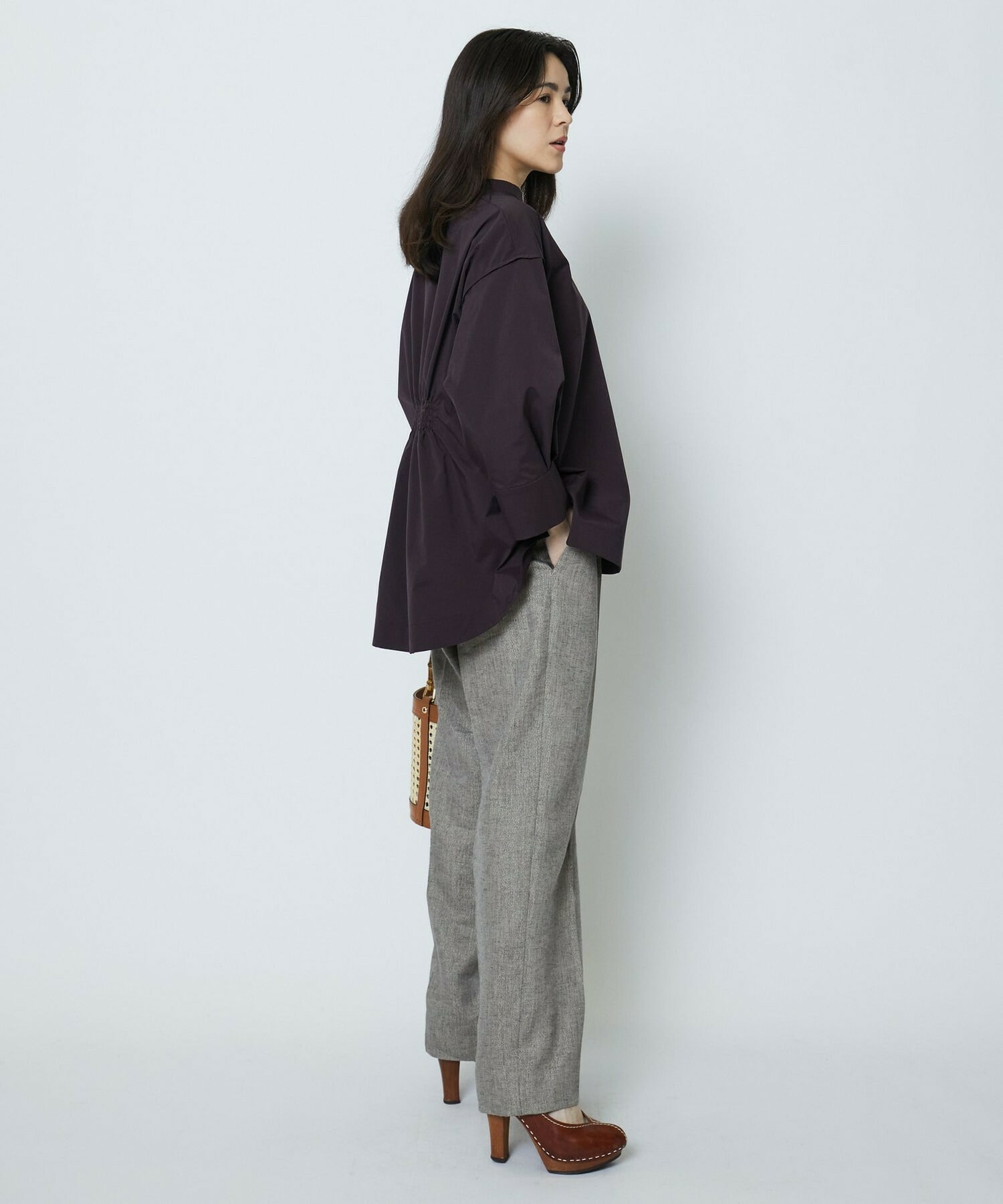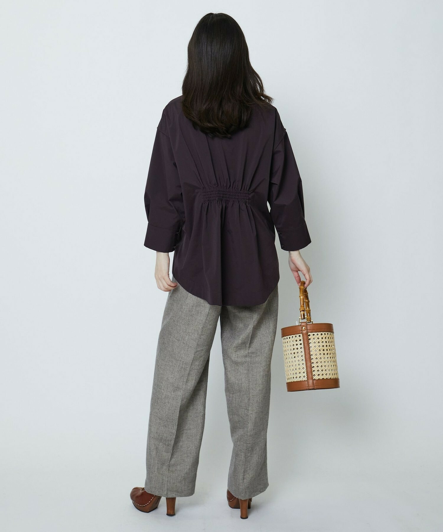 全体的にボリュームがありつつも、後身ウエスト位置にゴムでギャザーを寄せ華奢に見えるようにこだわった一着。