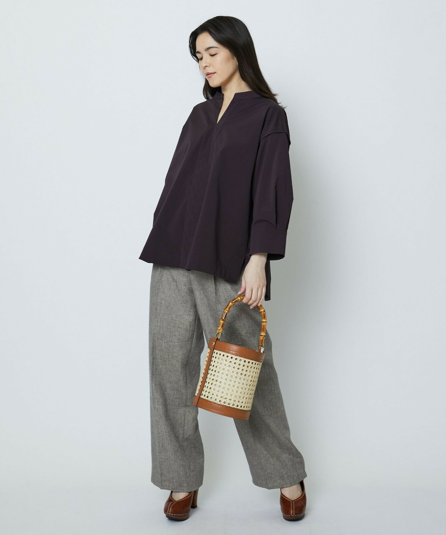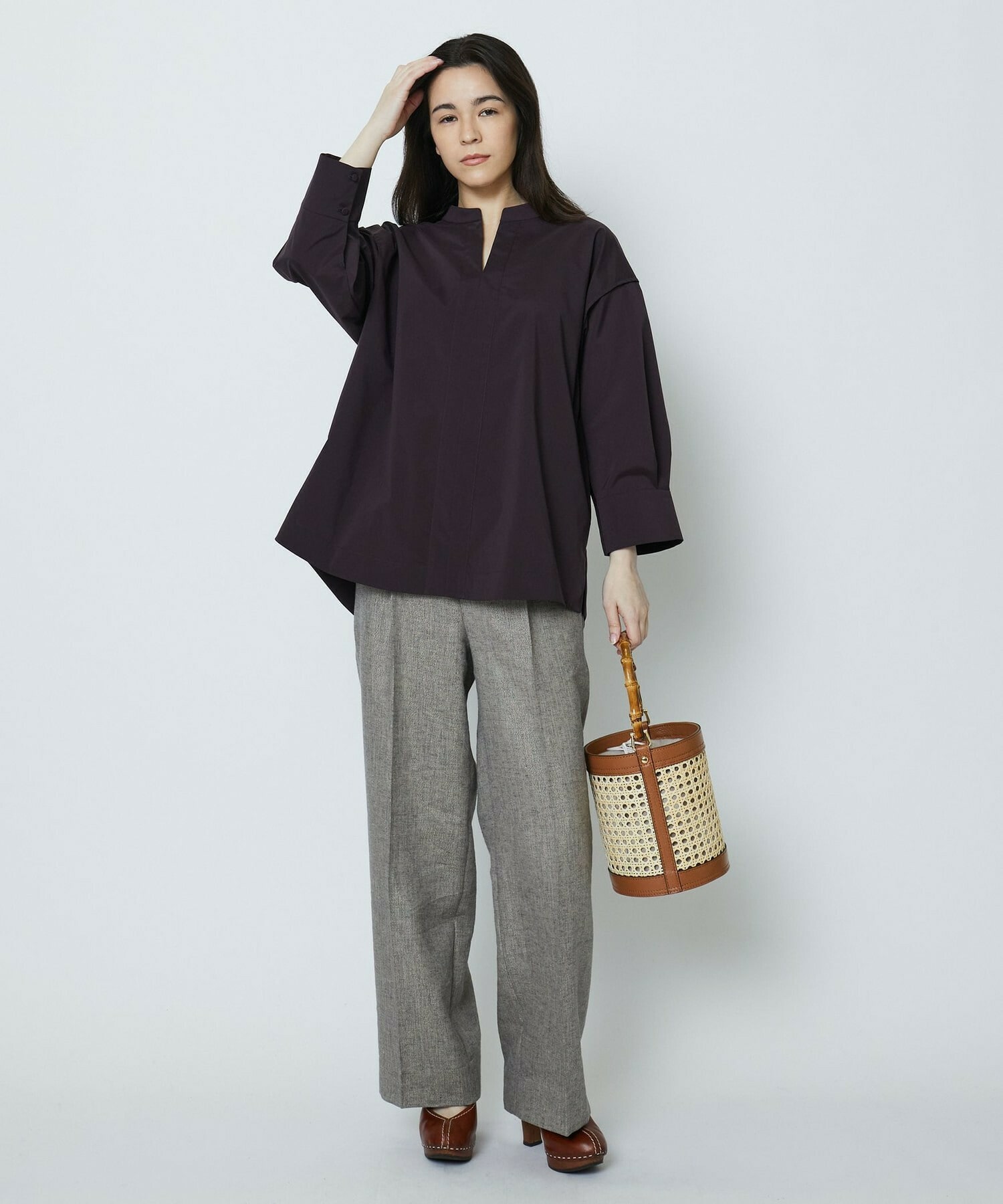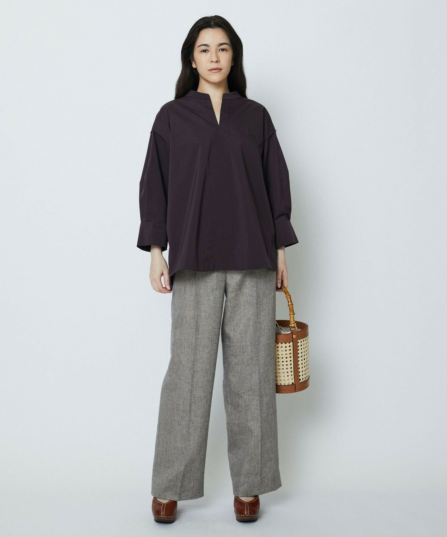天然ライクな風合いにするタスラン加工により肌触りがよく、ポリエステルなのでシワになりにくいという綿のタッチと合繊の機能性を兼ね備えた素材です。