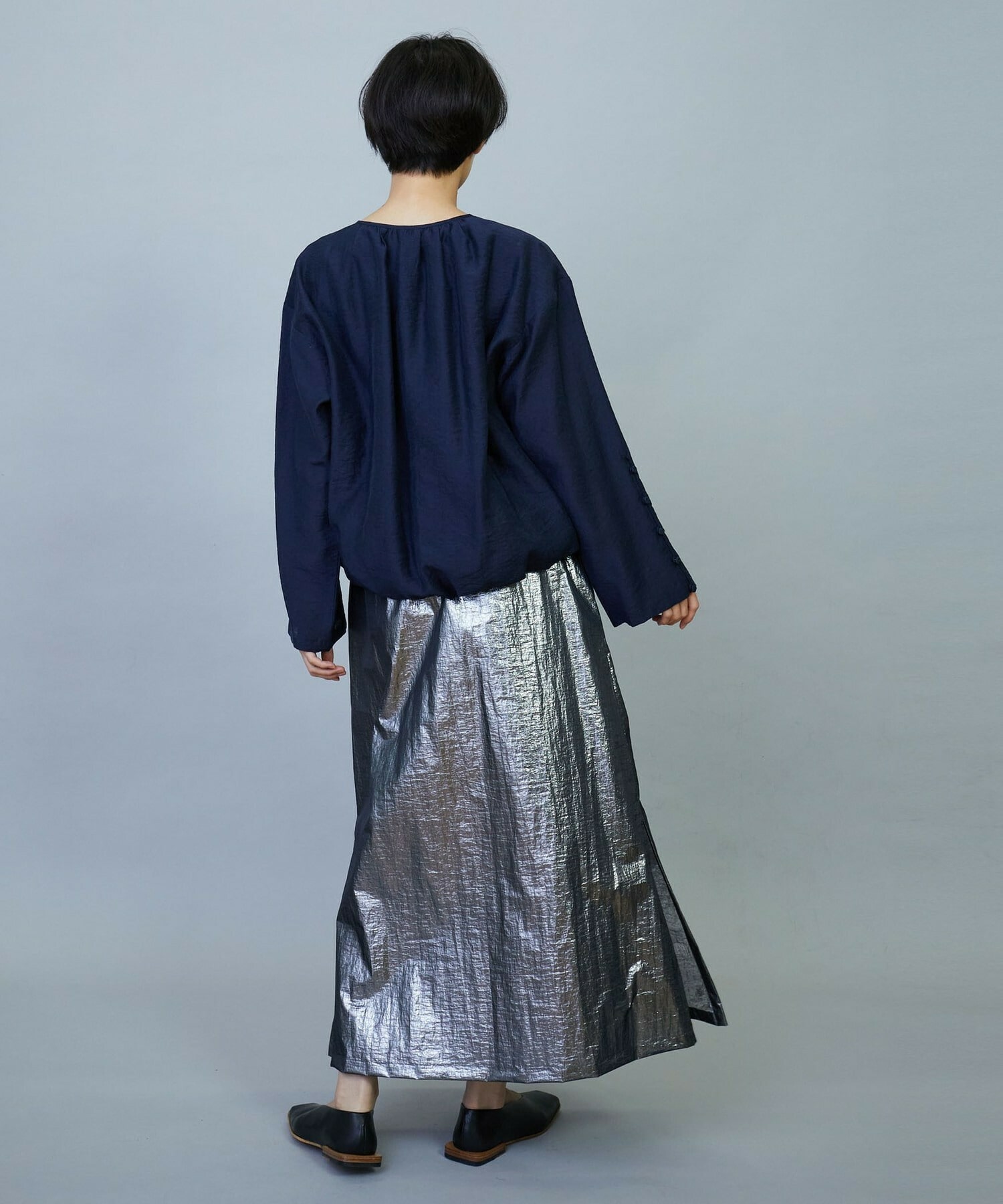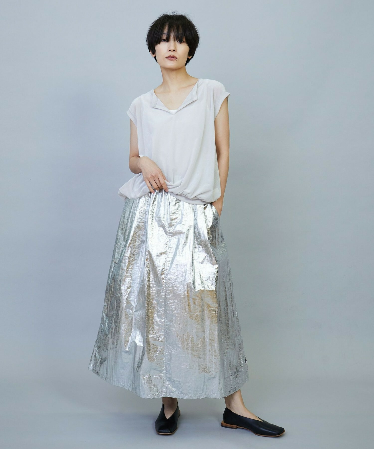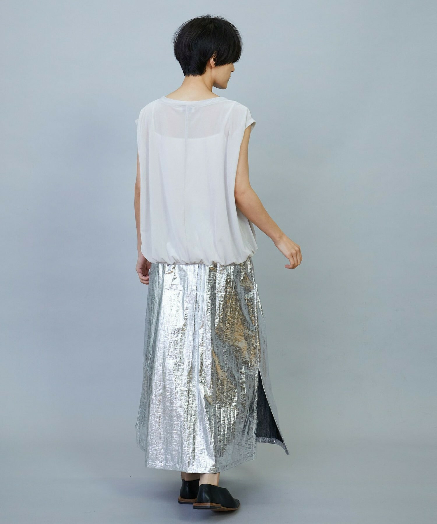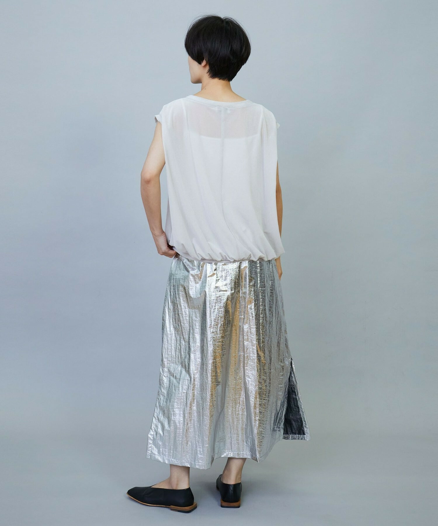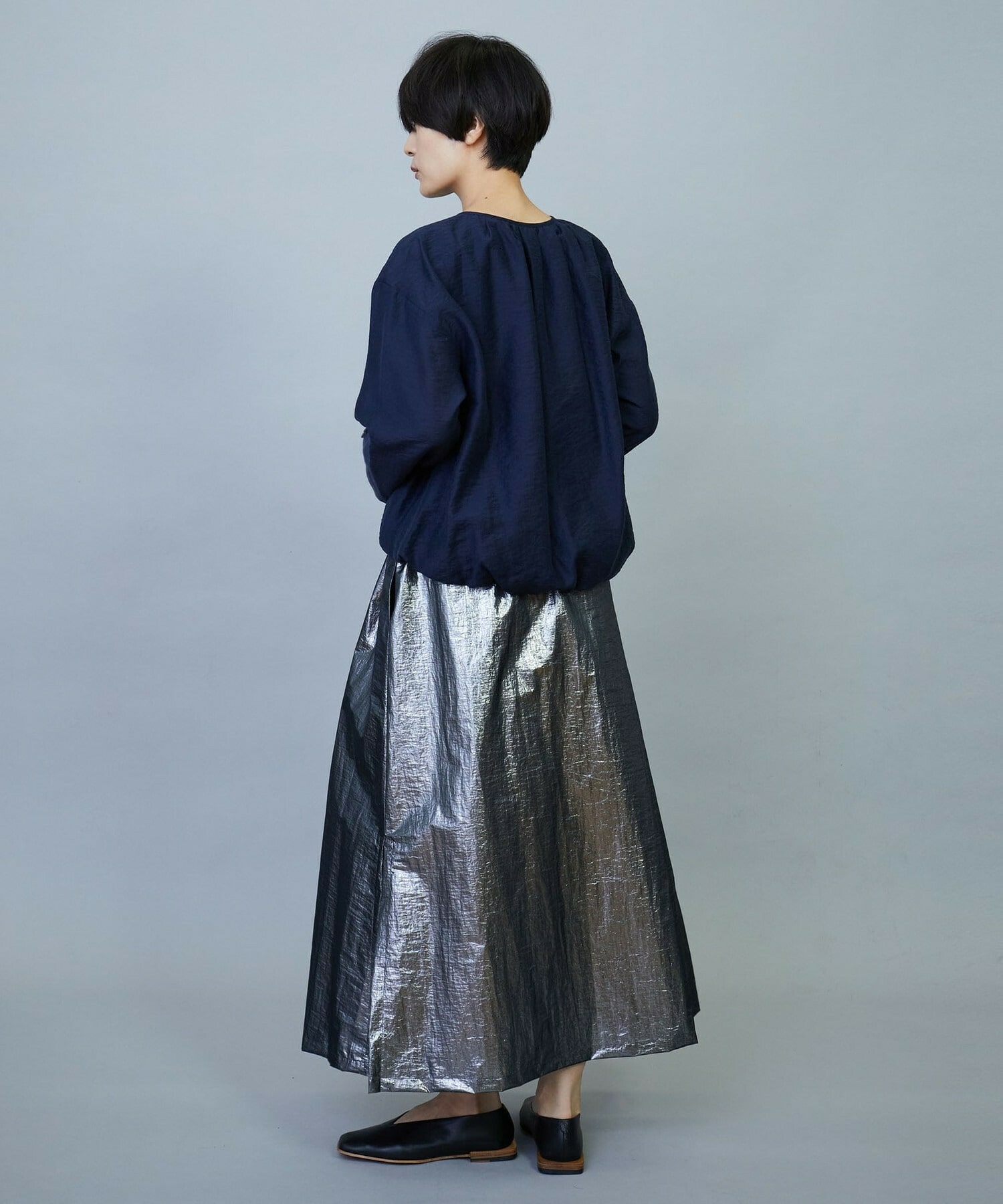 ウエスト周りはゴムとギャザーでボリュームを出し、裾にかけてややAラインのシルエット。