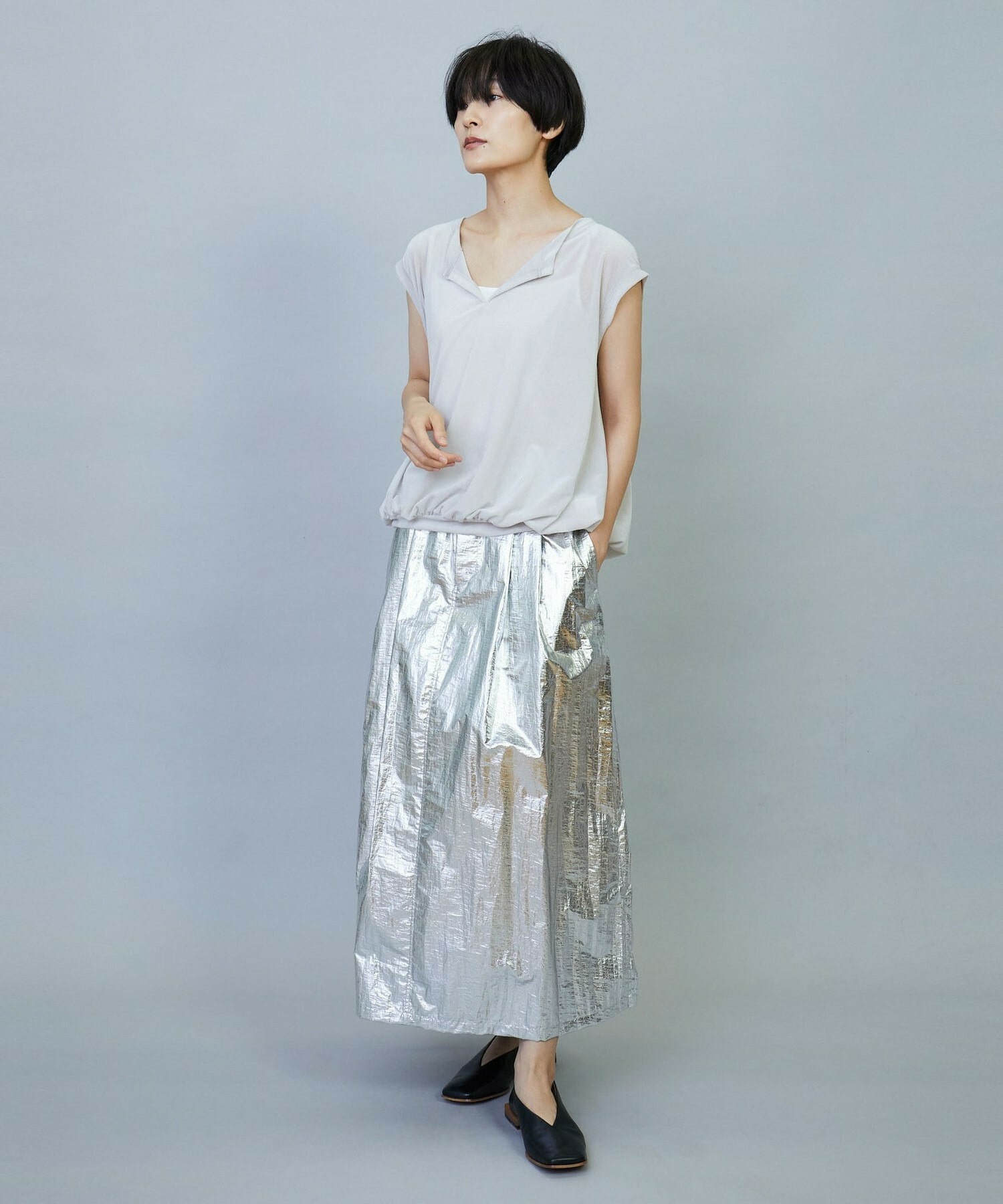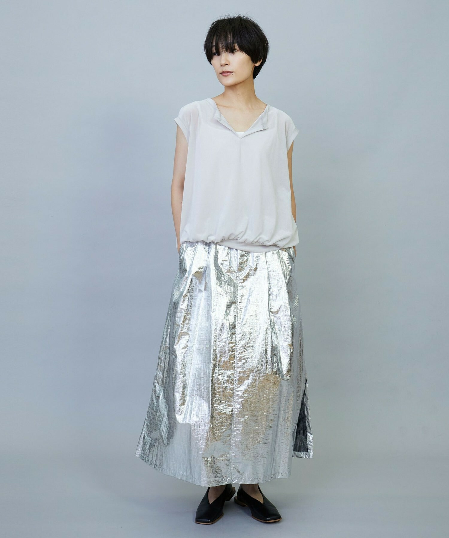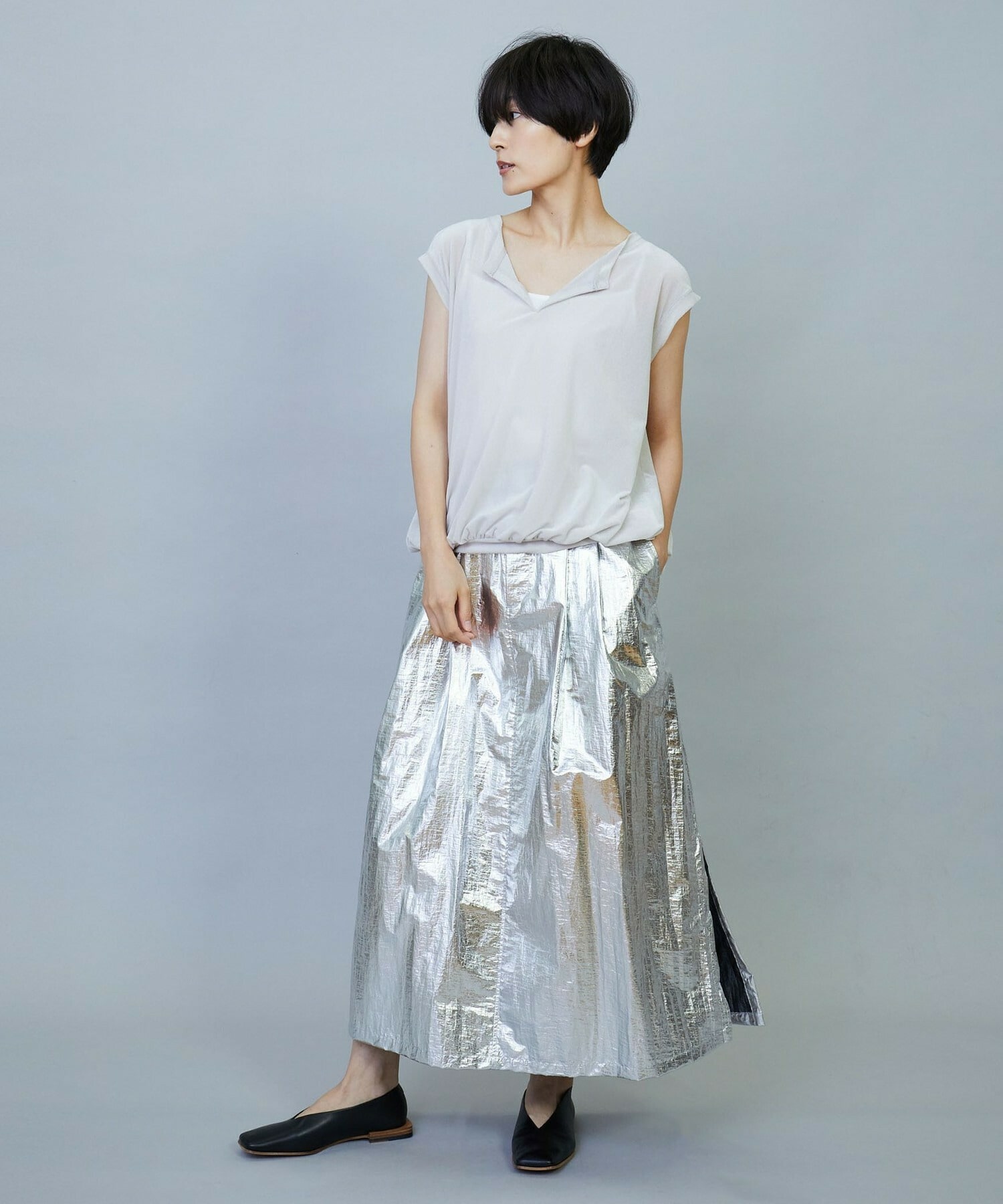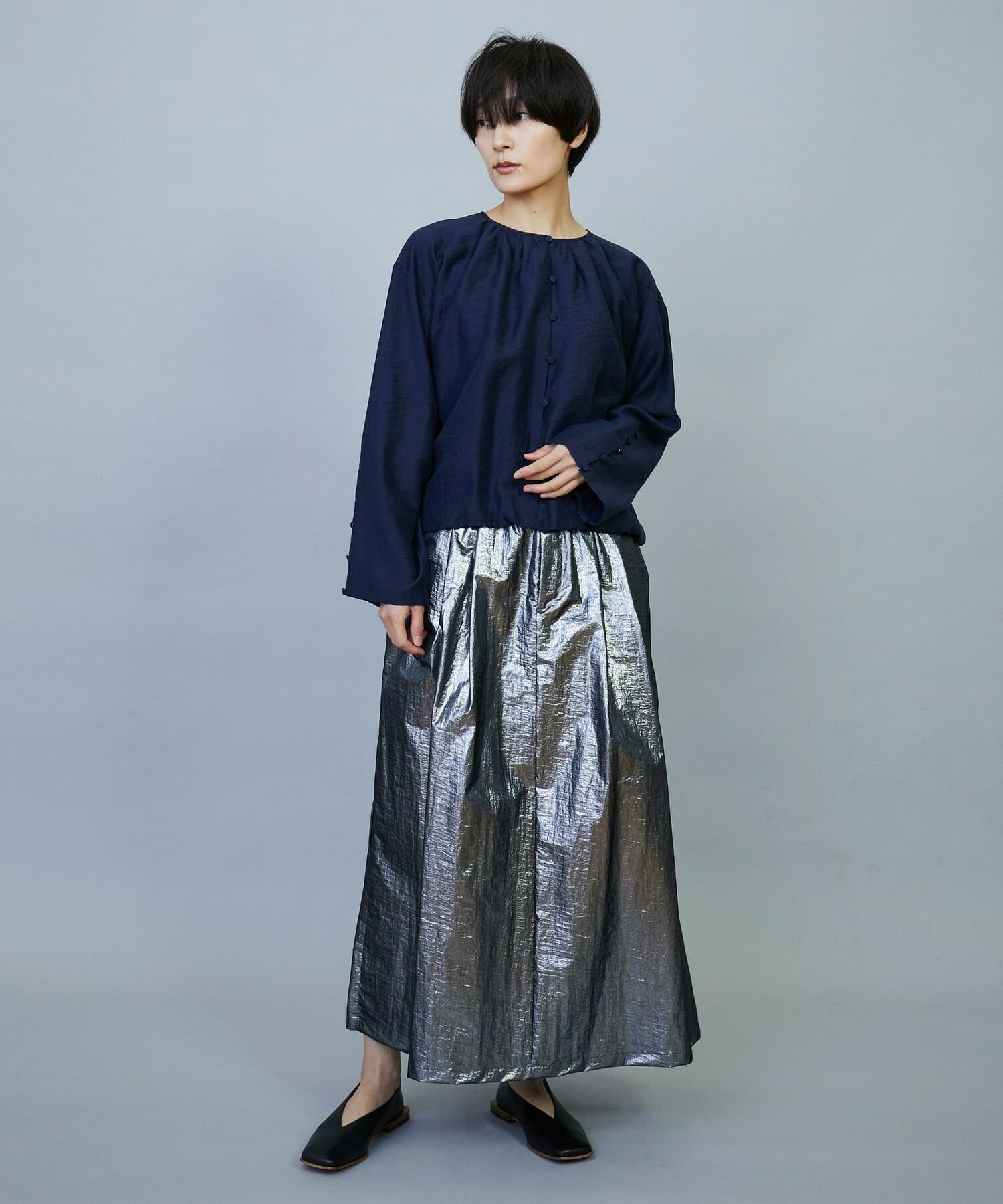 ウエスト周りはゴムとギャザーでボリュームを出し、裾にかけてややAラインのシルエット。
