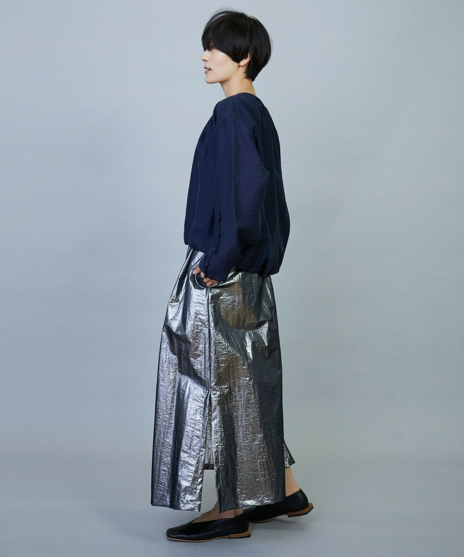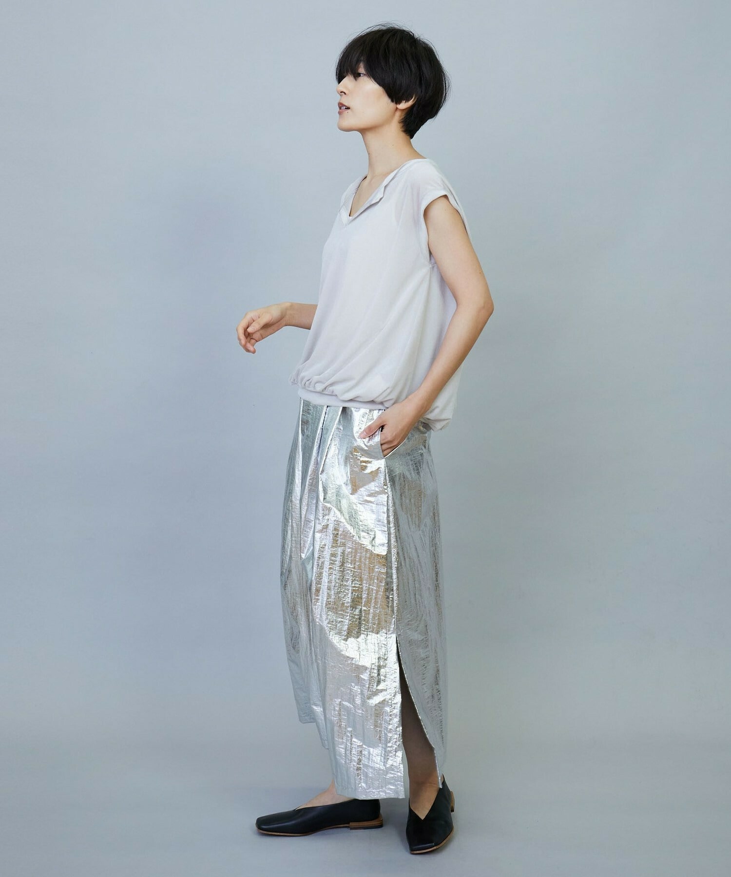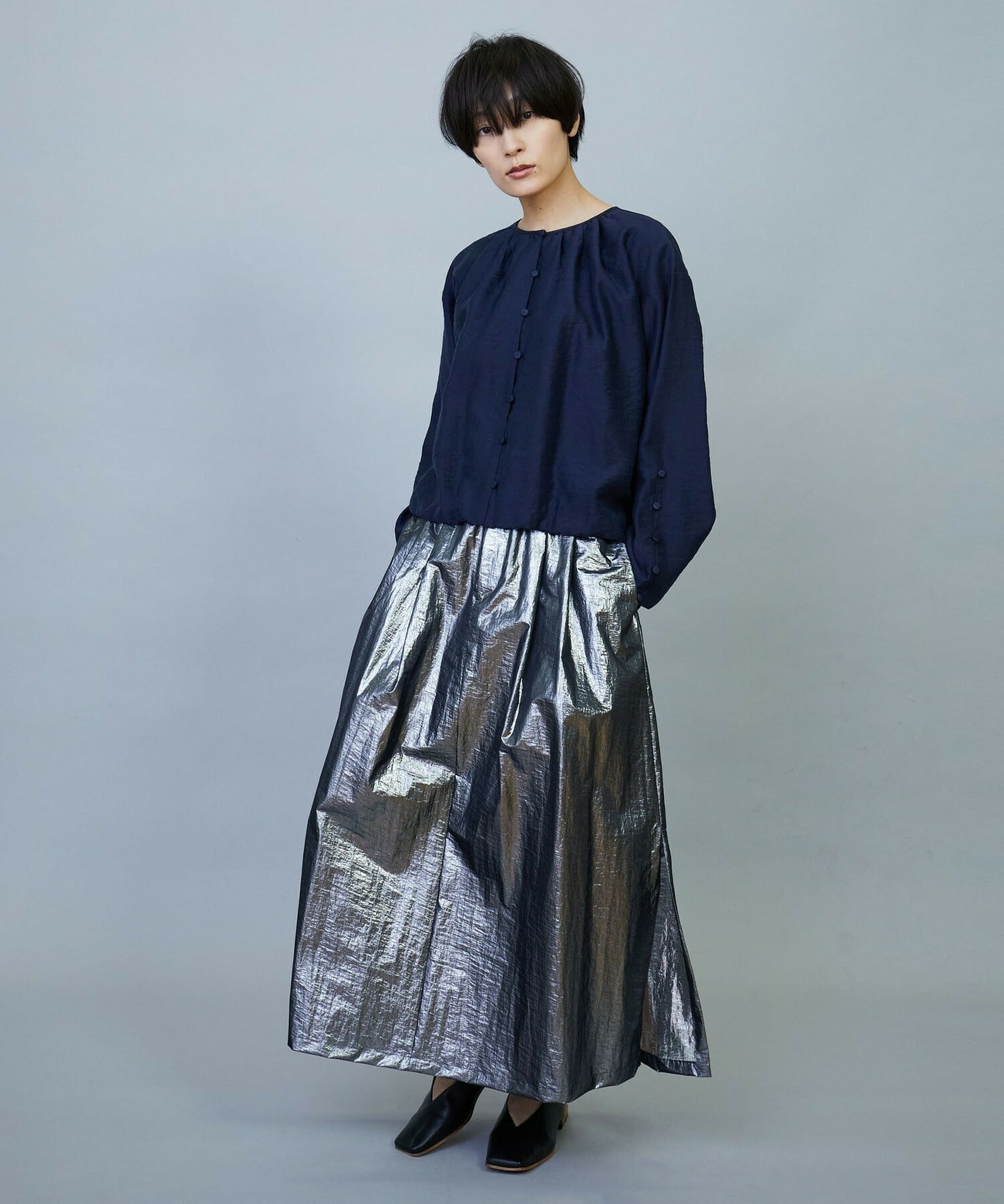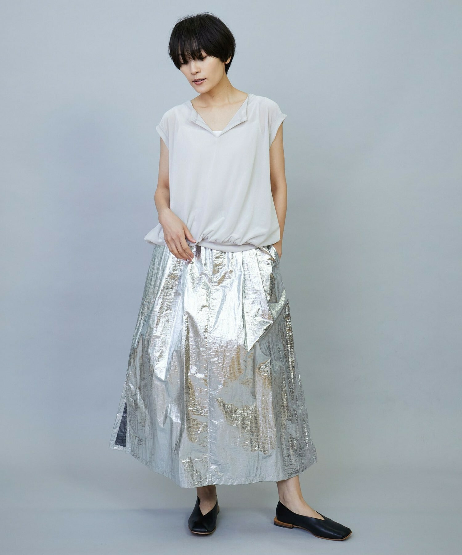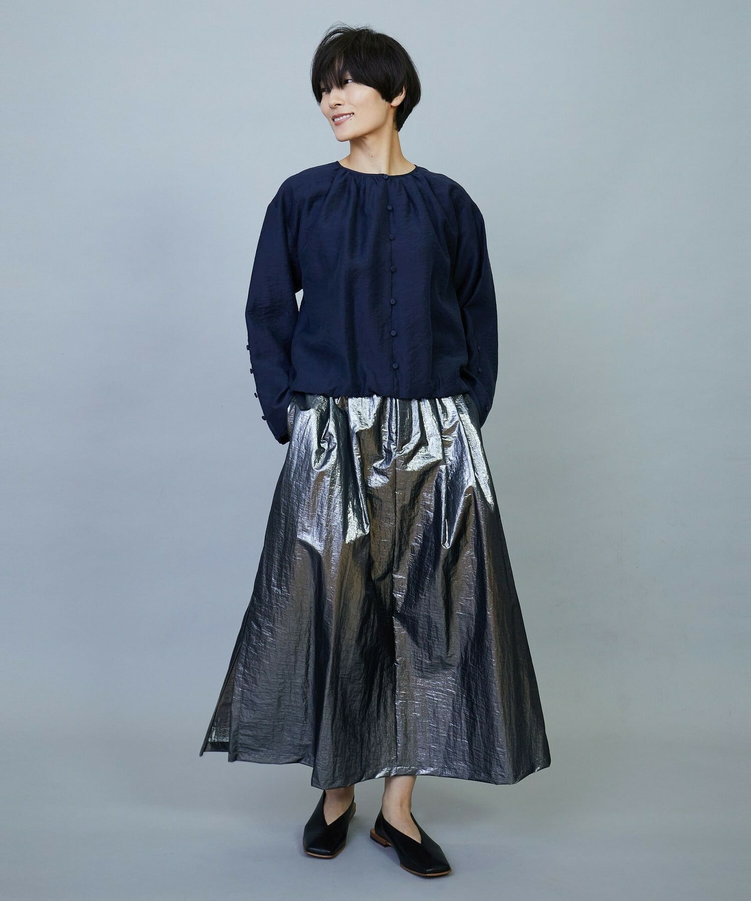 ウエスト周りはゴムとギャザーでボリュームを出し、裾にかけてややAラインのシルエット。