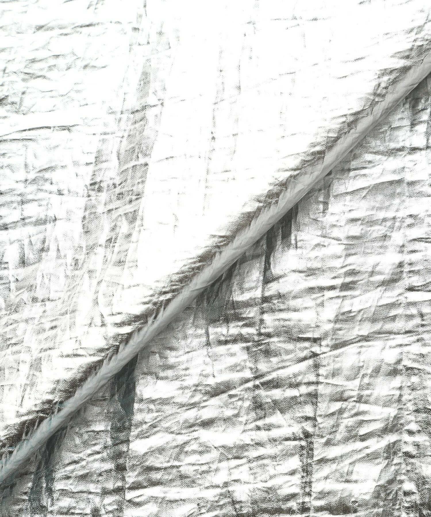モノフィラナイロンを液流染めすることでワッシャー感を出したシアーなオーガンジーに箔プリントで光沢を出した素材。