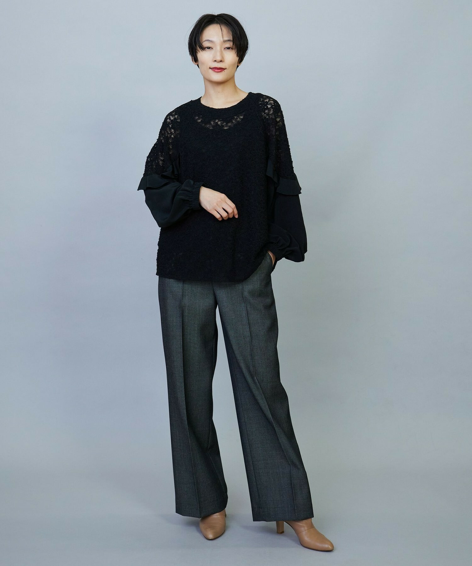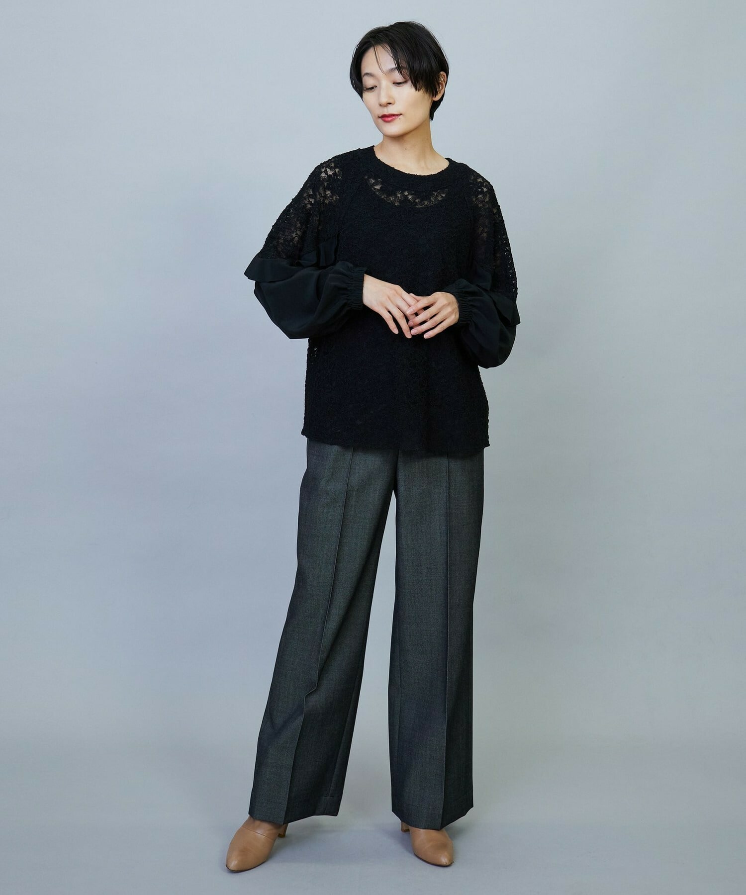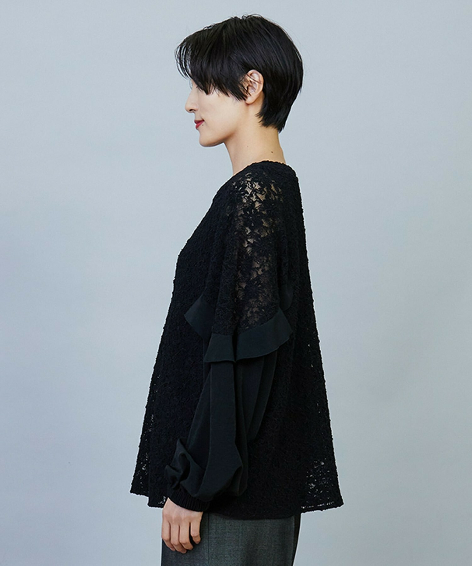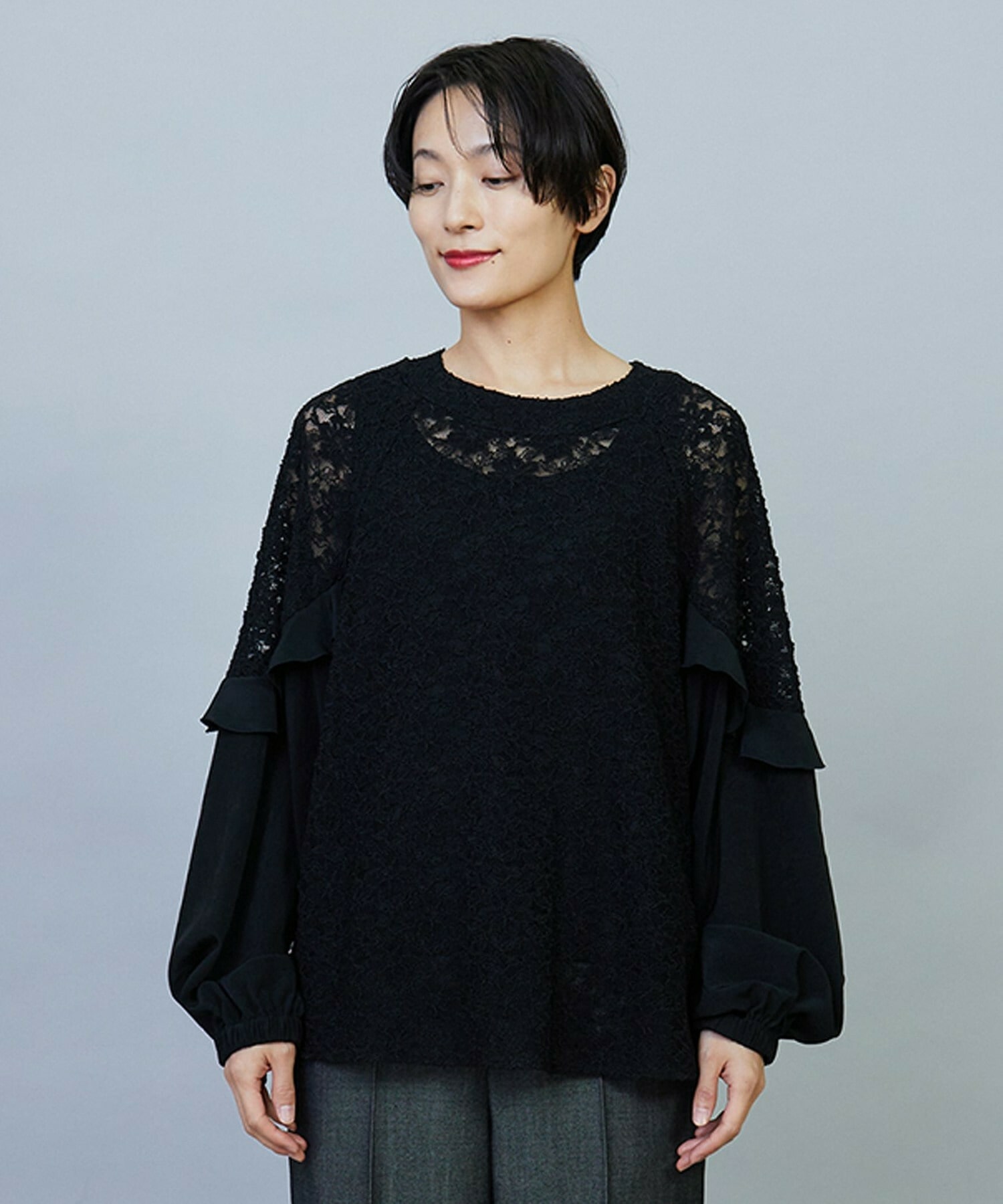 ボリューミーなシルエットでスッキリとしたボトムスがオススメです。レースのシアー感は程よい透け感で、上品なブラウスです。
