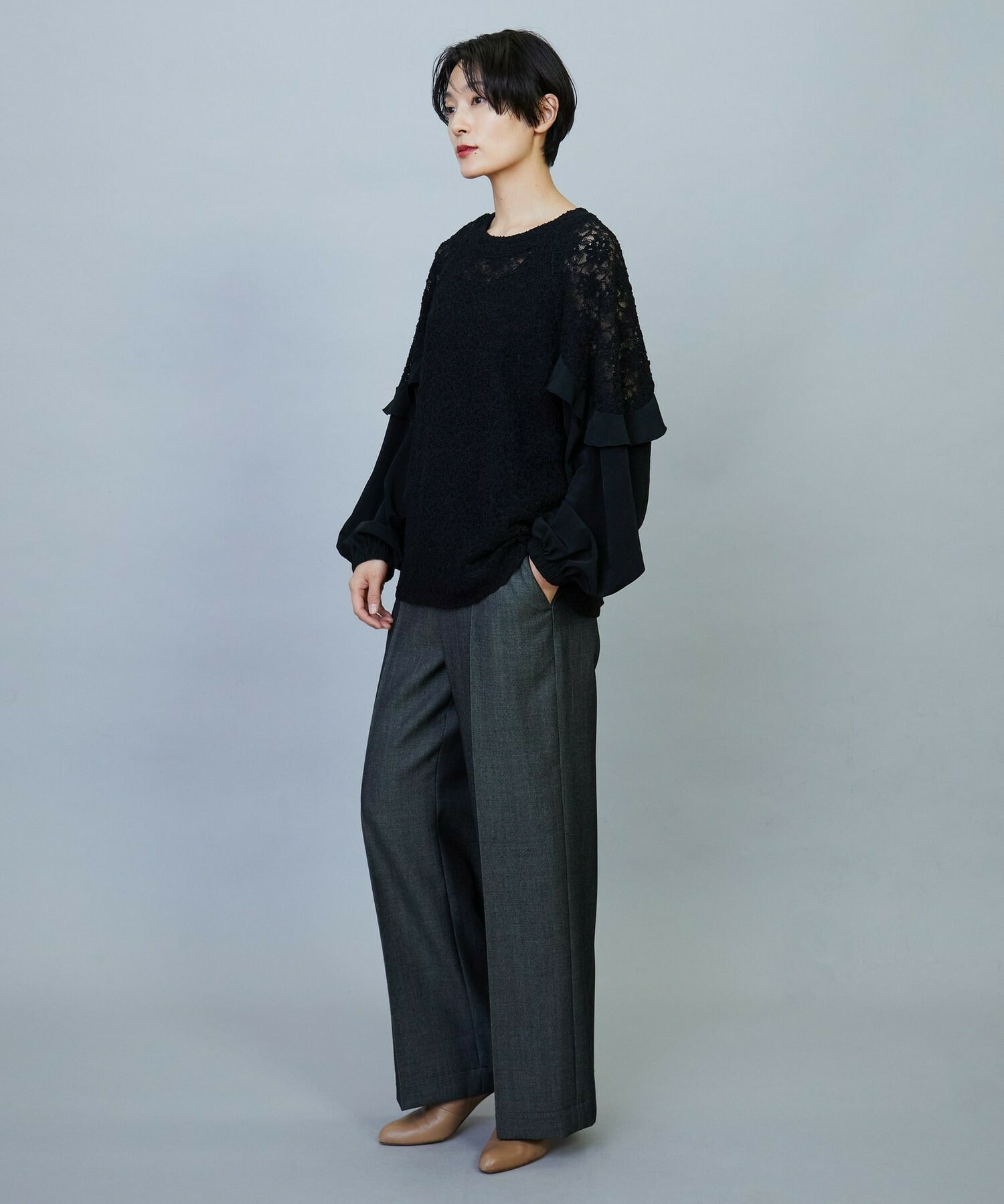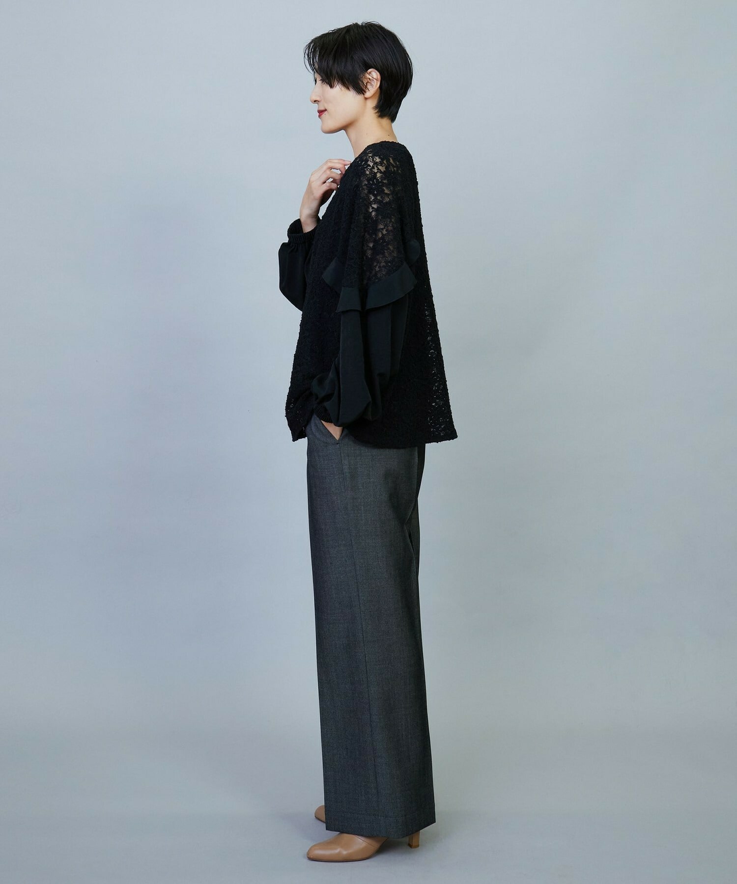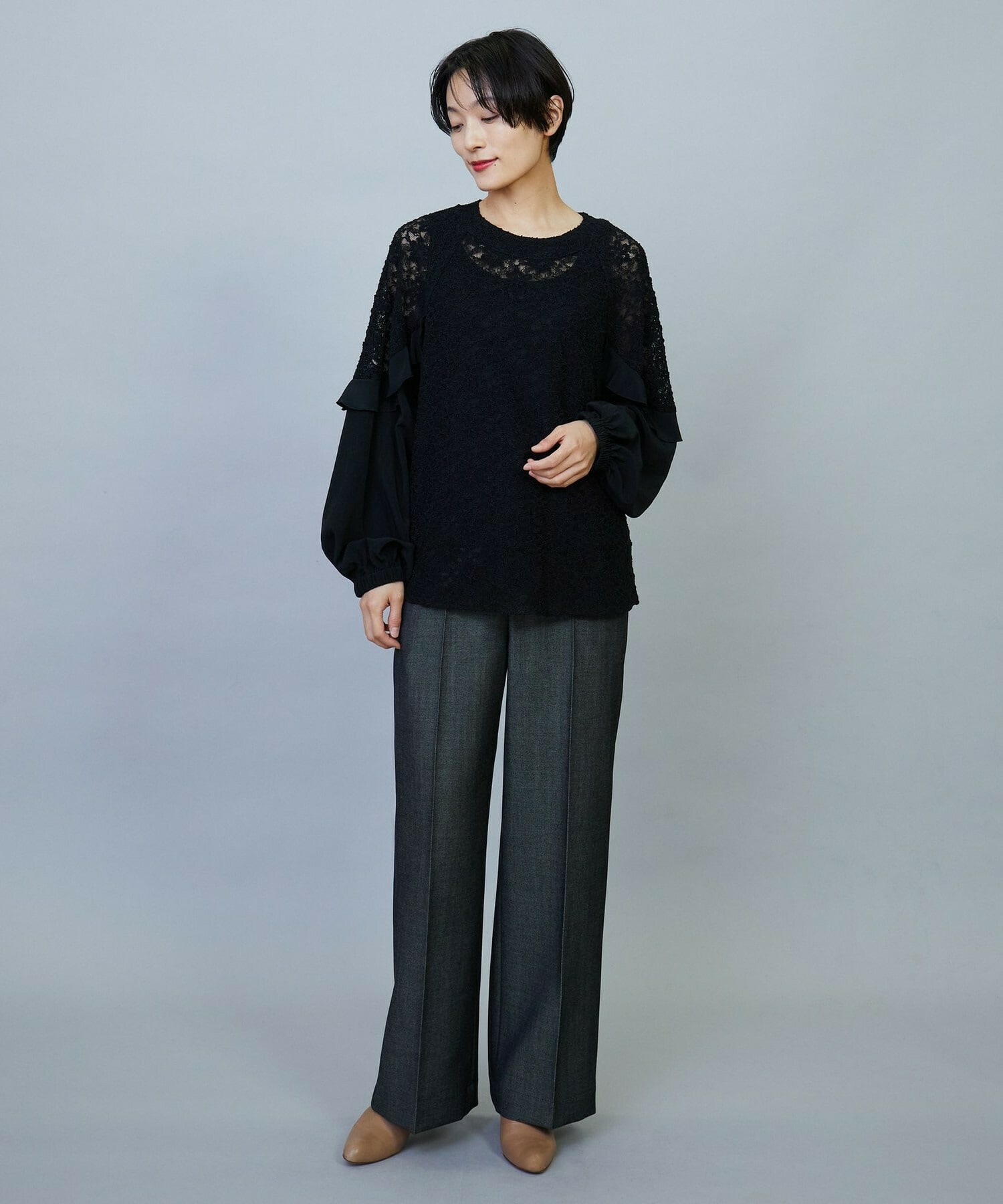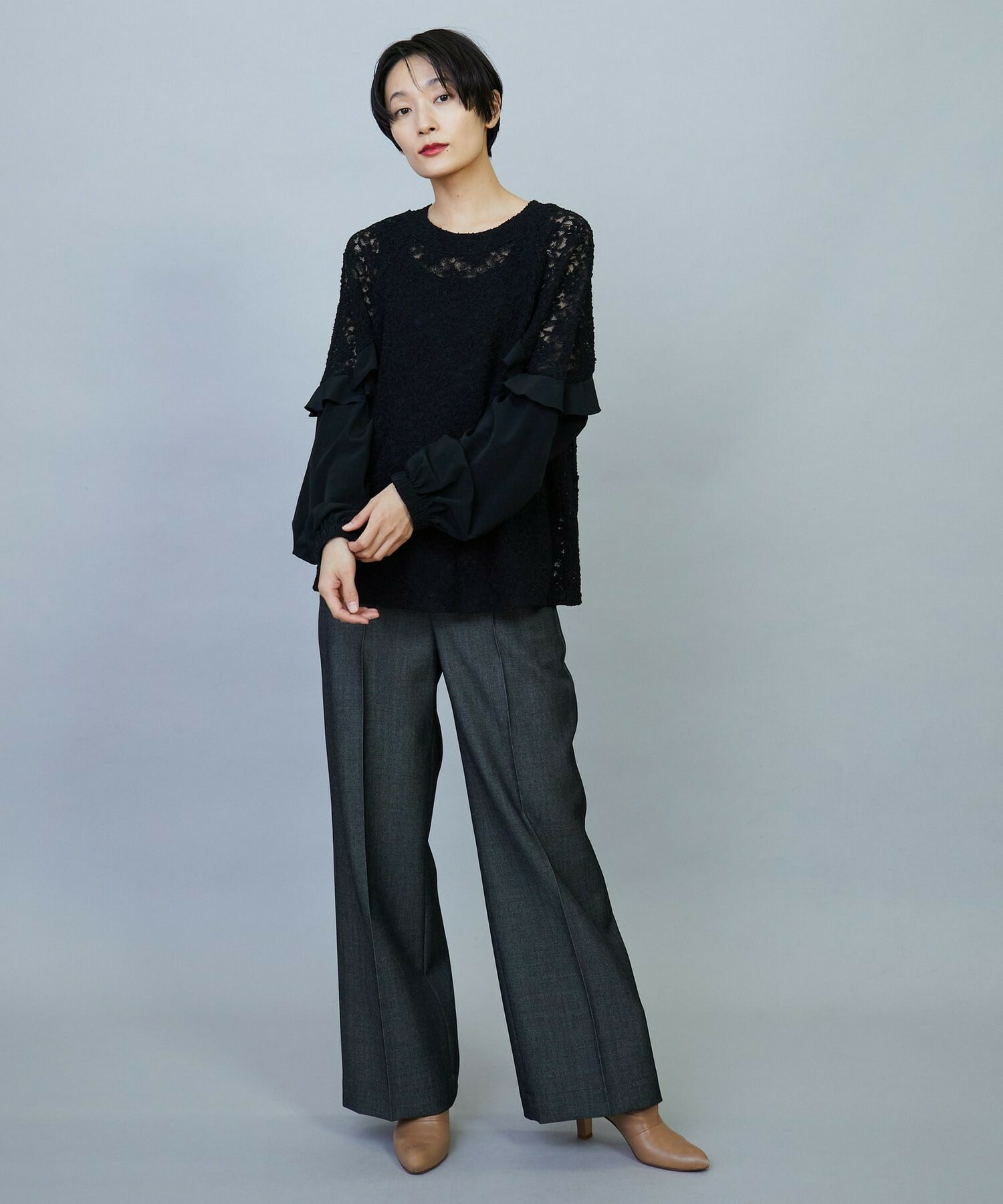 ボリューミーなシルエットでスッキリとしたボトムスがオススメです。レースのシアー感は程よい透け感で、上品なブラウスです。