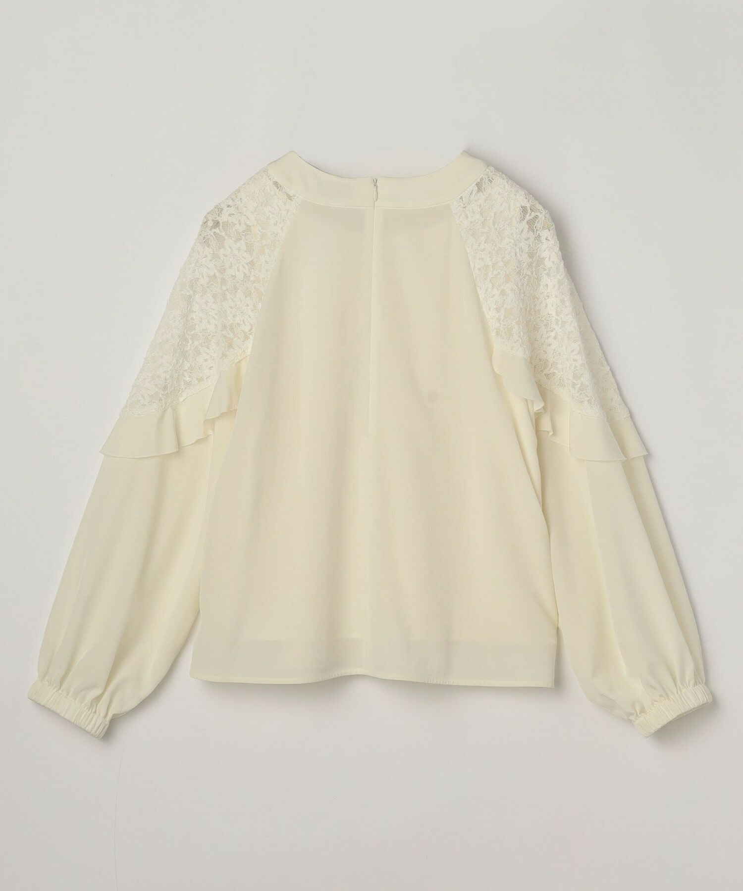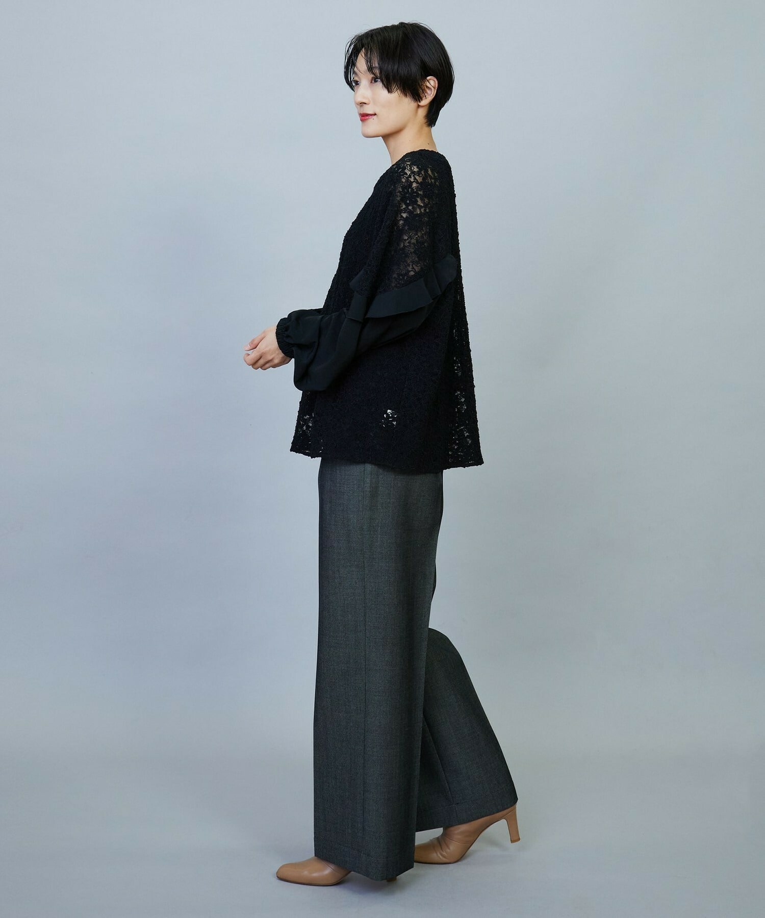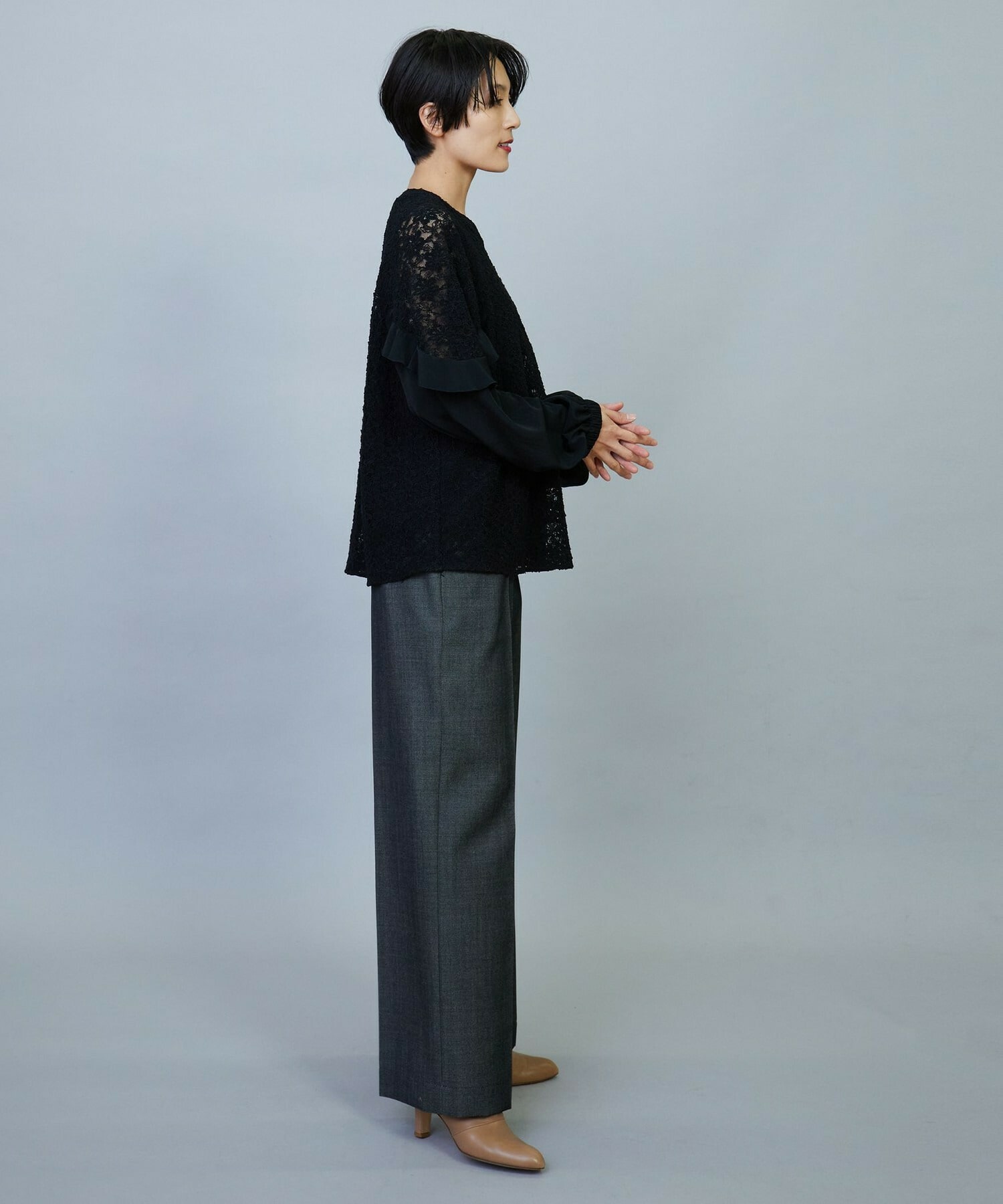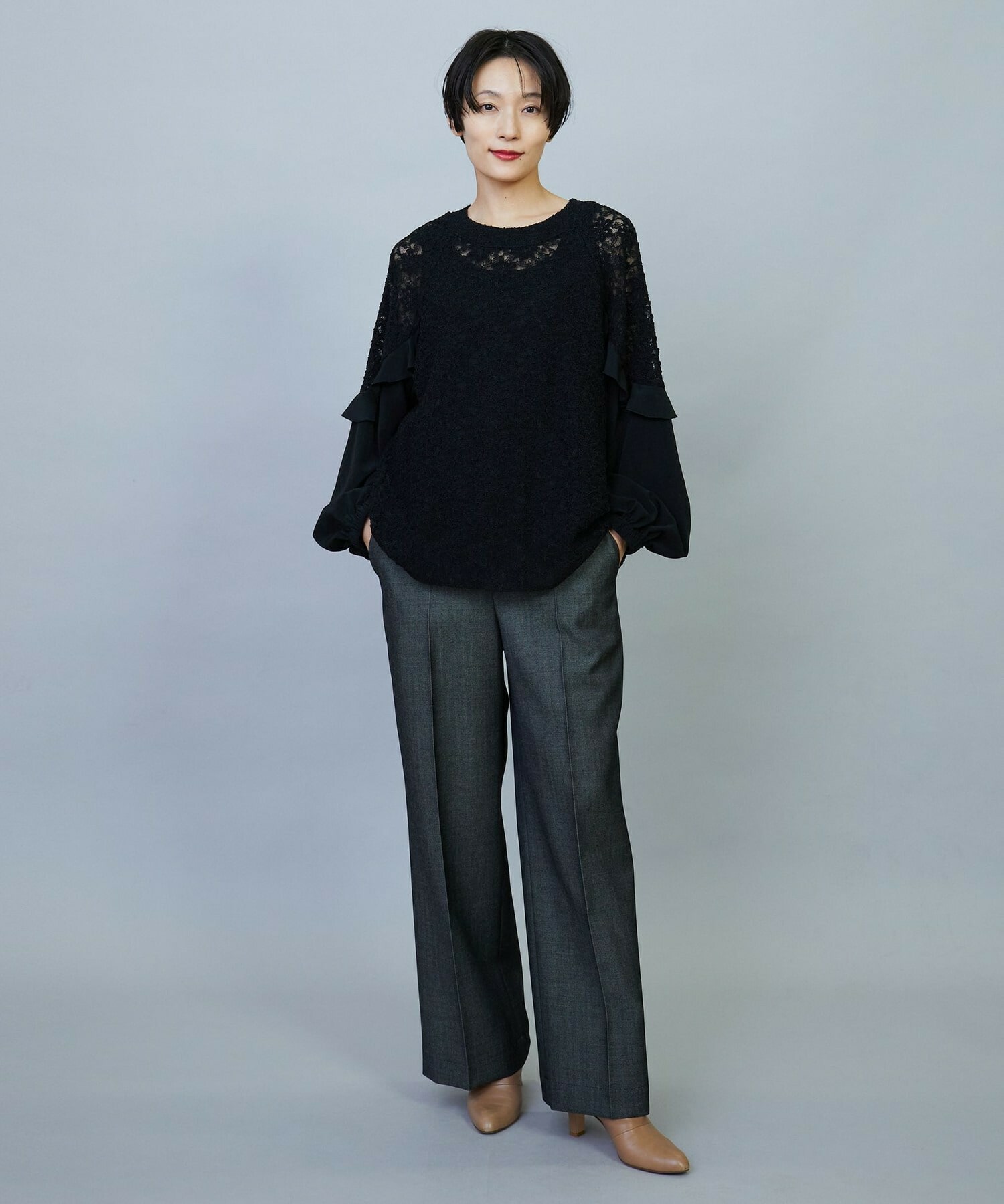 ボリューミーなシルエットでスッキリとしたボトムスがオススメです。レースのシアー感は程よい透け感で、上品なブラウスです。