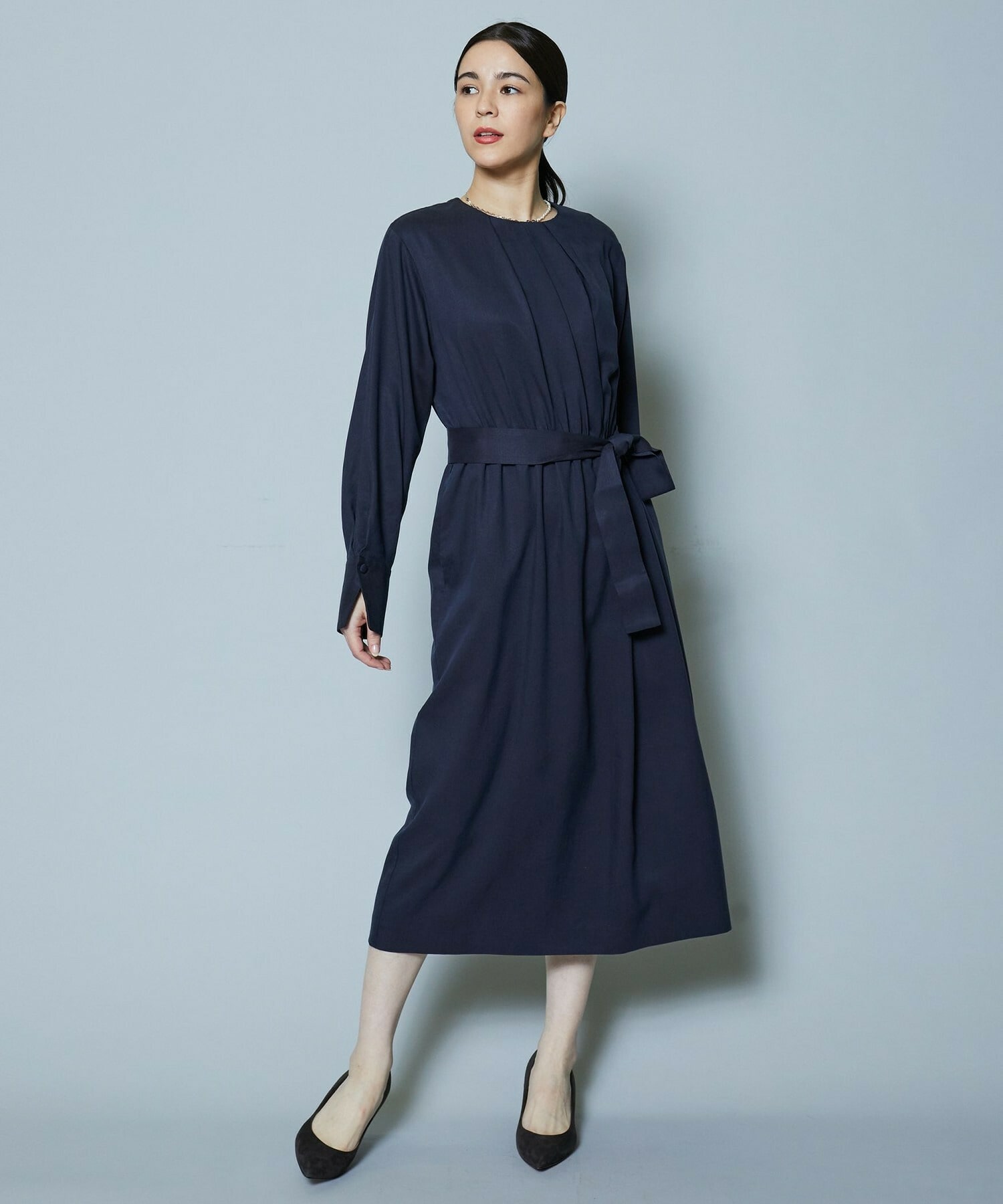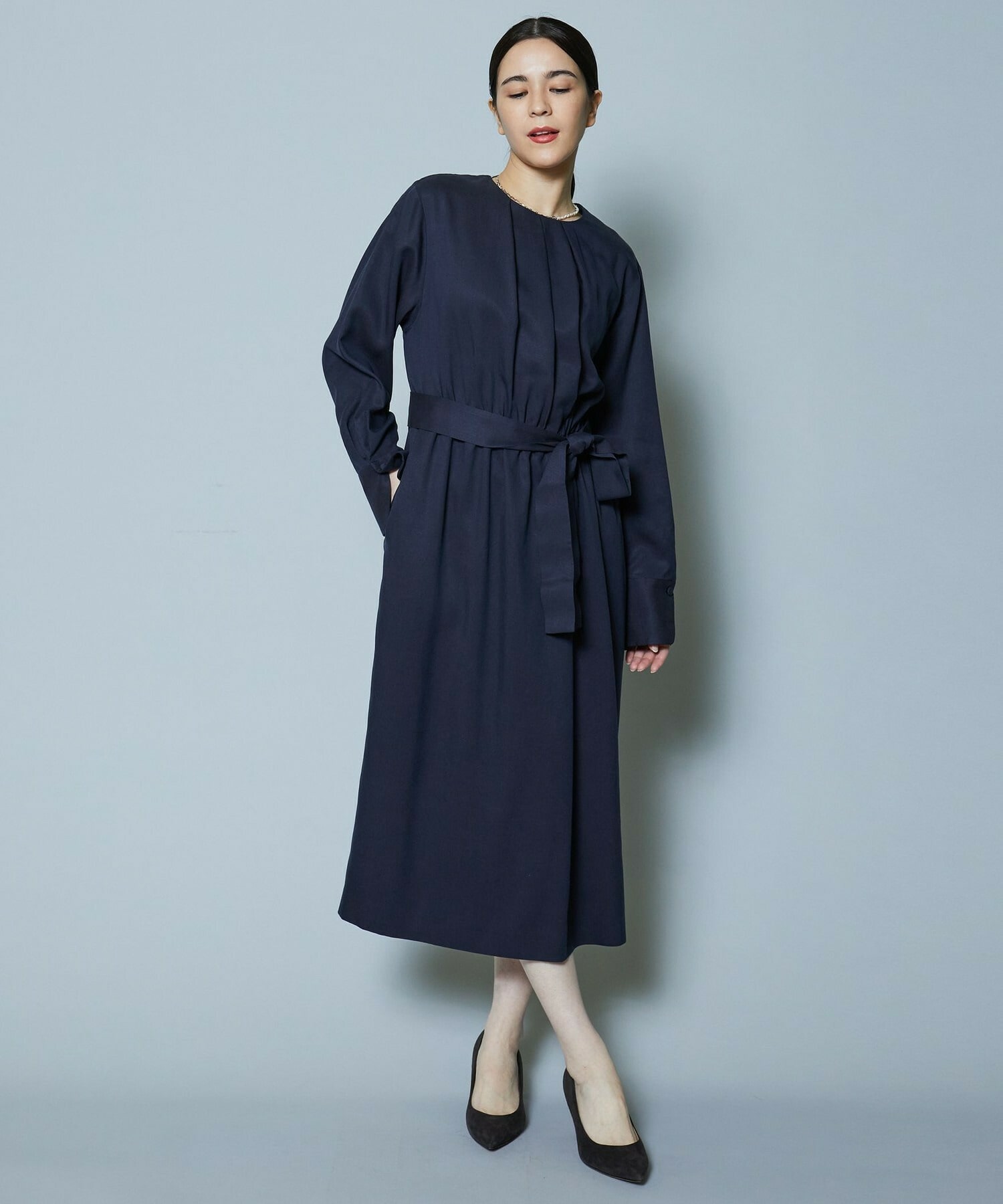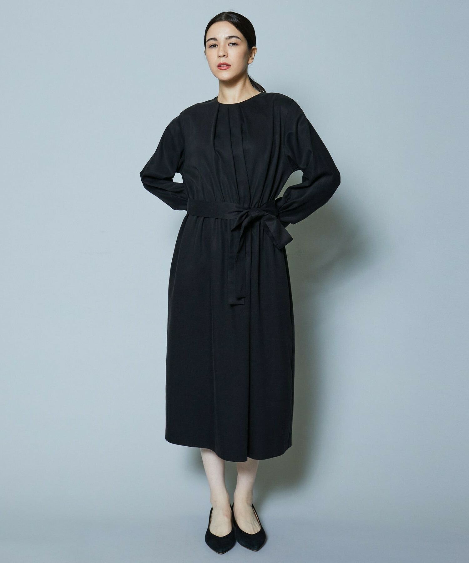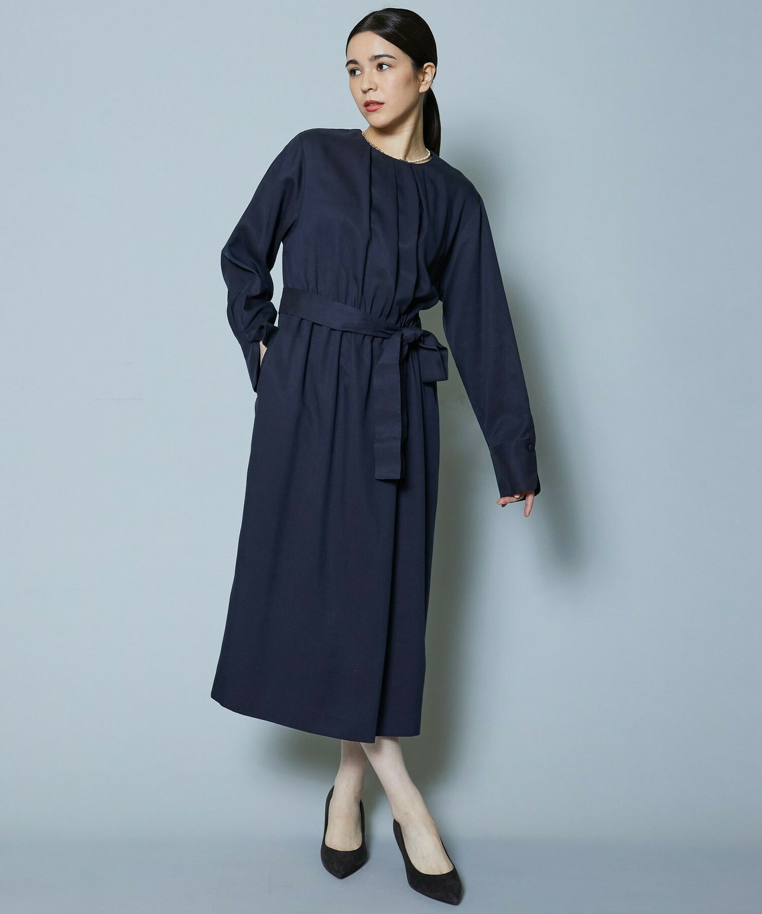 お顔周りの華やかさを意識し、胸元からウエストへのタックをつなげドレープを作っています。