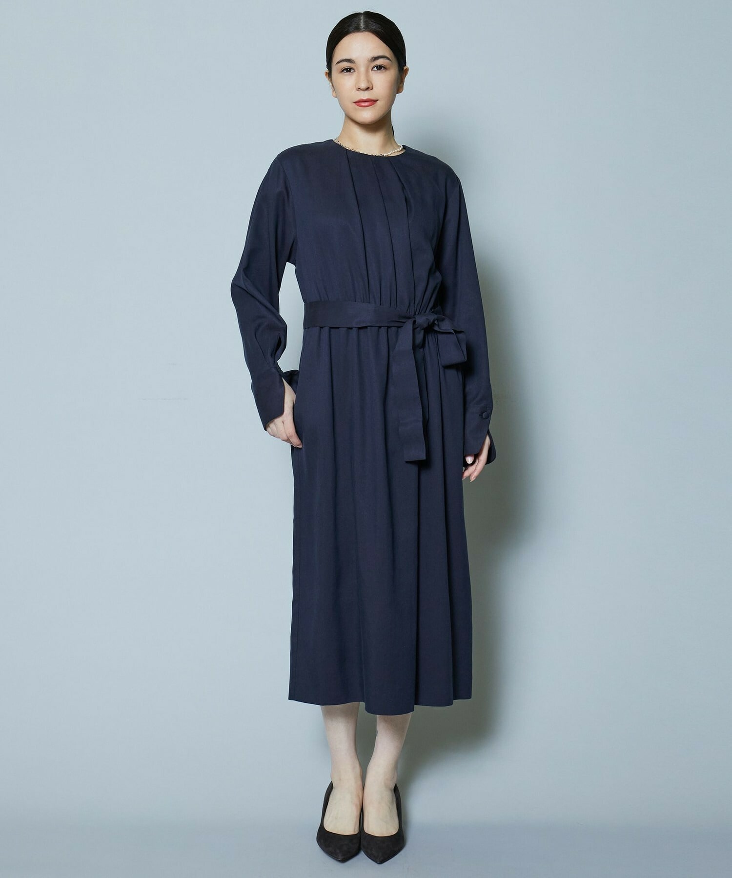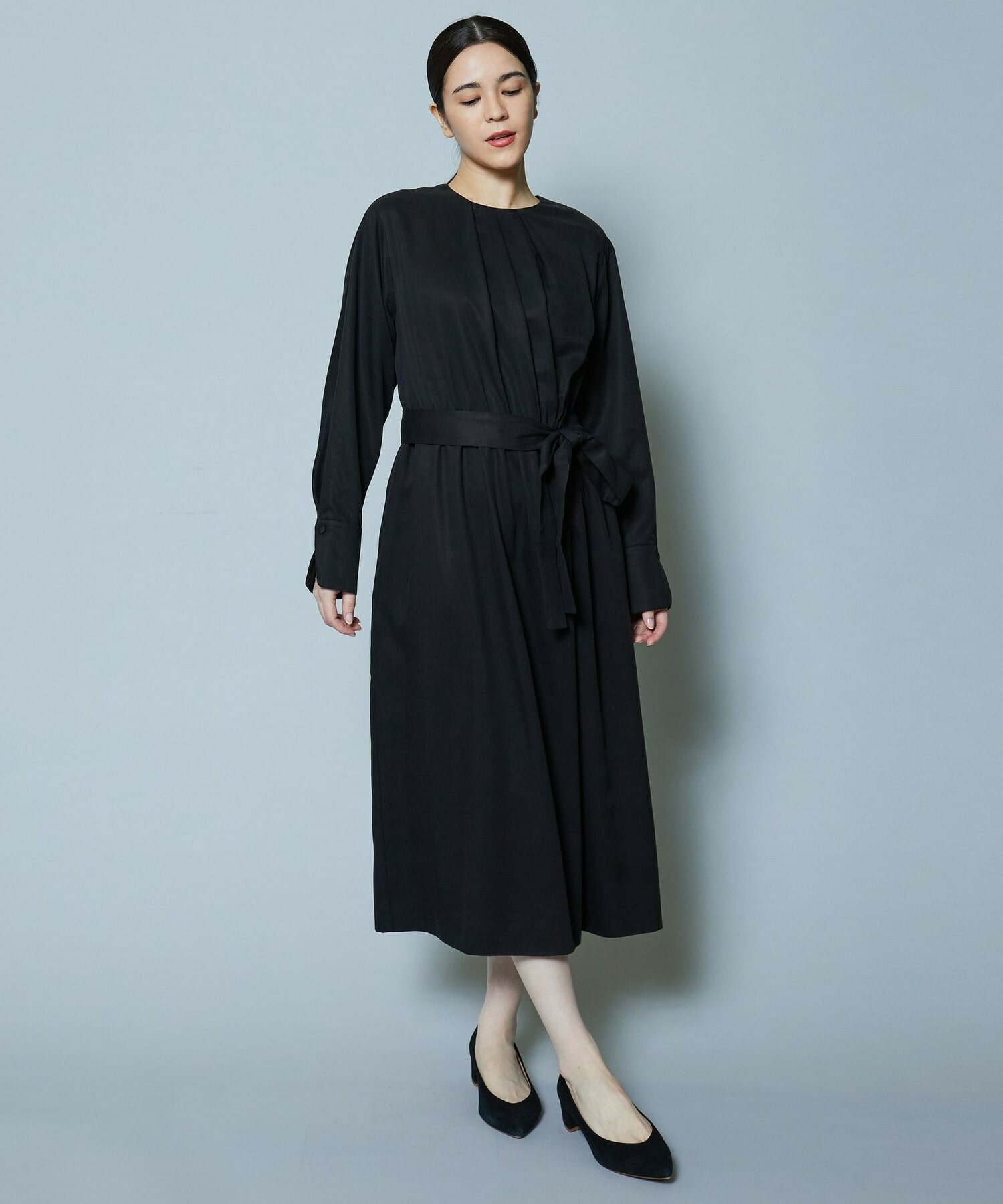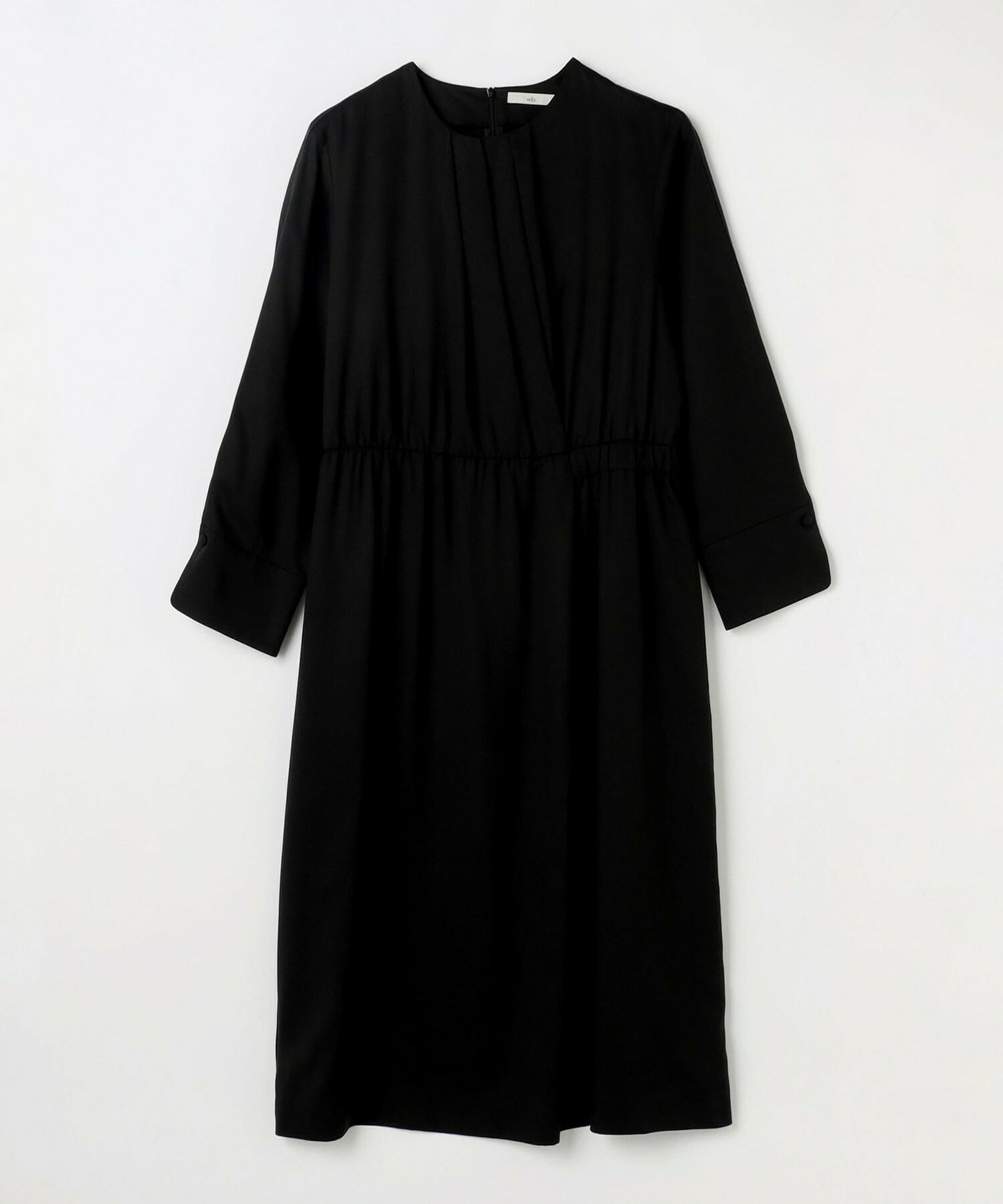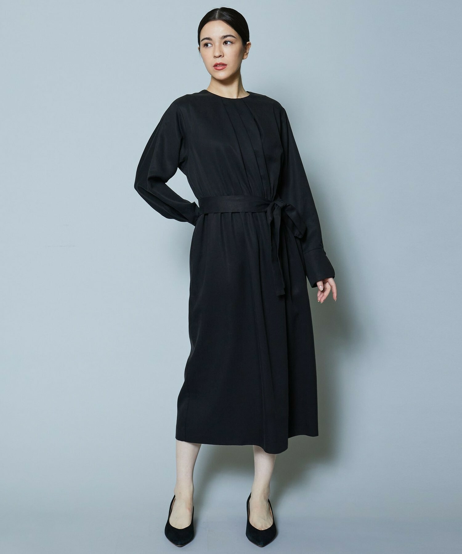 お顔周りの華やかさを意識し、胸元からウエストへのタックをつなげドレープを作っています。