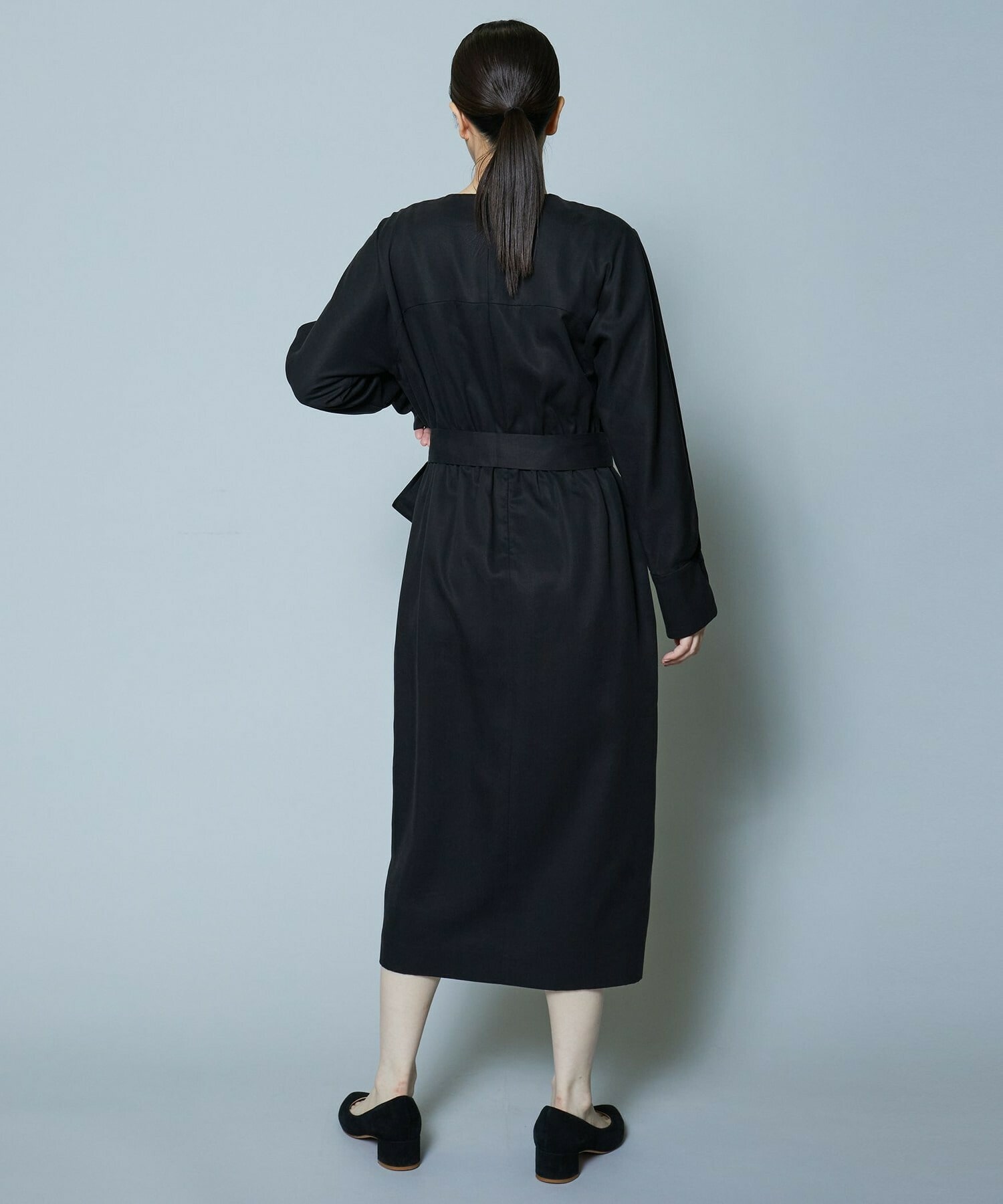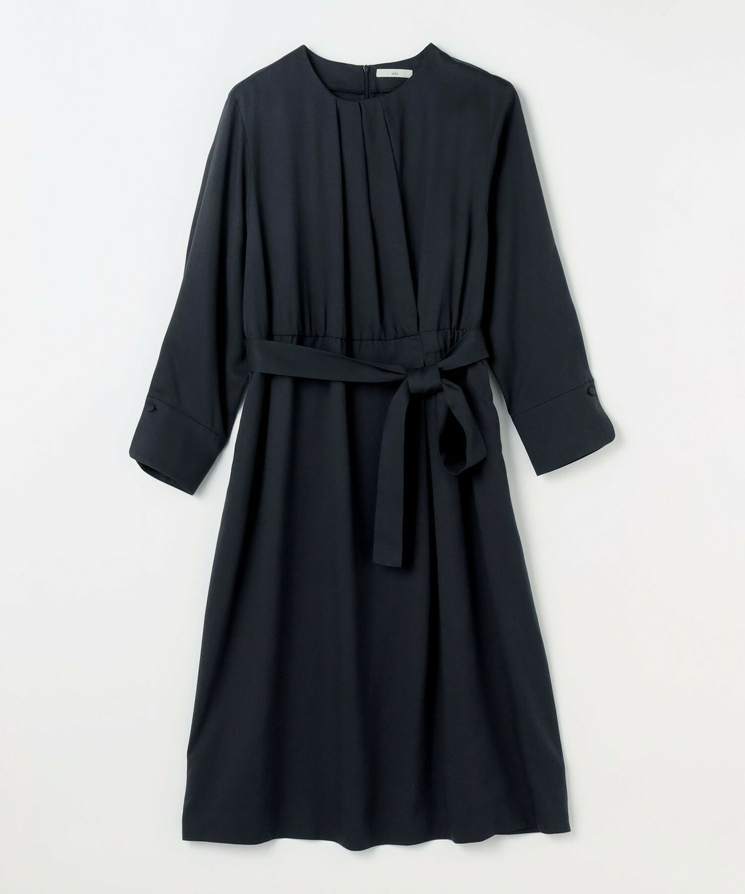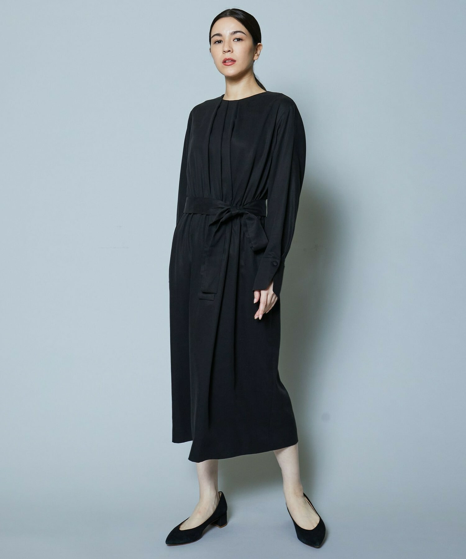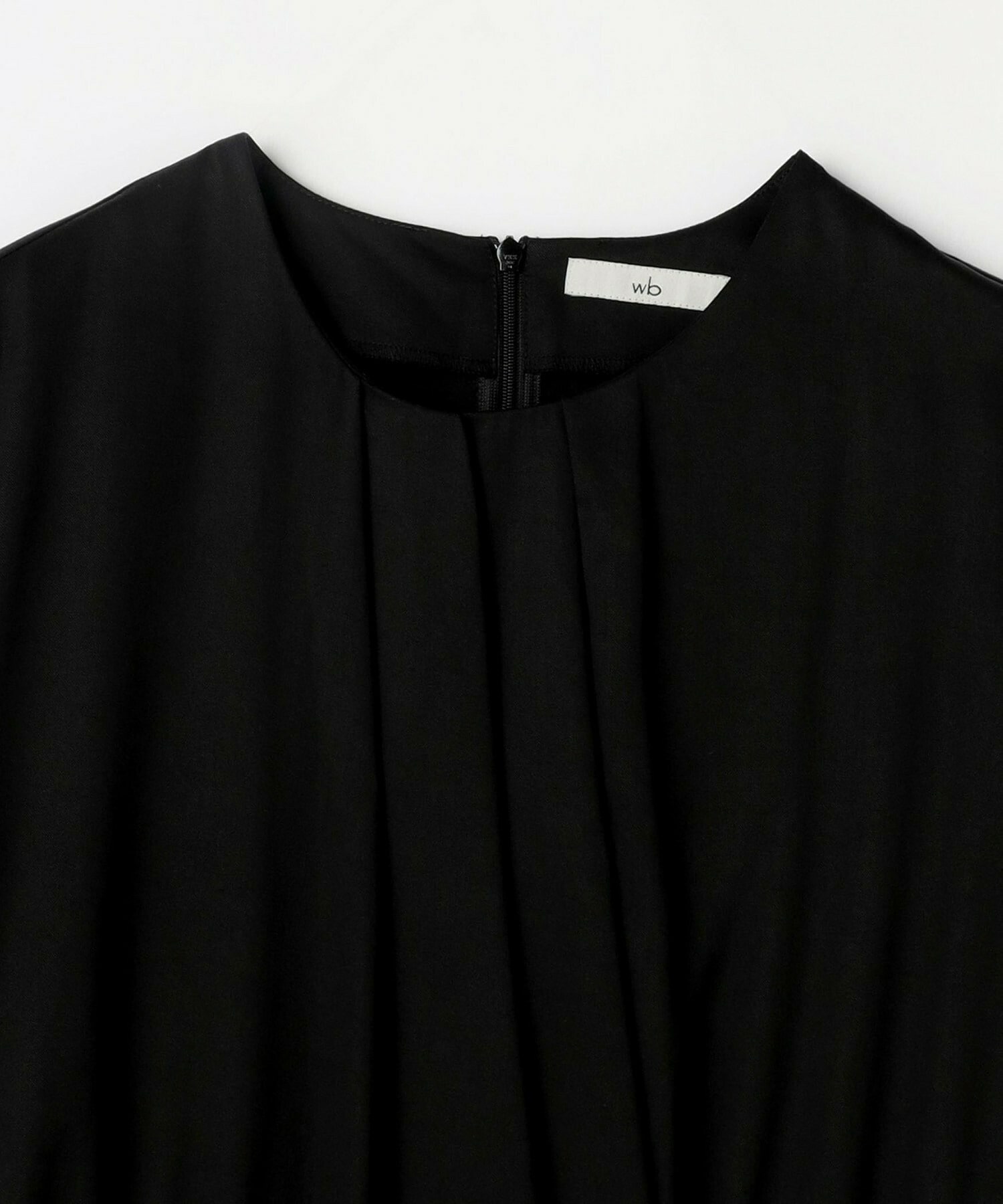お顔周りの華やかさを意識し、胸元からウエストへのタックをつなげドレープを作っています。