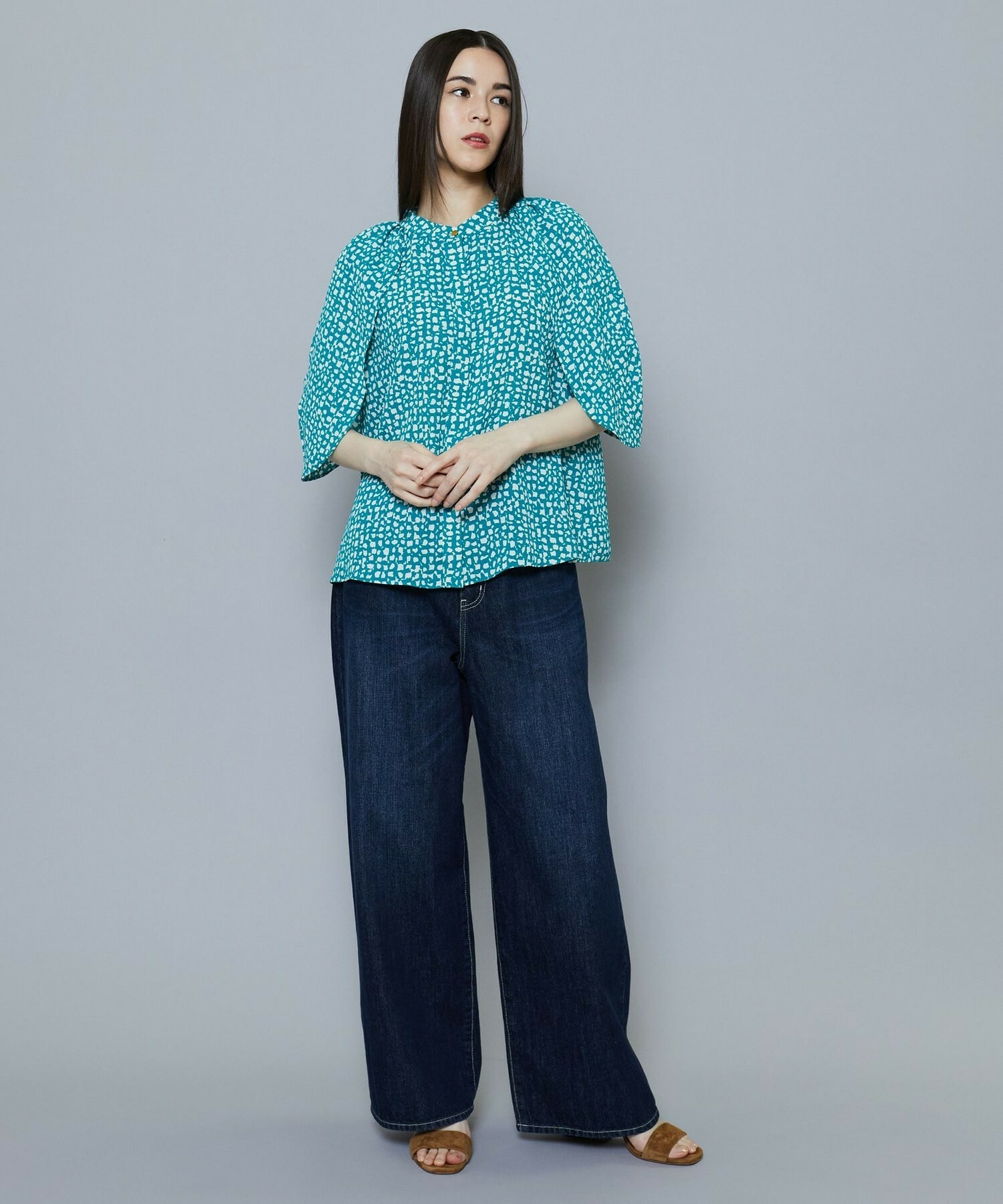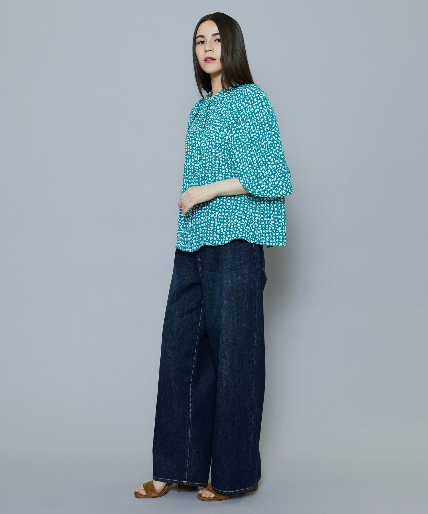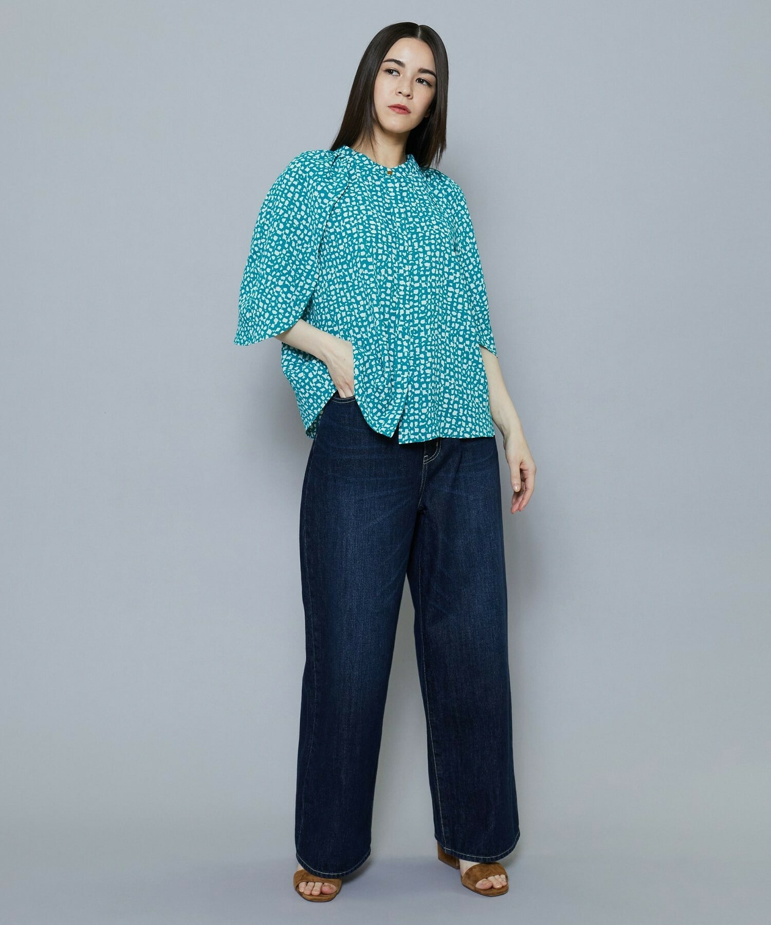 ケープのような丸みのある袖のカットが特徴的なバンドカラーブラウス。