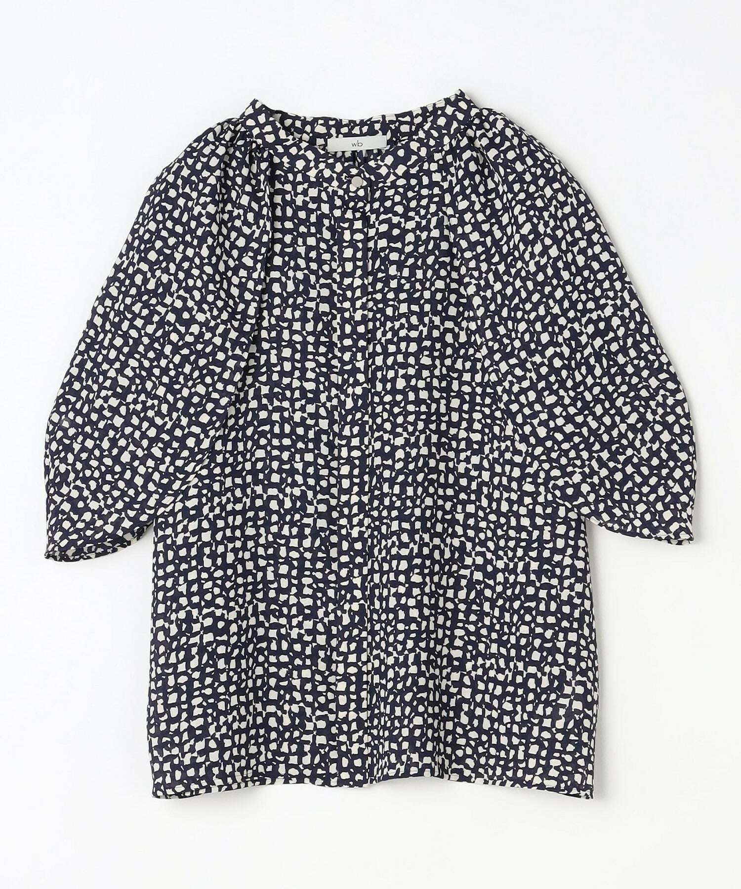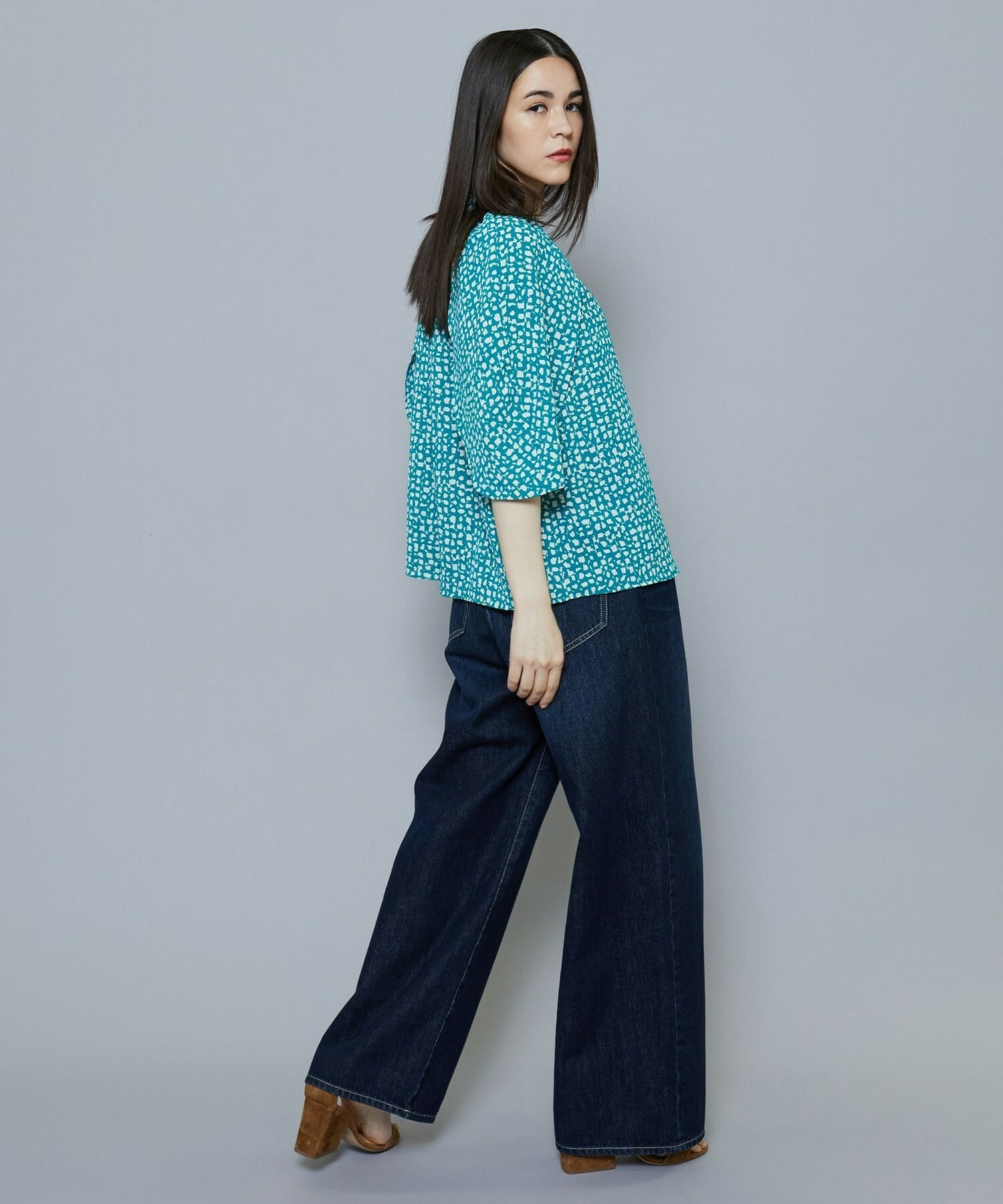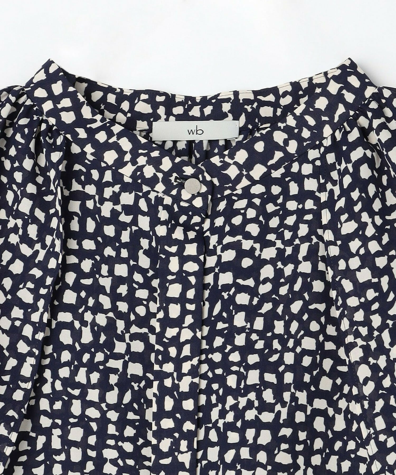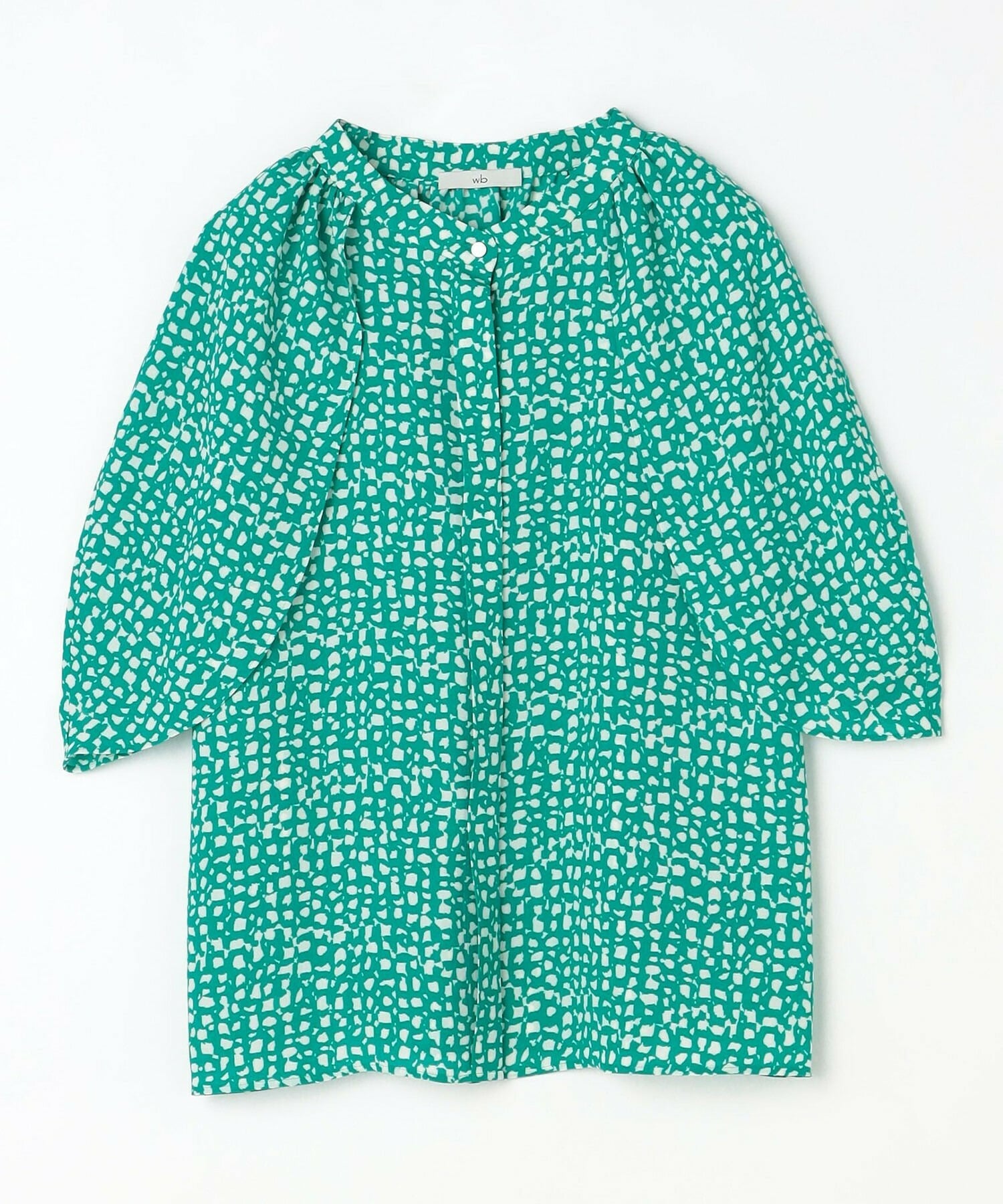 ケープのような丸みのある袖のカットが特徴的なバンドカラーブラウス。